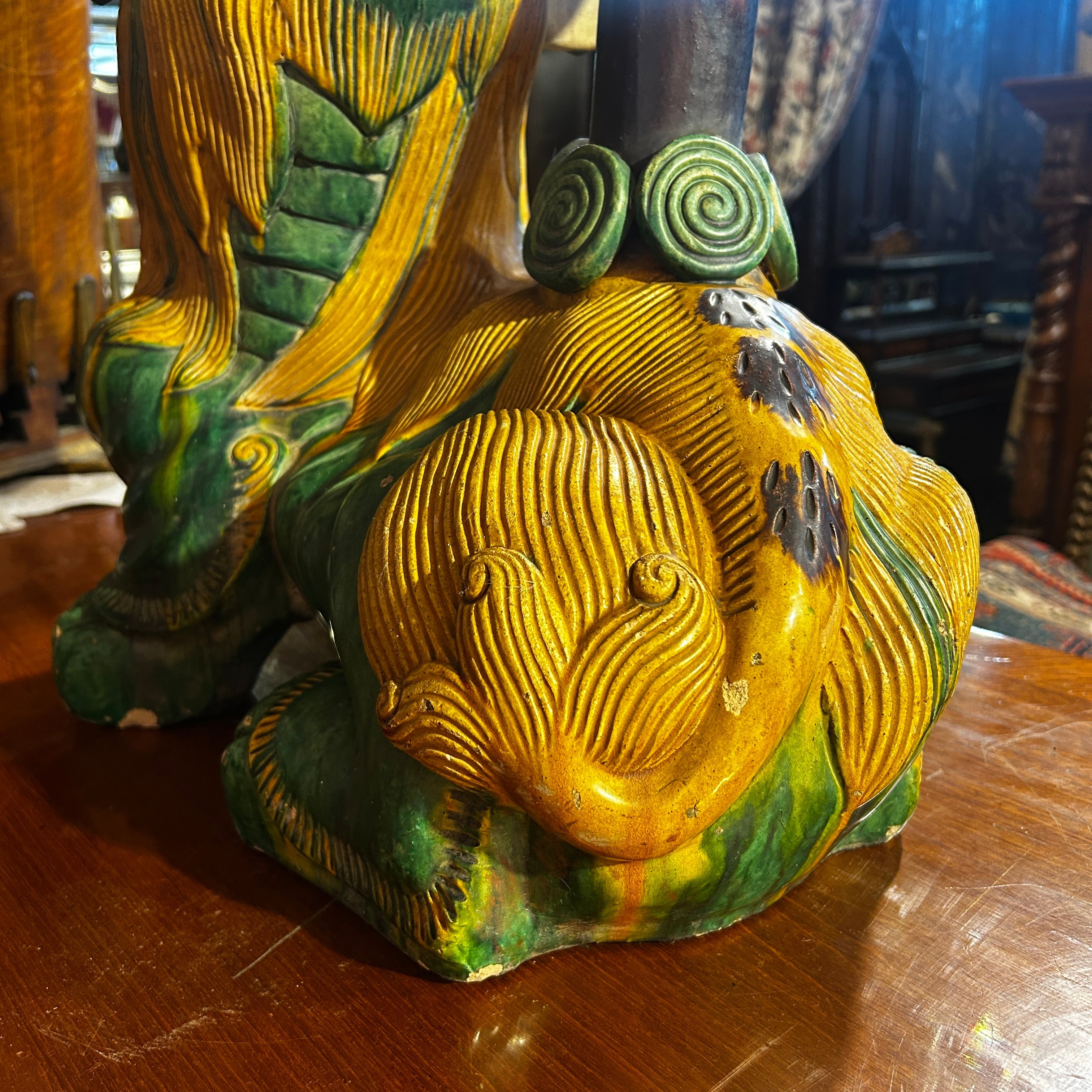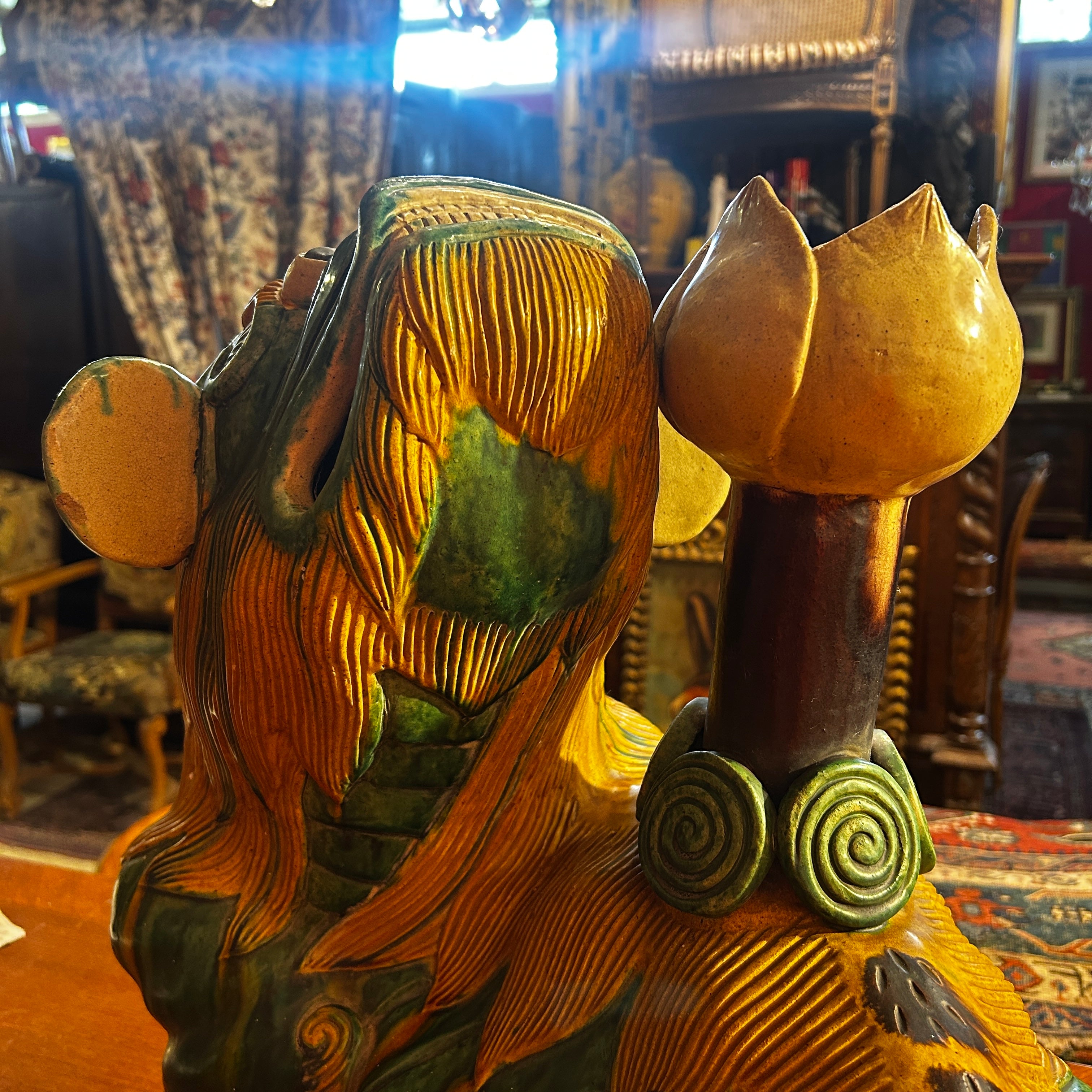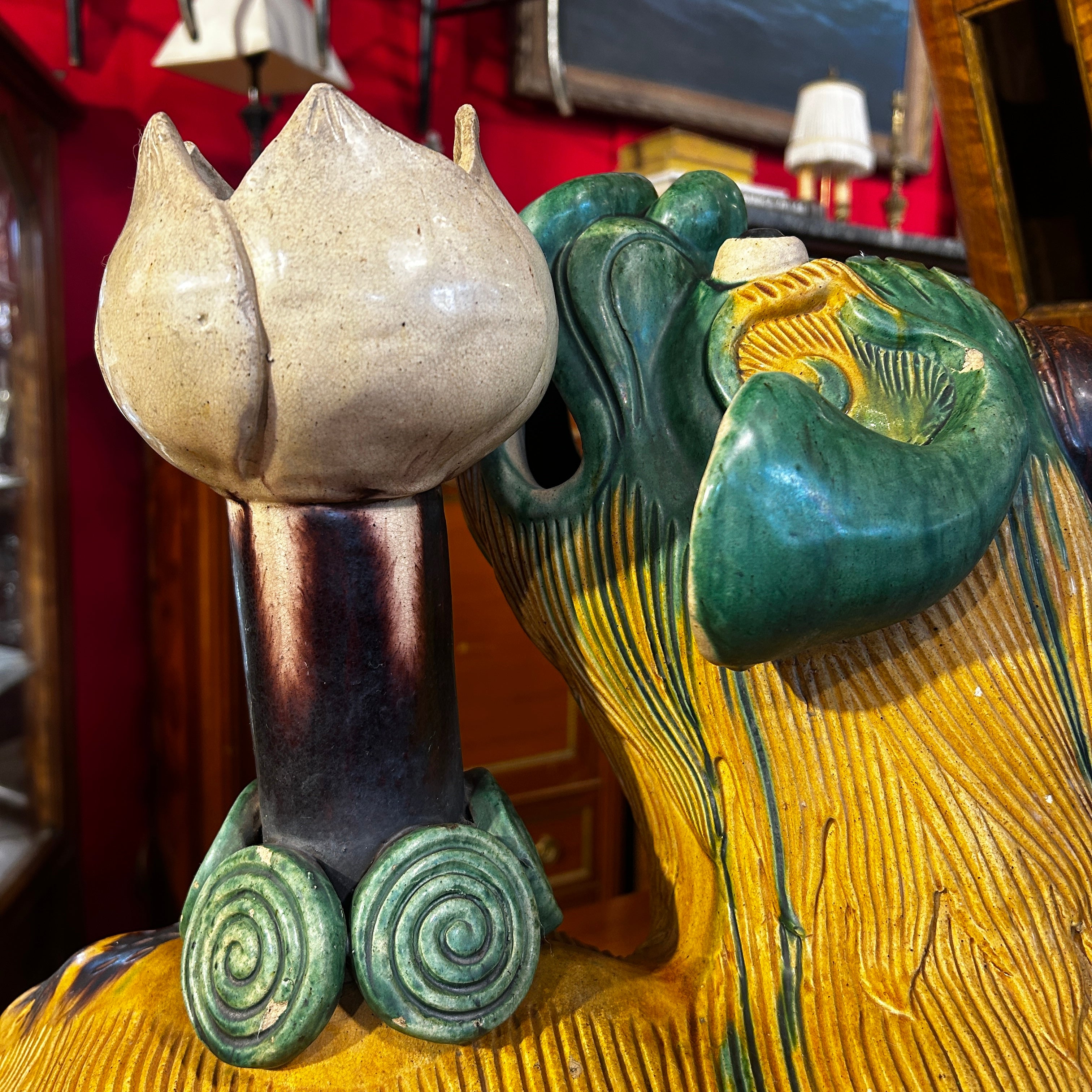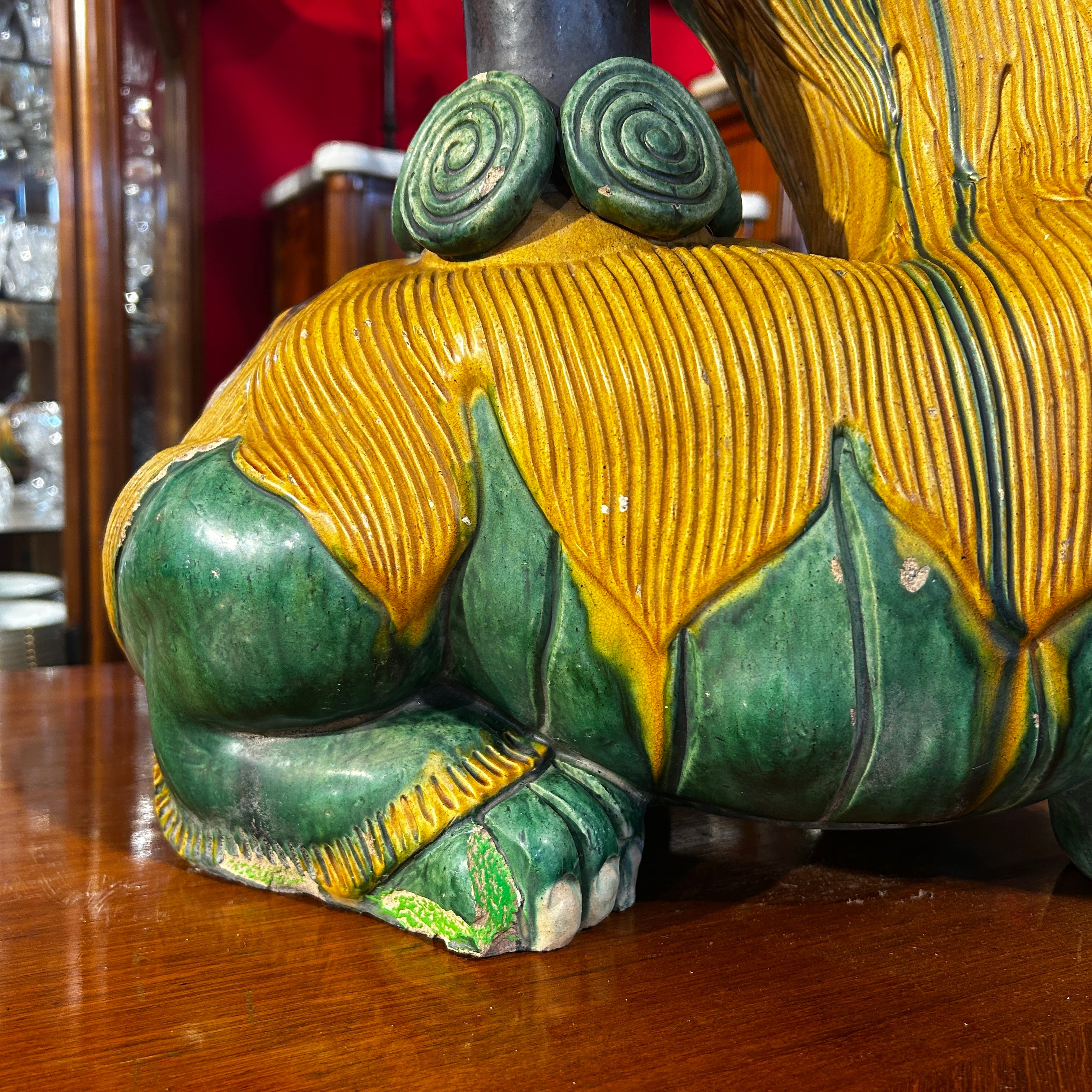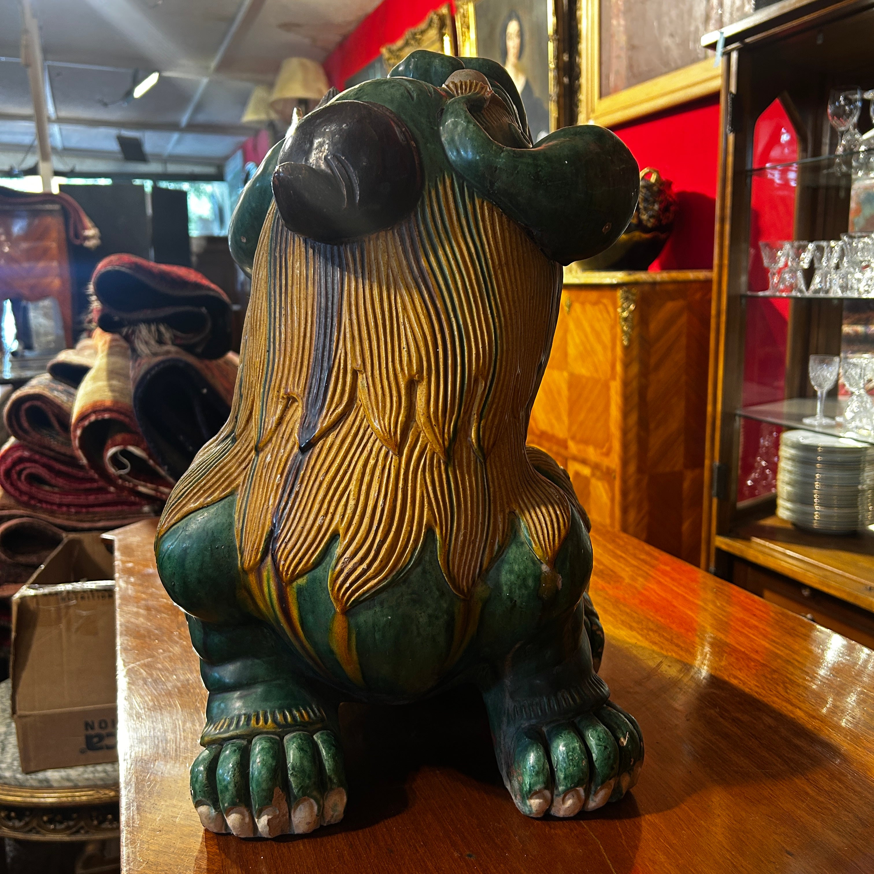 Bella y lúdica figura de cerámica esmaltada que representa un león guardián chino, comúnmente conocido en occidente como perro Fu o perro Foo.