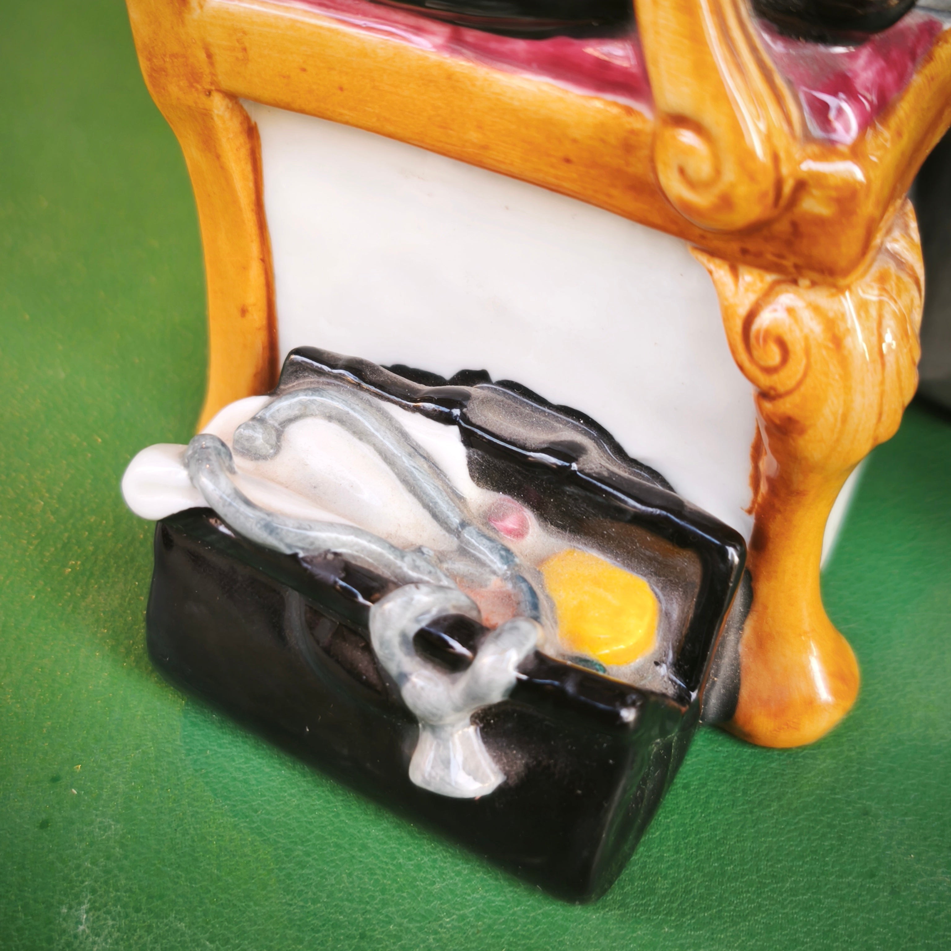 Simpática figura hecha de porcelana de origen inglés de la reconocida marca de colección Royal Doulton, representando al personaje de "El Doctor", mostrando a un señor mayor sentado, con un frasco de jarabe en su mano, vestido con un traje sobrio y con un maletín que deja ver sus instrumentos médicos. La figura, bellamente pintadas a mano, captura todos los rasgos identificables de esta profesión con personalidad y un poco de humor, dándole carácter y simpática al personaje.