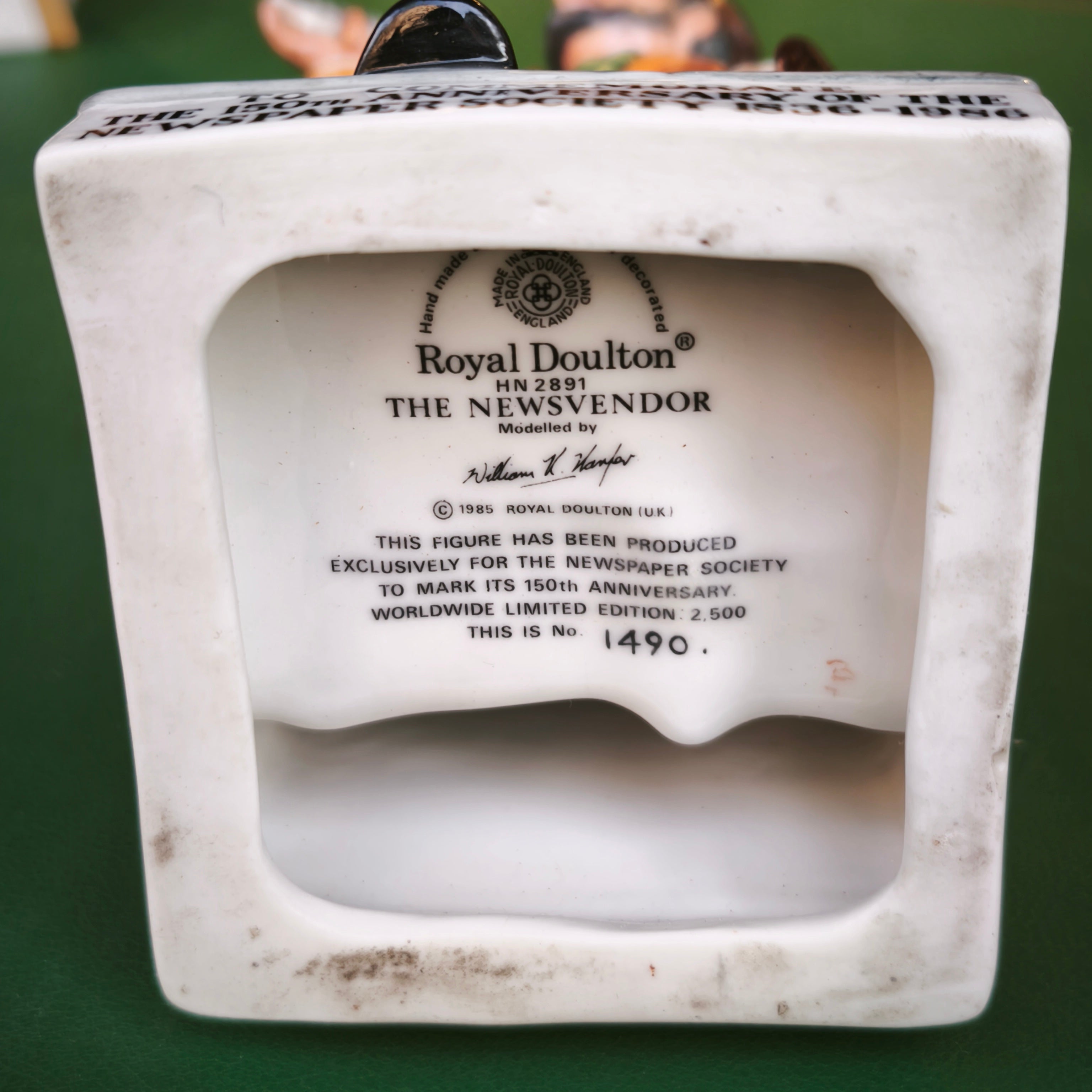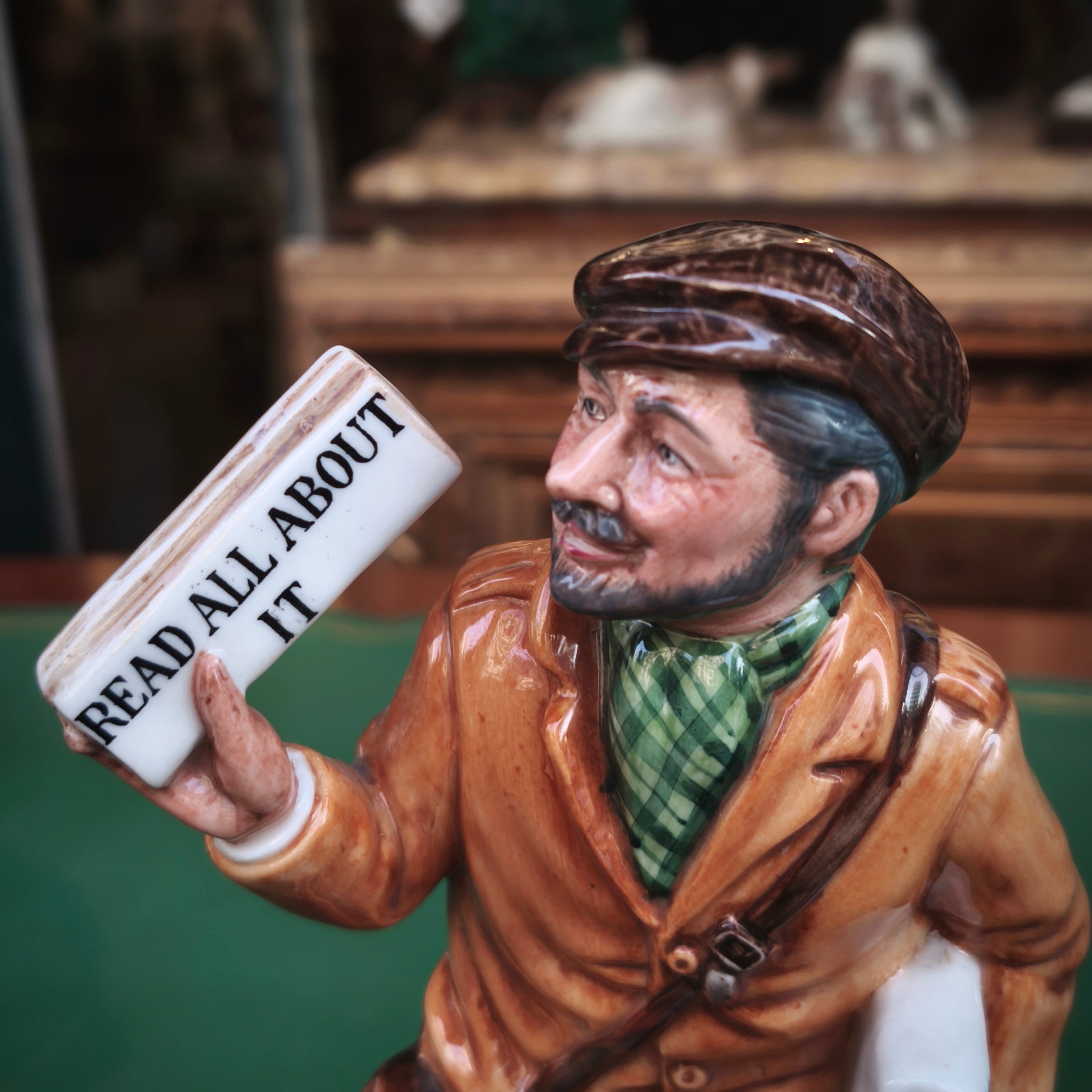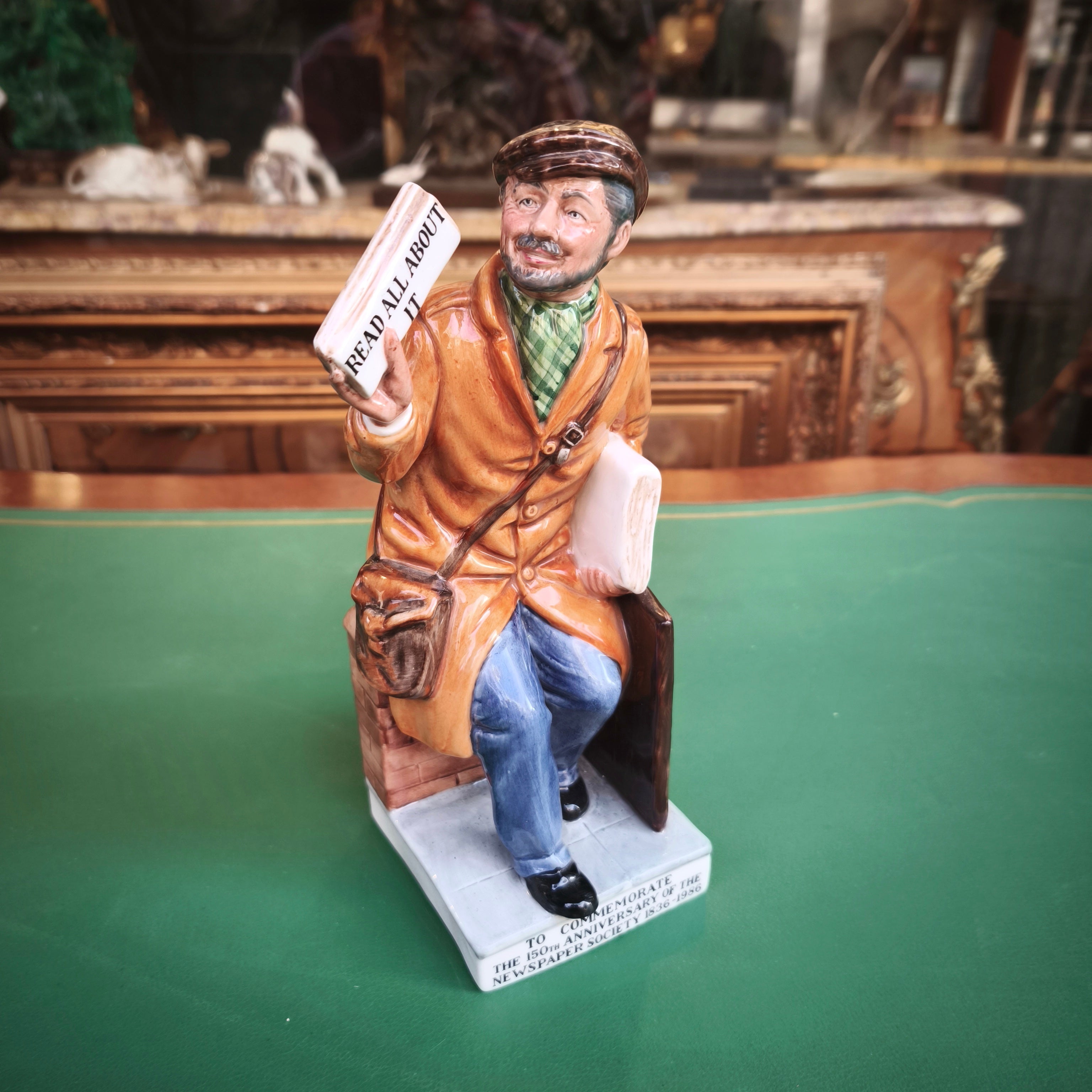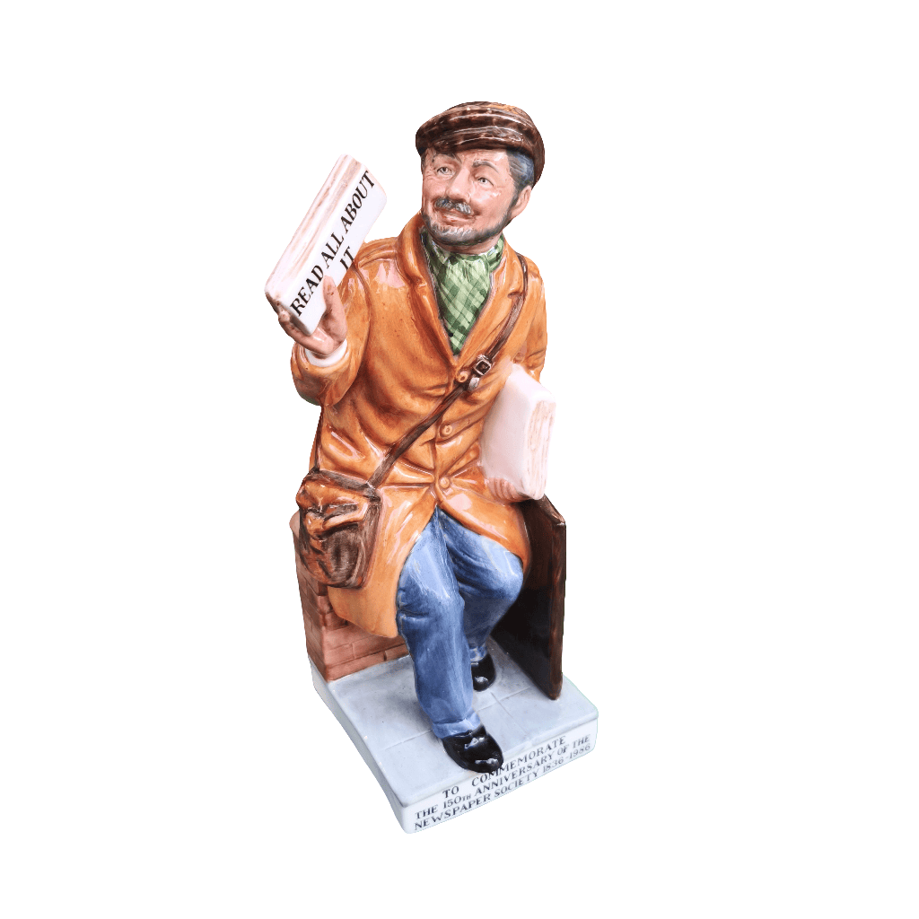 Figura hecha de porcelana de origen inglés de la reconocida marca Royal Doulton, representando a un vendedor de diario por motivo de la conmemoración del aniversario número 150 de la sociedad de diarios periódicos ingleses en 1986. La figura, pintada a mano, captura detalladamente al personaje, dándole mucho carácter y personalidad.