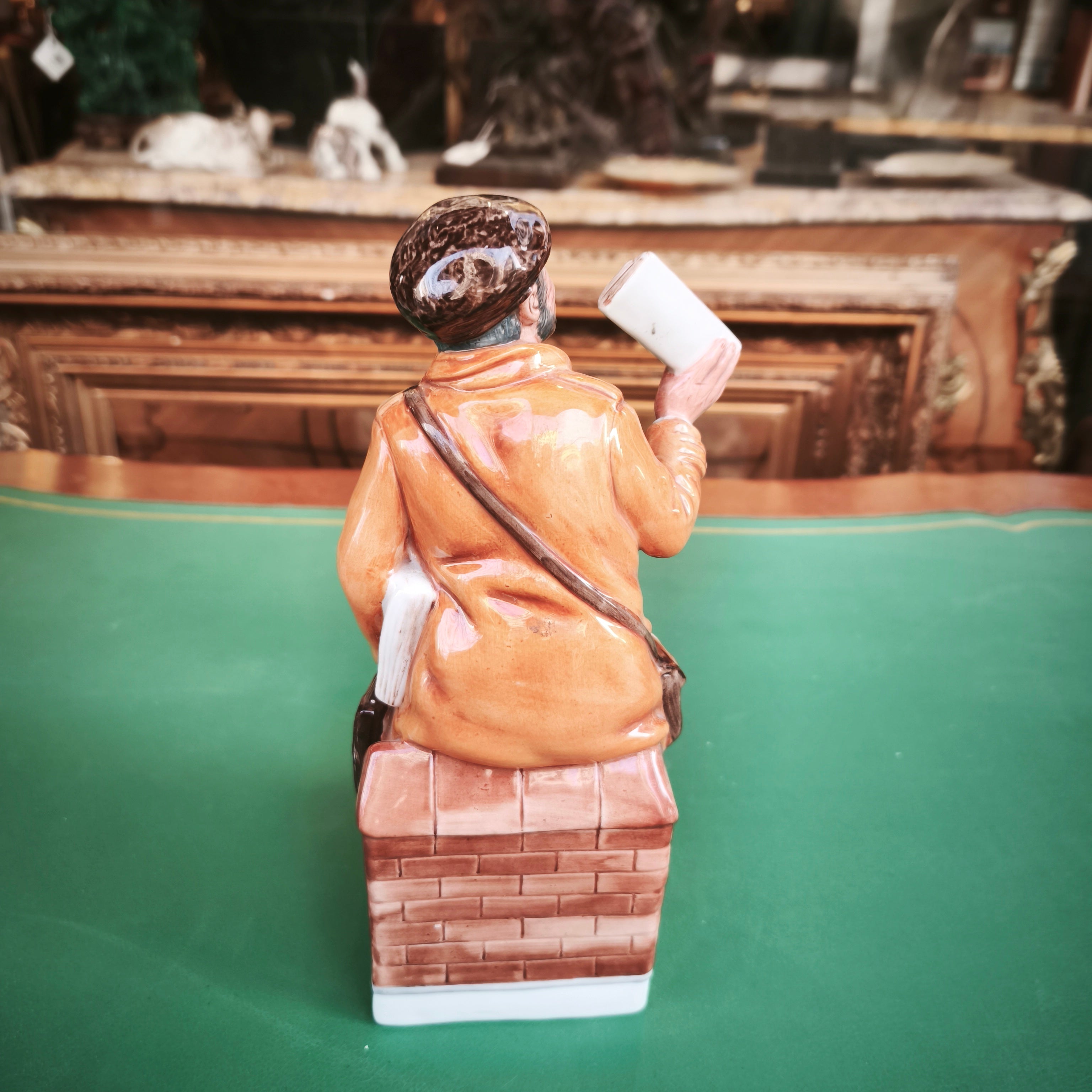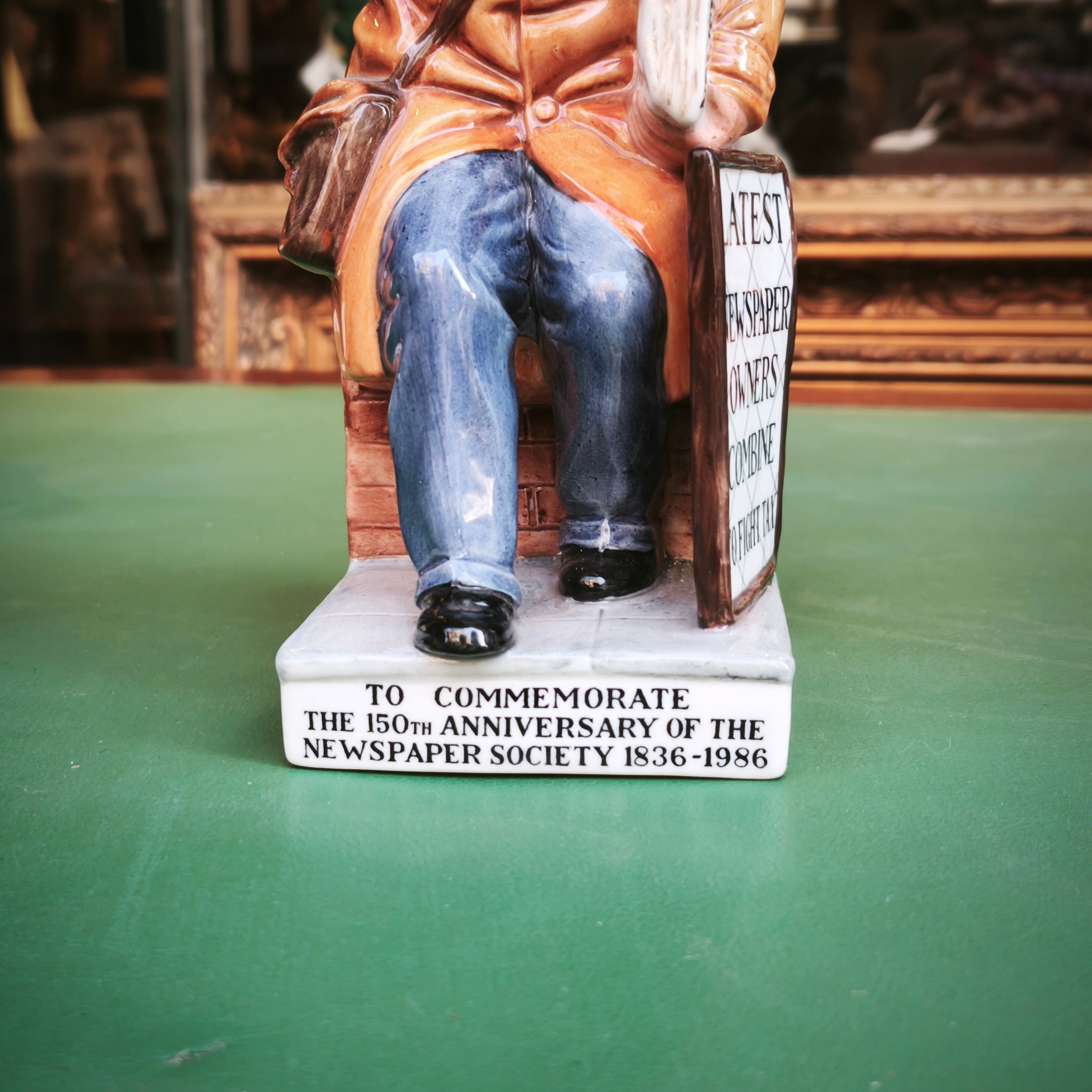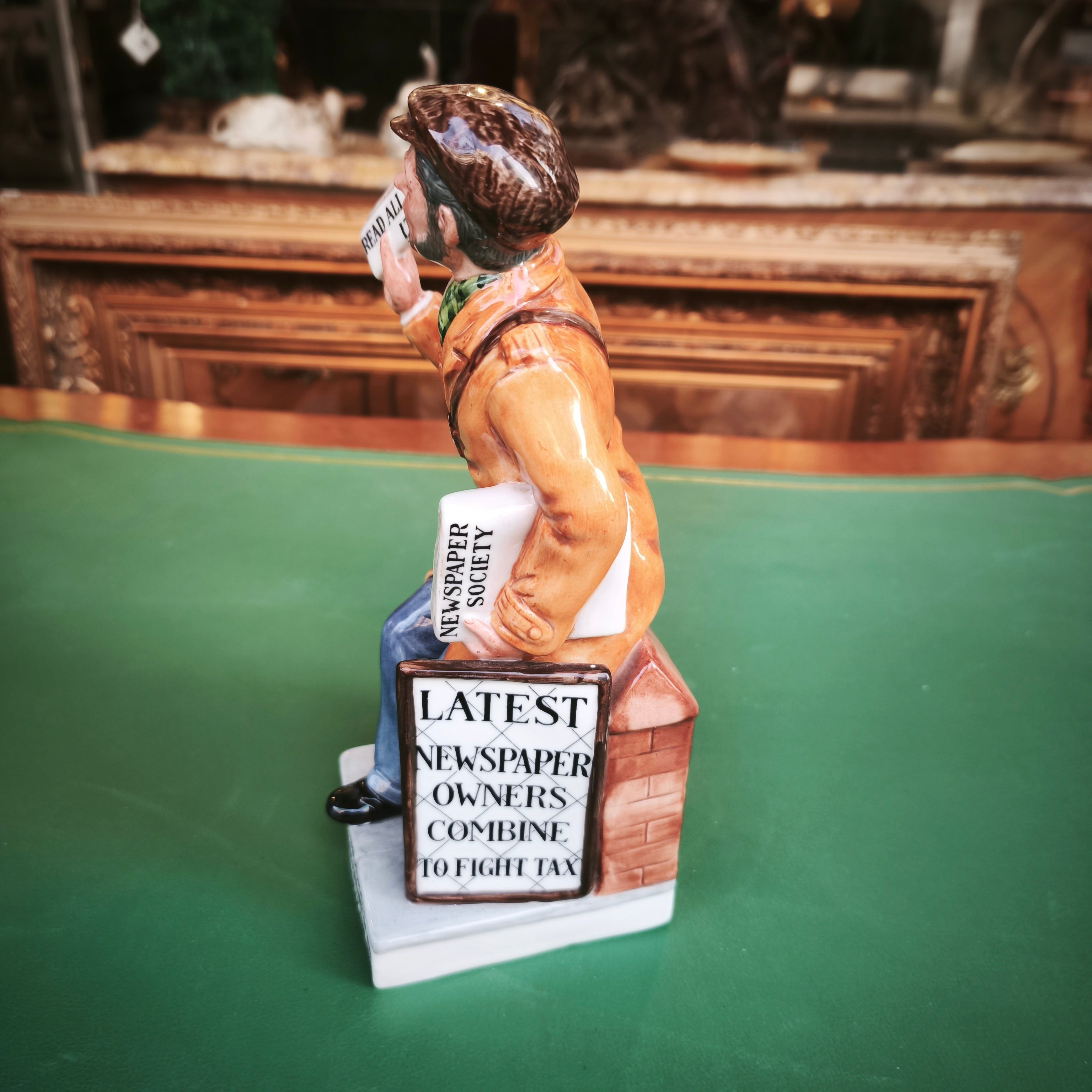 Figura hecha de porcelana de origen inglés de la reconocida marca Royal Doulton, representando a un vendedor de diario por motivo de la conmemoración del aniversario número 150 de la sociedad de diarios periódicos ingleses en 1986. La figura, pintada a mano, captura detalladamente al personaje, dándole mucho carácter y personalidad.