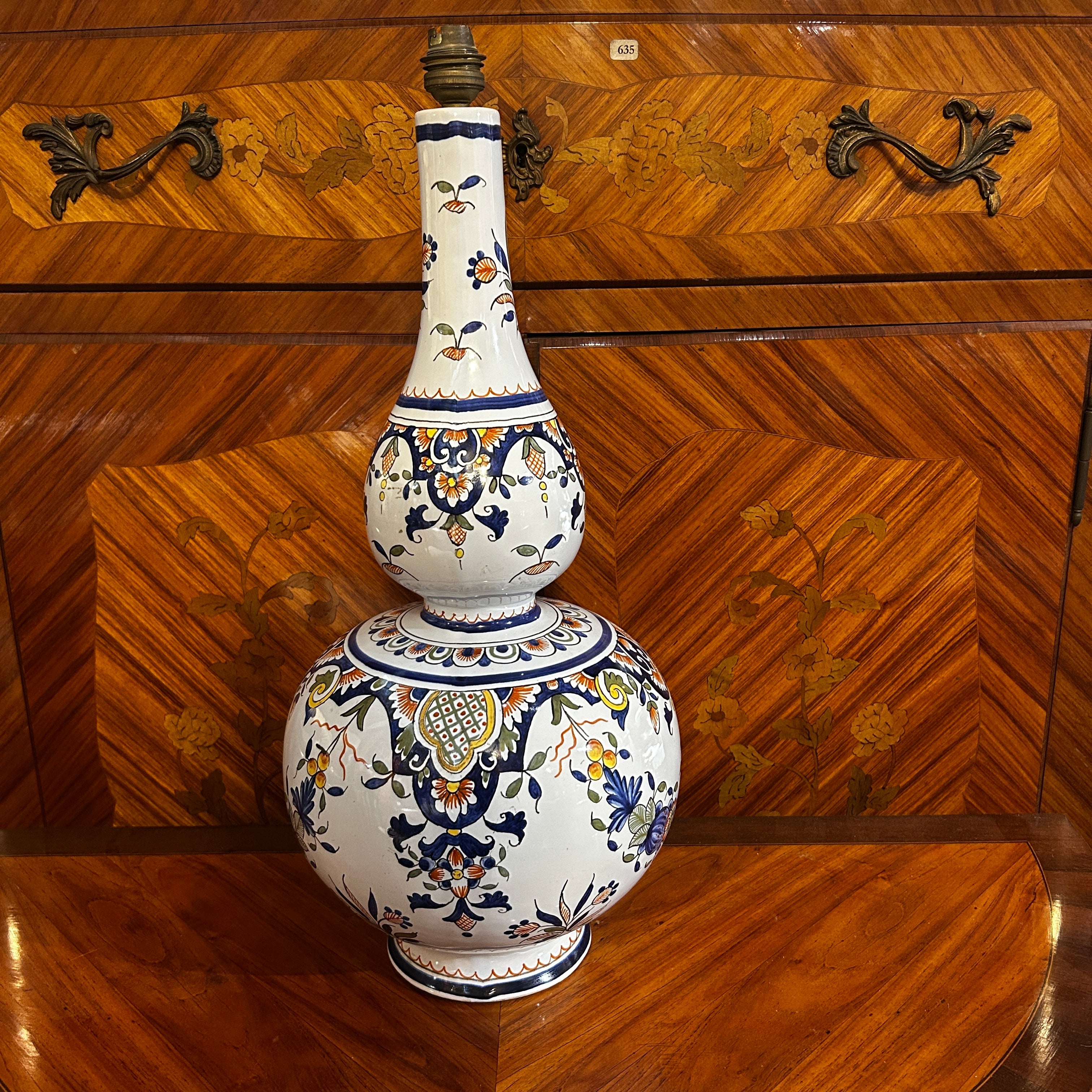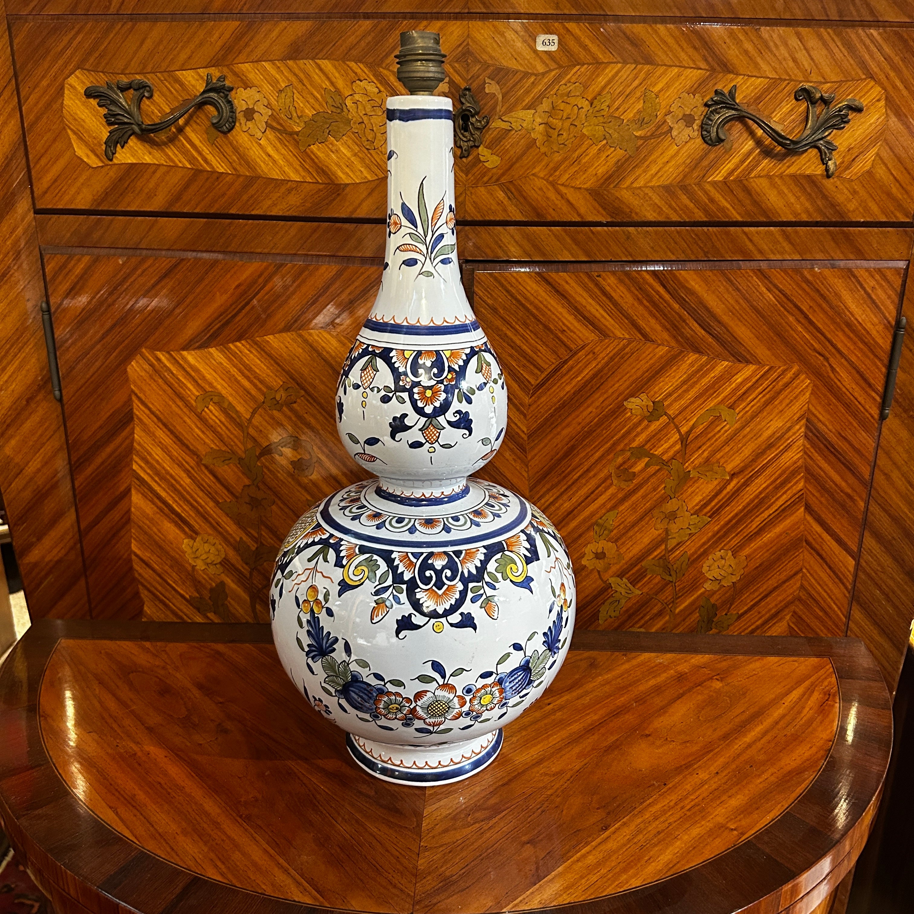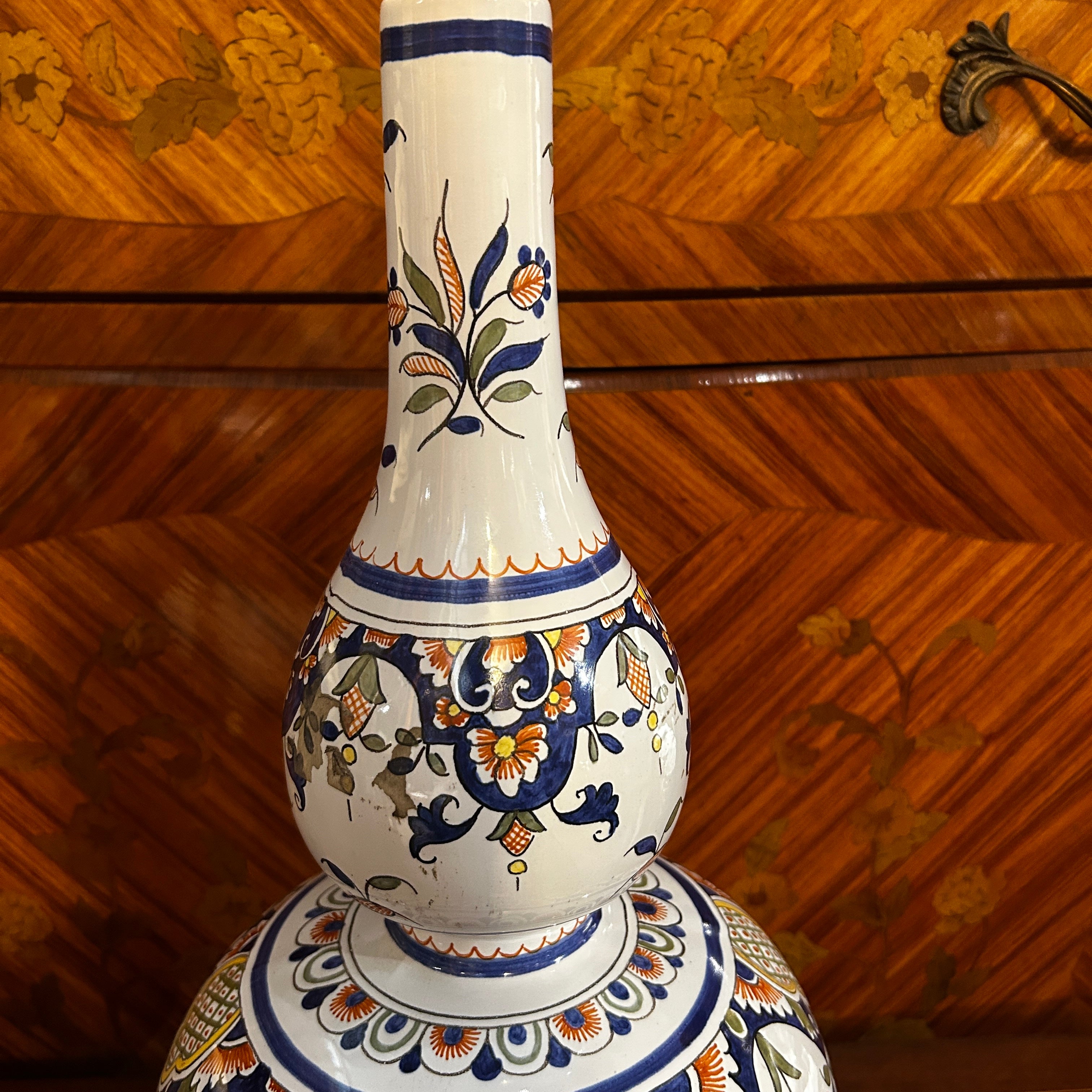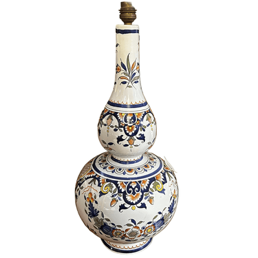 Preciosa lámpara de porcelana holandesa pintada a mano en el estilo Delft, con una hermosa forma de doble botella. Viene con electrificación francesa de doble contacto. Su diseño clásico floral donde podemos ver la prevalencia del azul como protagonista.