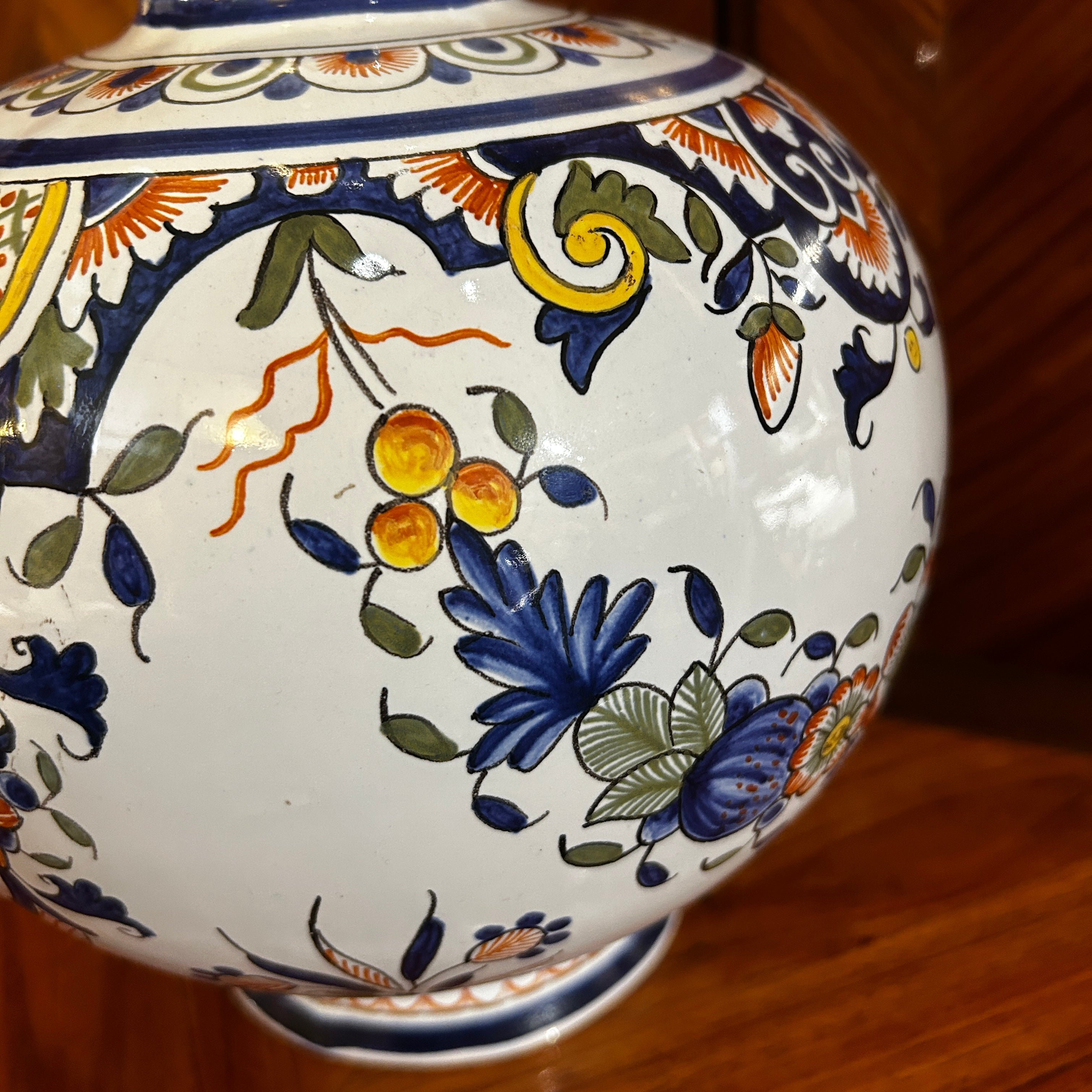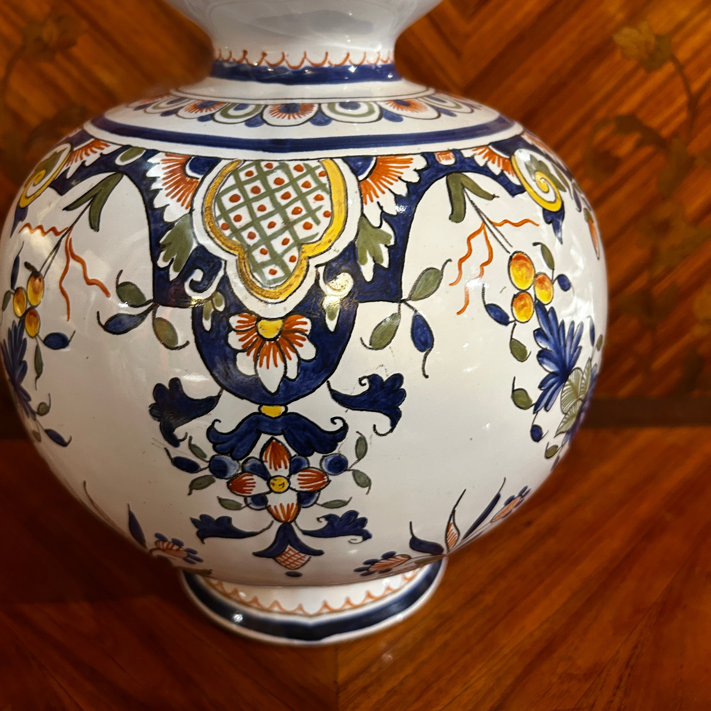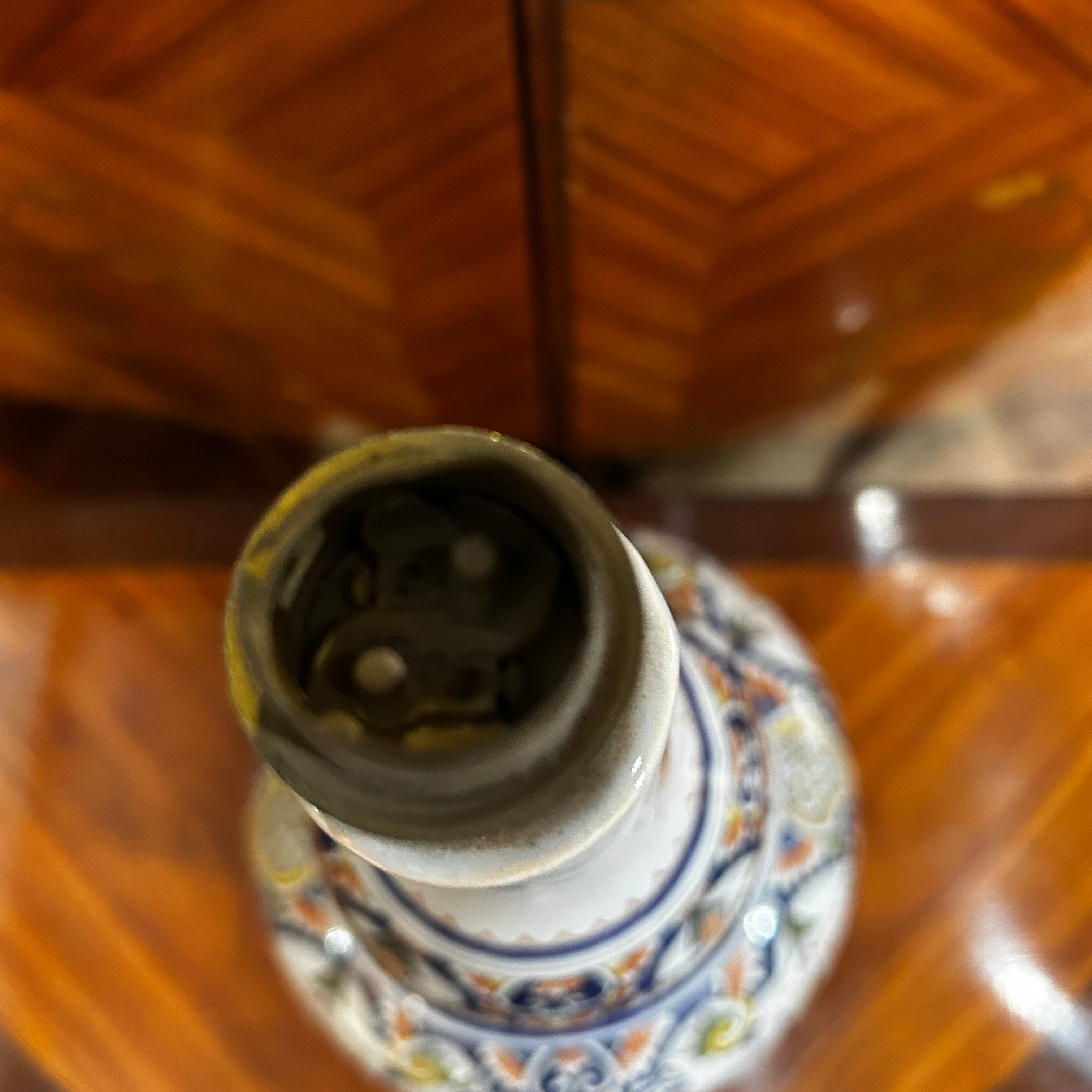 Preciosa lámpara de porcelana holandesa pintada a mano en el estilo Delft, con una hermosa forma de doble botella. Viene con electrificación francesa de doble contacto. Su diseño clásico floral donde podemos ver la prevalencia del azul como protagonista.