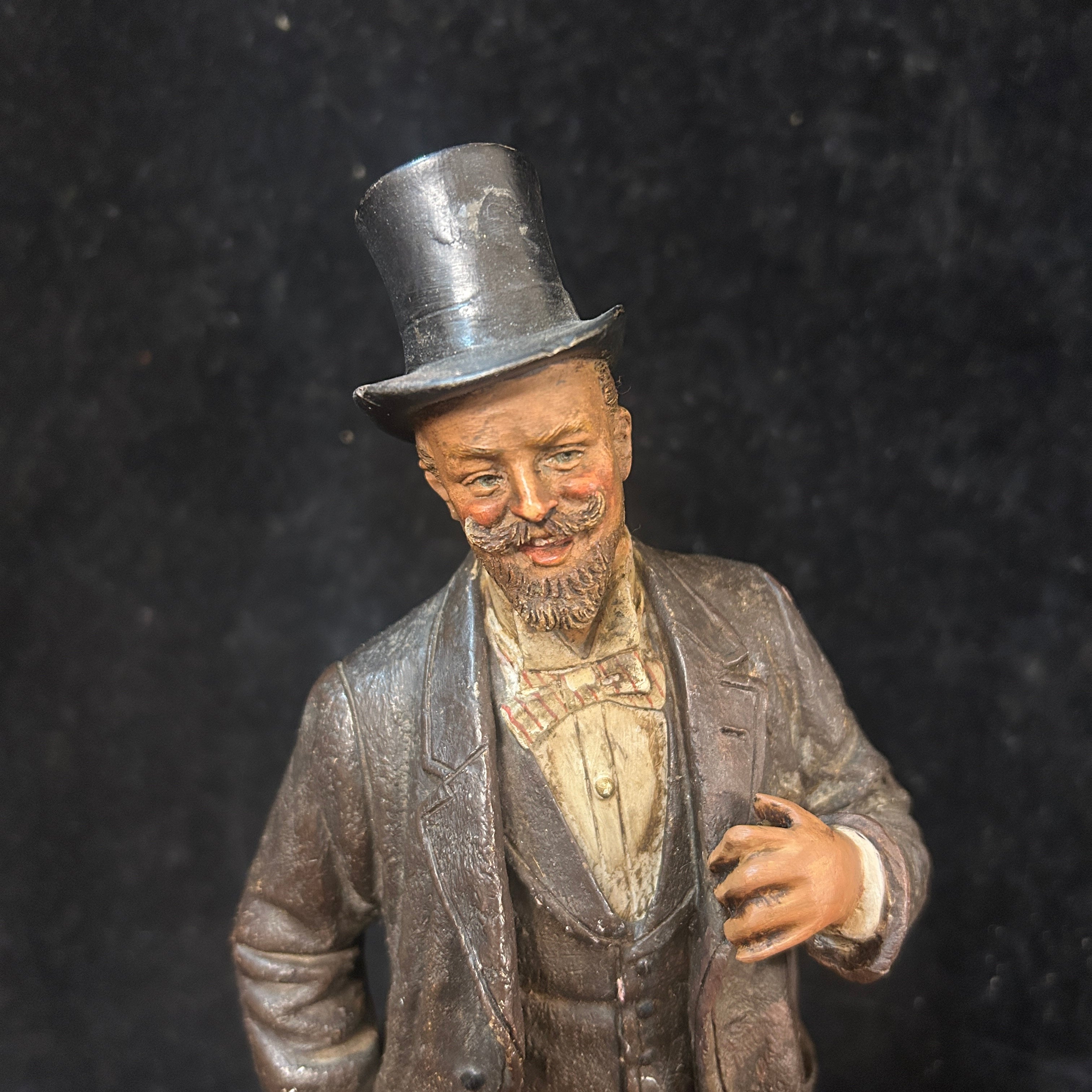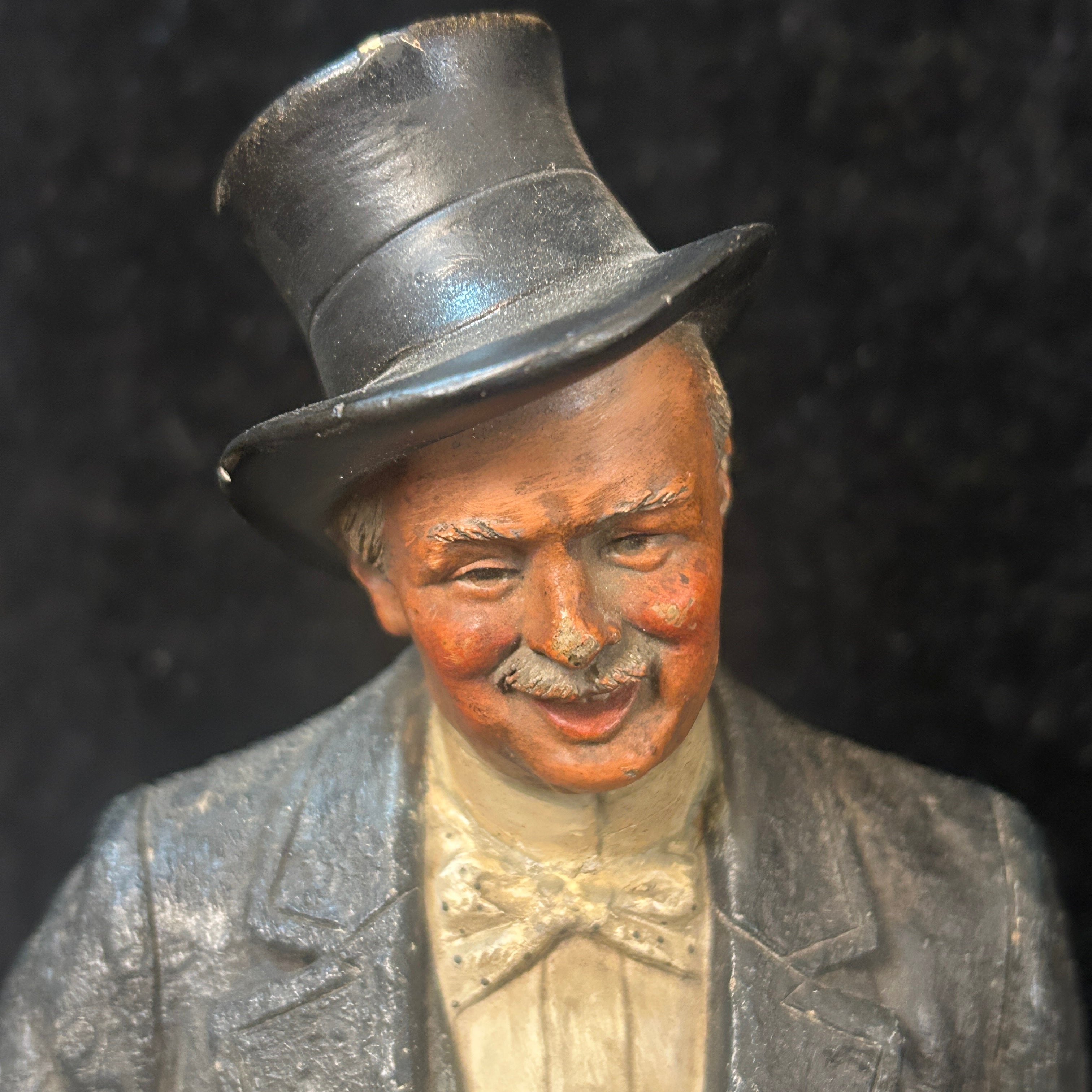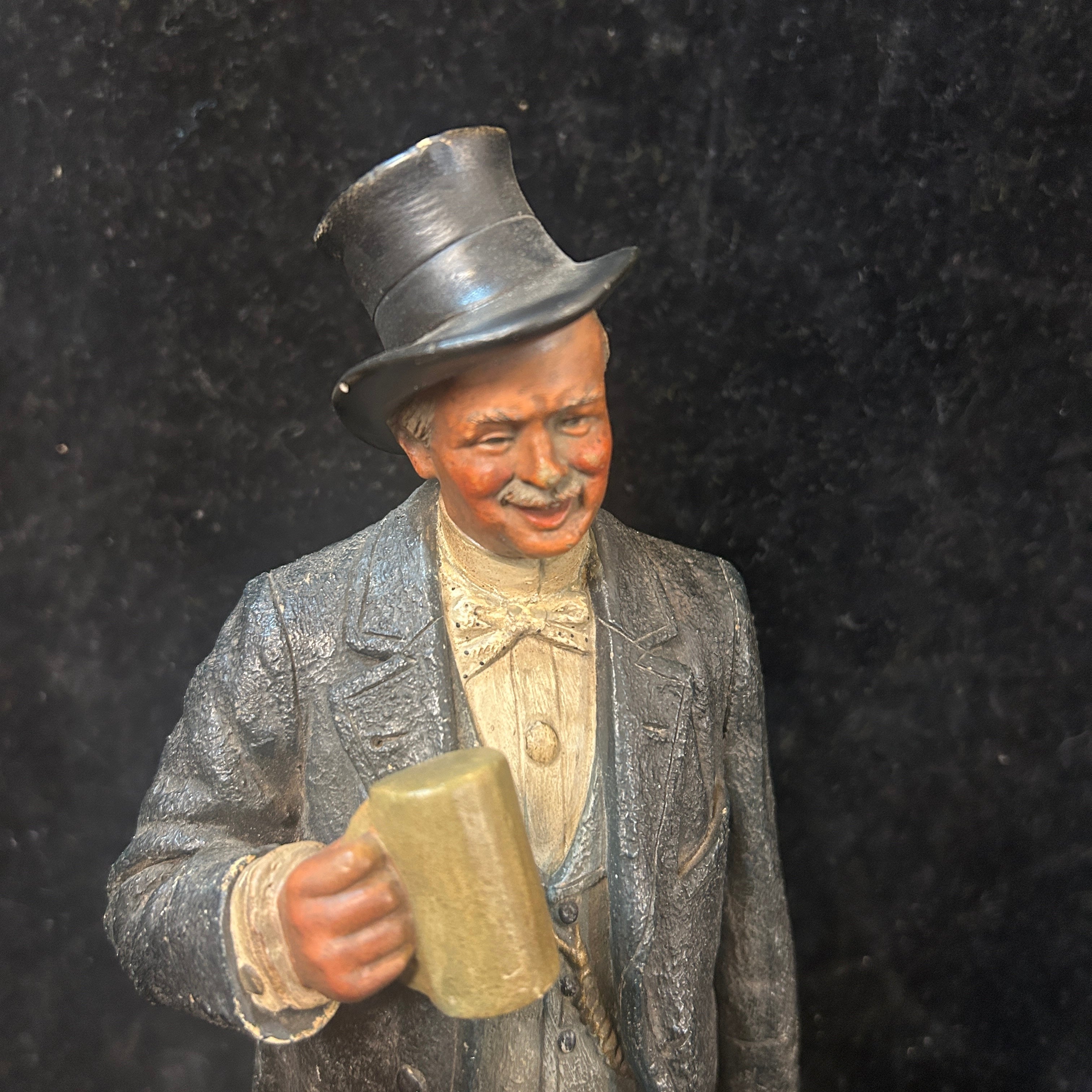 Pareja de figuras de terracota francesa, representando a un par de caballeros de x época, vestidos con traje y sombrero de copa, con un gesto relajado y de goce. Uno de ellos tiene una jarra de cerveza en su mano, aludiendo a un contexto más cotidiano y relajado.