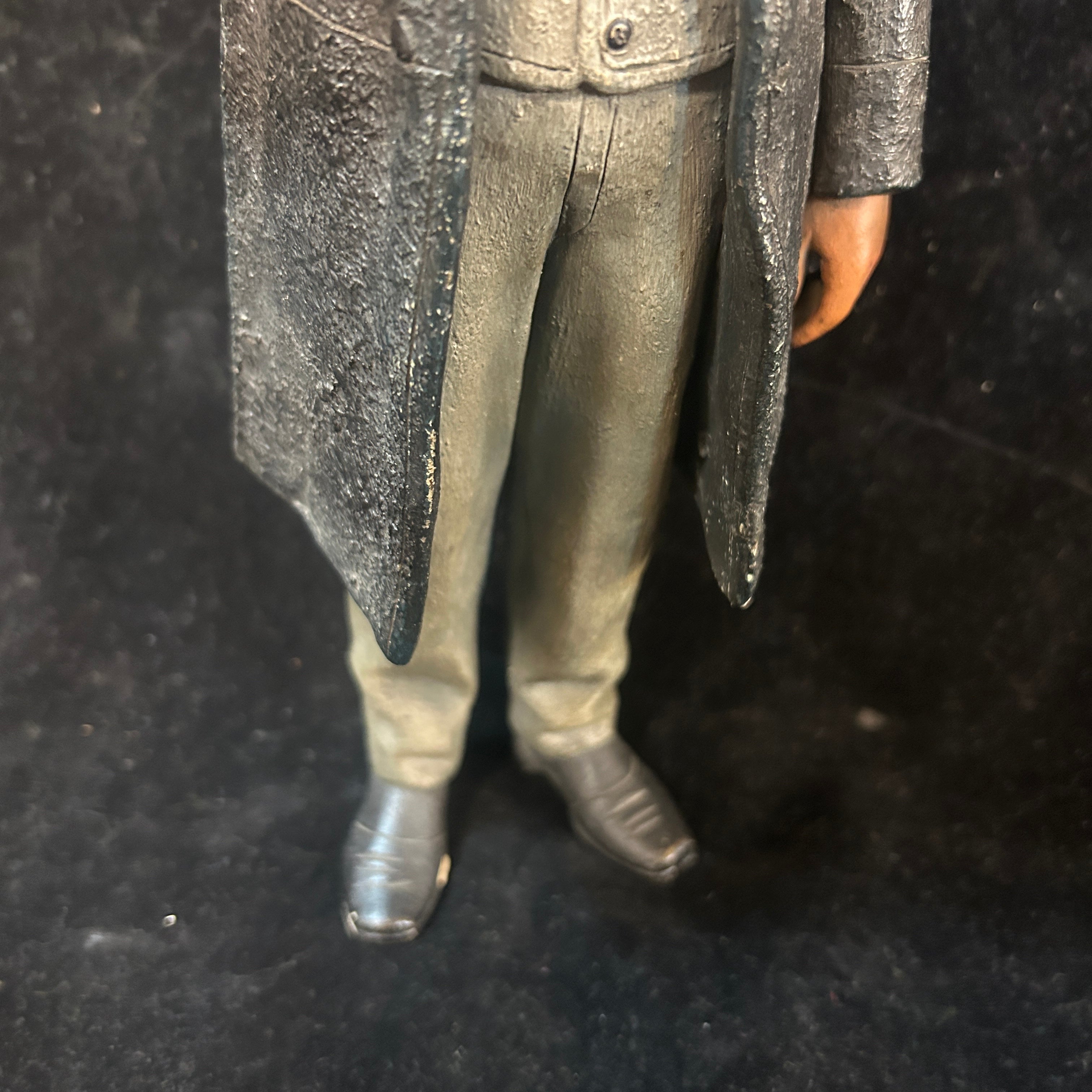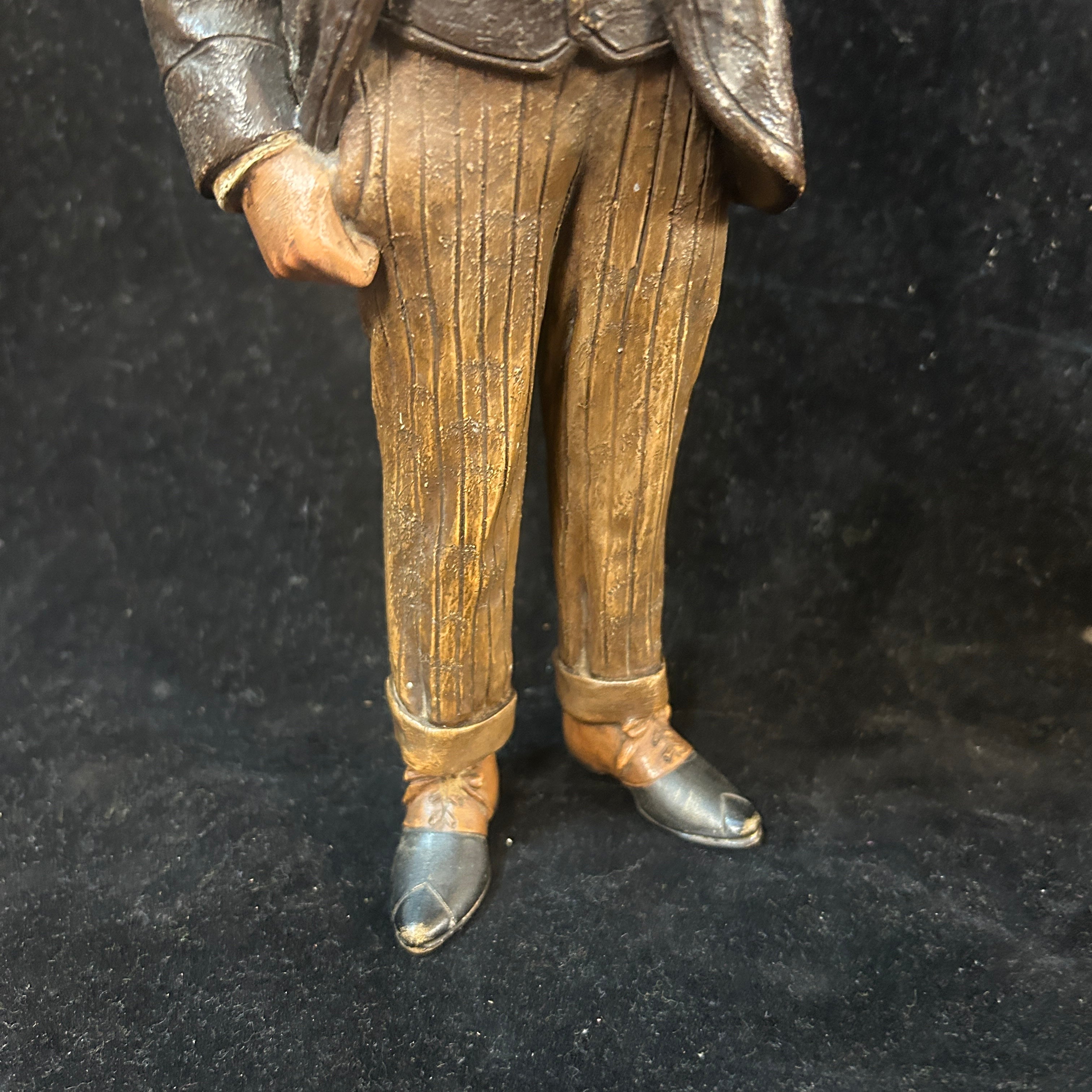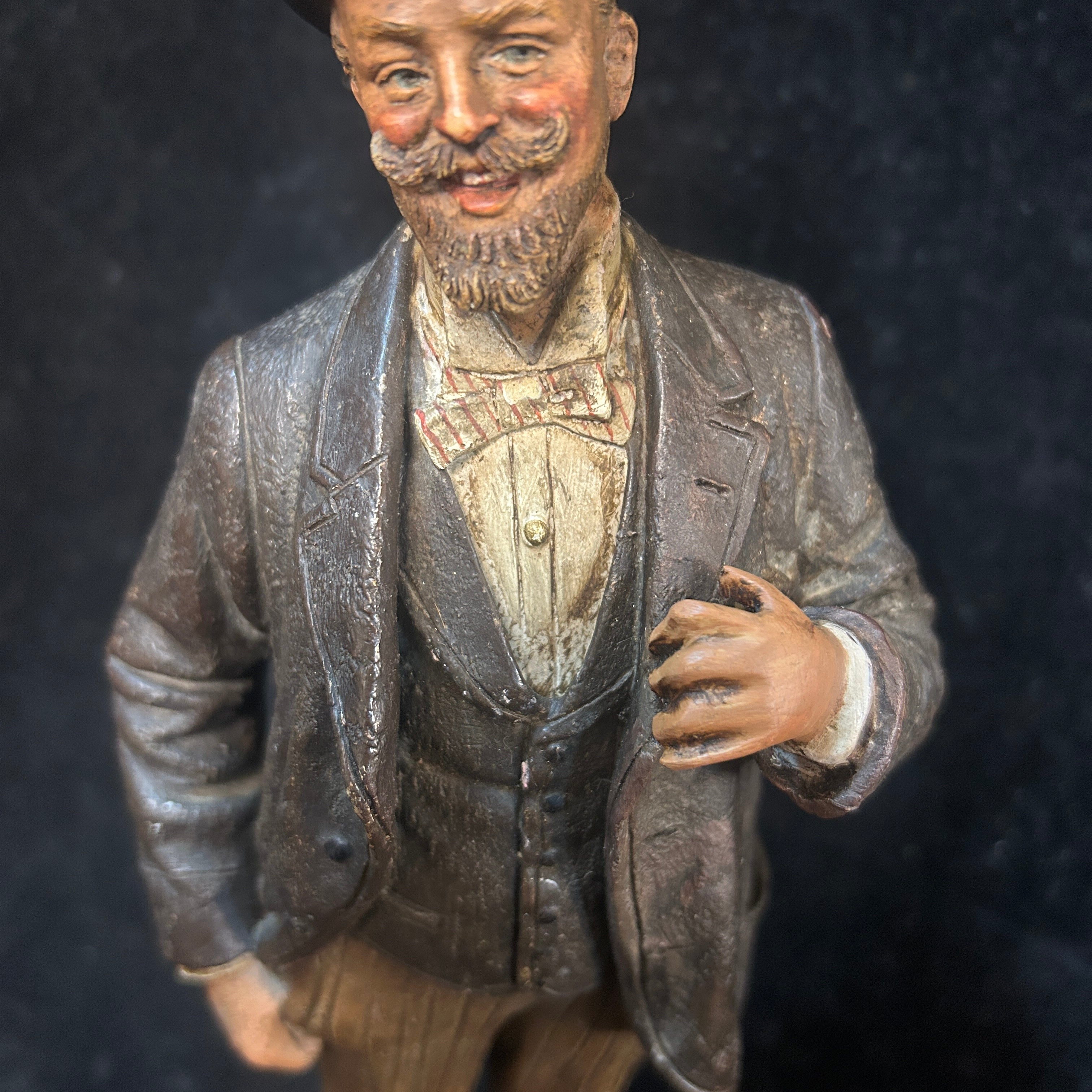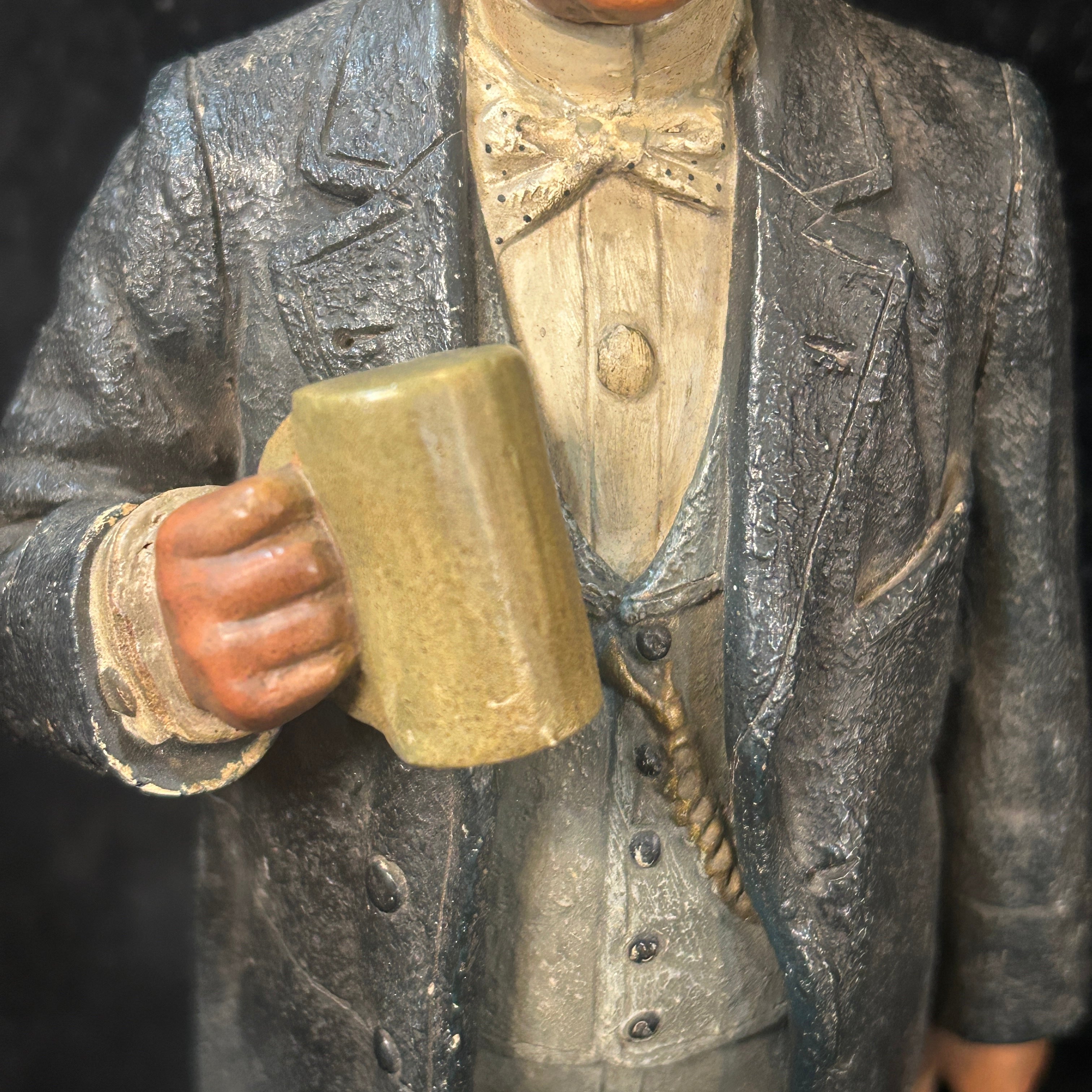 Pareja de figuras de terracota francesa, representando a un par de caballeros de x época, vestidos con traje y sombrero de copa, con un gesto relajado y de goce. Uno de ellos tiene una jarra de cerveza en su mano, aludiendo a un contexto más cotidiano y relajado.