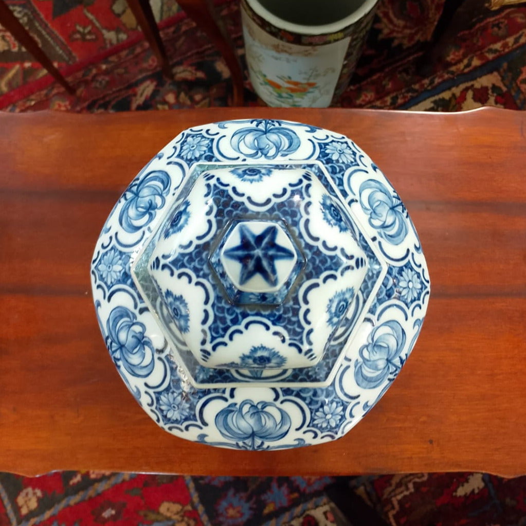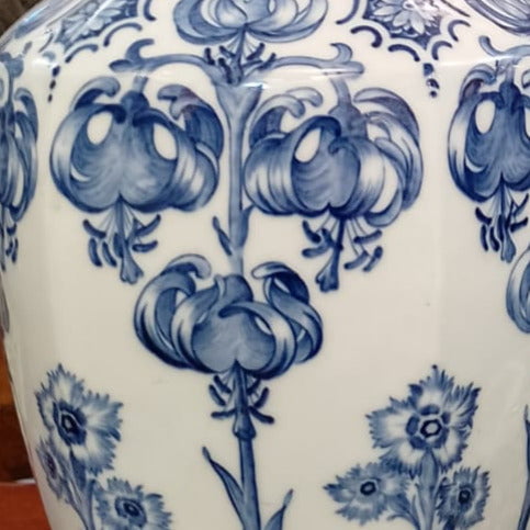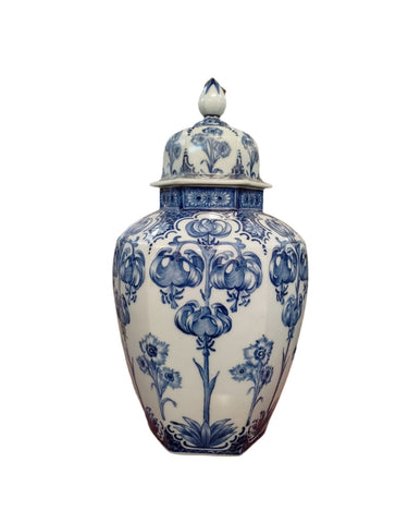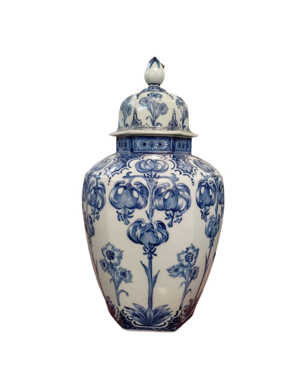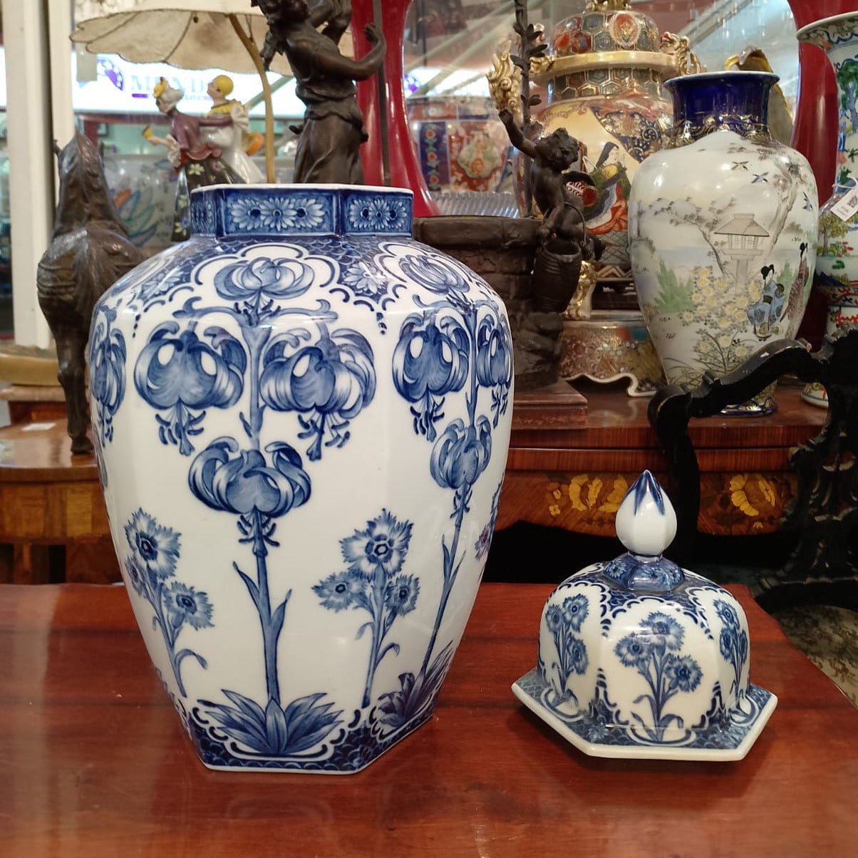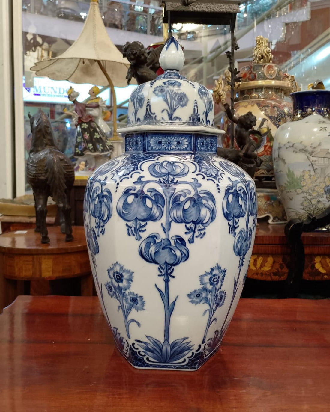 Hermoso potiche de porcelana Meissen en azul y blanco con motivos florales. Cuenta con un tapón de corona removible y el sello de la prestigiosa fábrica en su base.
