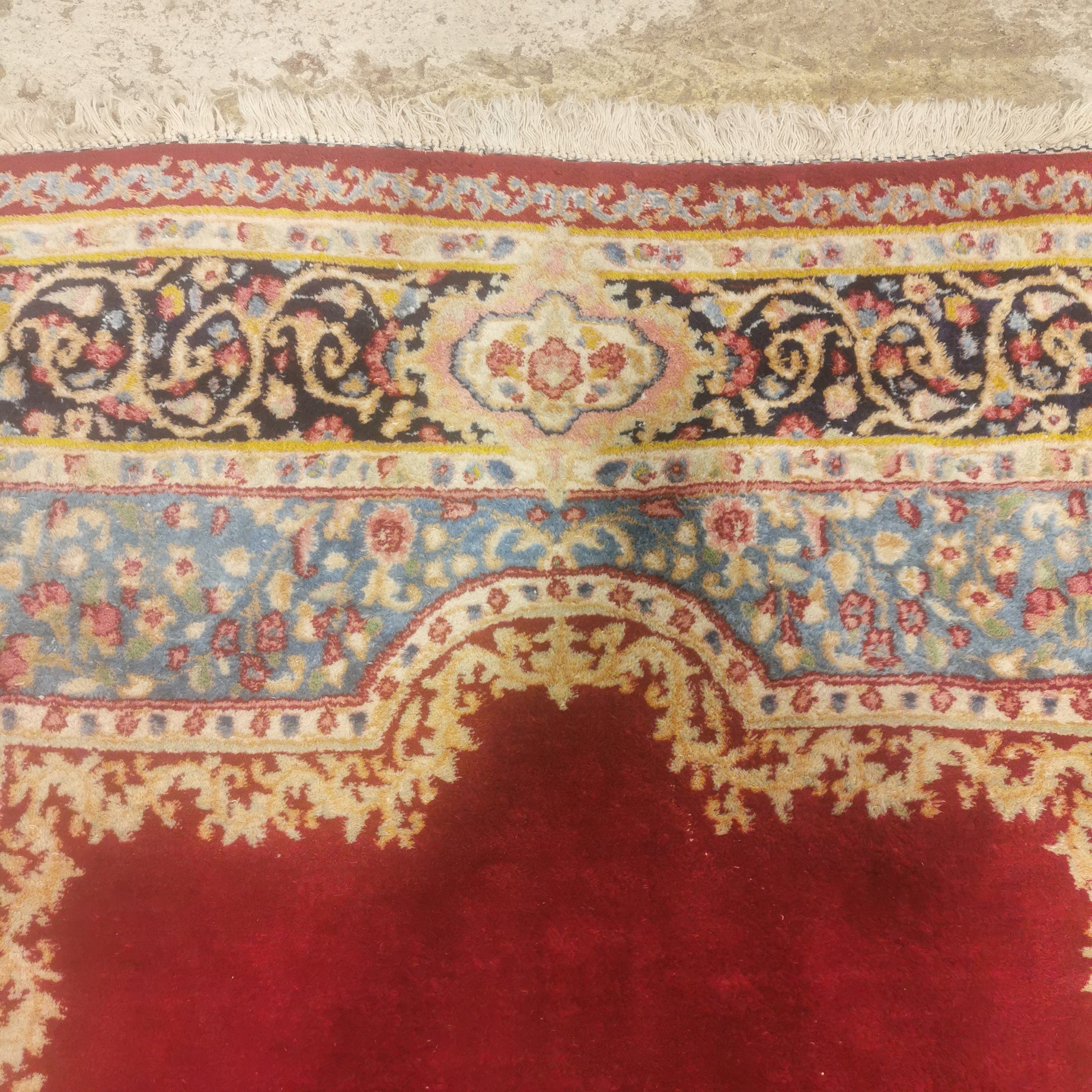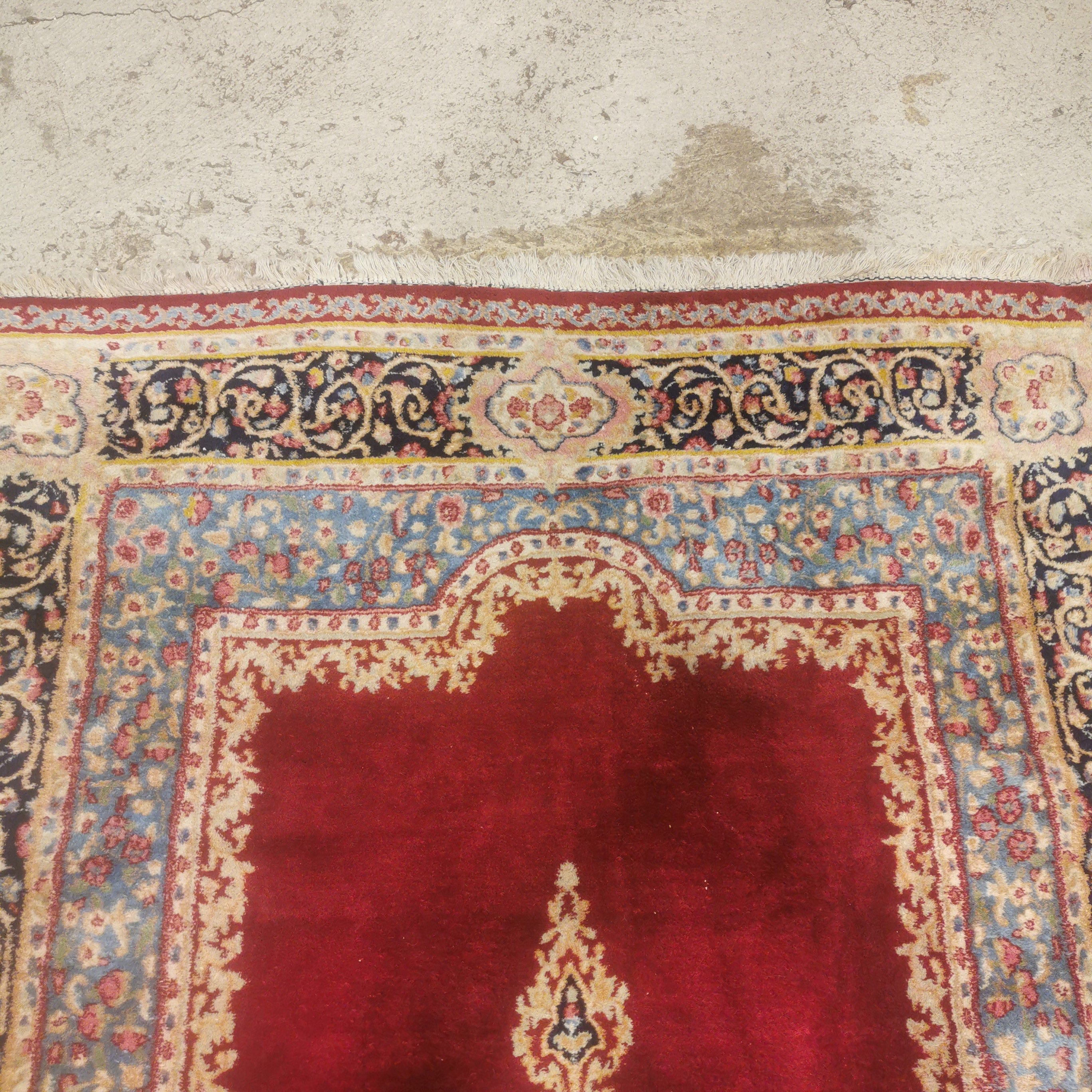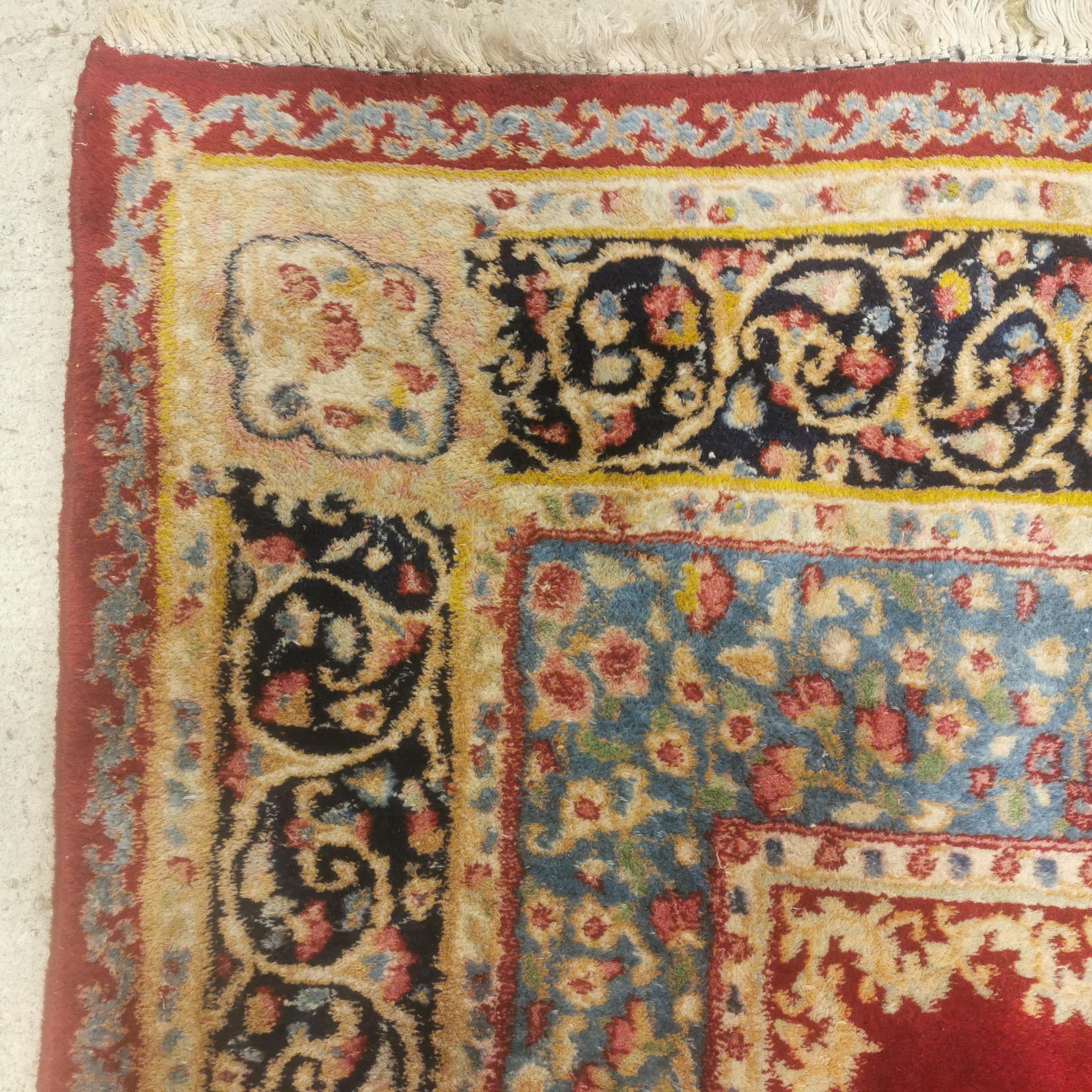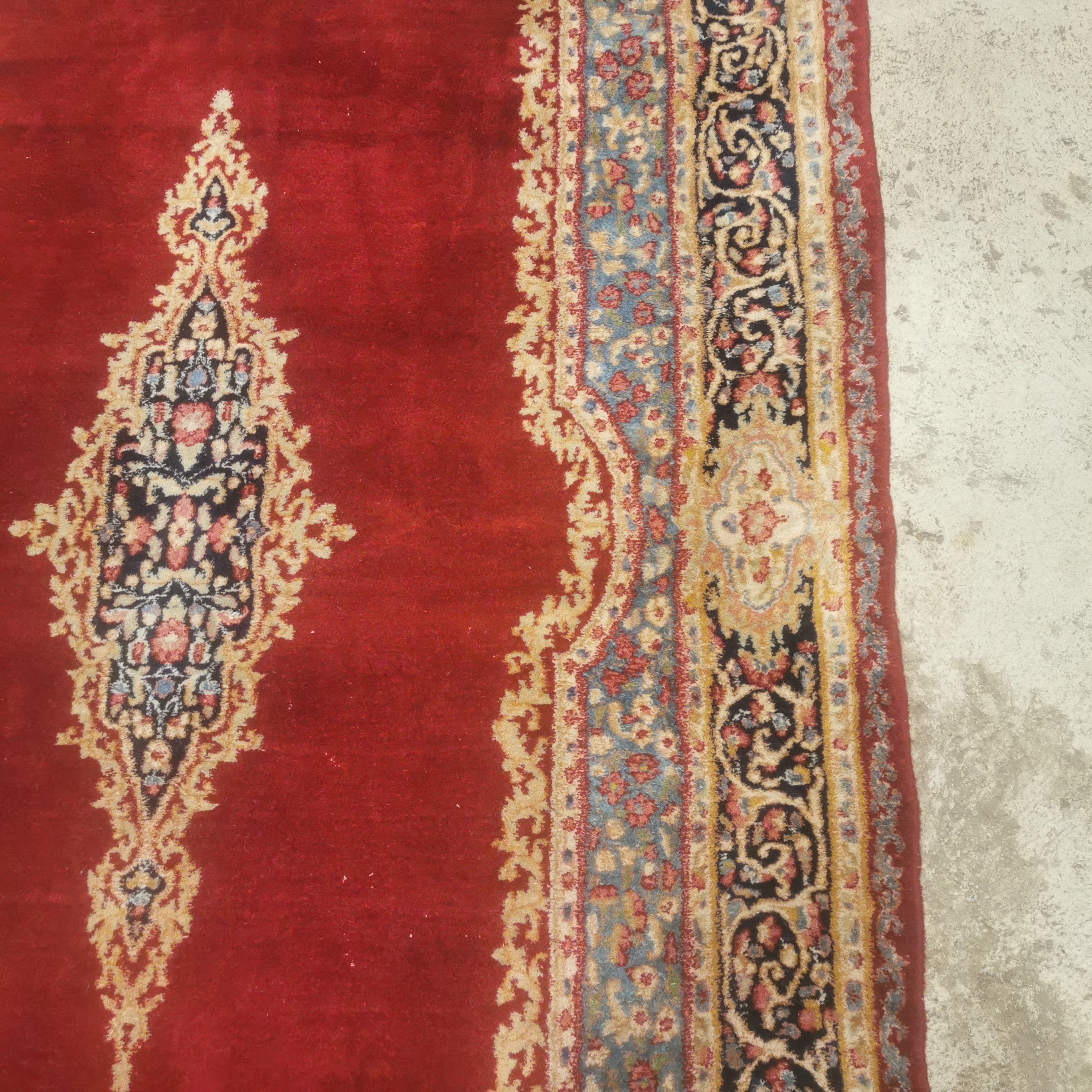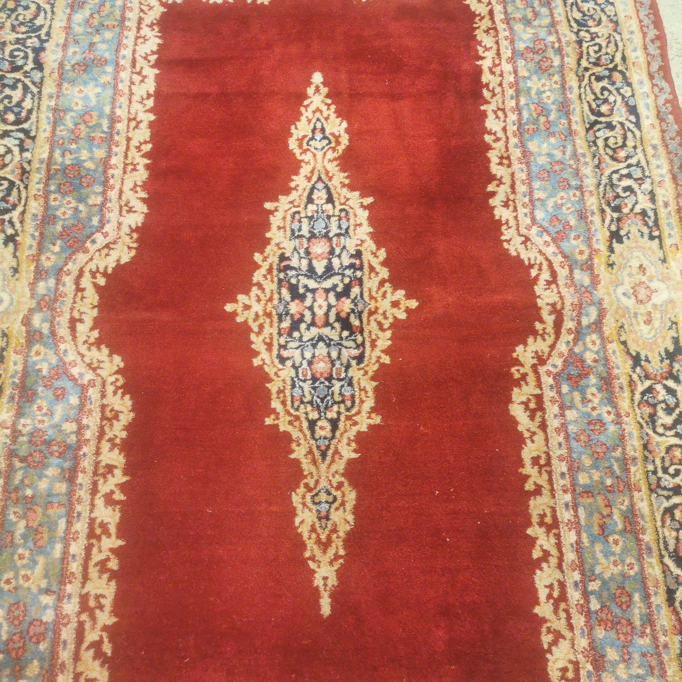 Bonita alfombra Persa Kirman de lana de fines del siglo XX. Conocidas por sus detalles florales y patrones geométricos en los bellos tonos rojizo, azul turquesa y azul marino.