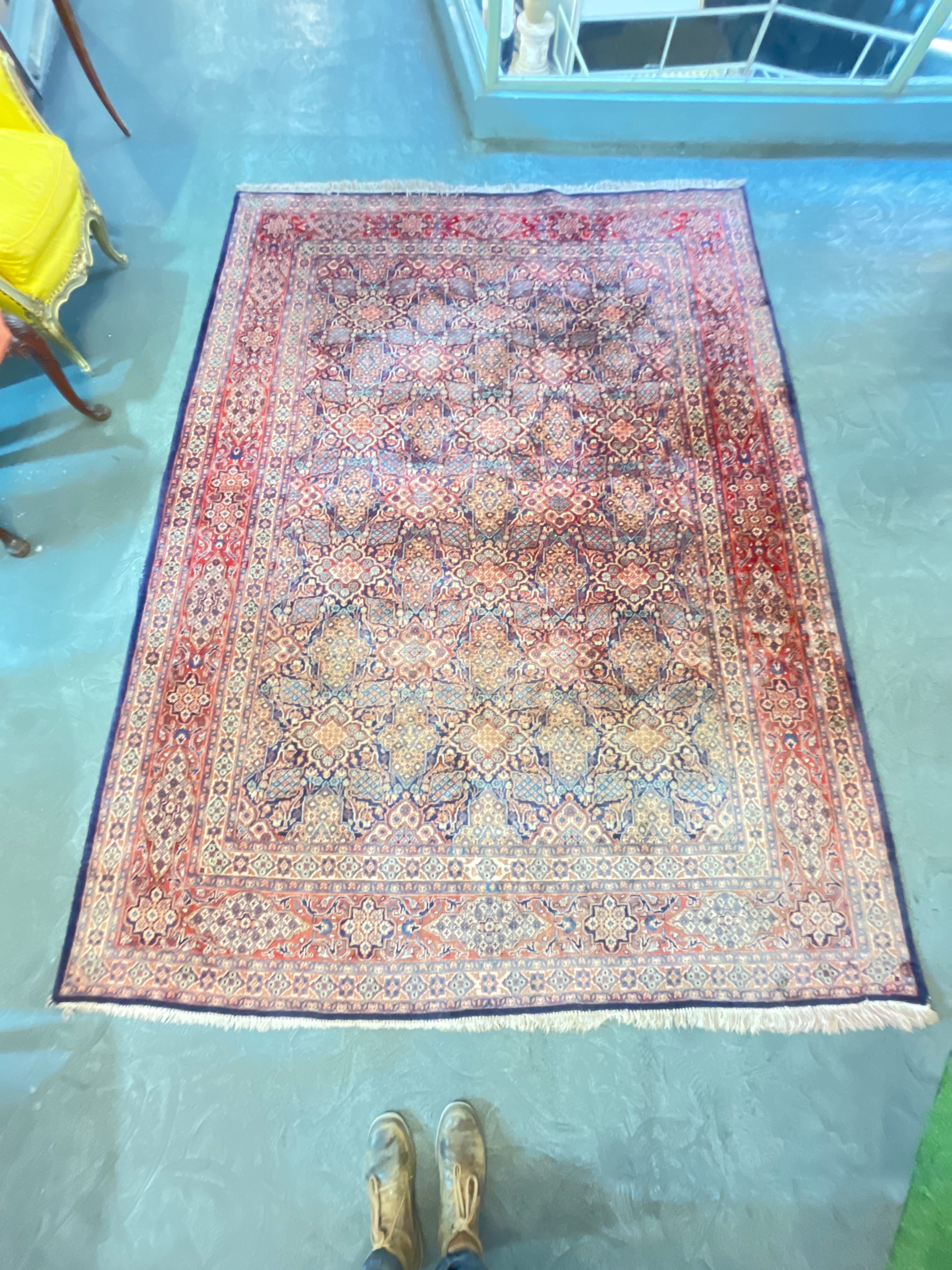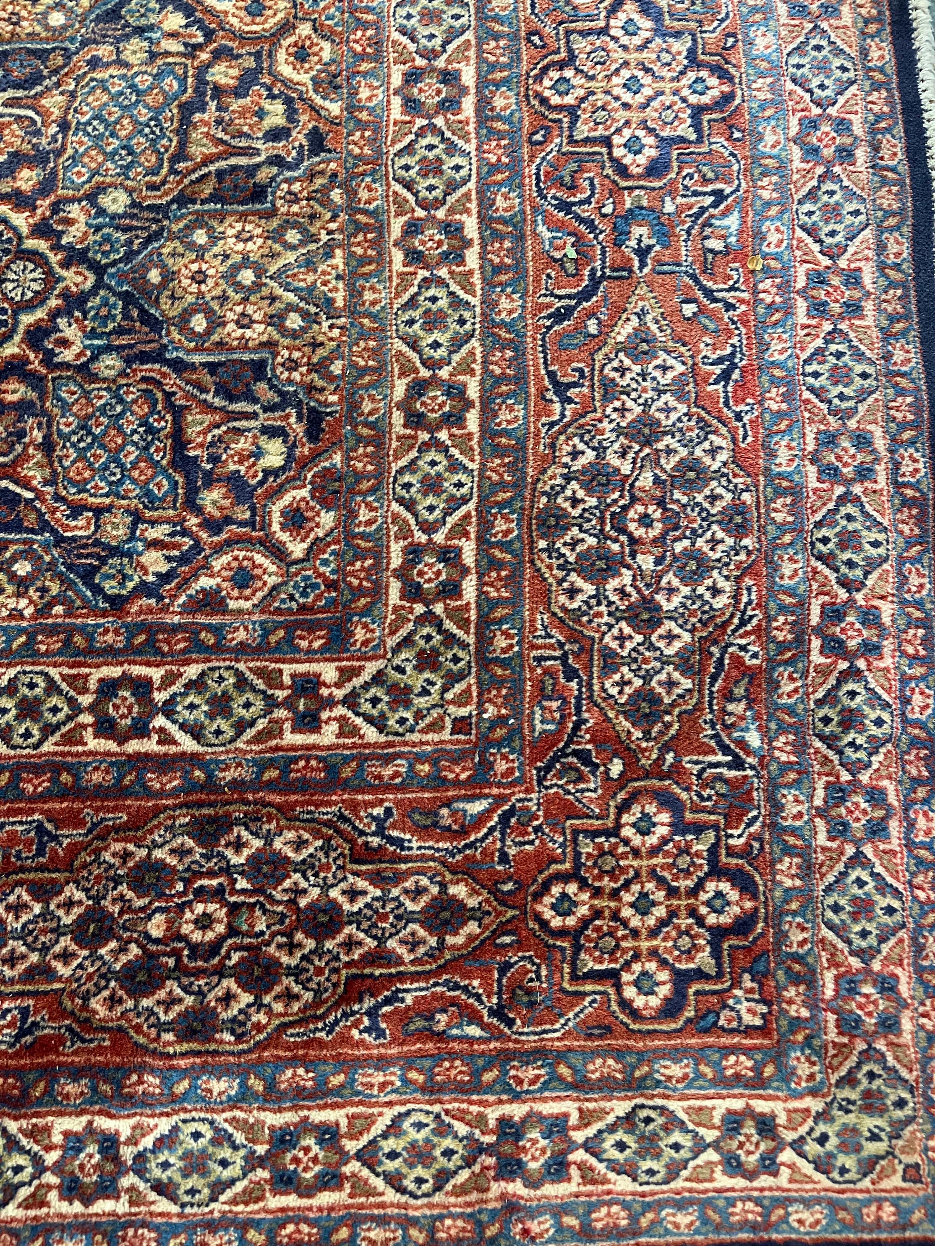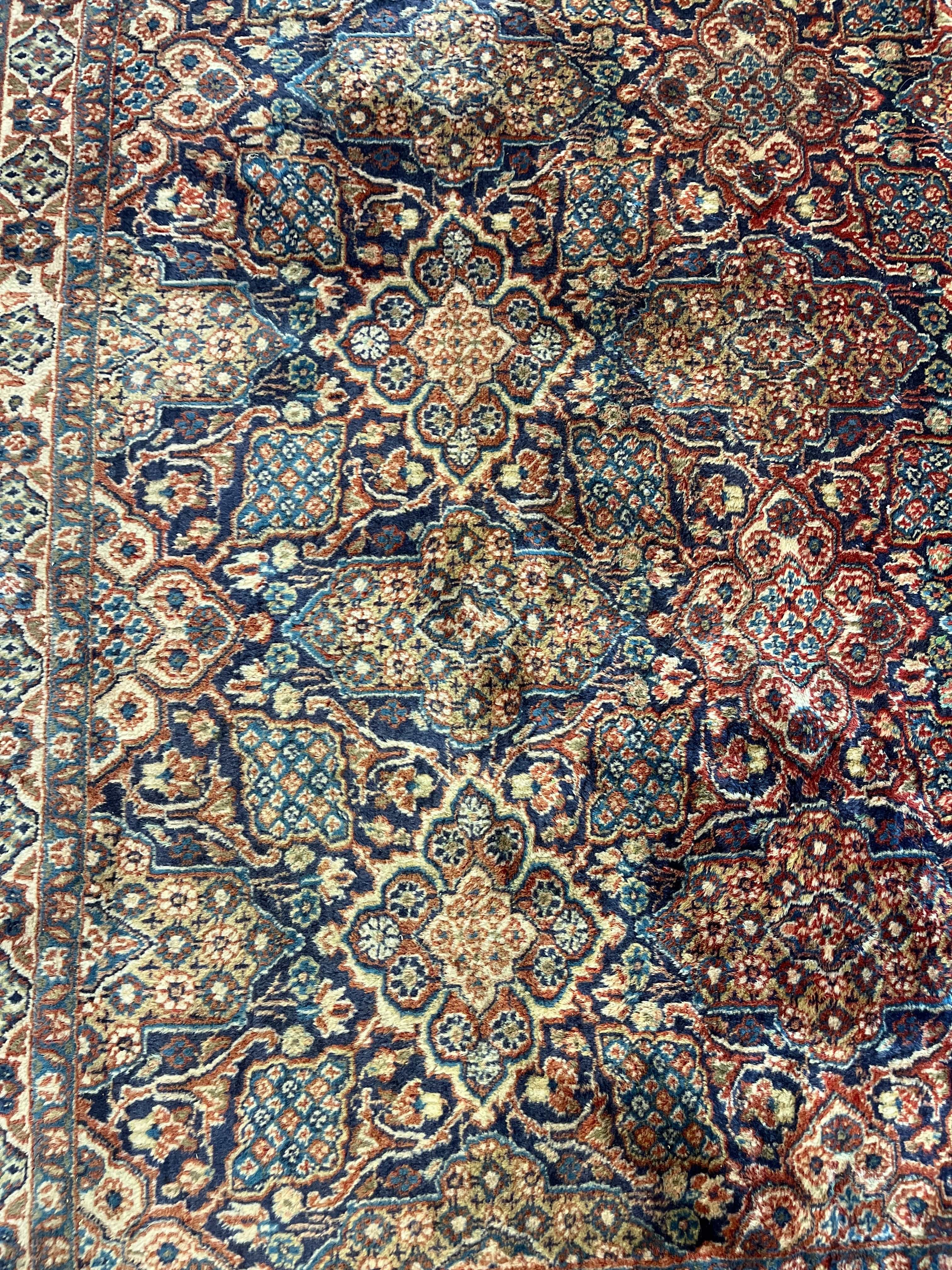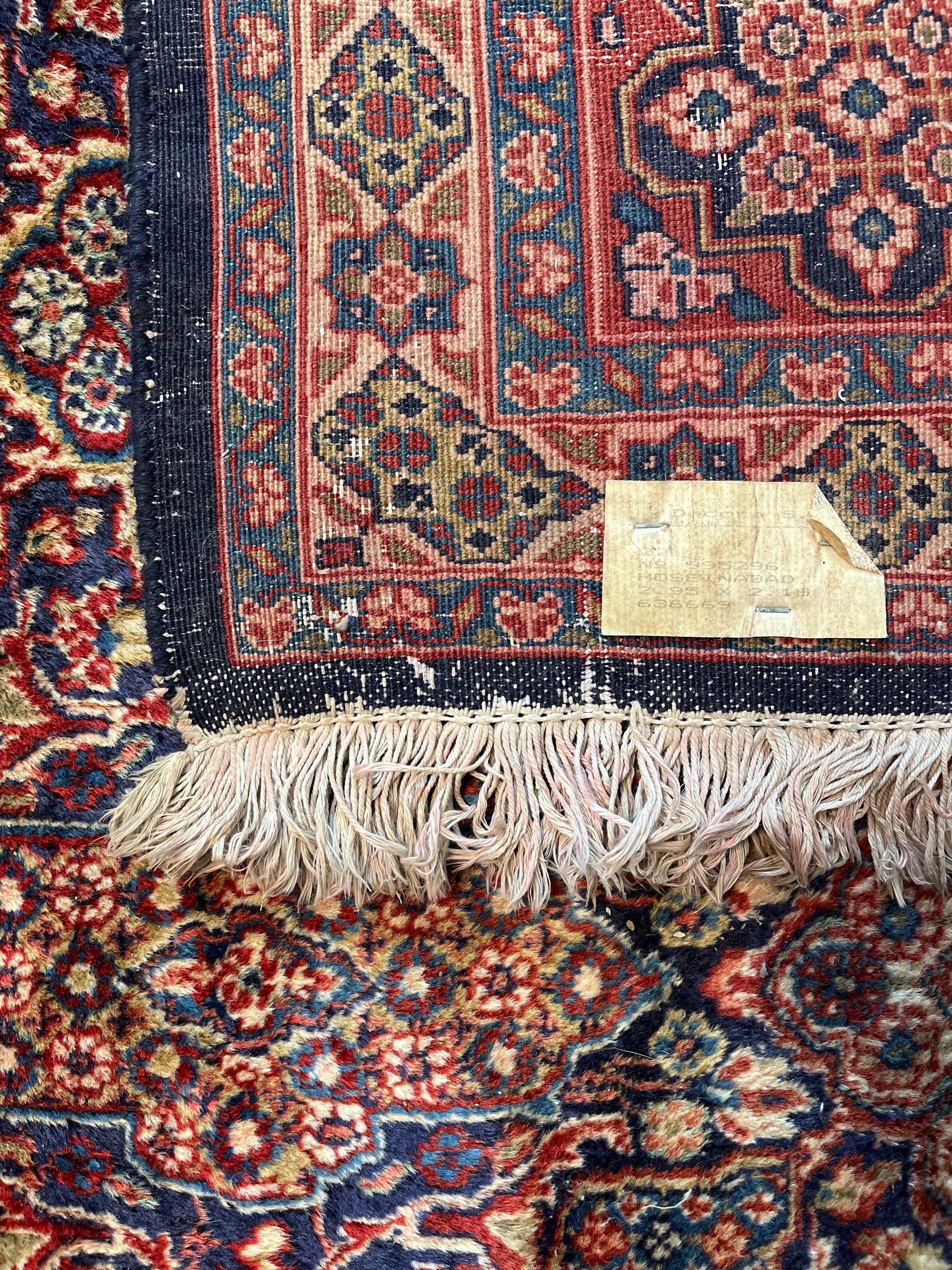 Preciosa Alfombra Hoseinabad iraní, en tonos rojizos y detalles en colores claros y azules. Completamente hecha a mano.