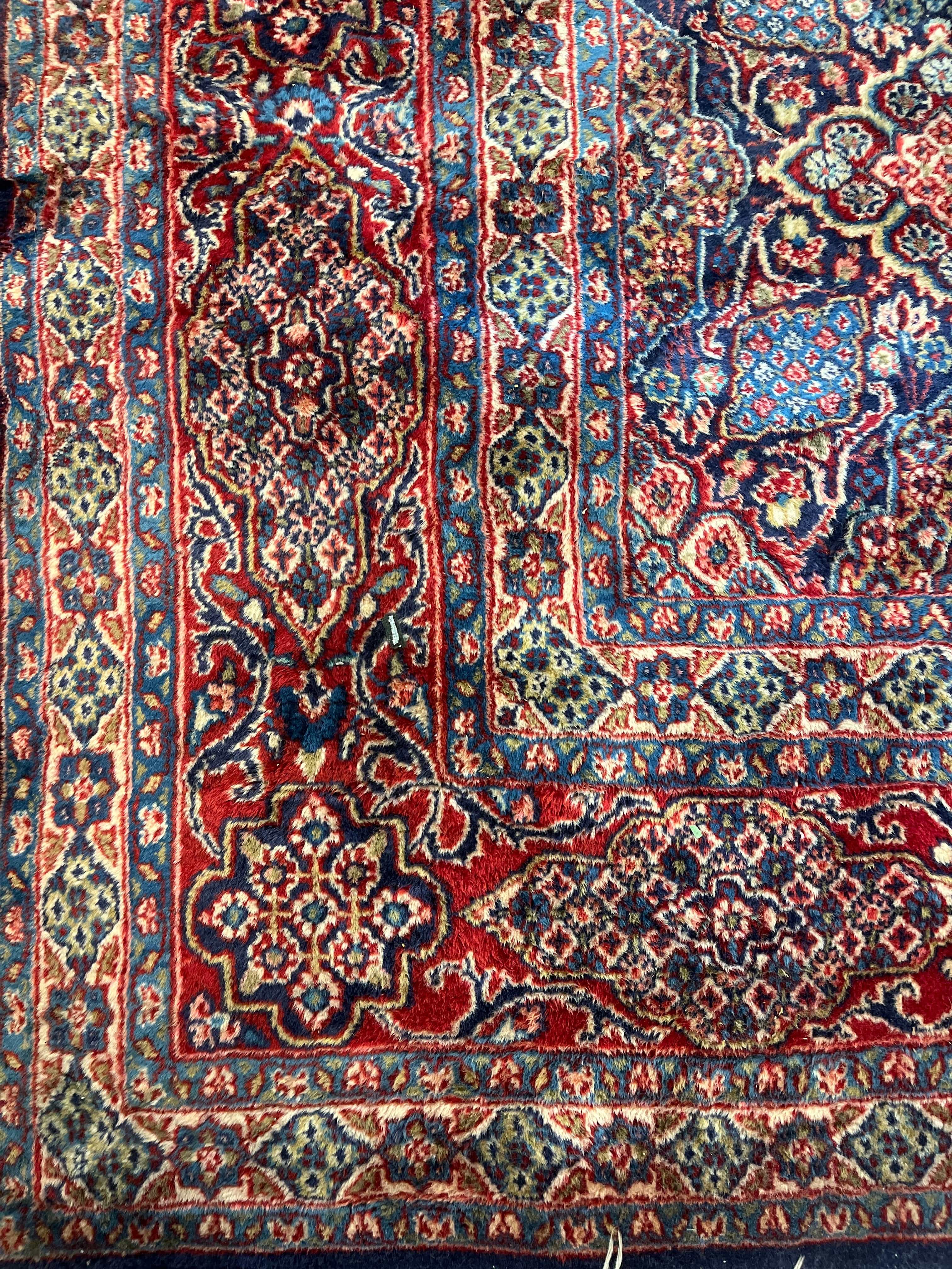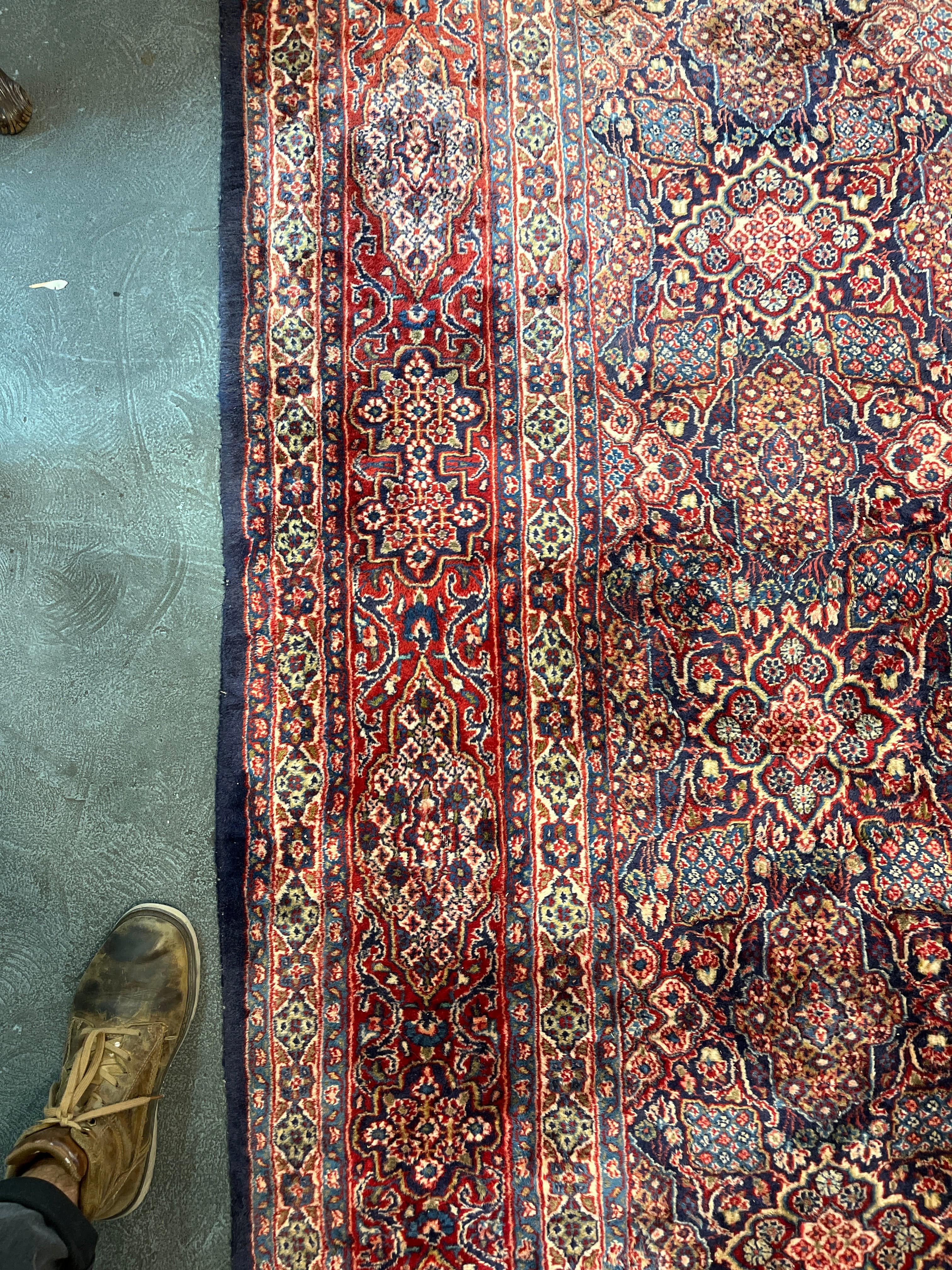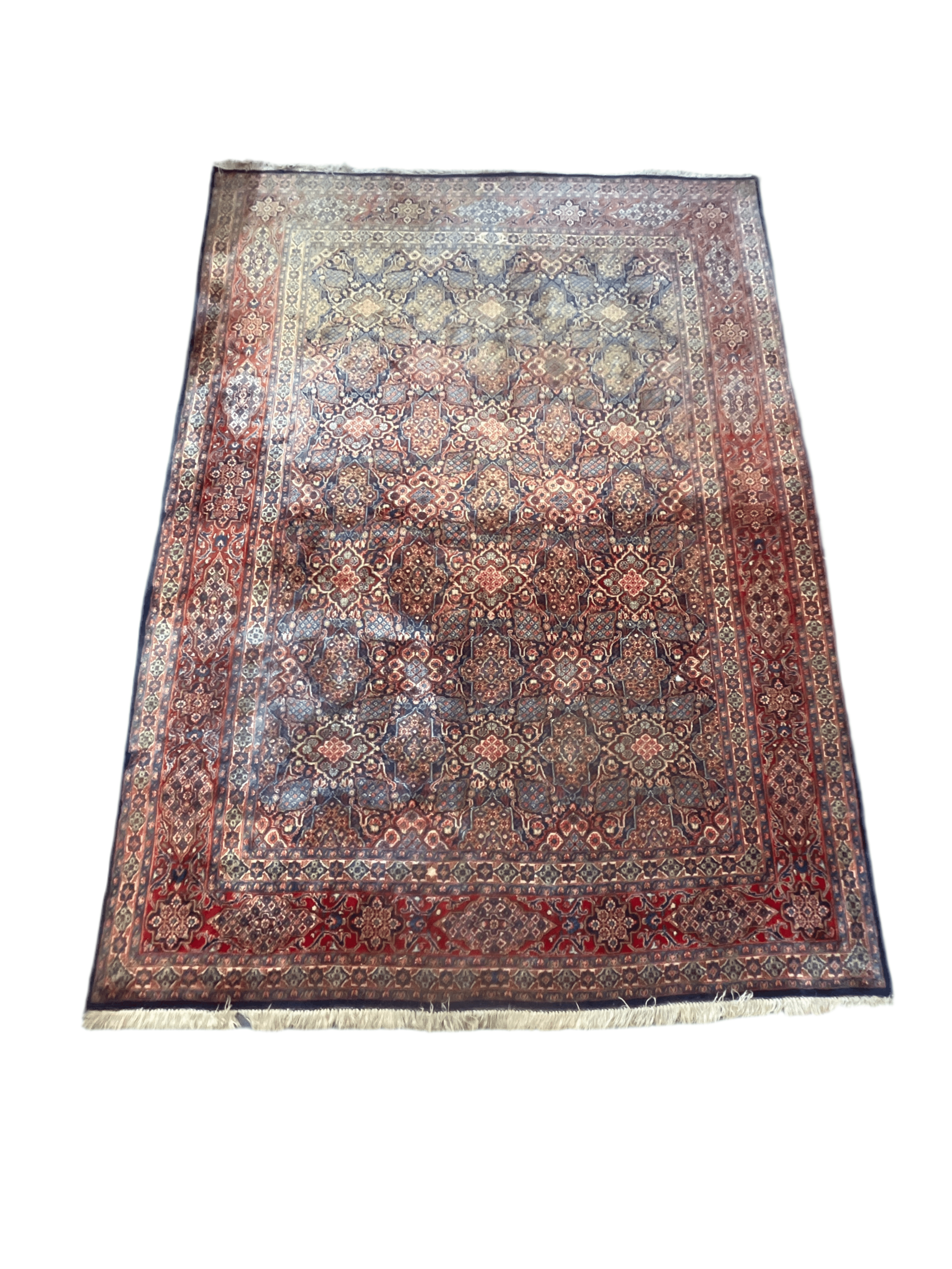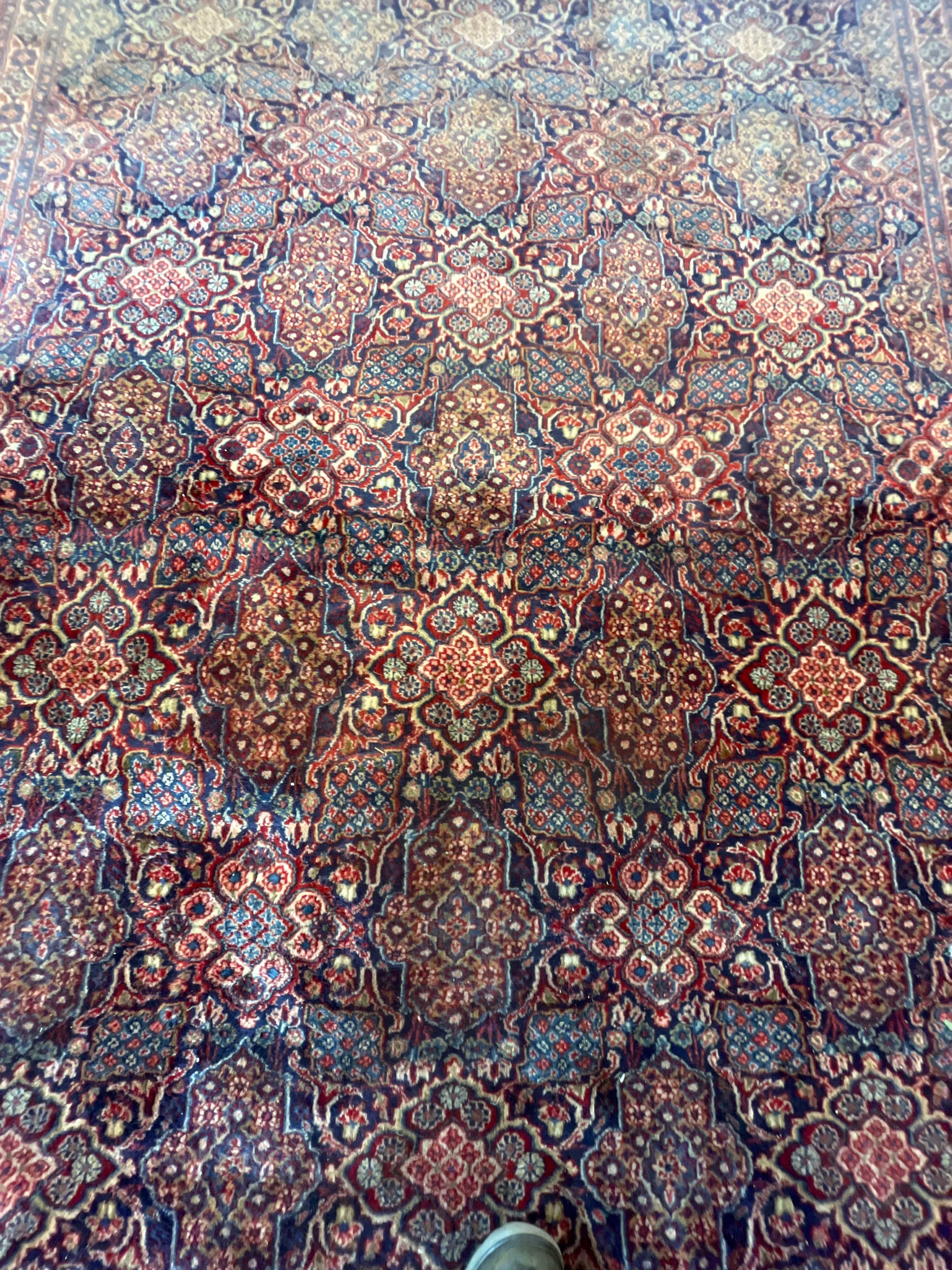 Preciosa Alfombra Hoseinabad iraní, en tonos rojizos y detalles en colores claros y azules. Completamente hecha a mano.
