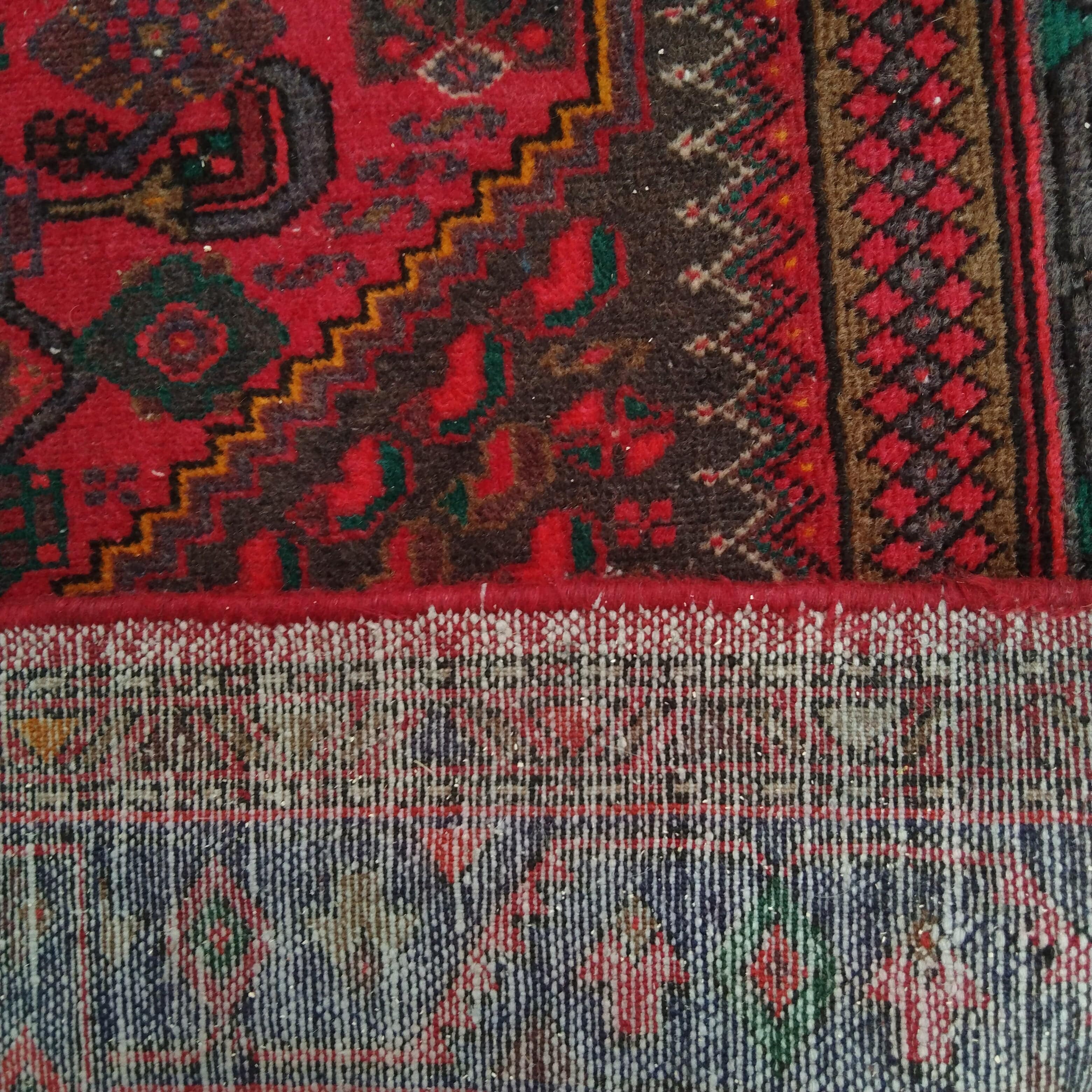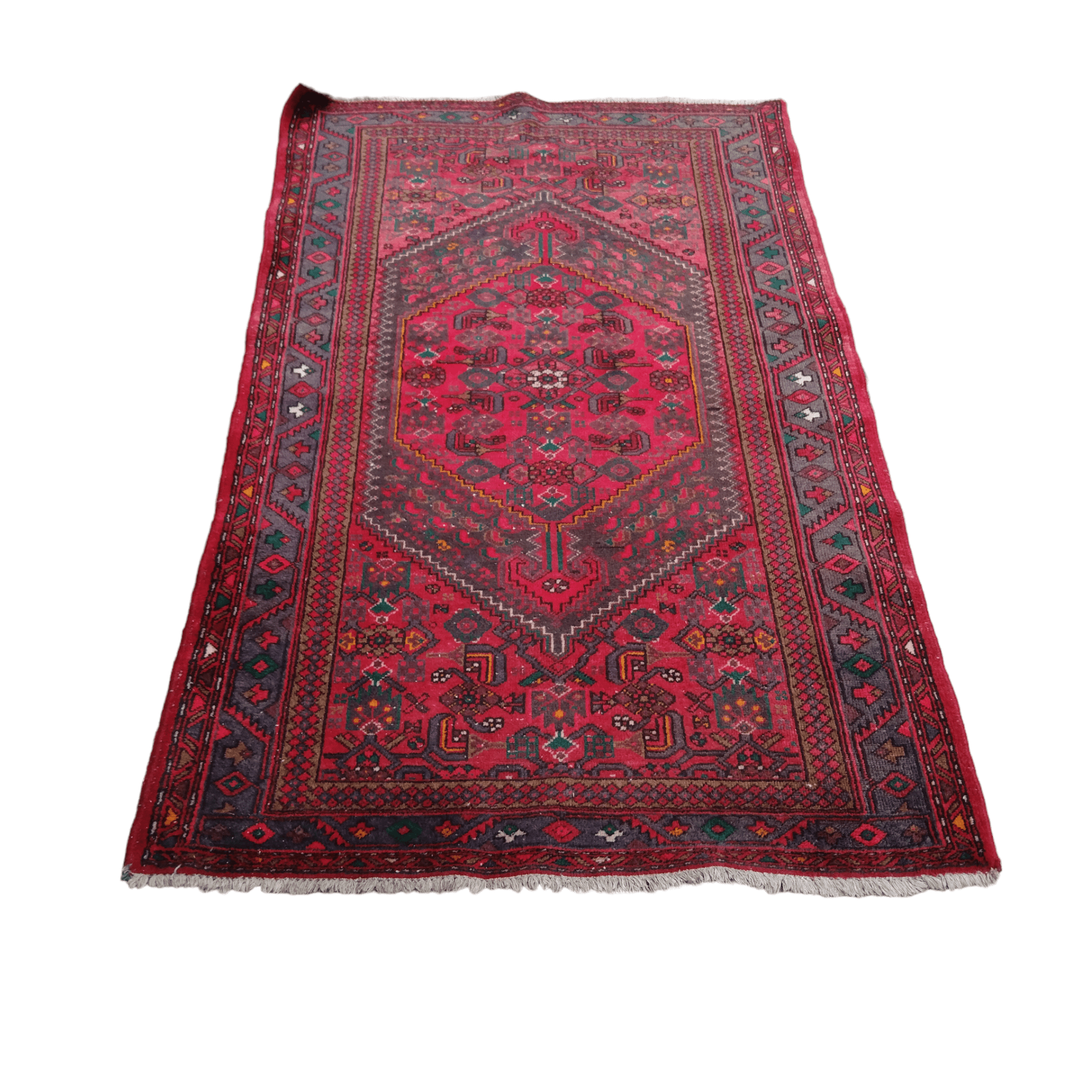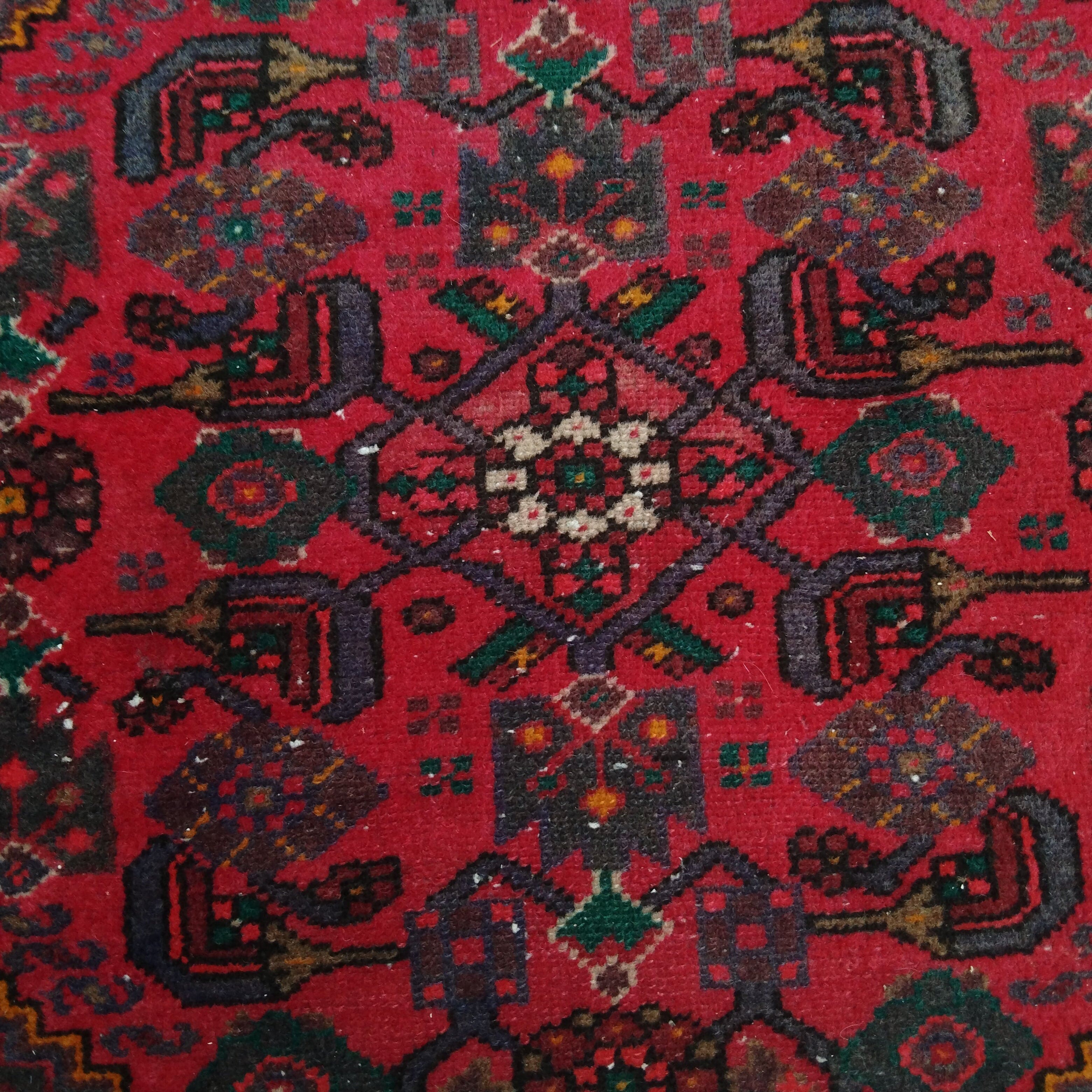 Bellísima alfombra de origen persa, anudada a mano con intrincados diseños geométricos en tonos rojos, que asemejan a una enredadera con sus flores.