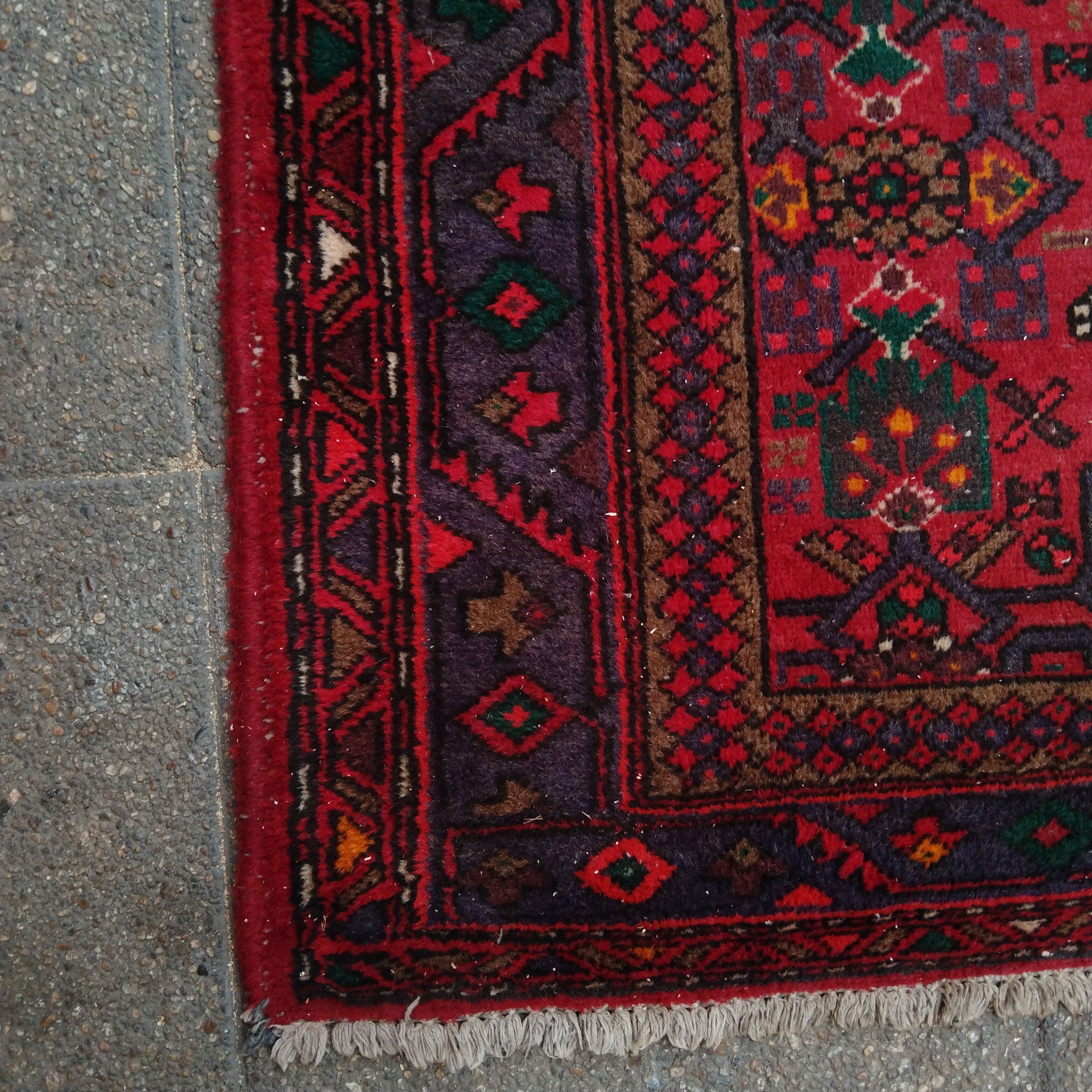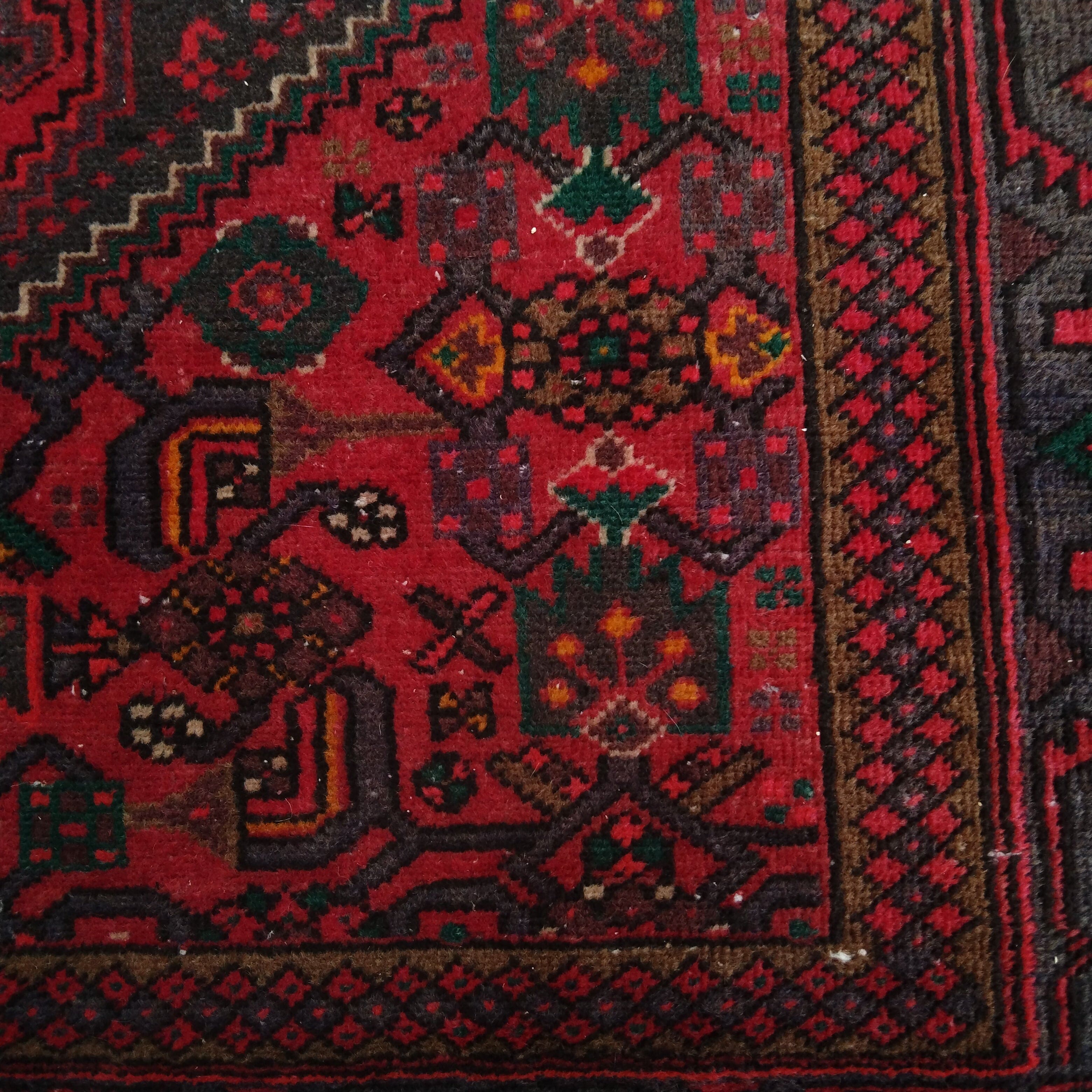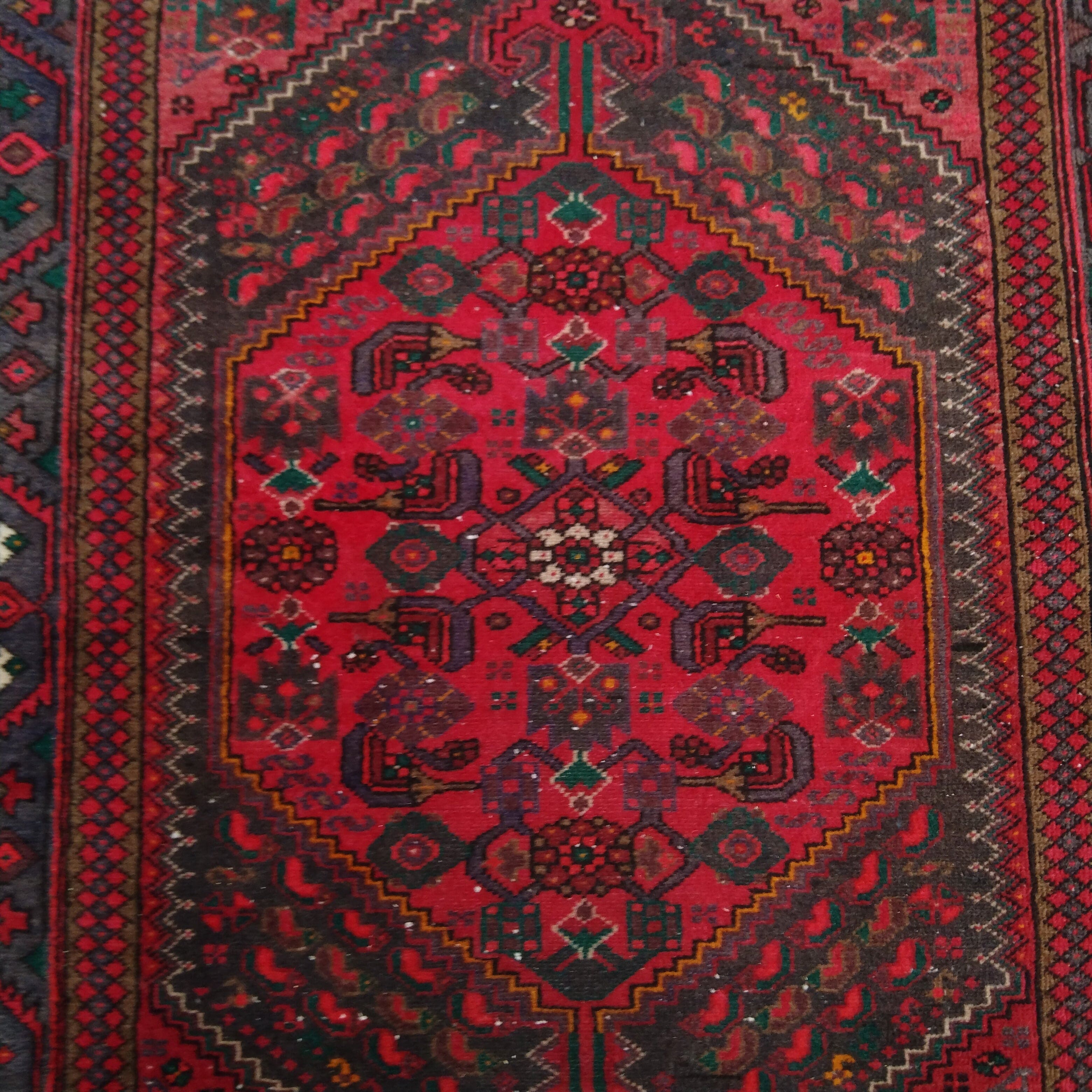 Bellísima alfombra de origen persa, anudada a mano con intrincados diseños geométricos en tonos rojos, que asemejan a una enredadera con sus flores.