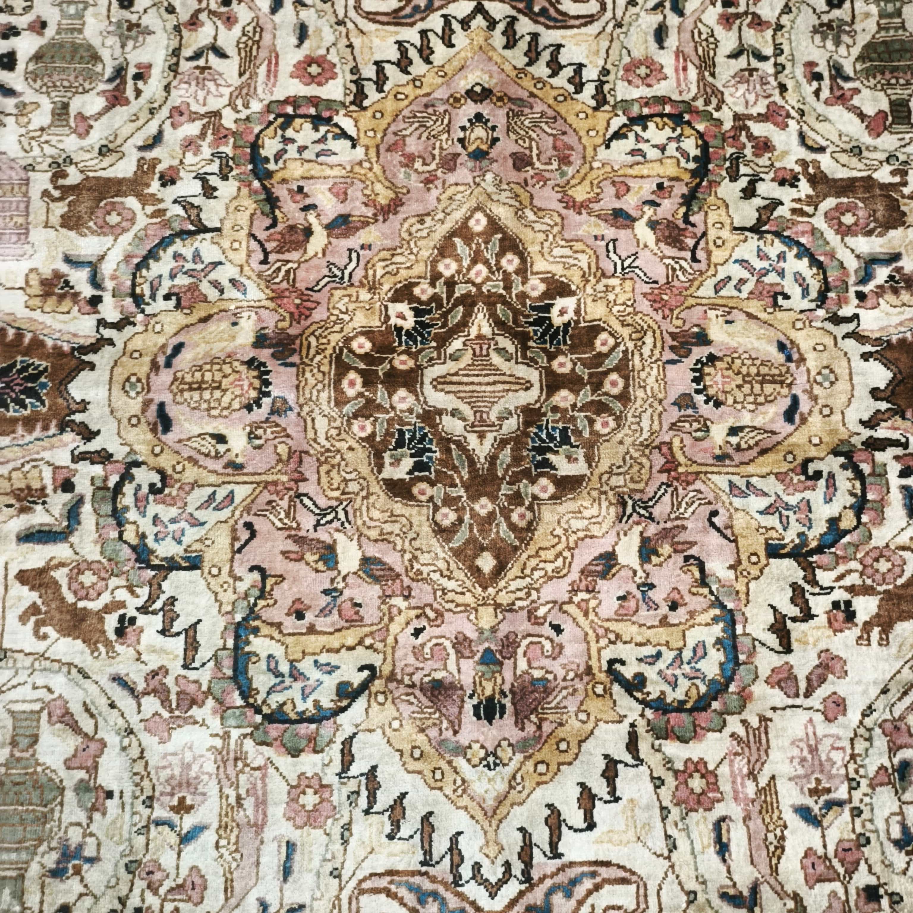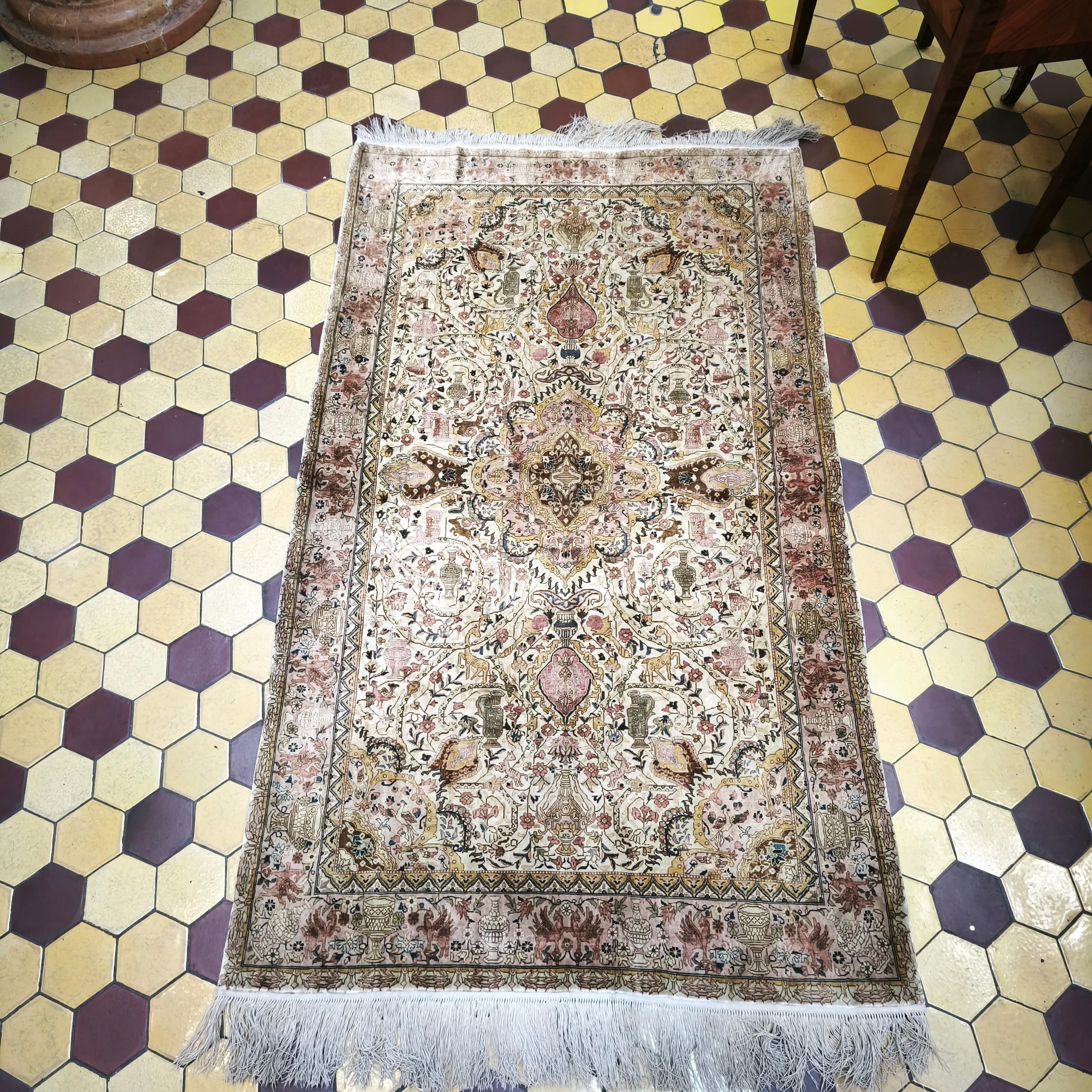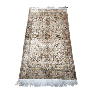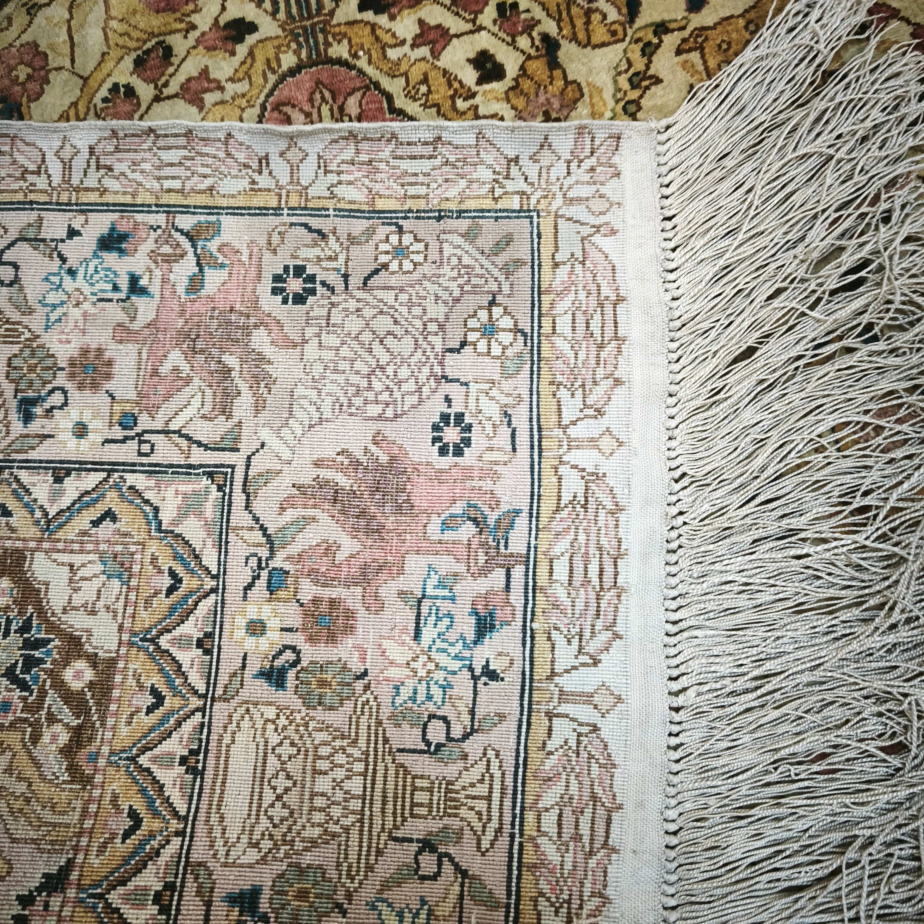 Preciosa alfombra de origen pakistaní, tejida en seda y lana, con bellísimos diseños geométricos en tonos amarillos y rosas, en torno a ua figura circular central. La pieza etiene una terminación de flequillos en cada extremo e información de la pieza en su resverso.