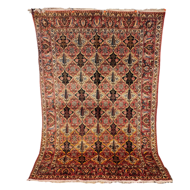 Hermosa alfombra iraní de Isfahán. Destaca por su diseño tradicional en un juego de patrones combinados con el motivo de la piña (fruto del pino), representativo del desarrollo cultural de Oriente medio.
