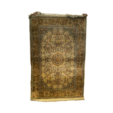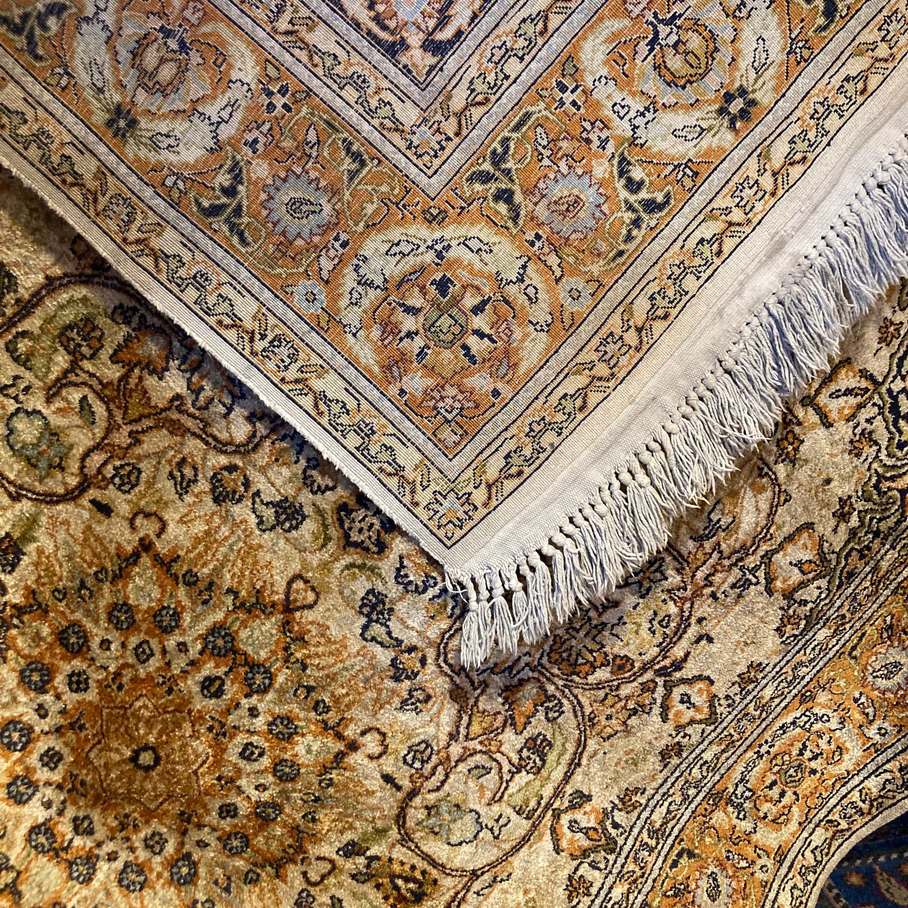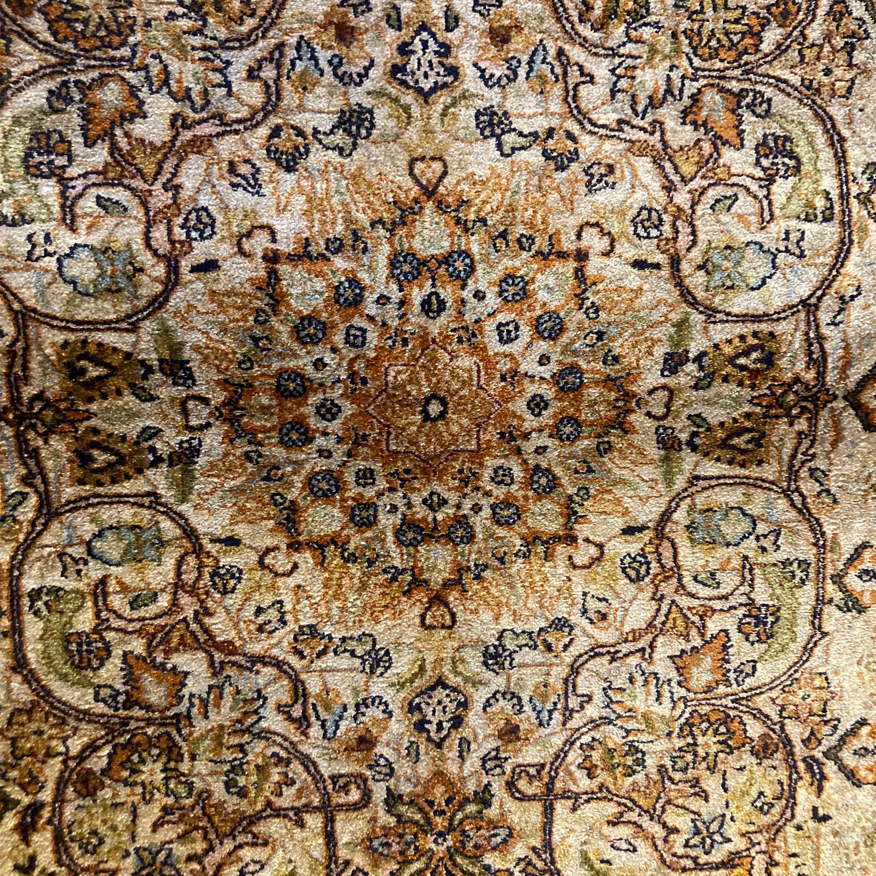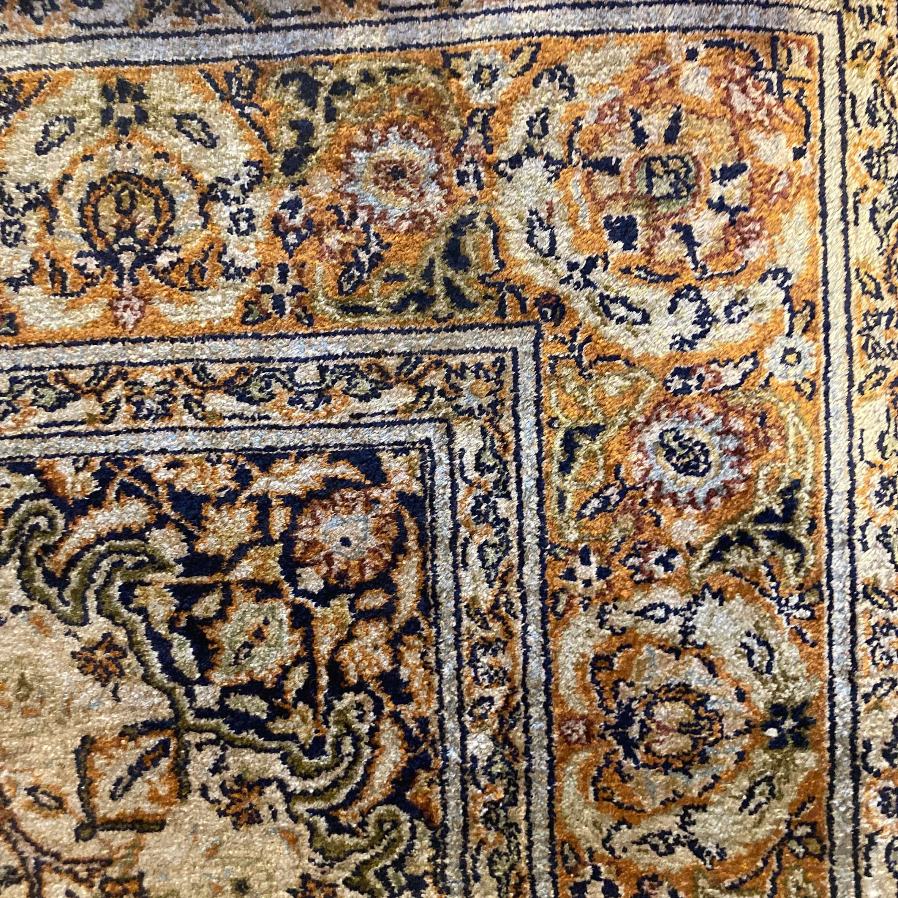 Bella alfombra tapiz de origen persa, región oriental, anudada a mano. Bello diseño en lana y seda inspirado en flores y enredaderas en tonos amarillo, rosa y crema.