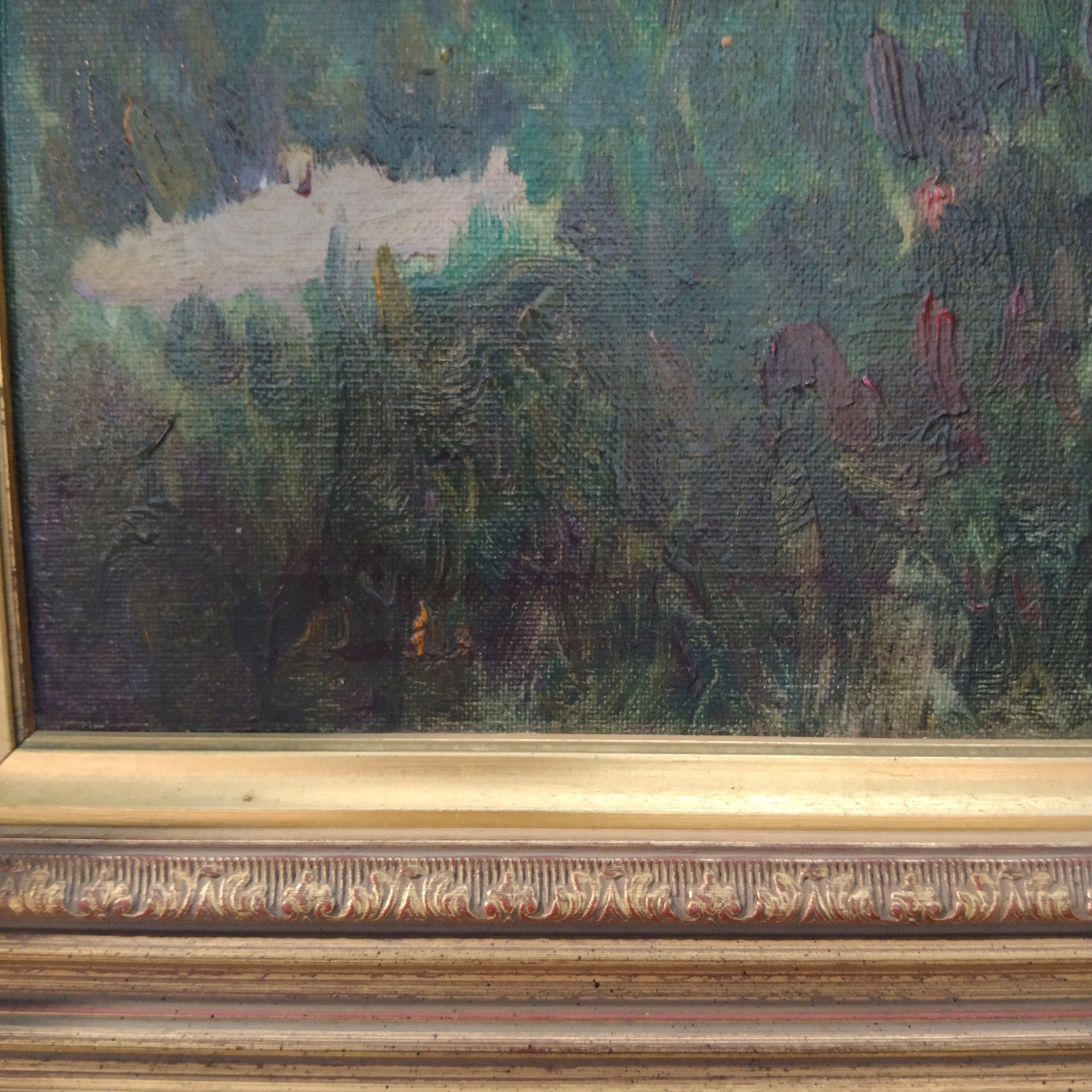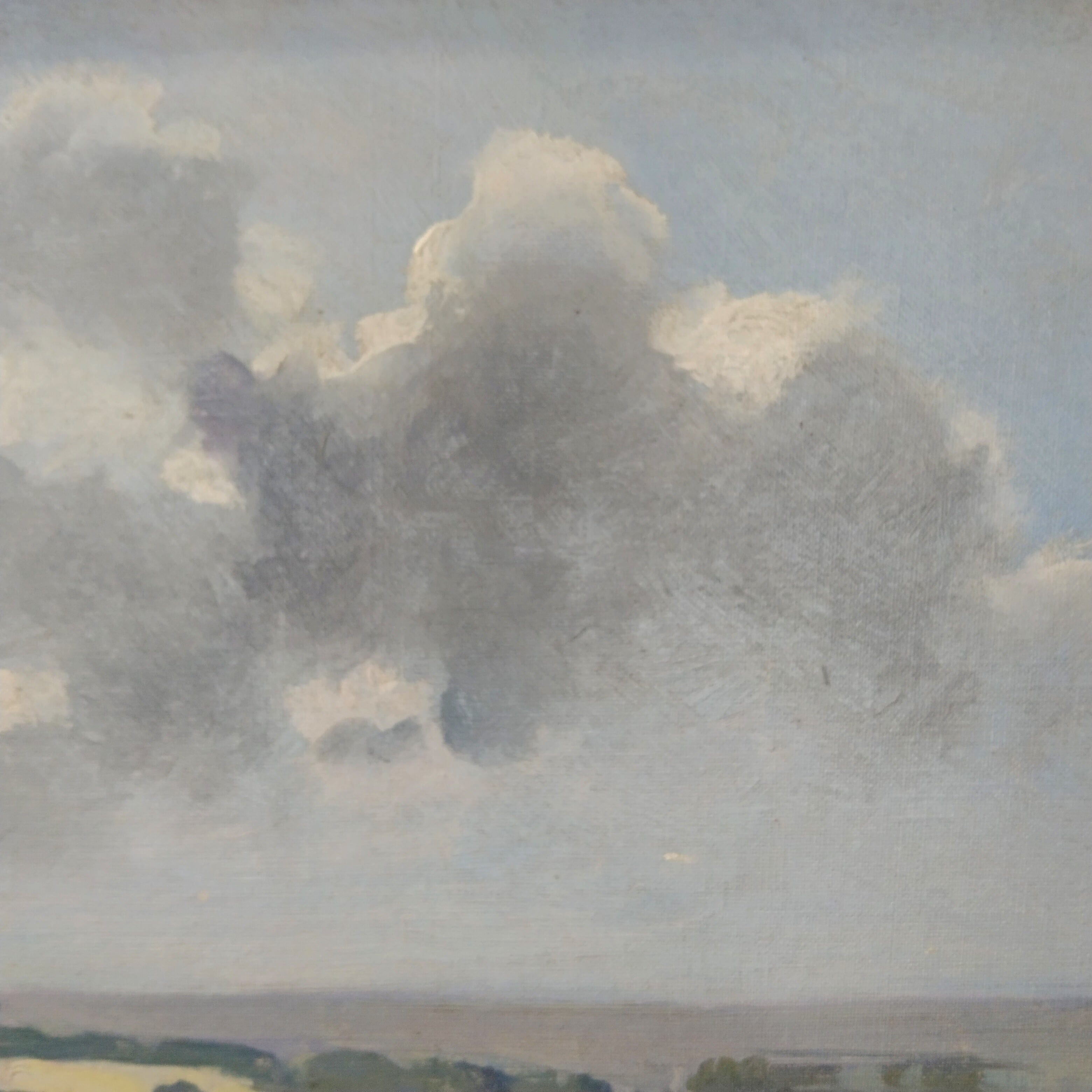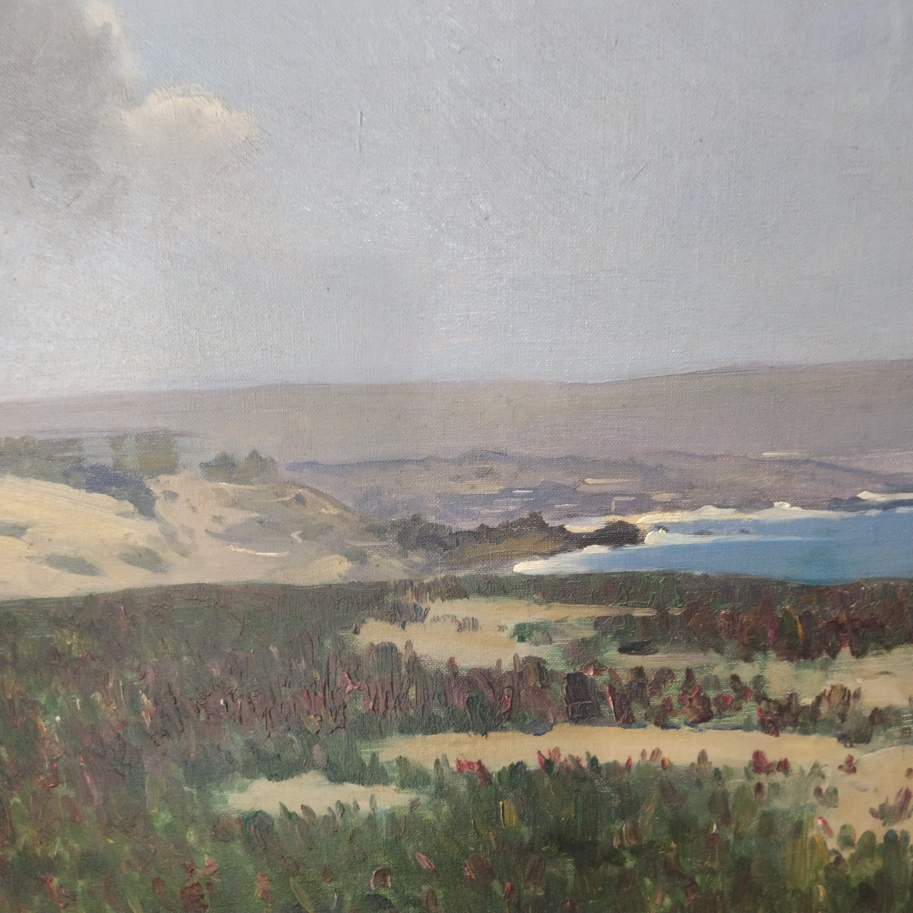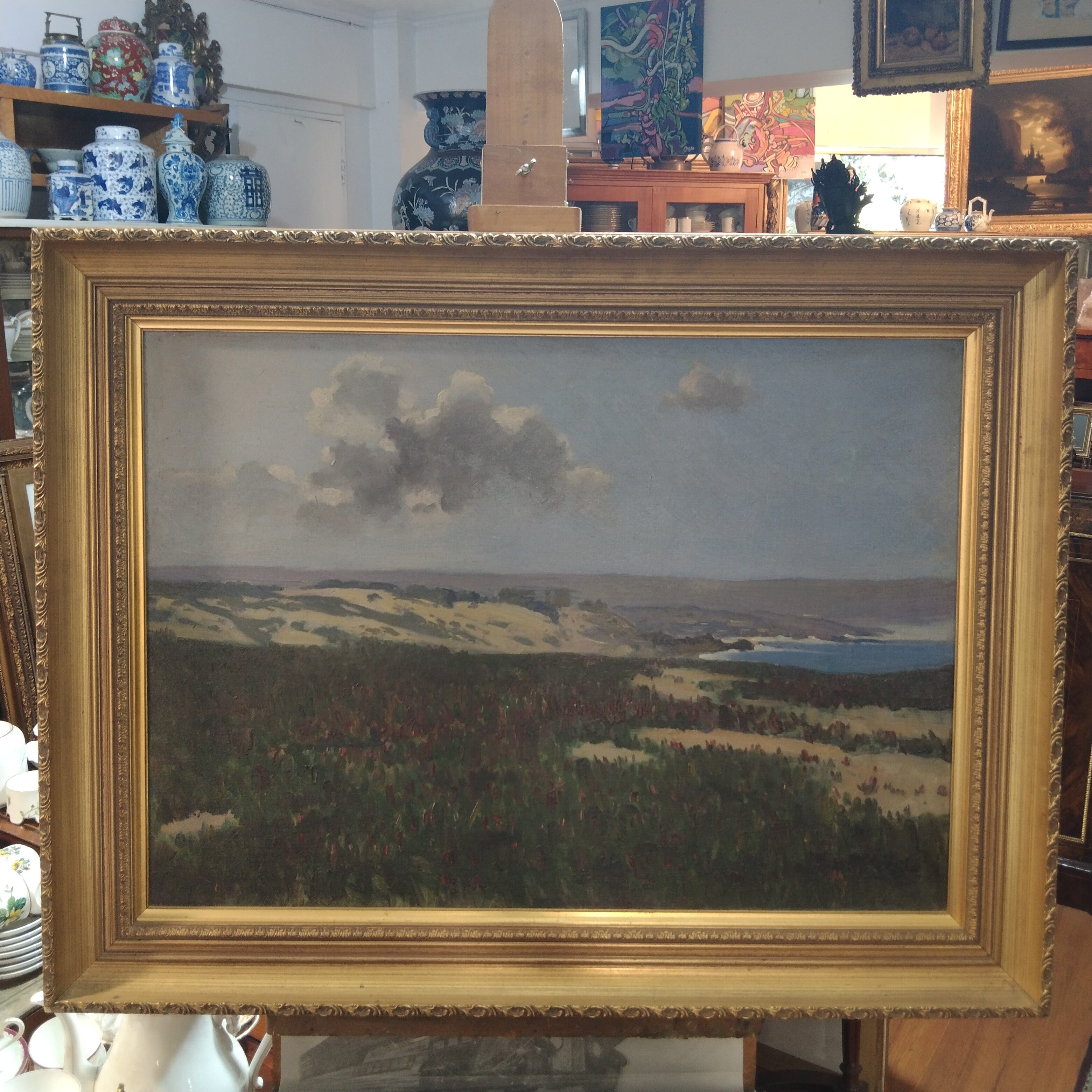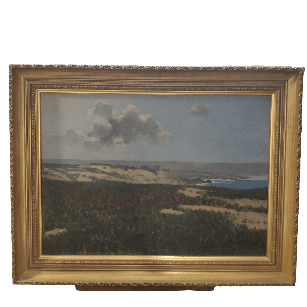 Óleo sobre tela del artista chileno Benito Rebolledo Correa, representando expresivamente un paisaje costero desde una duna con docas y el mar dde fondo, en el horizonte. La pieza está bellamente enmarcada en madera tallada en relieves y doré.