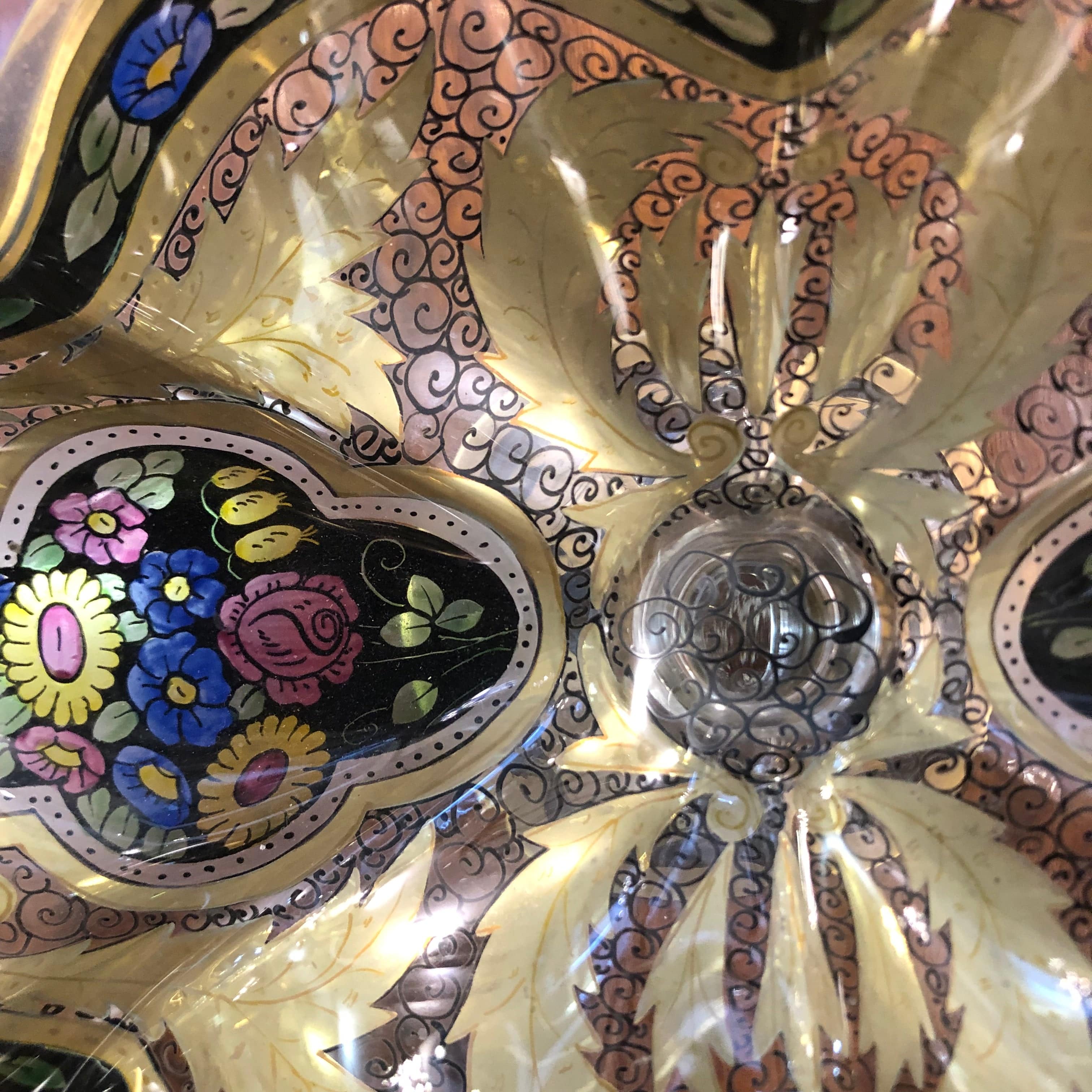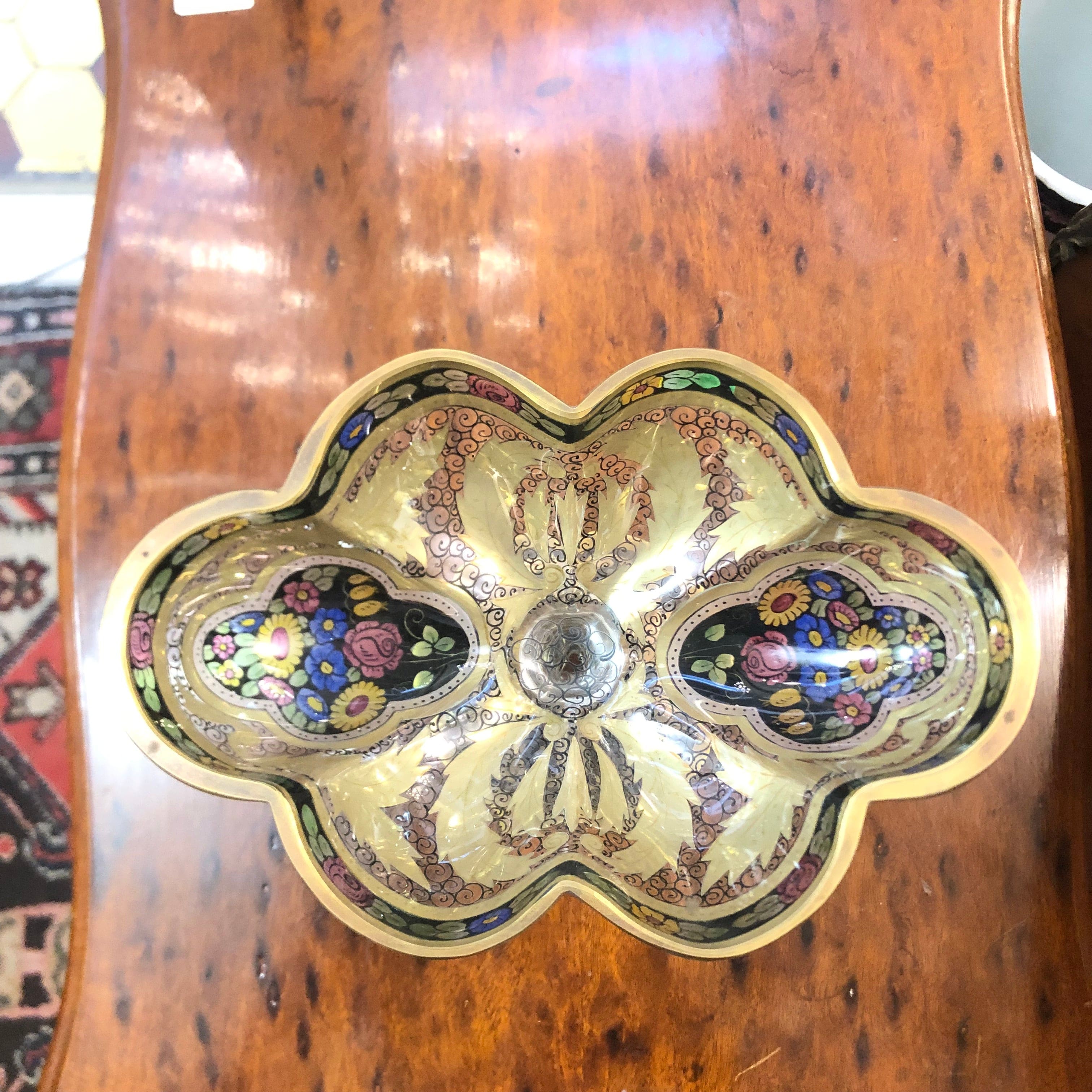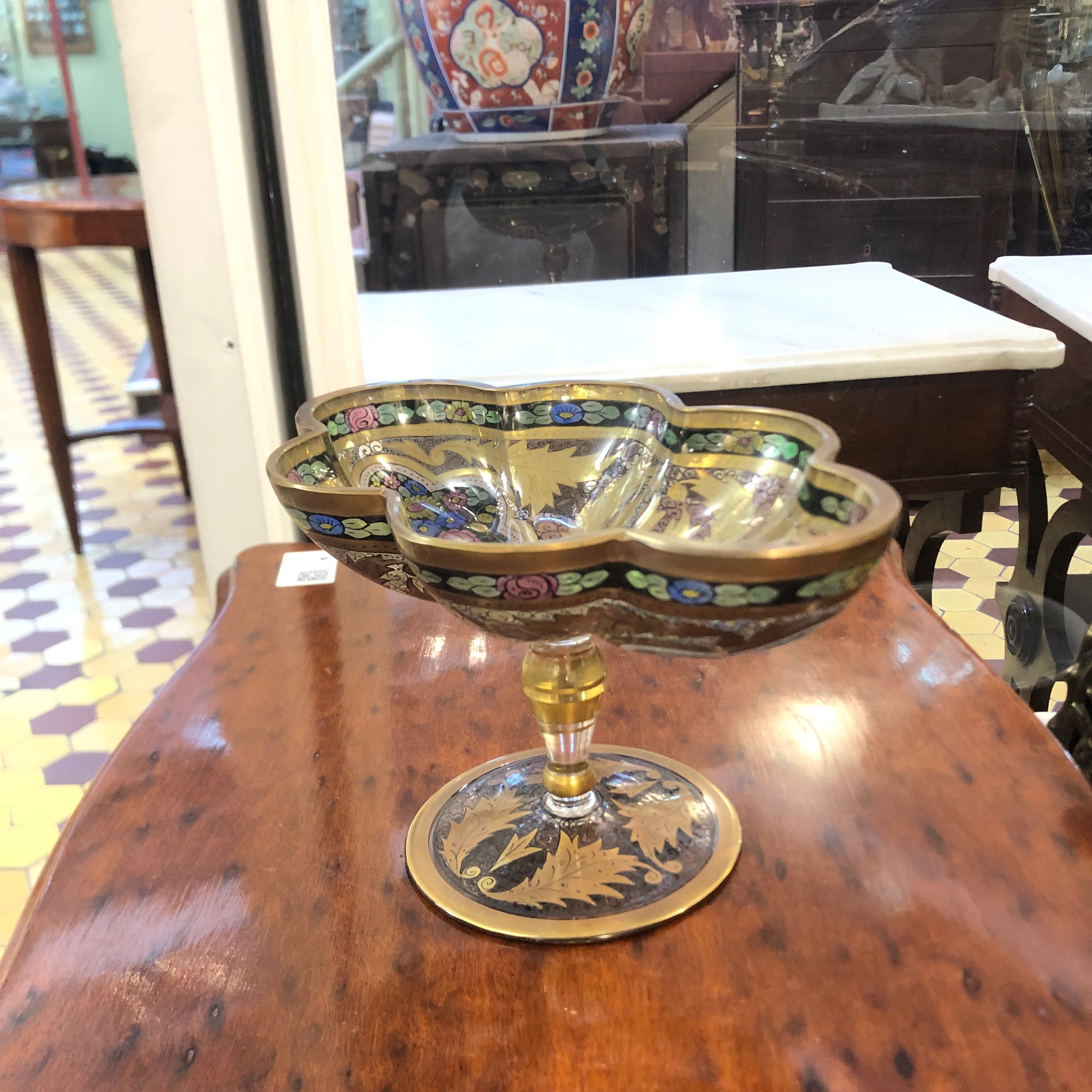 Hermoso centro de mesa de vidrio esmaltado, esto quiere decir que luego de ser pintado y decorado luego es cocido para fusionar la pintura y el vidrio, otorgándole durabilidad al objeto como también colores más brillantes. Este diseño es atribuido al diseñador Fritz Heckert (1837-1887).