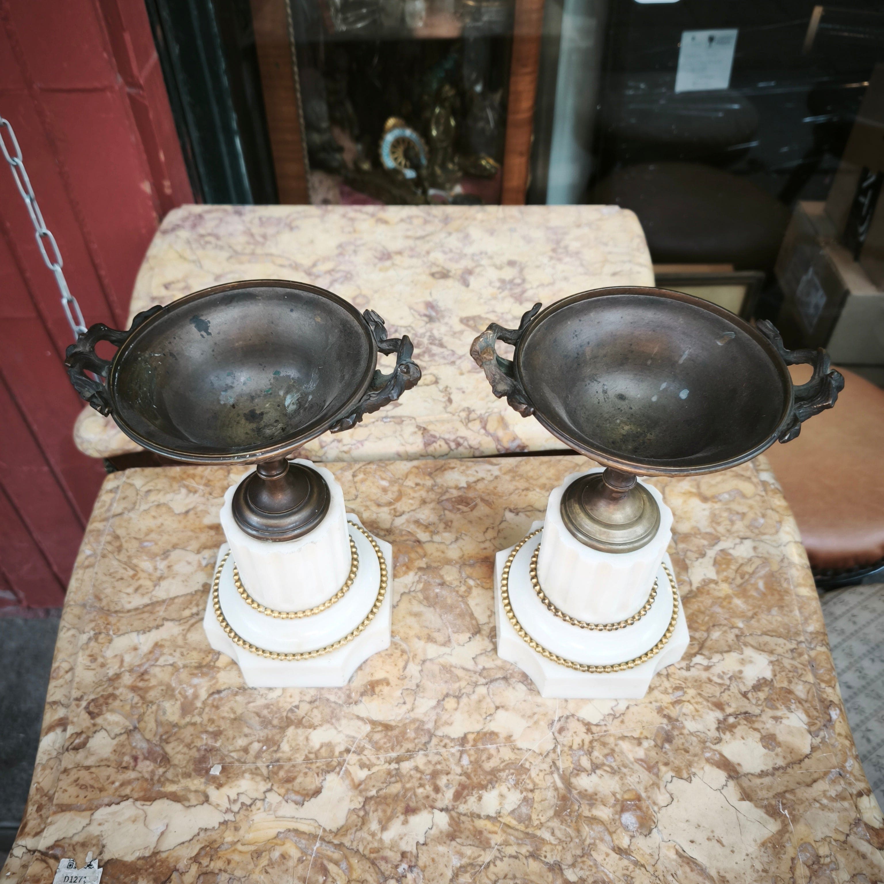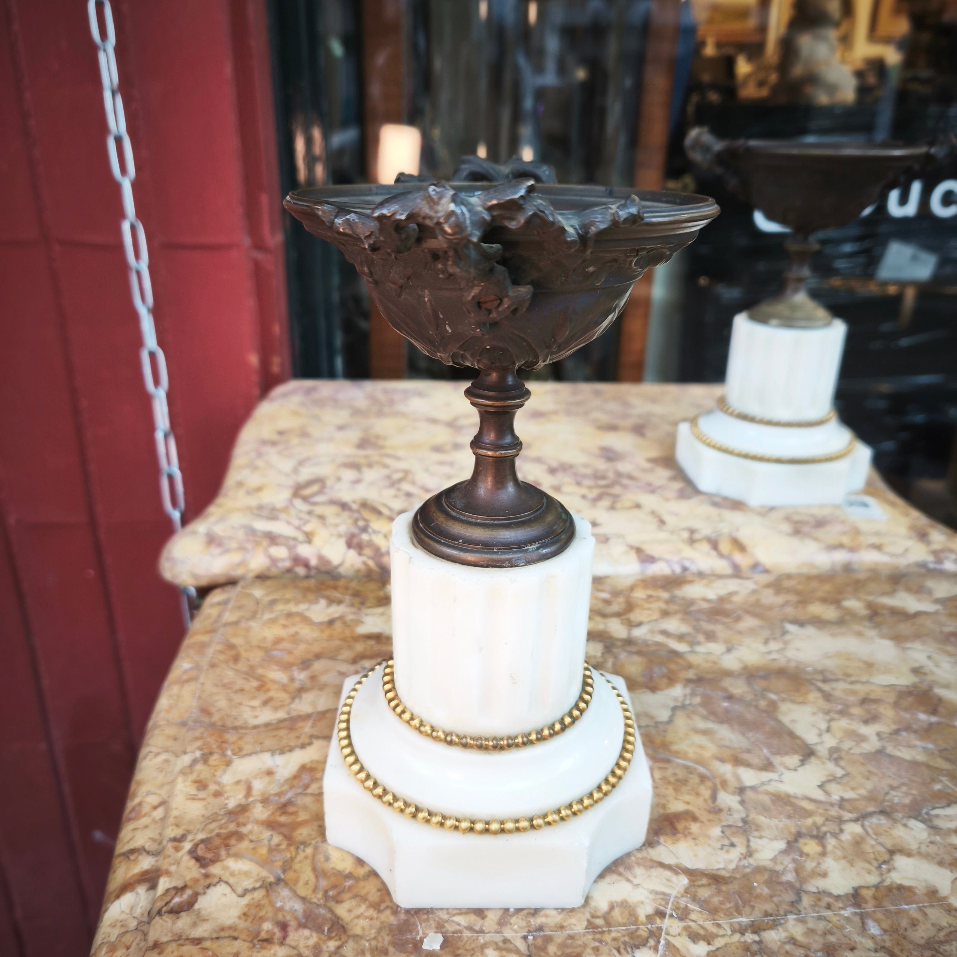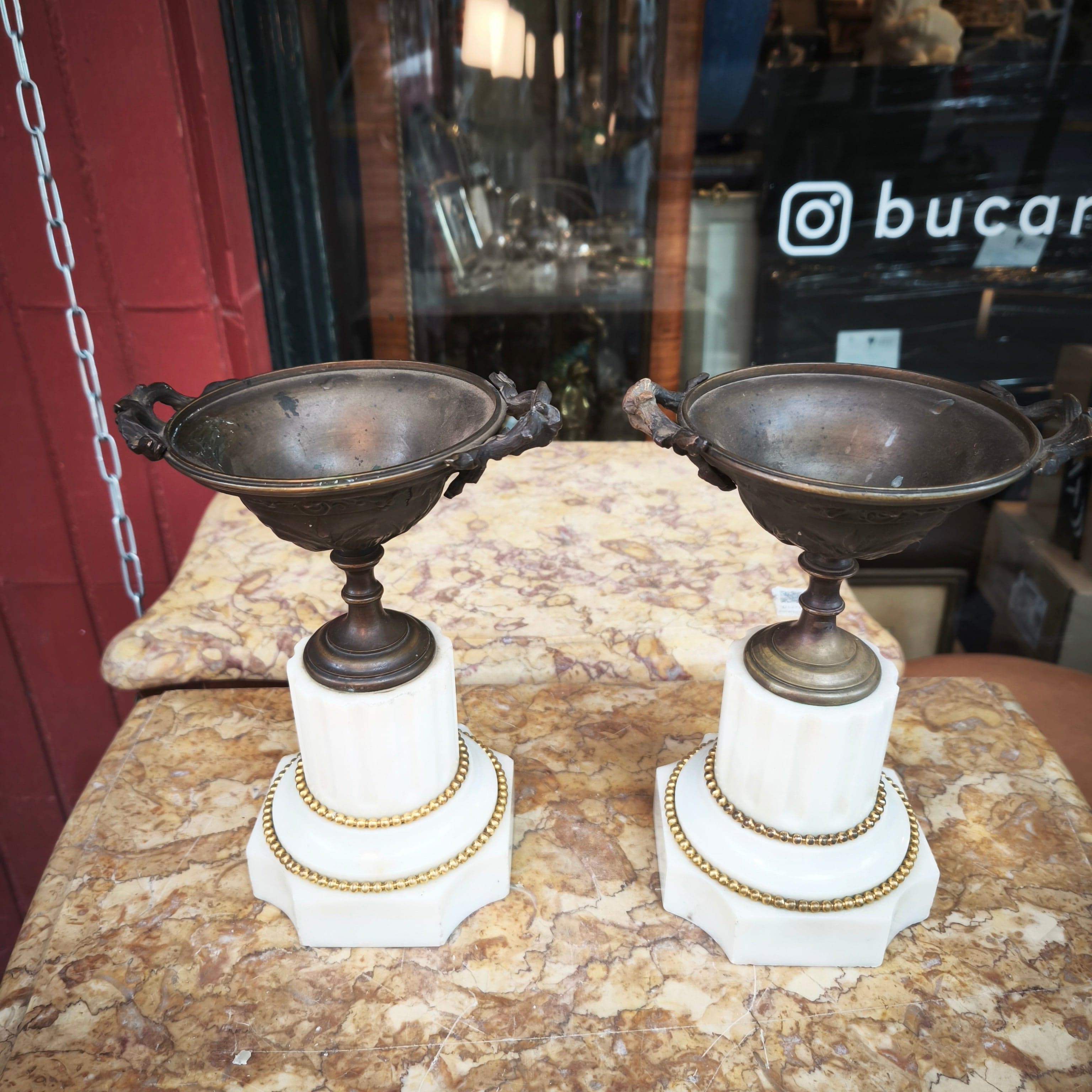 Hermosos coponcitos franceses de bronce y mármol blanco estilo cassolettes.