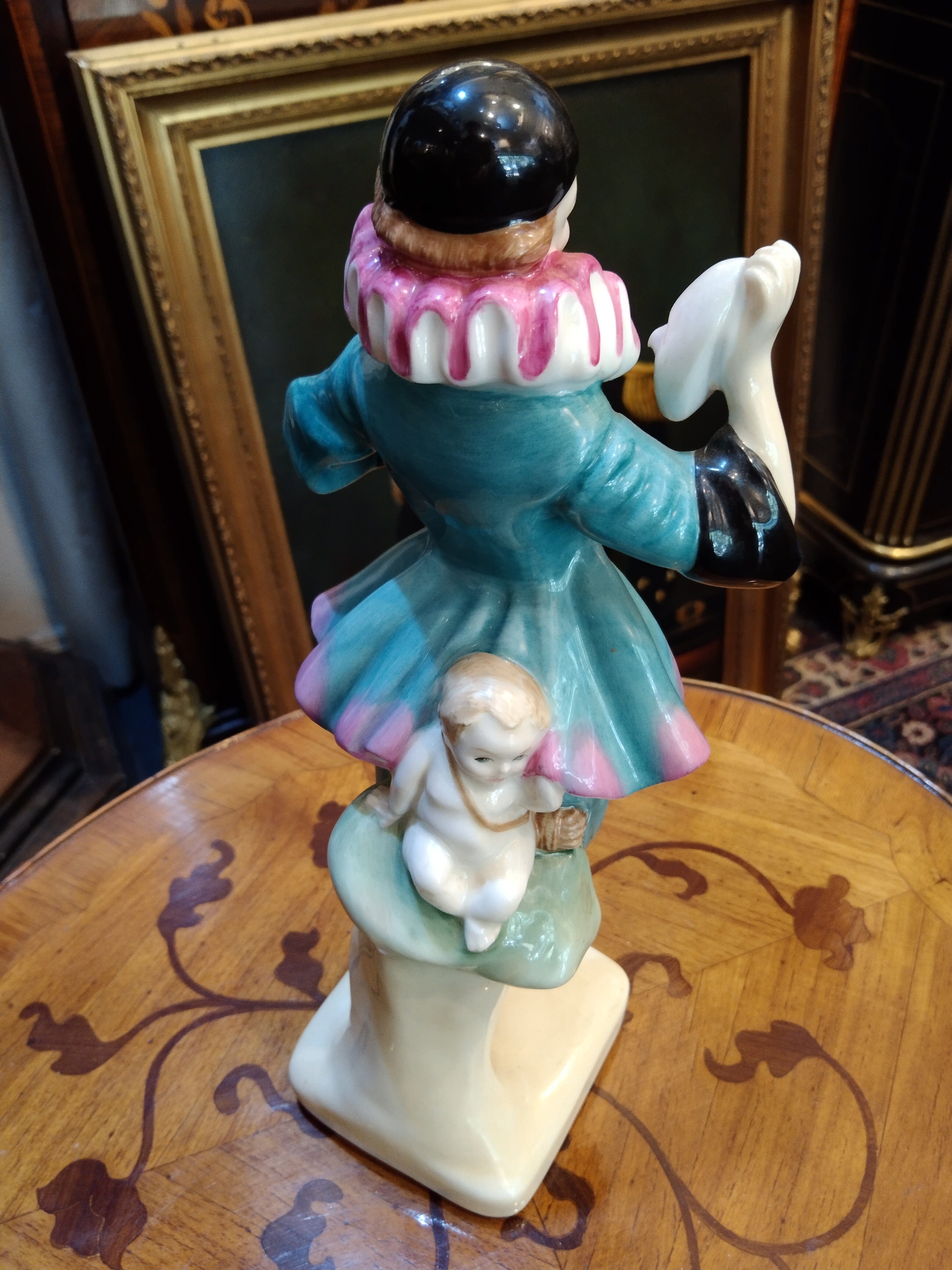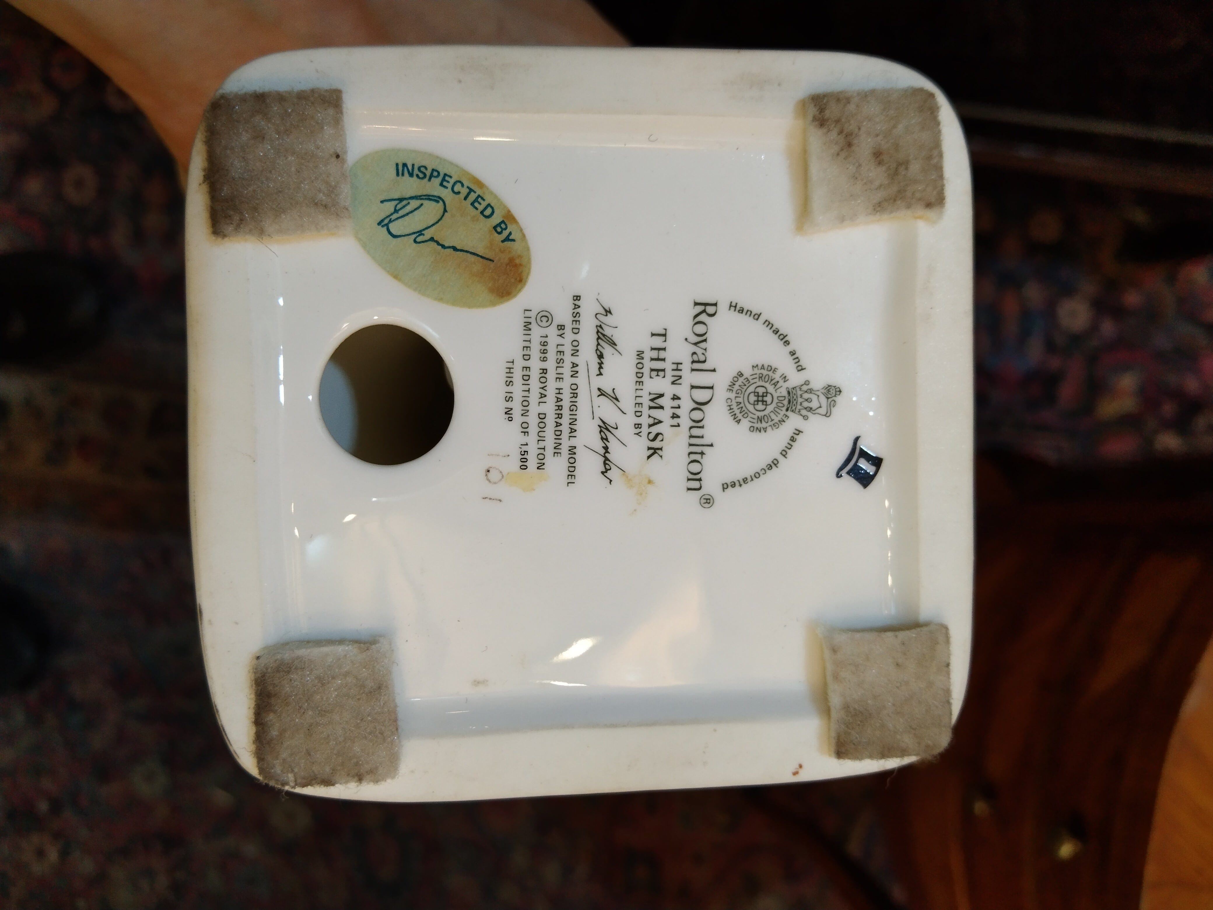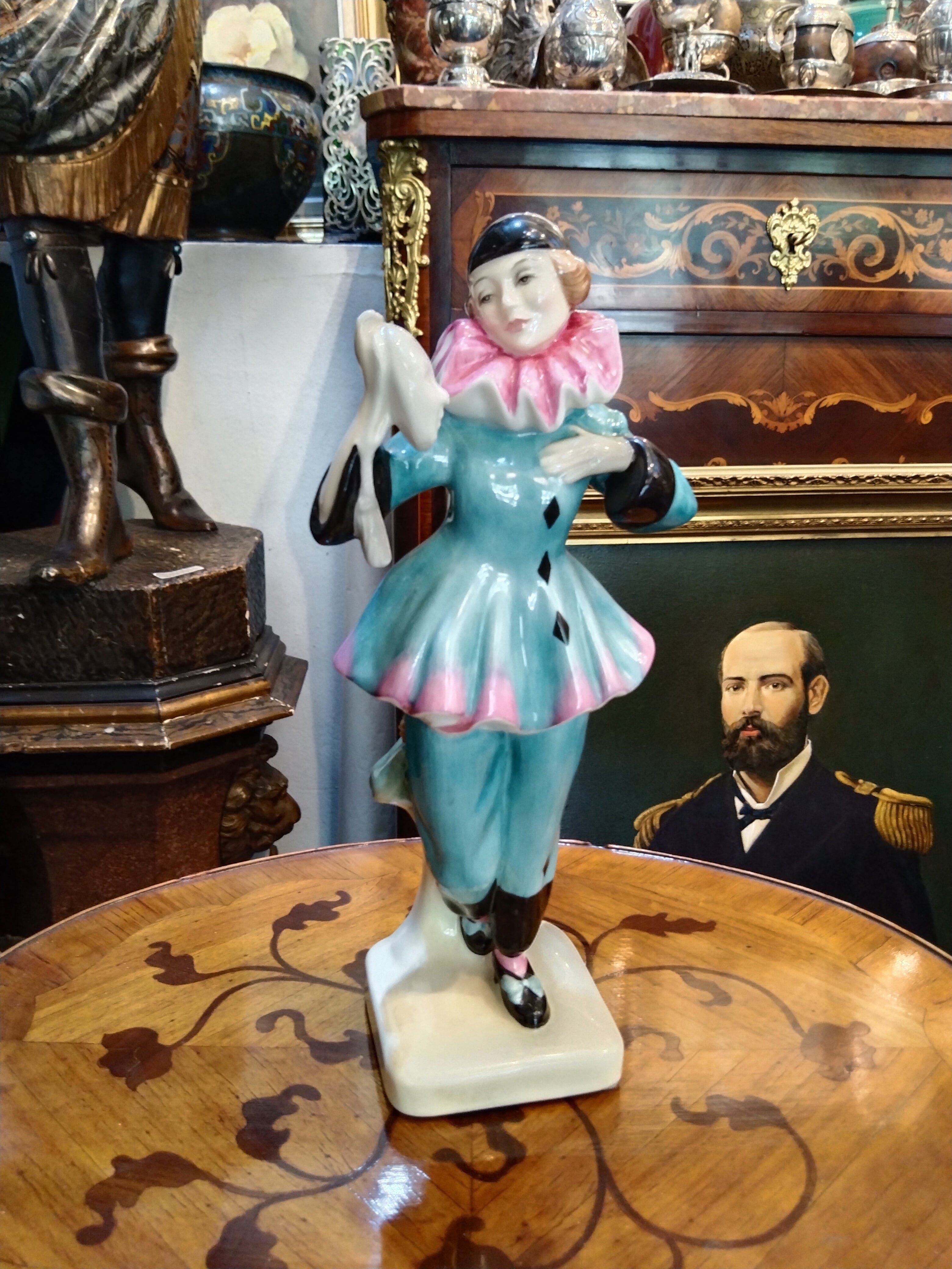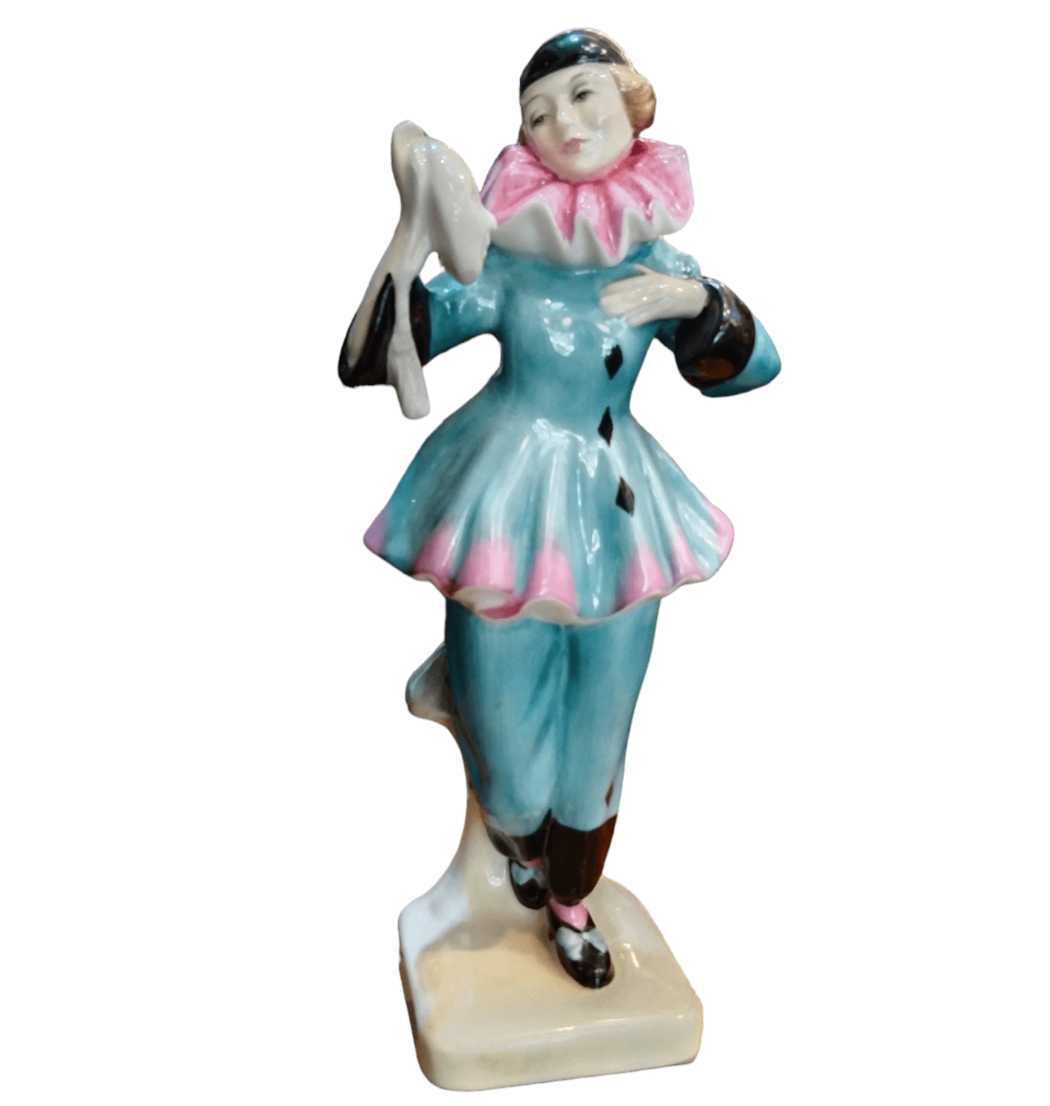 Estatuilla de porcelana de la marca Royal Doulton, representando a una mujer con vestuario de arlequina, sosteniendo una máscara. La porcelana está pintada a mano.