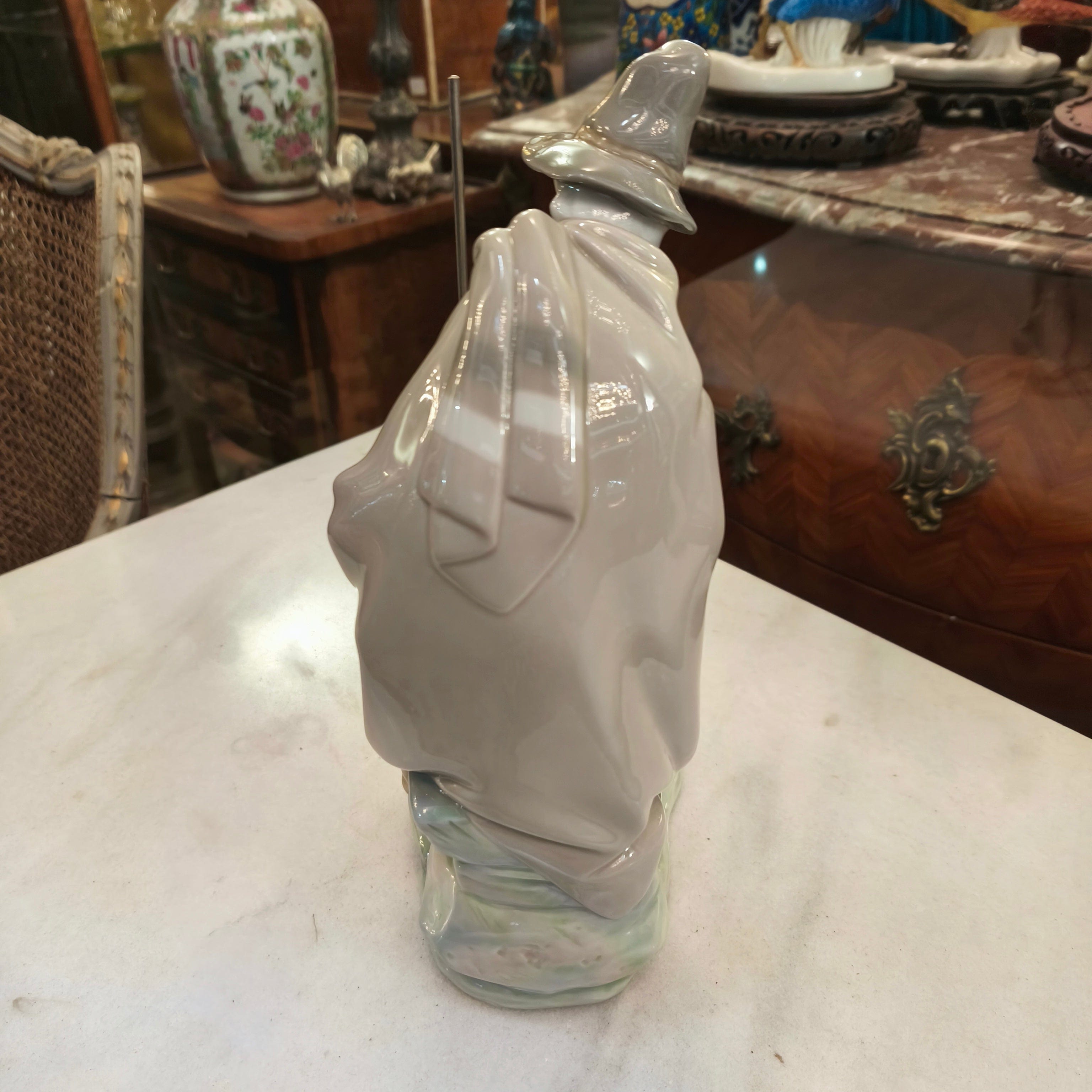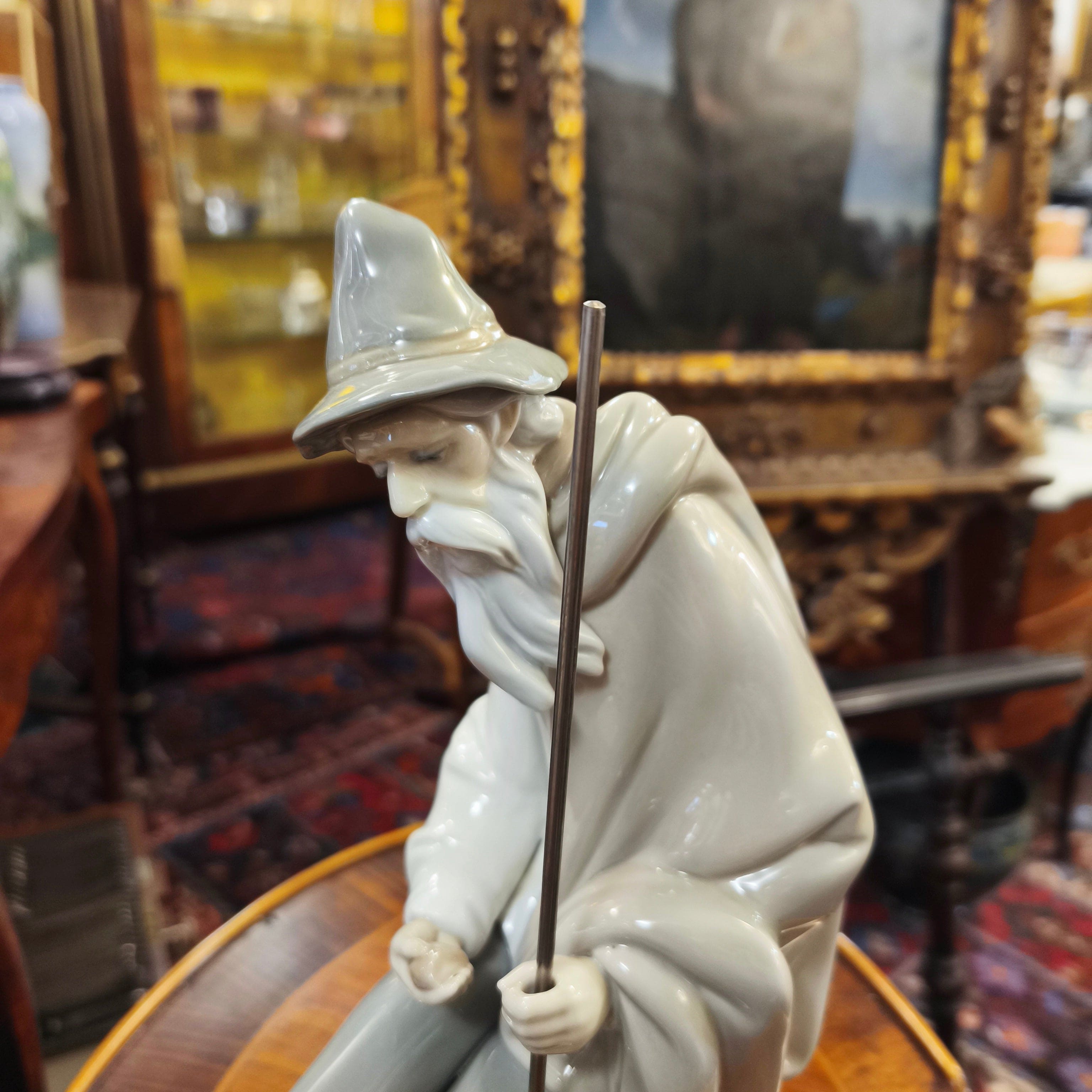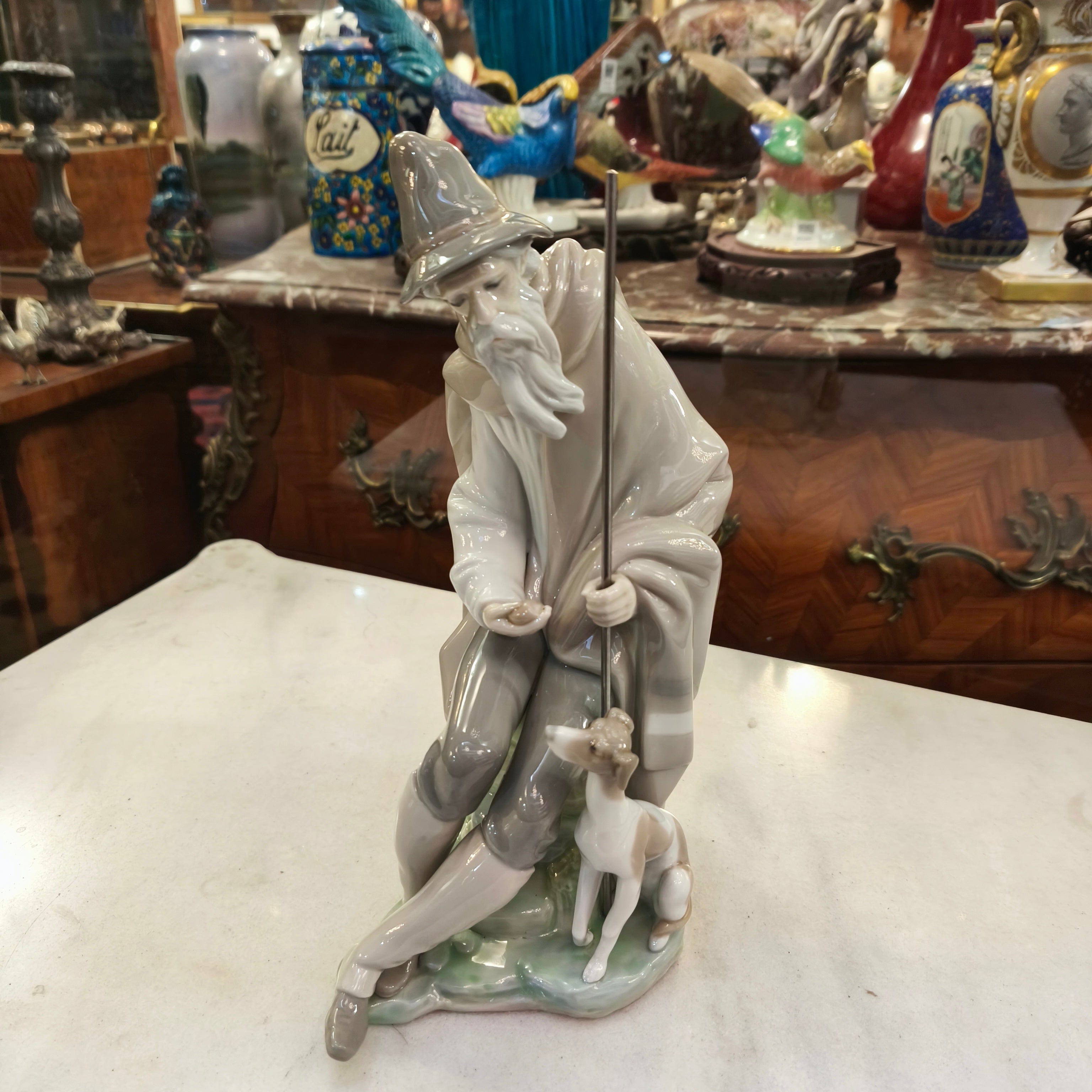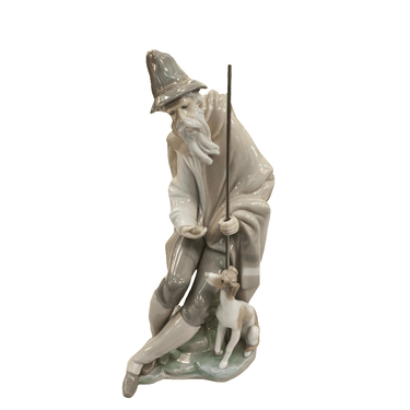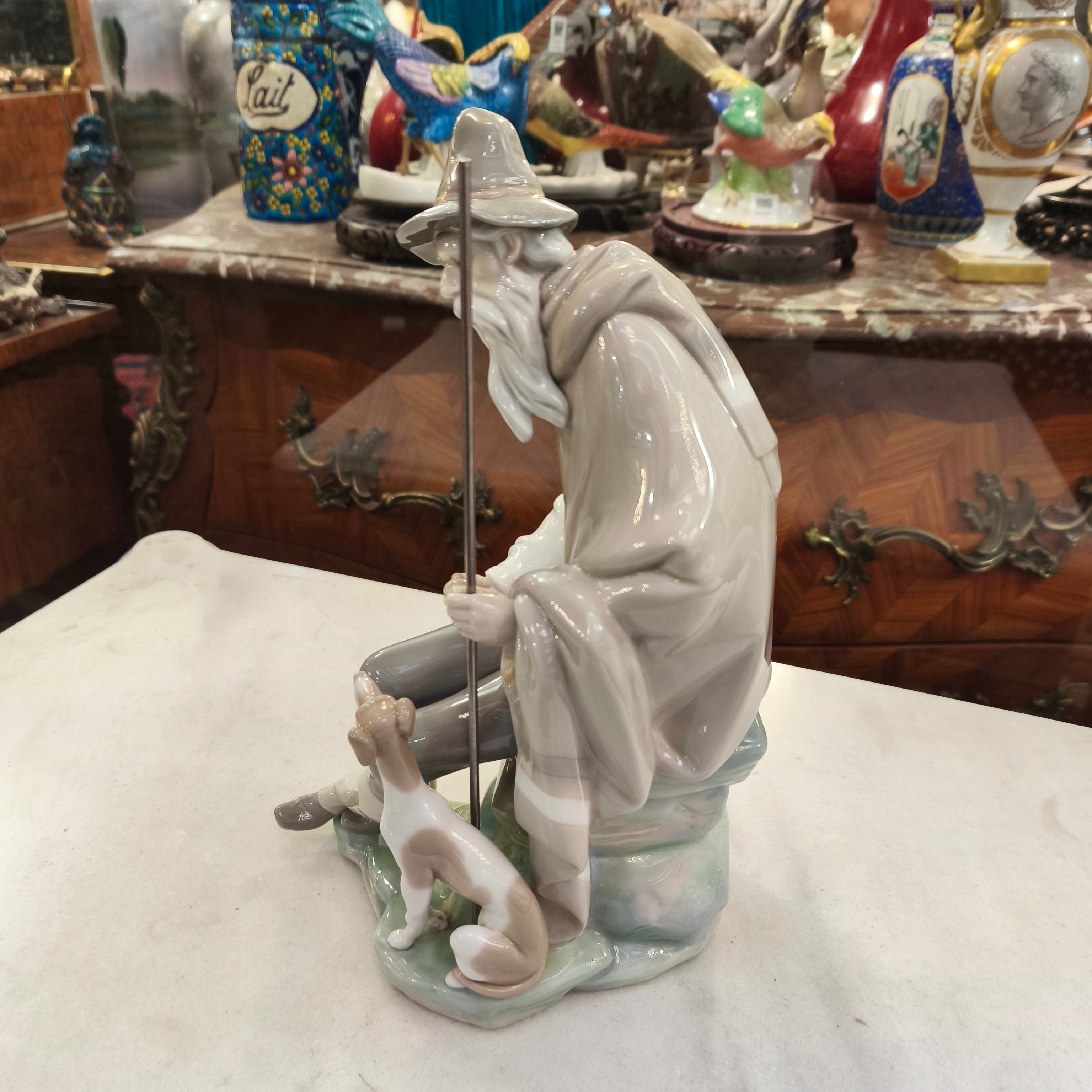 Bella figura de porcelana de la marca española Lladró, en la cual podemos ver a un hombre anciano sentado junto a su perro.