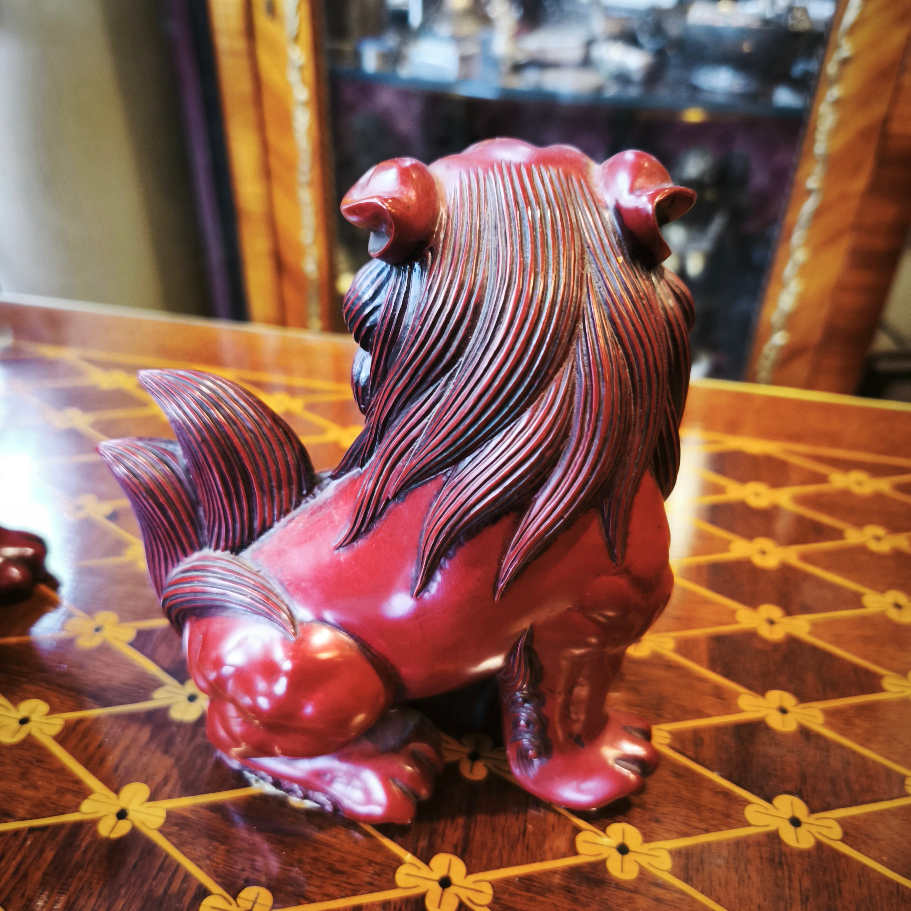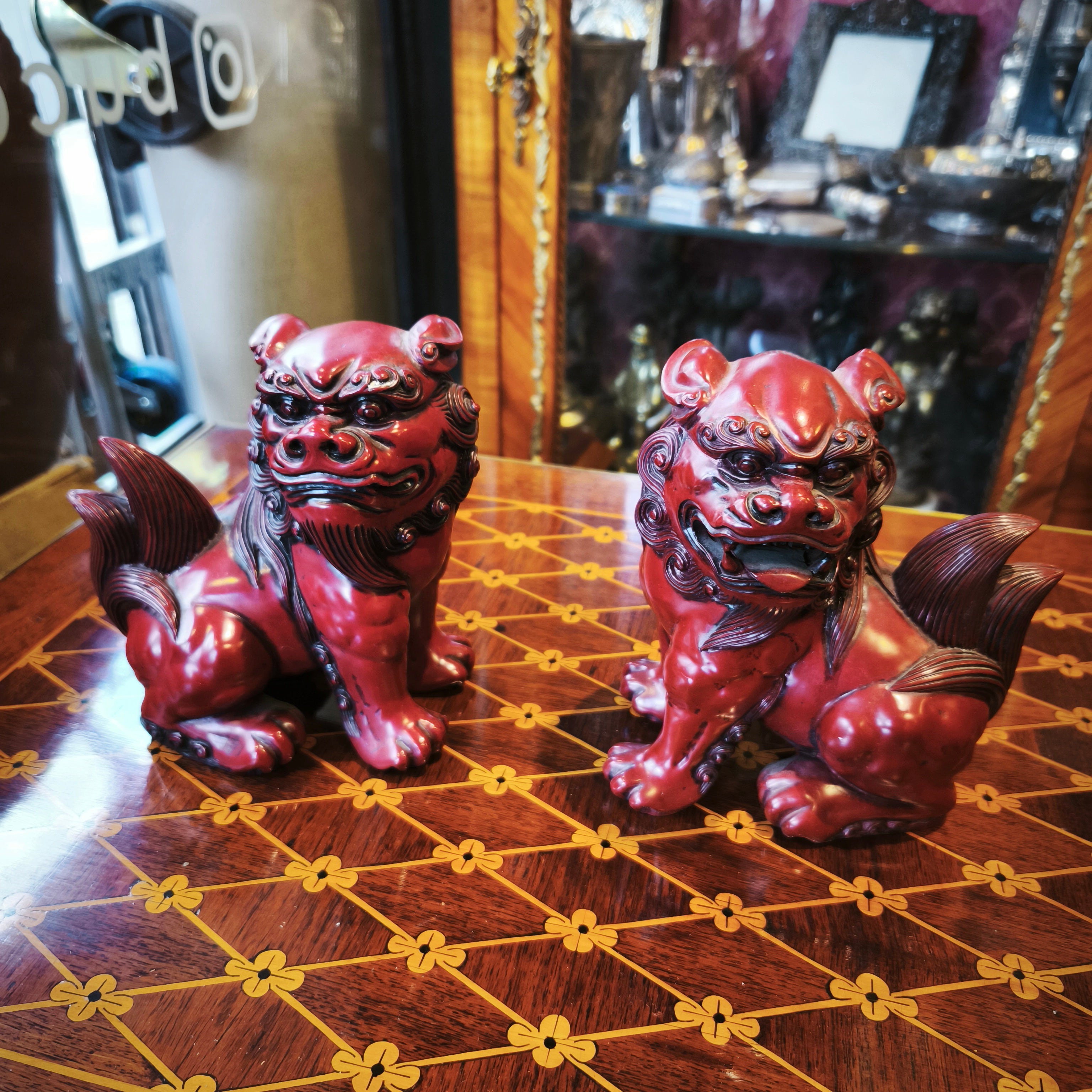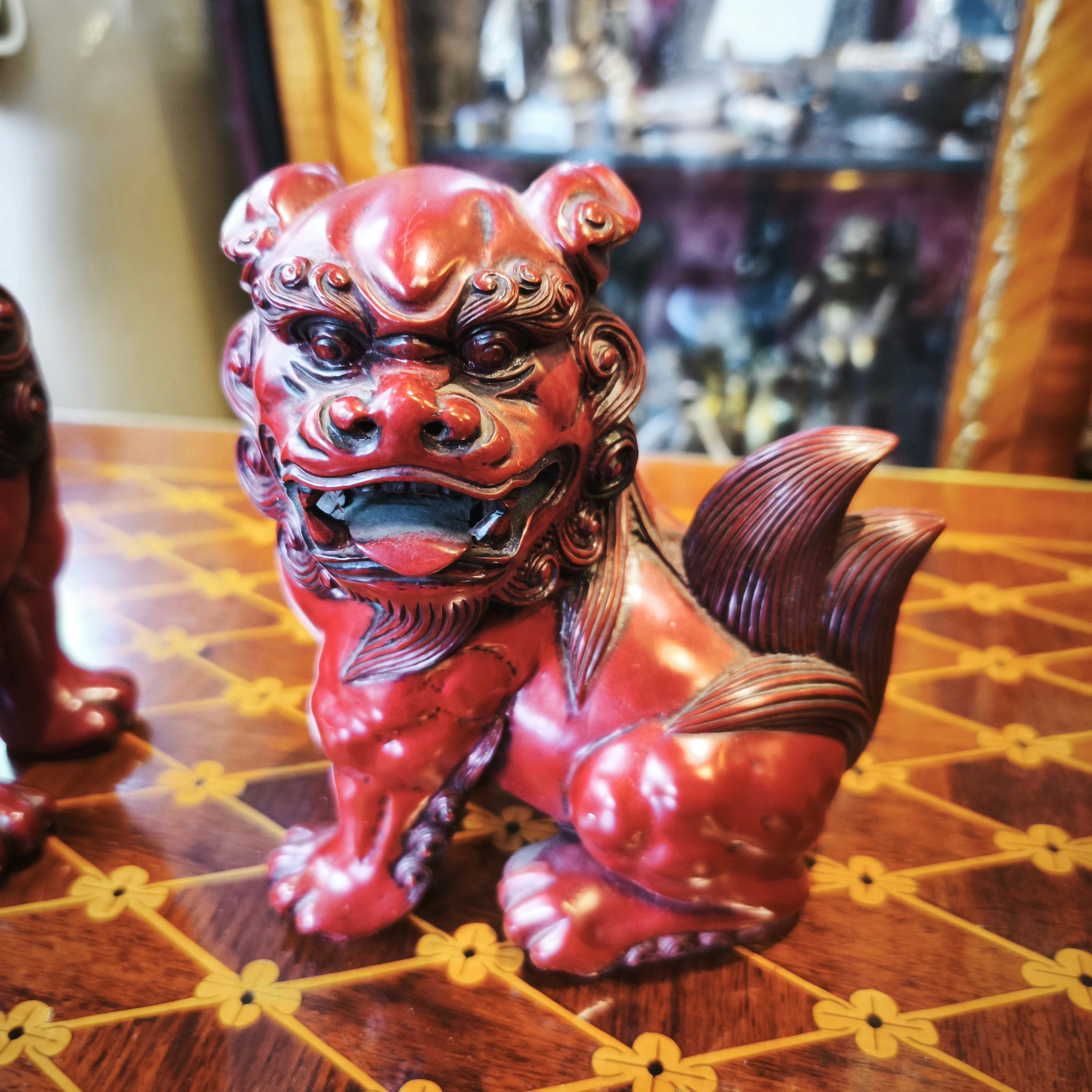 Bellas figuras hechas de madera lacada, de origen chino y fabricación contemporánea, en un llamativo tono rojo, representando a dos perros fo en su tradicional postura sentada.
