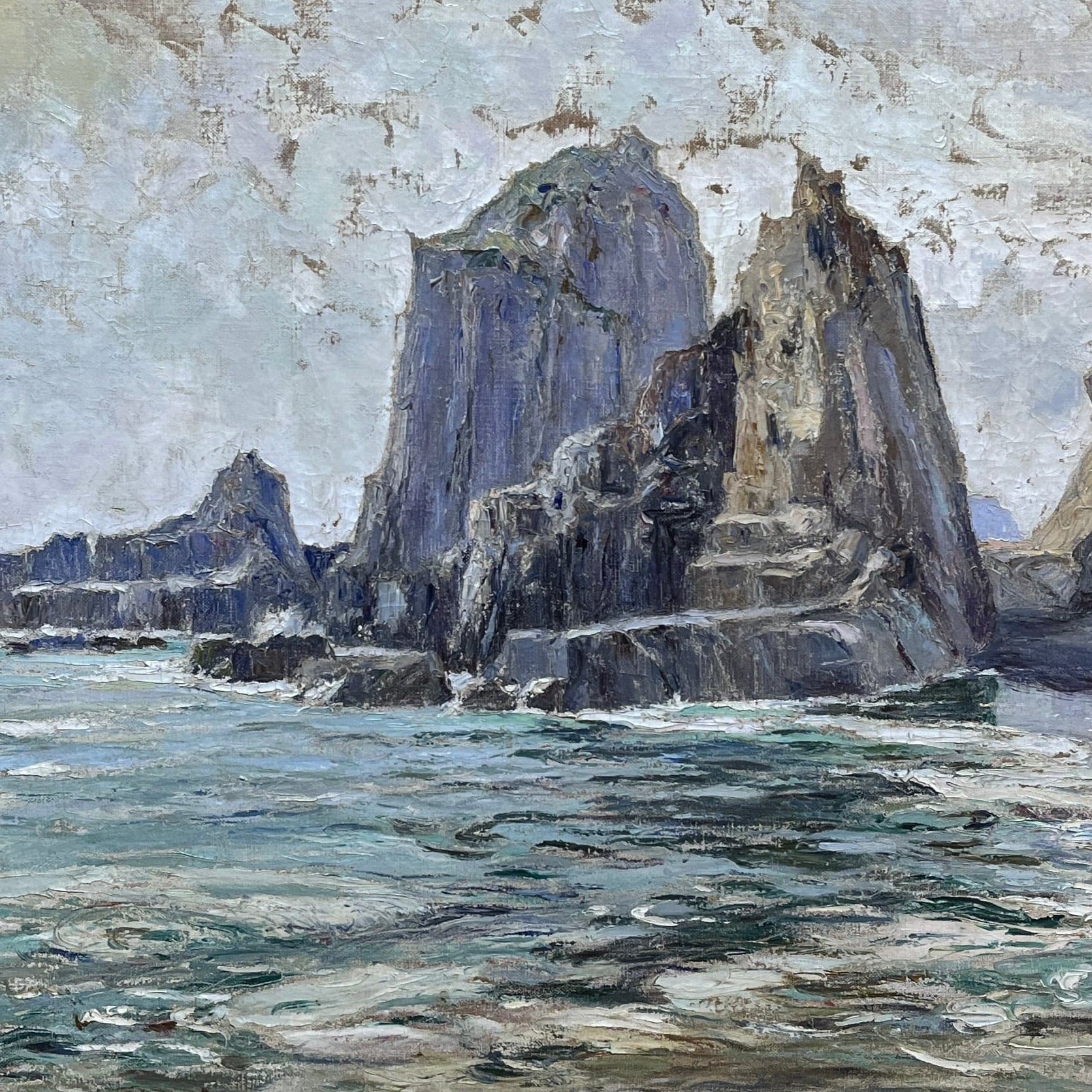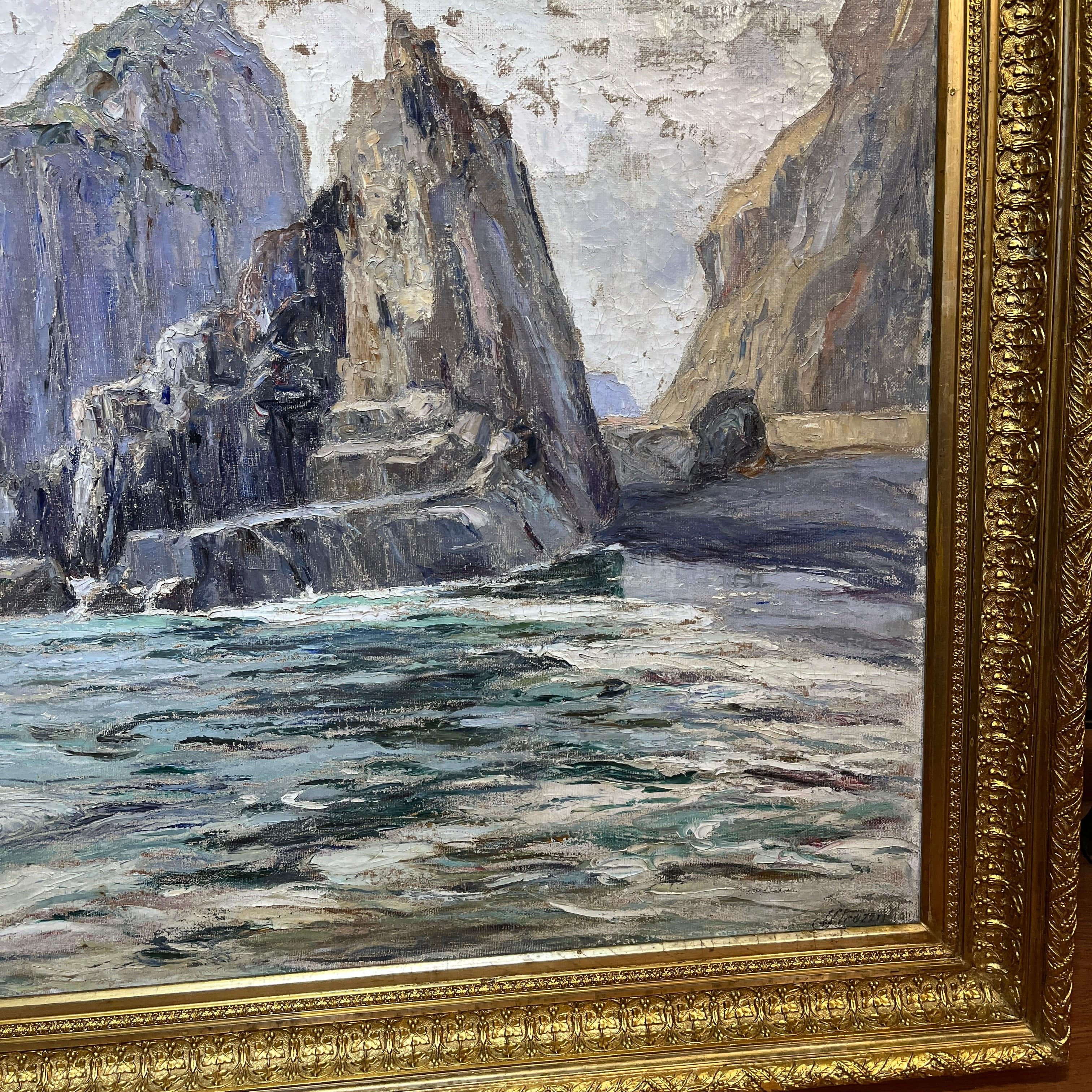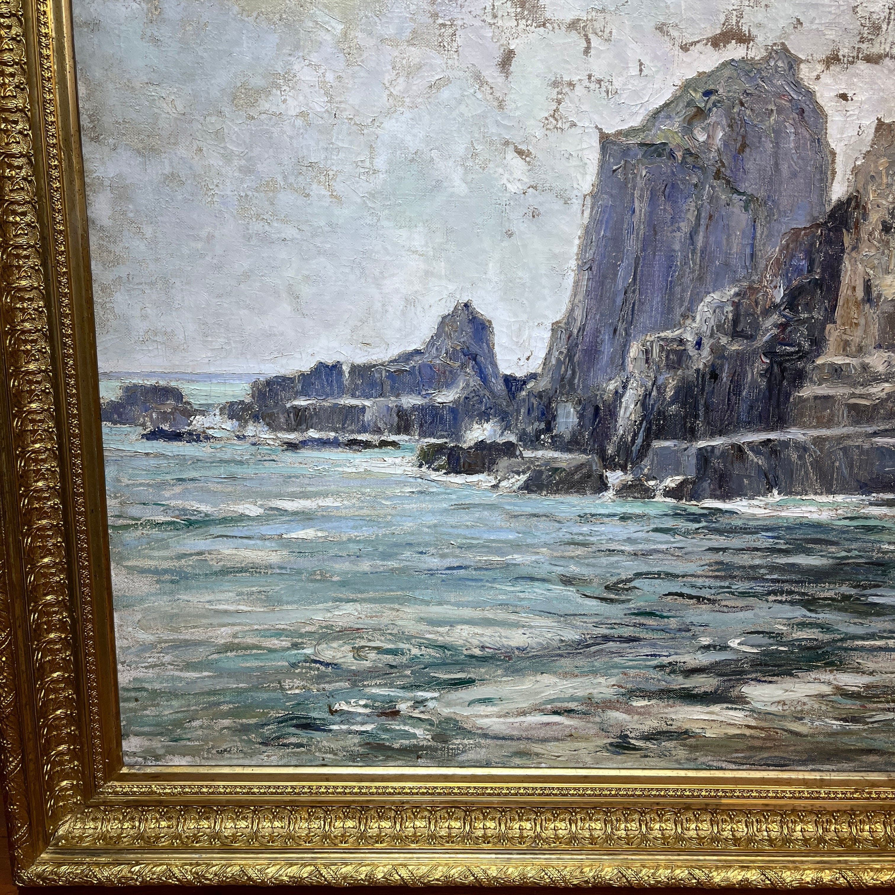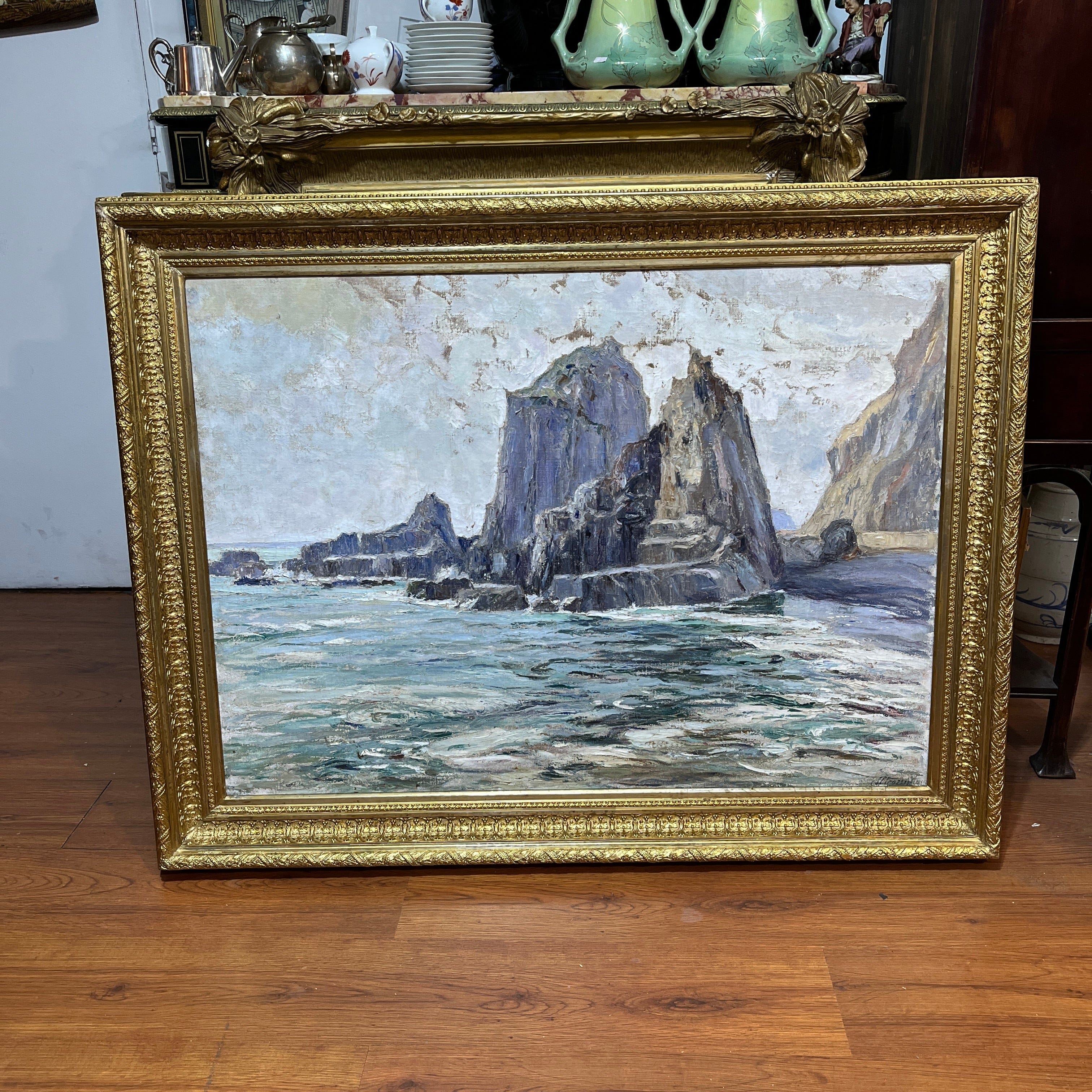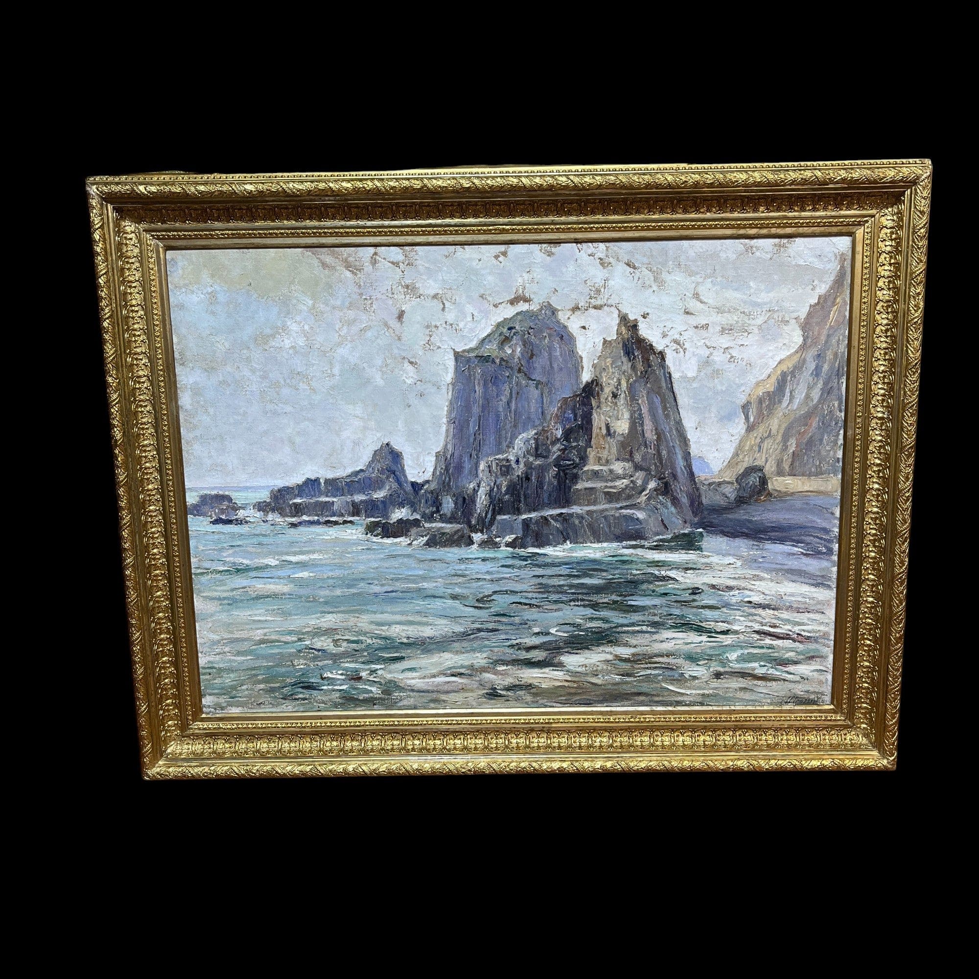 Bello óleo sobre cholguan entelado del artista chileno Luis Strozzi, representando un paisaje costero ubicado en Cobquecura puntualmente, un paisaje con un imponente roquerío. Destacan las texturas logradas por el artista, tanto de las rocas como del agua y sus corrientes. La obra está enmarcada en madera tallada en molde con relieves y pintada de dorado.
