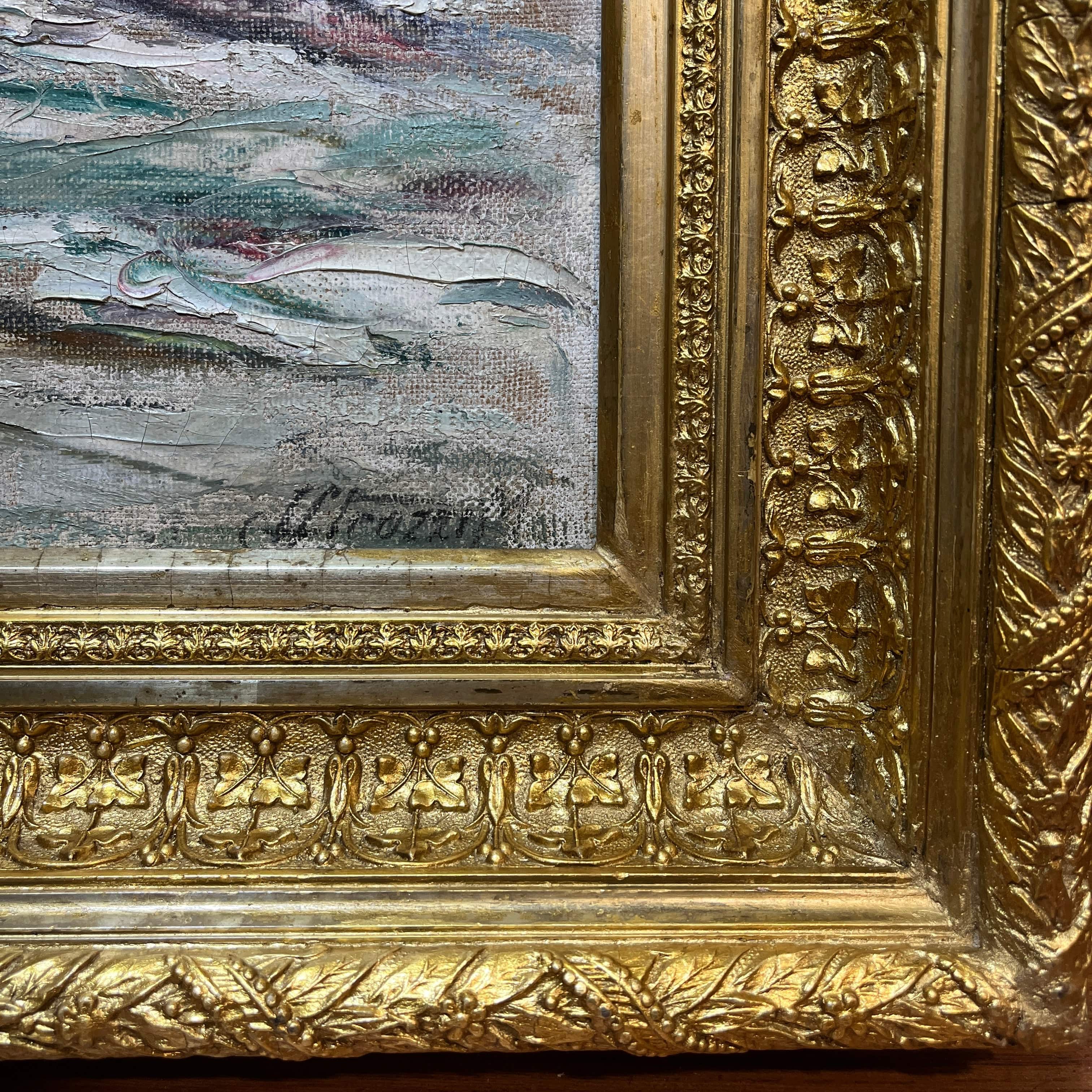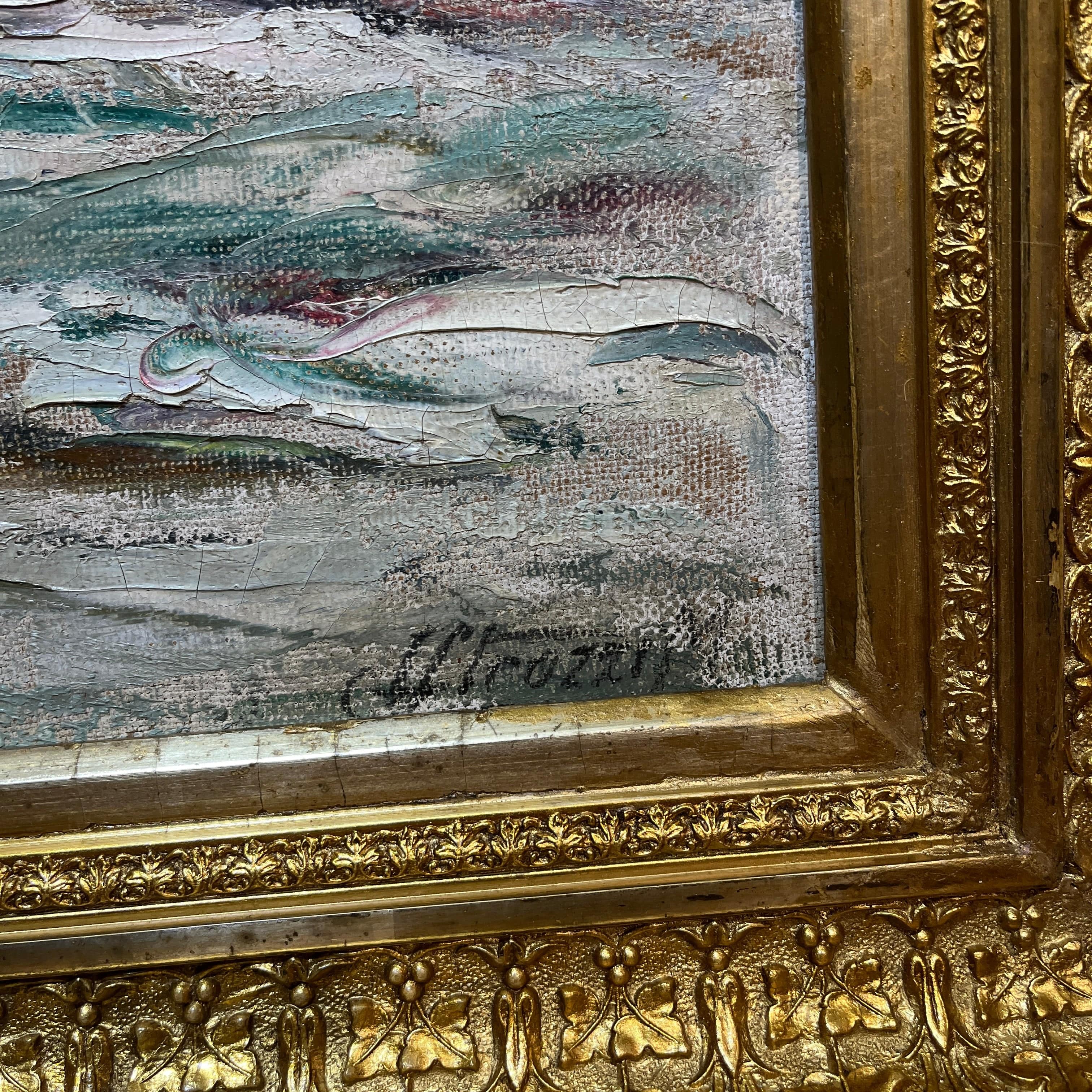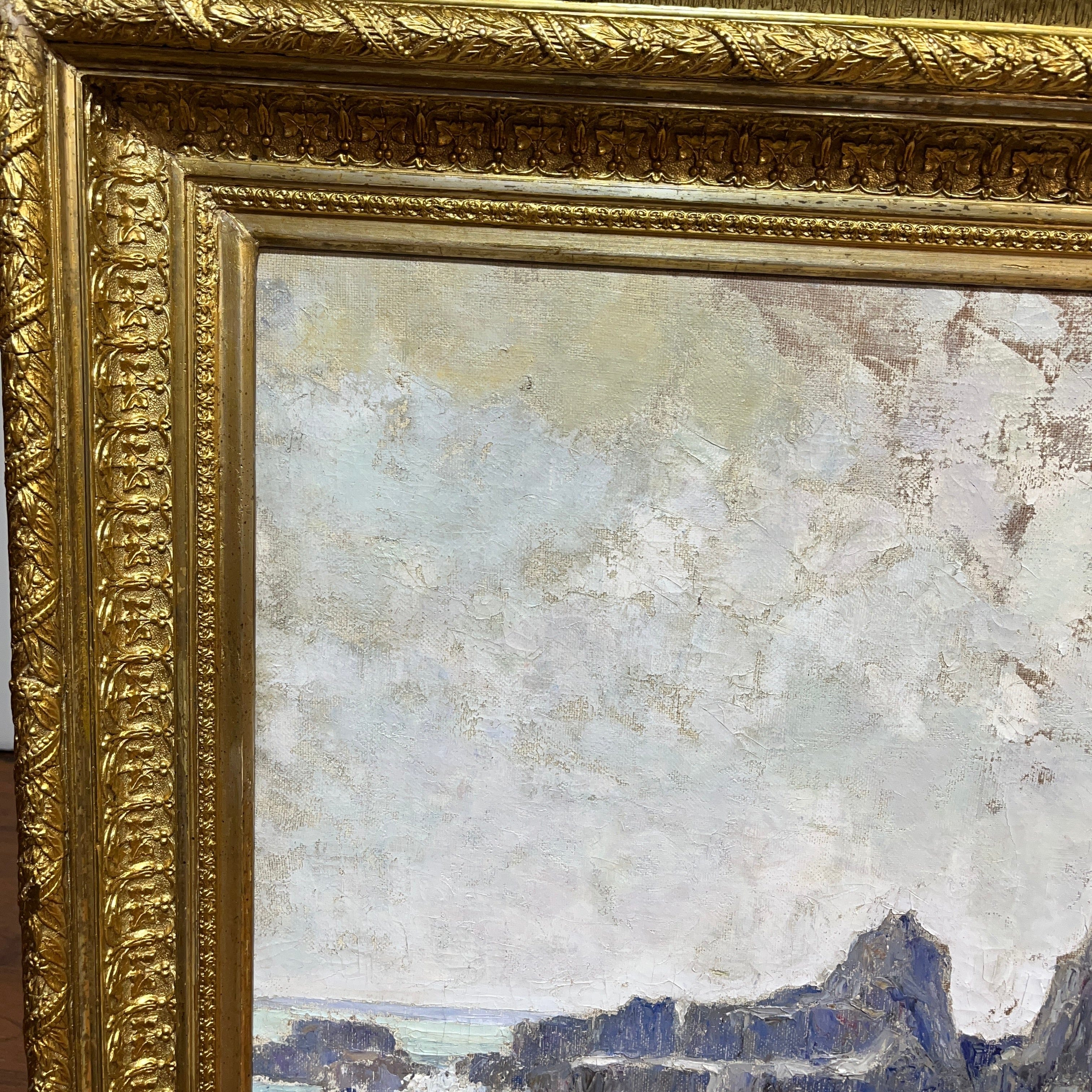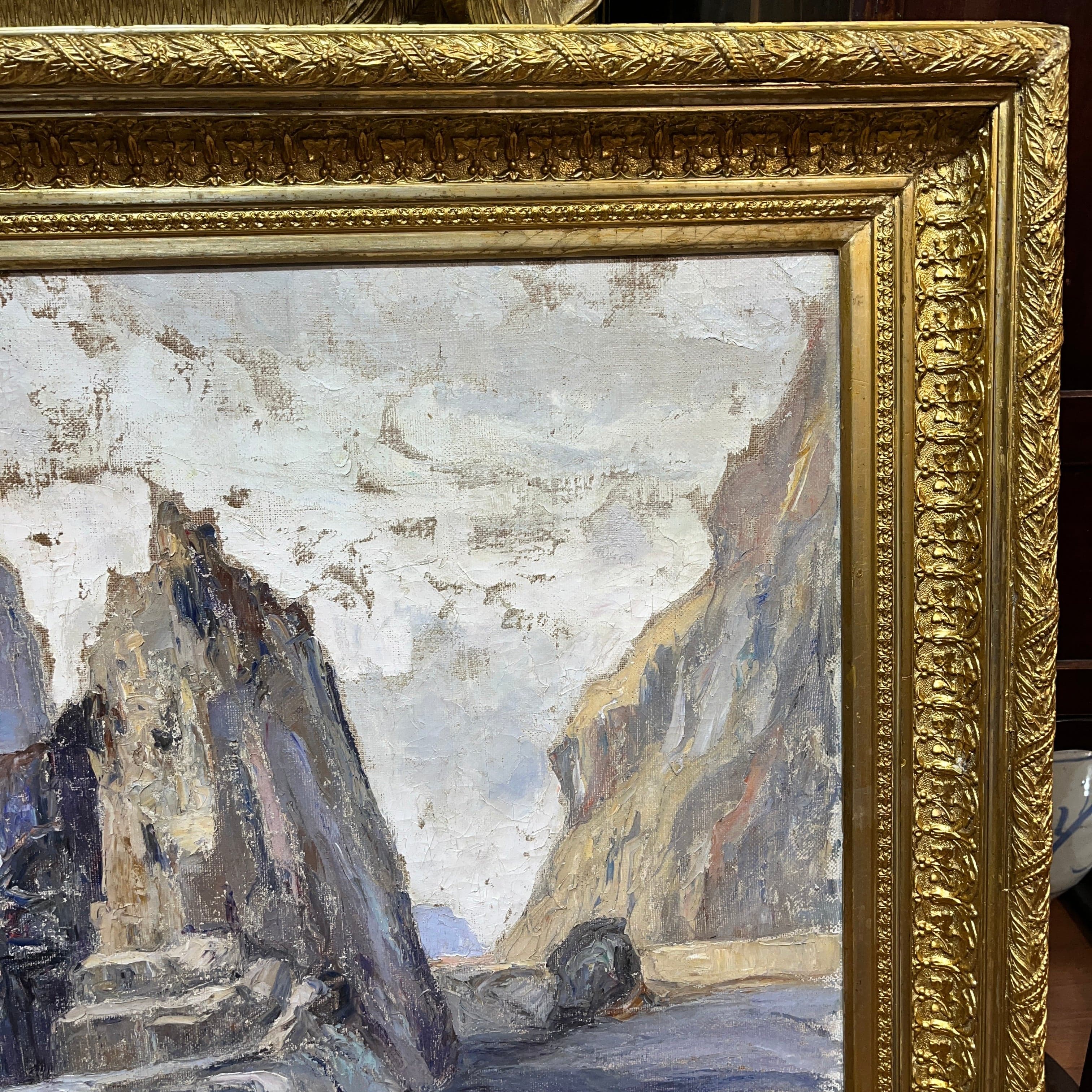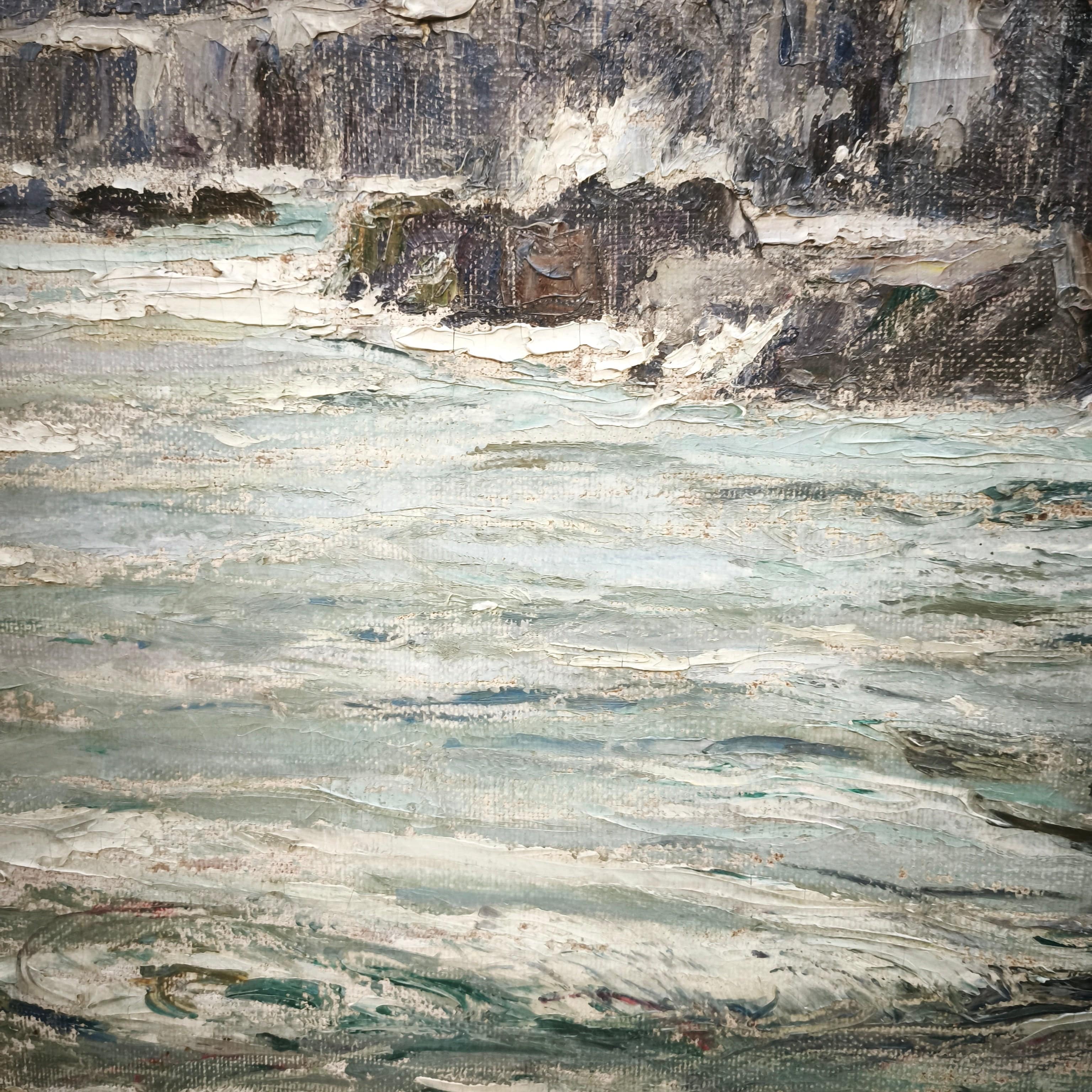 Bello óleo sobre cholguan entelado del artista chileno Luis Strozzi, representando un paisaje costero ubicado en Cobquecura puntualmente, un paisaje con un imponente roquerío. Destacan las texturas logradas por el artista, tanto de las rocas como del agua y sus corrientes. La obra está enmarcada en madera tallada en molde con relieves y pintada de dorado.