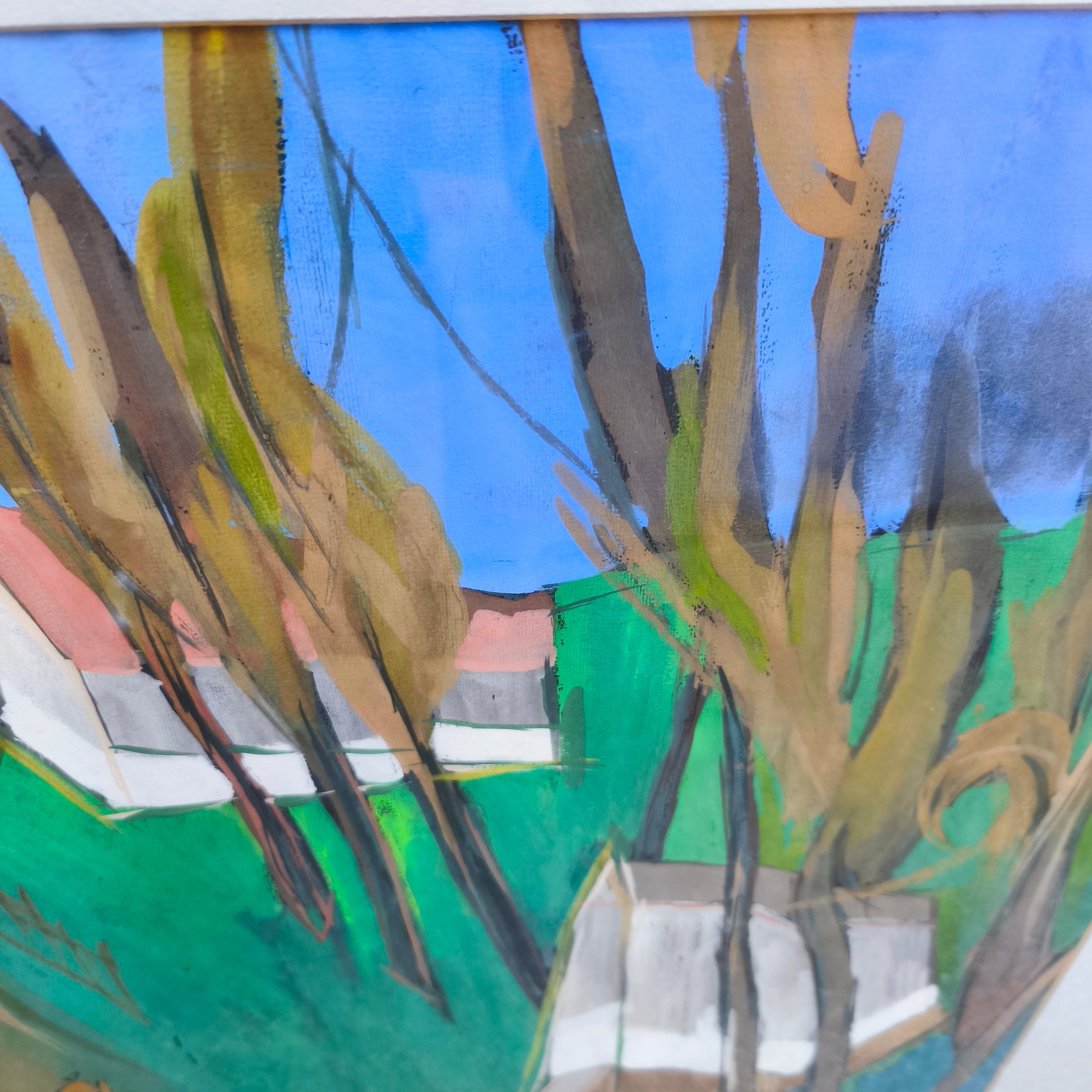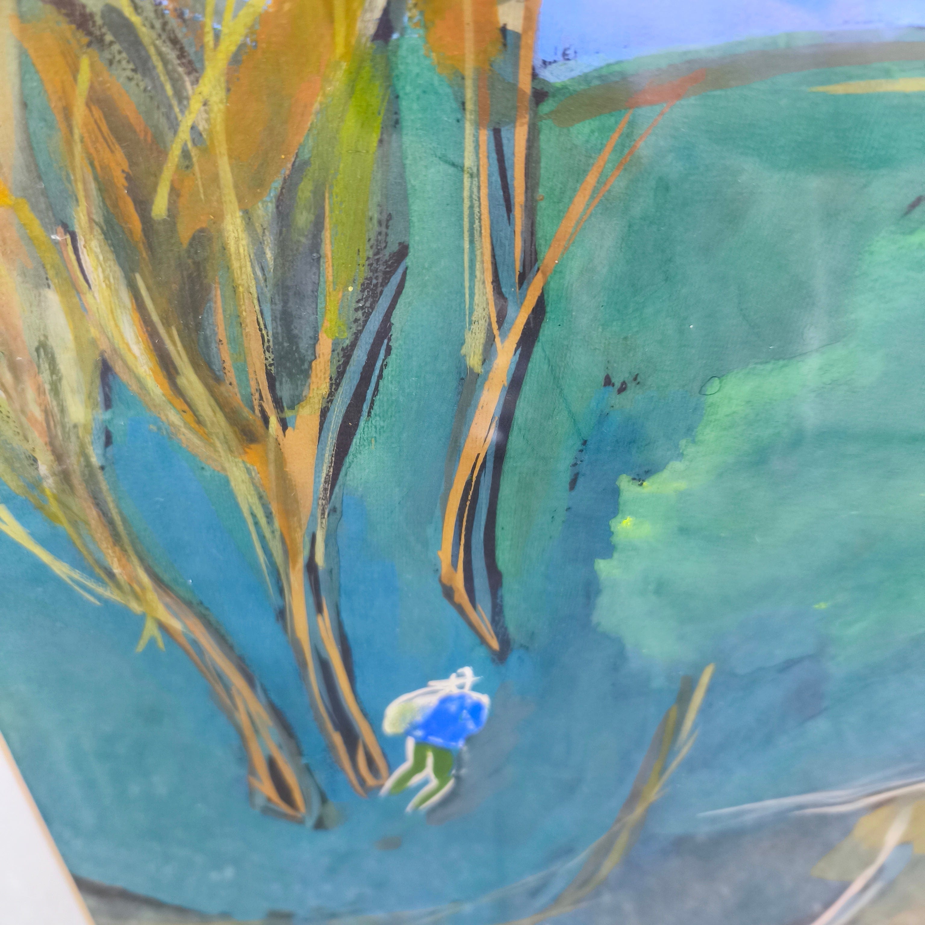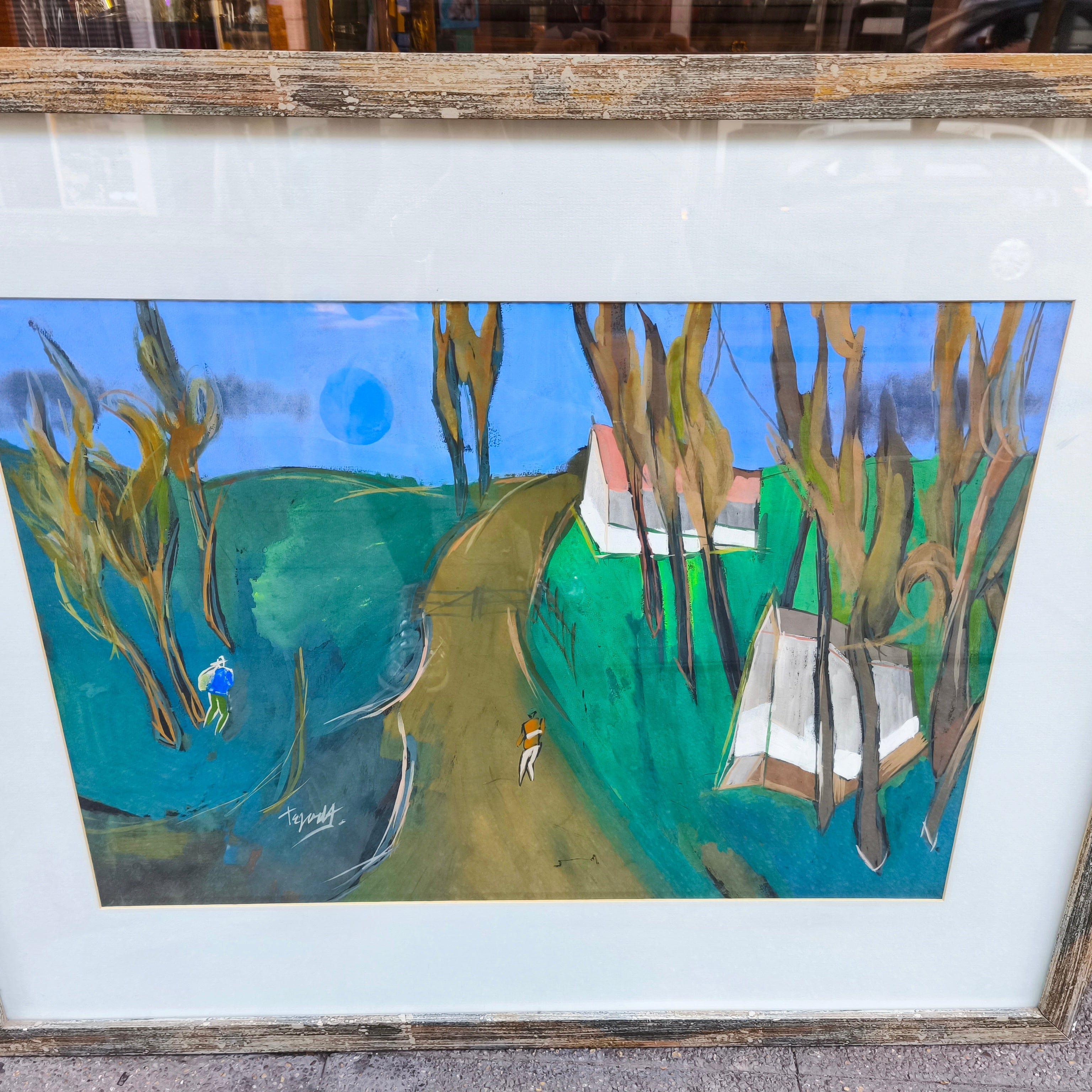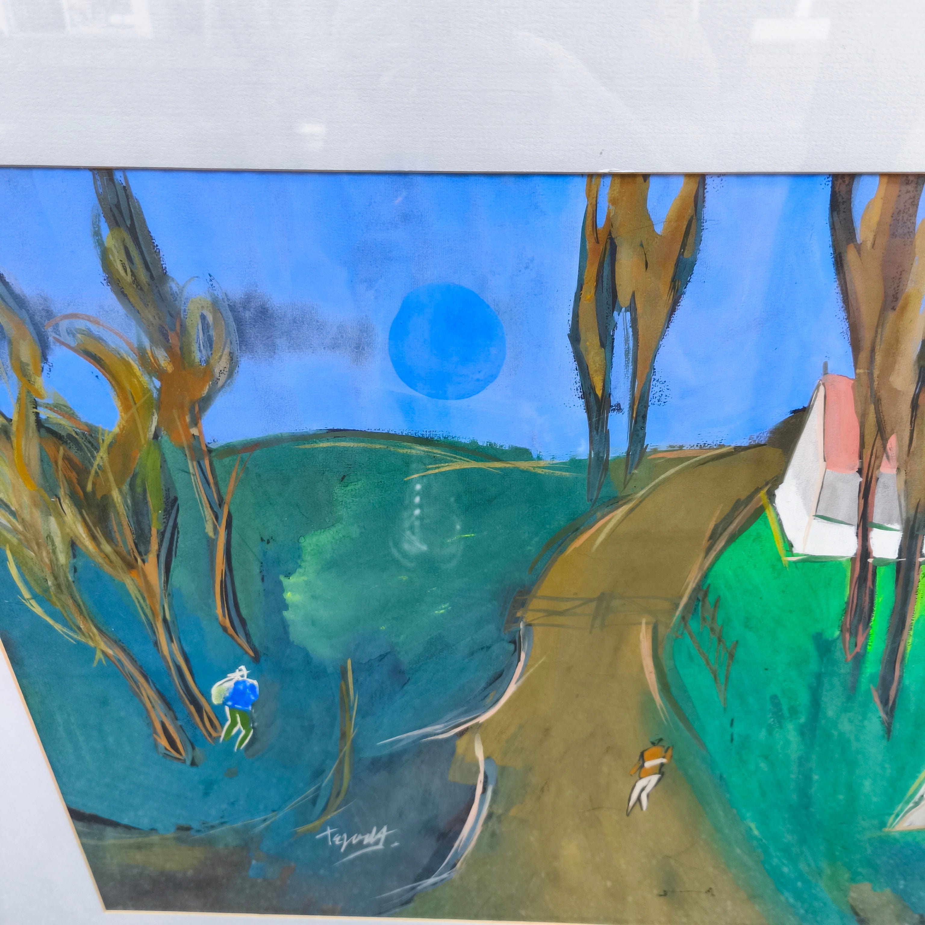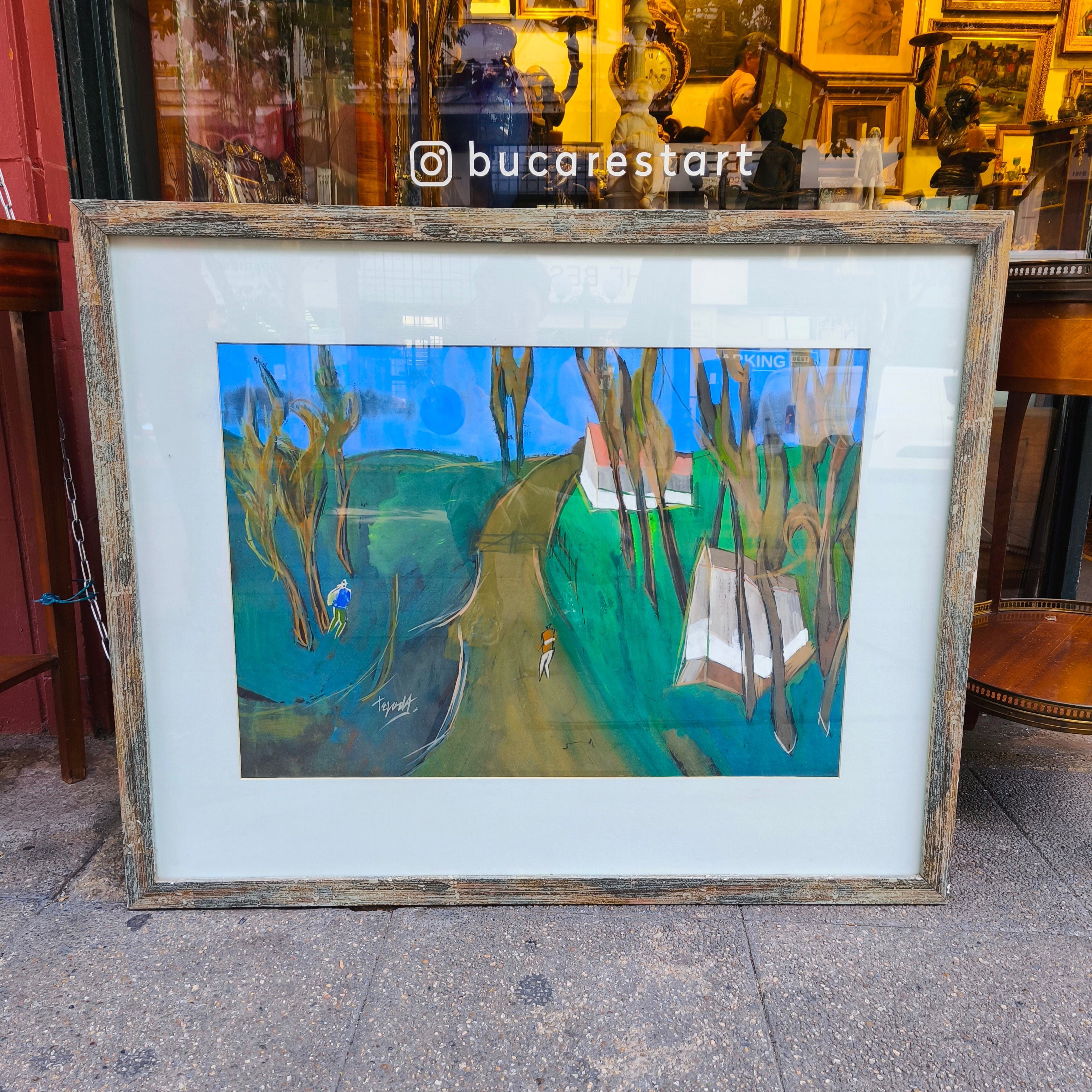 Acuarela en técnica Wash del artista chileno Luis Tejada, representando una quinta a lo lejos con dos campesinos llevando carga en su espalda. La composición tiene un nivel de abstracci9n que simplifica el paisaje, dejando sus elementos fundamentales y haciendo resaltar los trazos del artista.