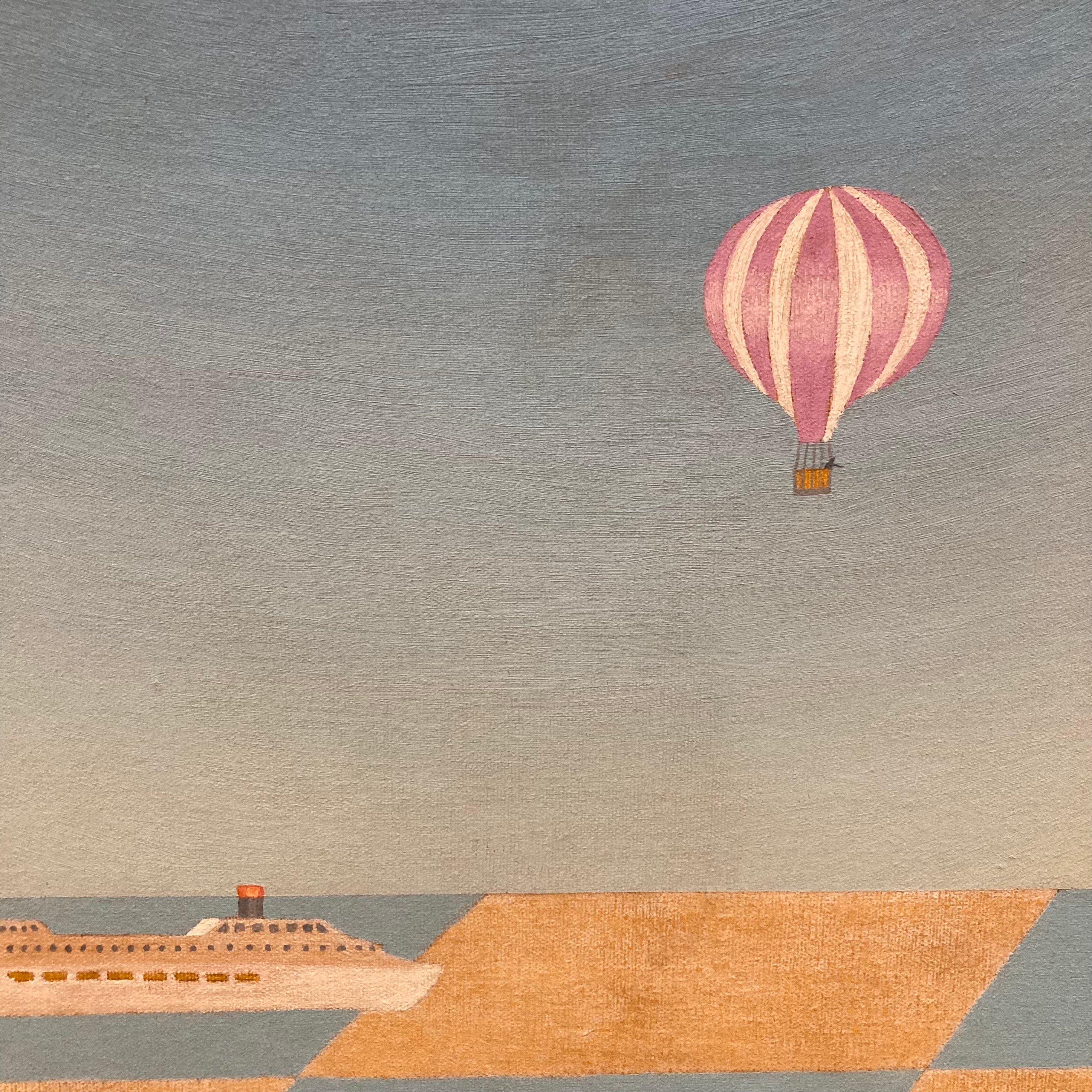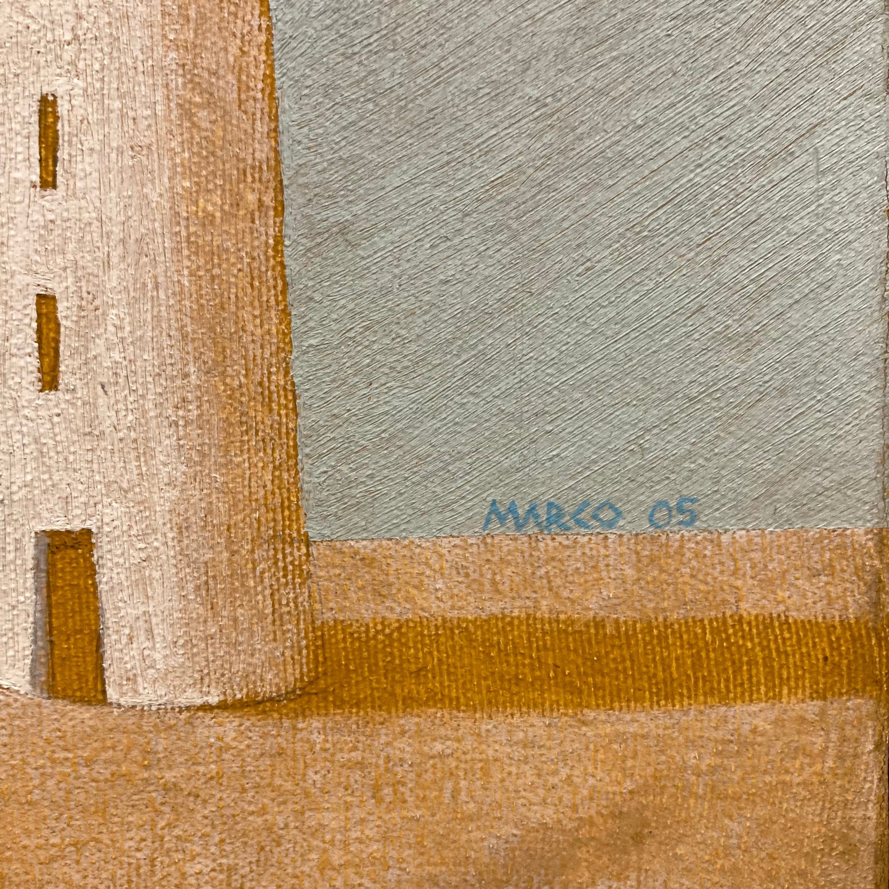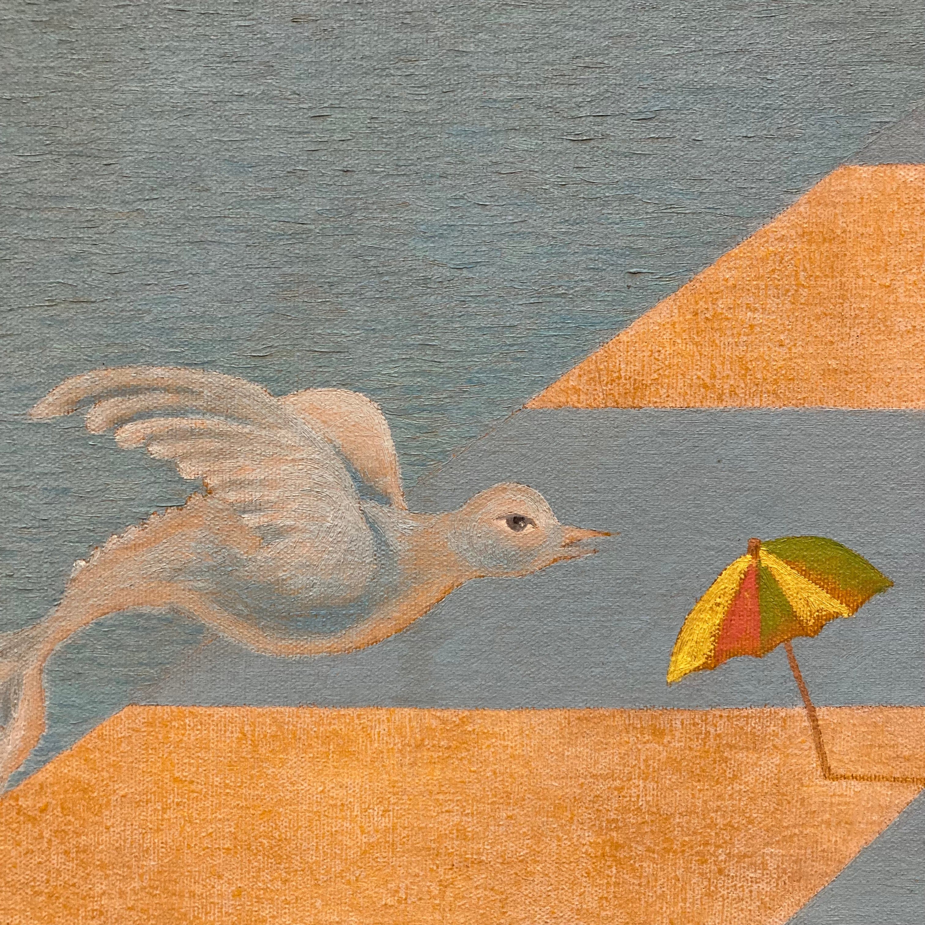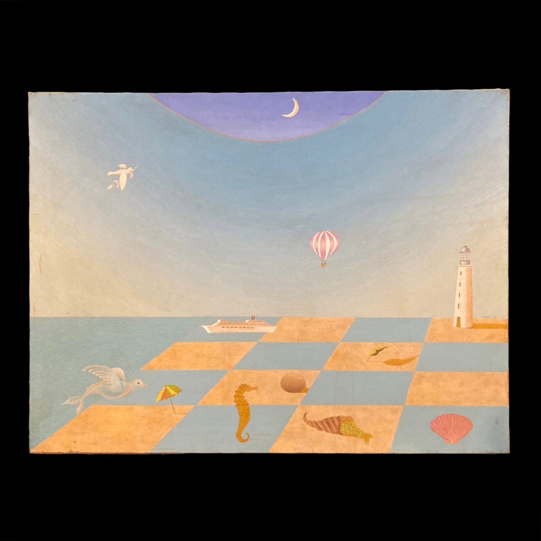 Óleo sobre tela del pintor chileno Marcos Farias, 2005. El cuadro retrata una escena onírica en tonos pasteles. La obra no presenta marco.