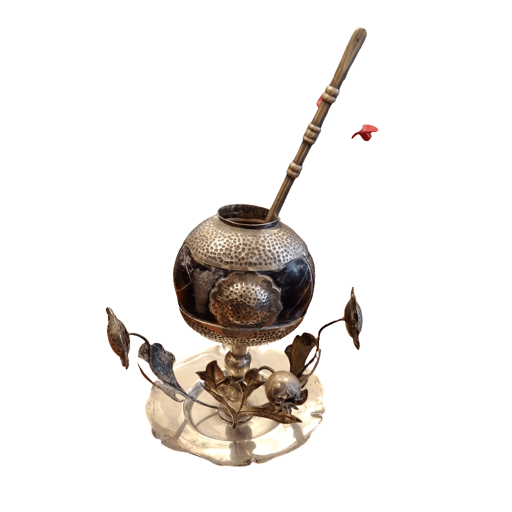 Bellísimo mate de plata antiguo con centro de calabaza y diseños tallados a mano, dándole una particula textura en relieve a la pieza, junto a aplicaciones con forma girasoles y granadas a su alrededor.