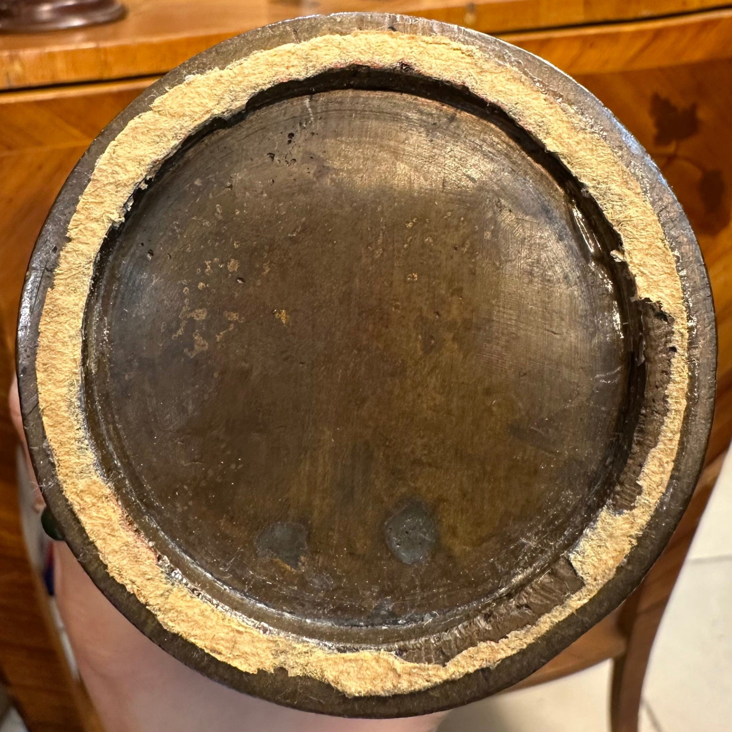 Bello par de jarrones de bronce con patina marrón de los años 50 aproximadamente. Posee un cuerpo con relieves que representan aves típicas de la cultura japonesa sobre ramas de ciruelo. Además, presenta un intrincado diseño y asas con lo que parecen ser cabezas de animales.