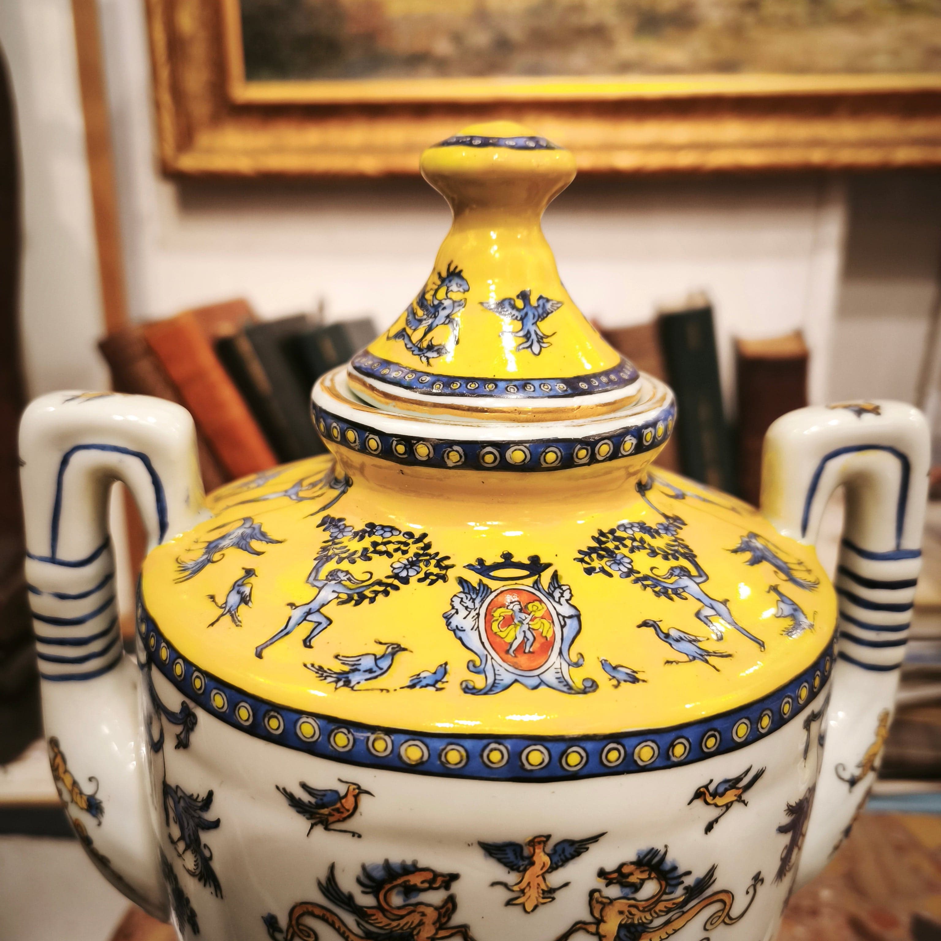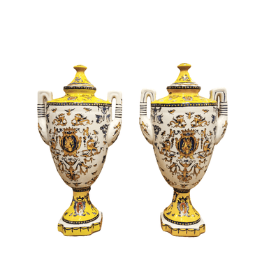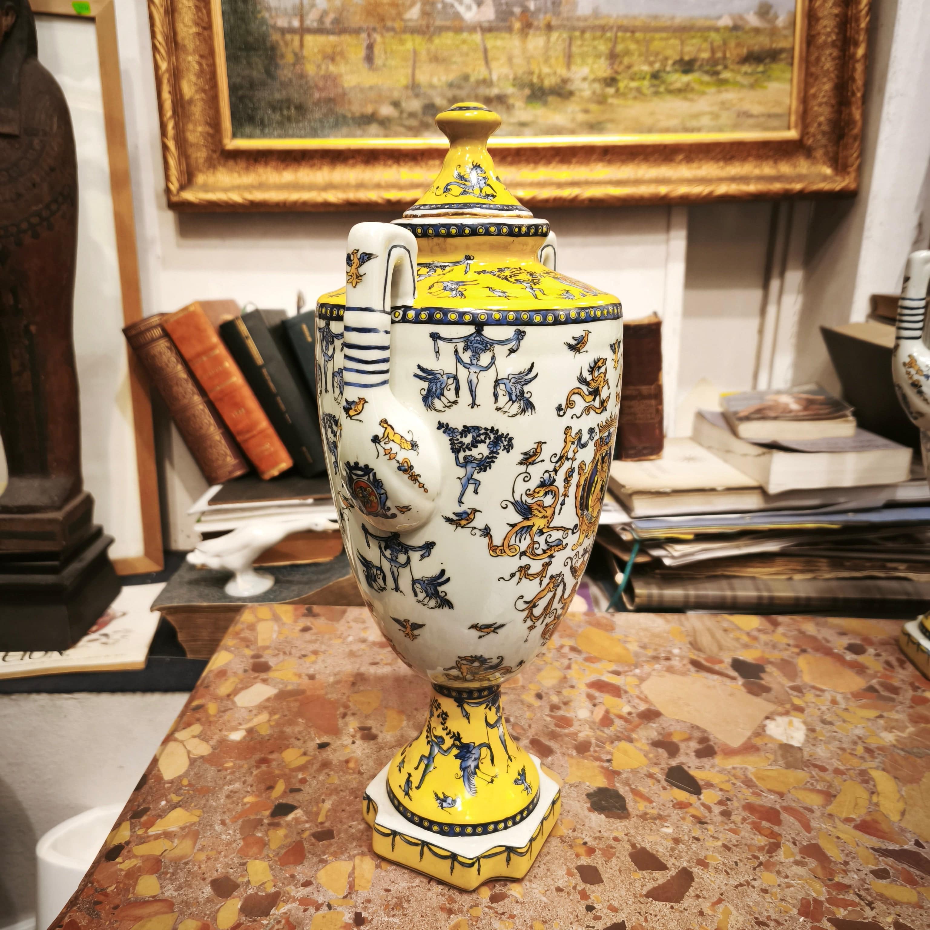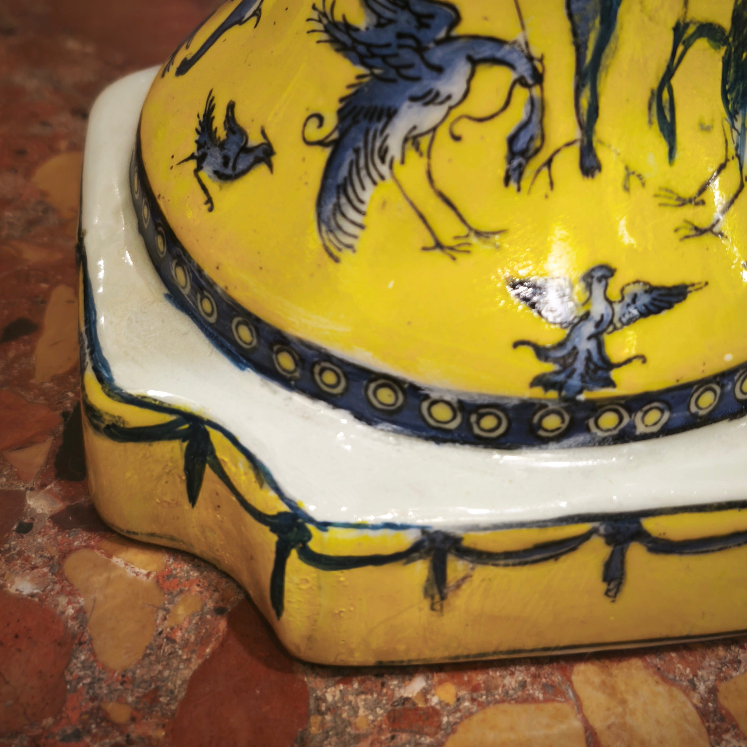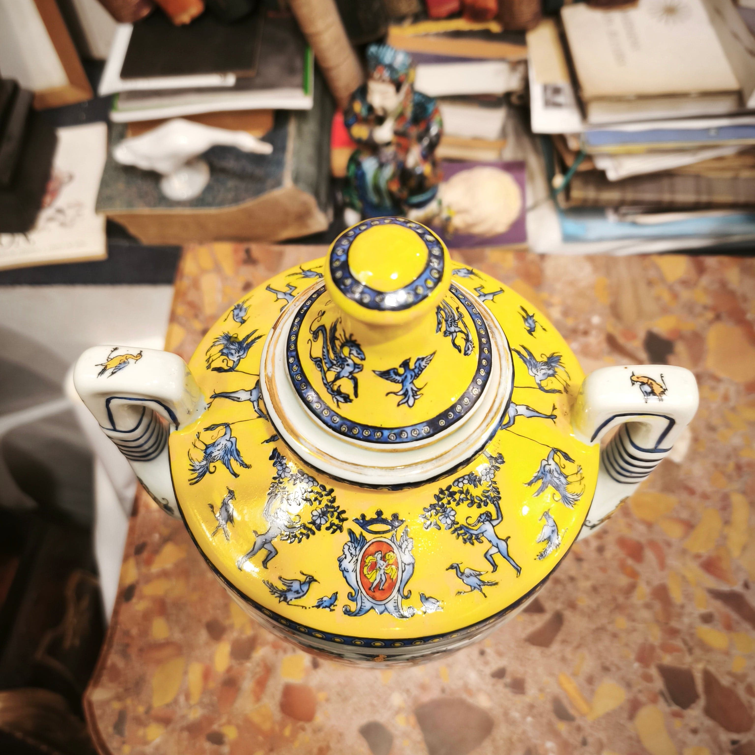 Hermosos copones con tapa hechos de porcelana de origen francés de Rouen con sello en su base. Bello diseño de ángeles y pájaros, en amarillo, azul y blanco.