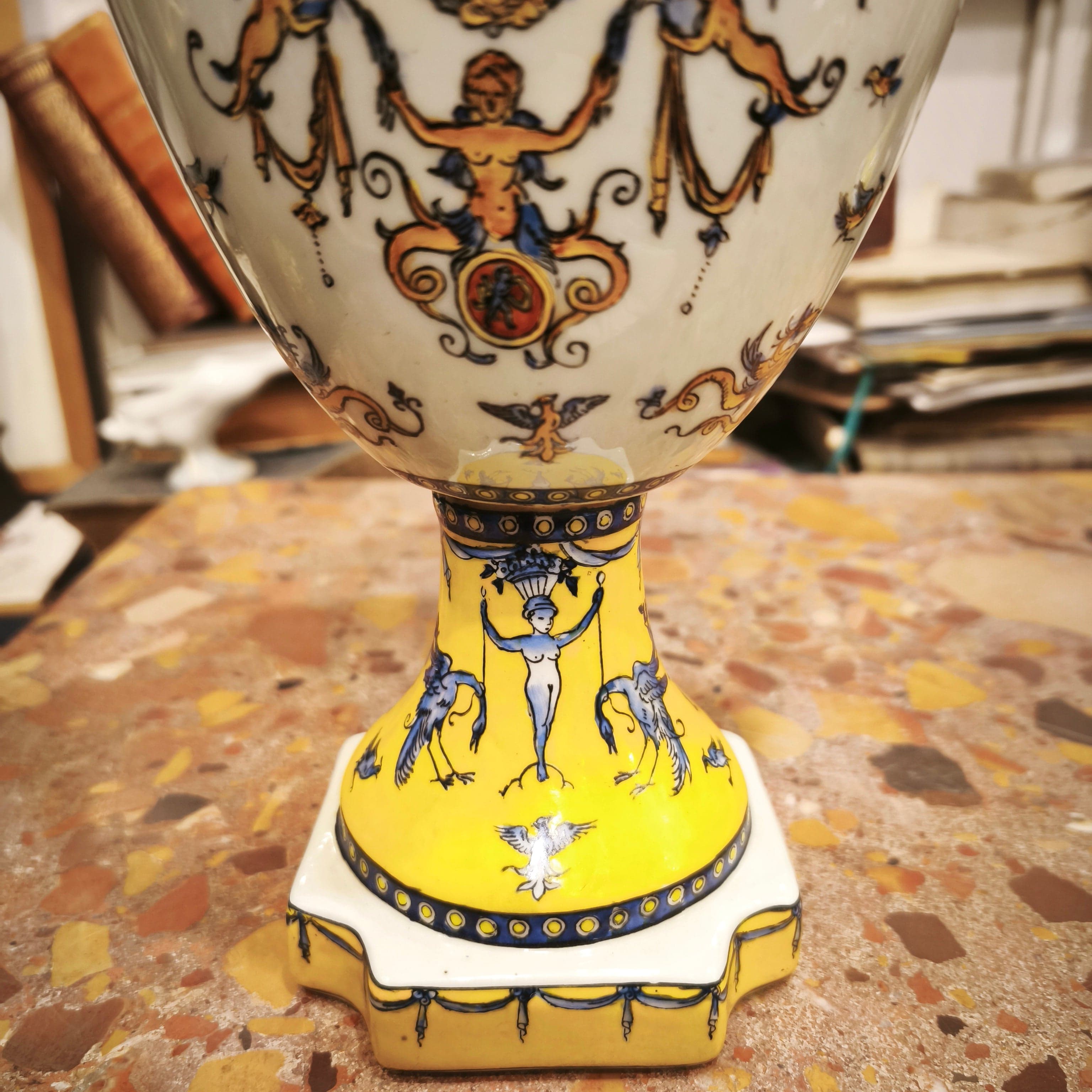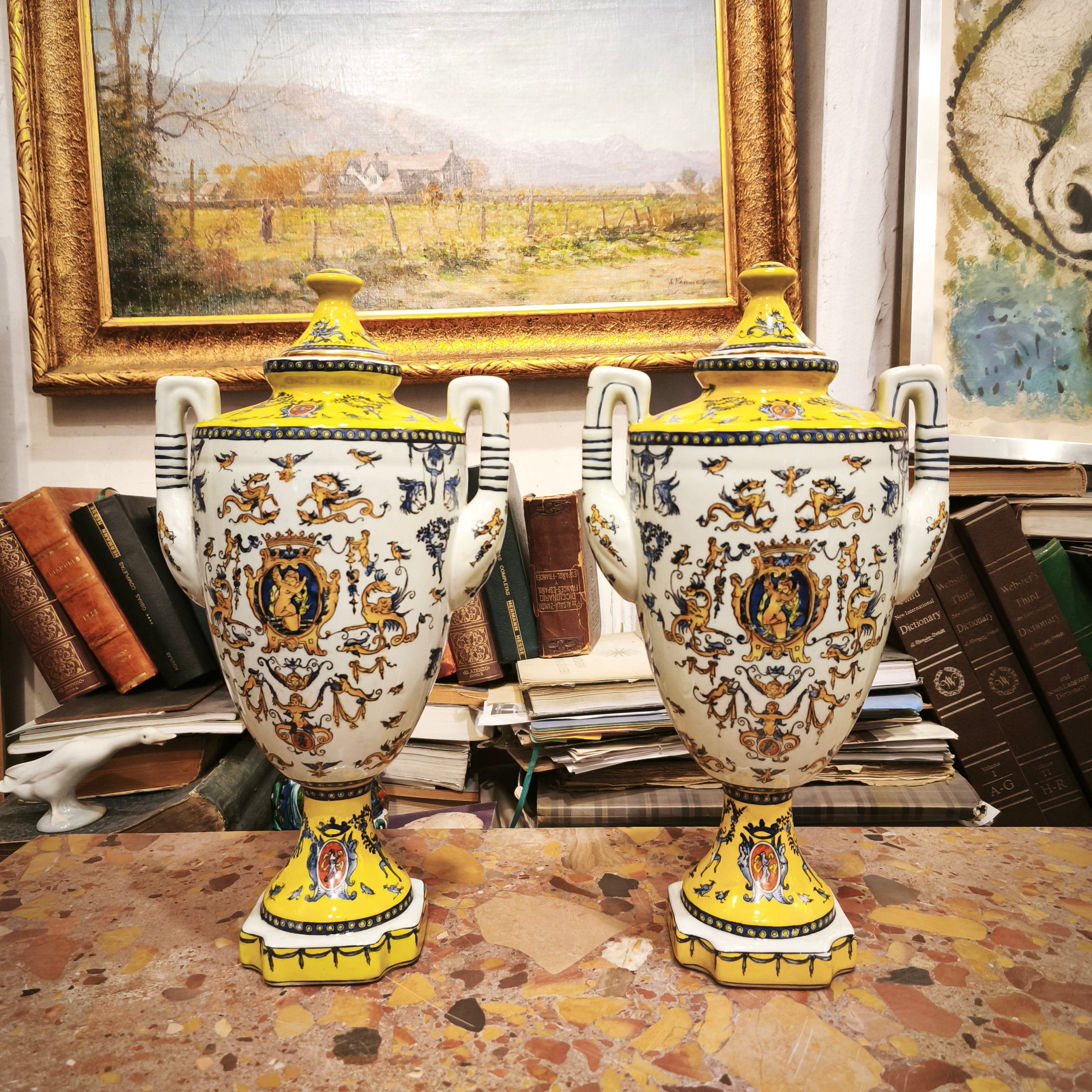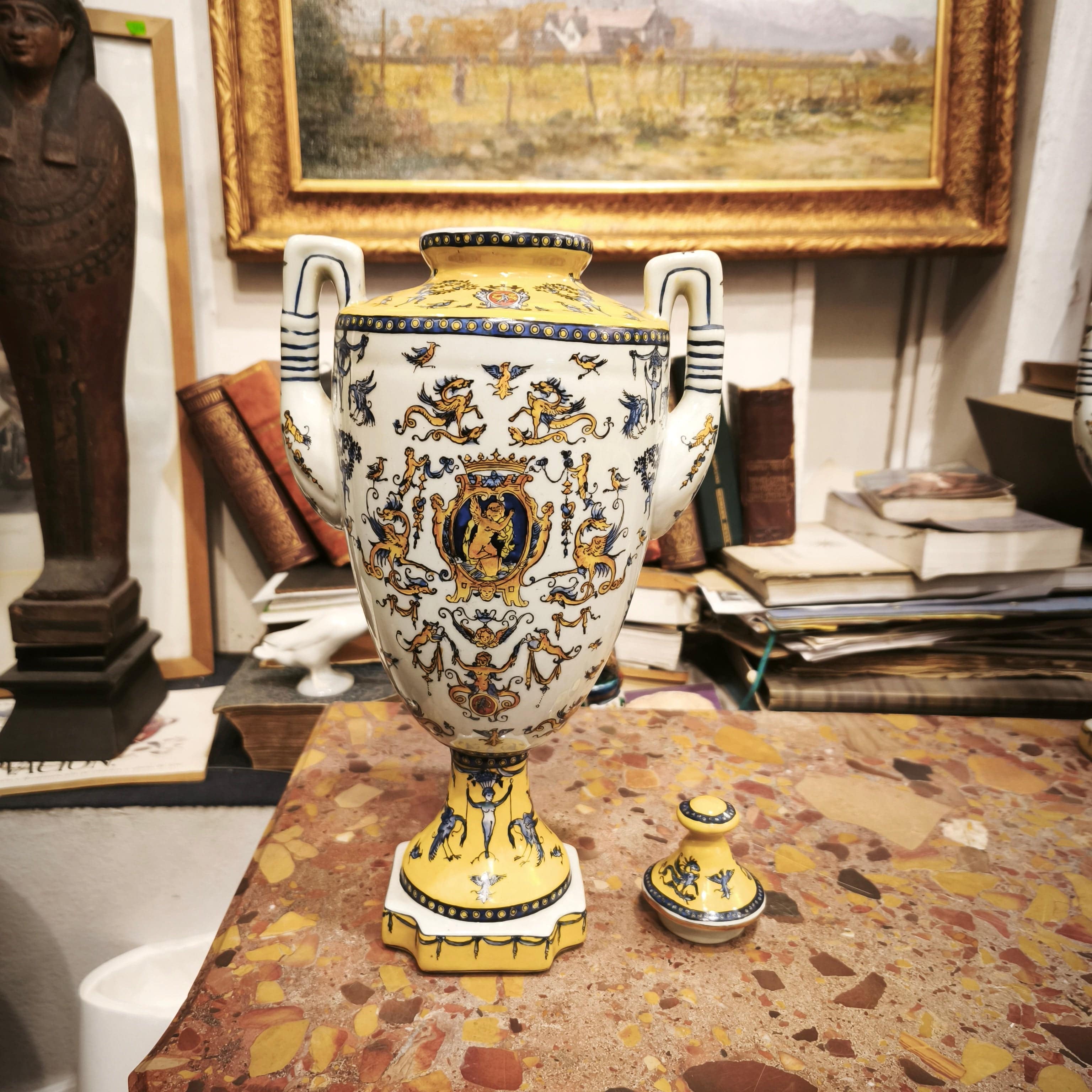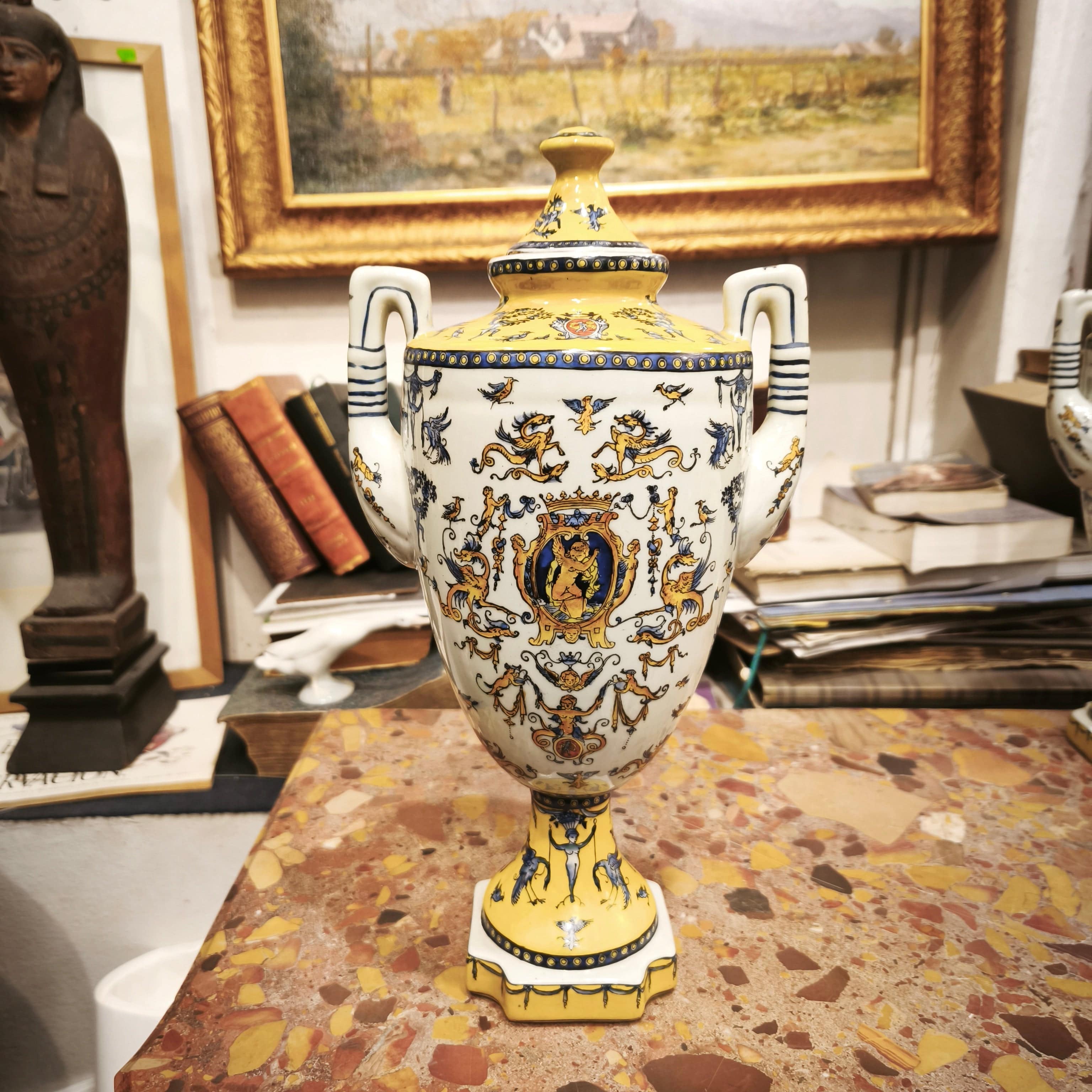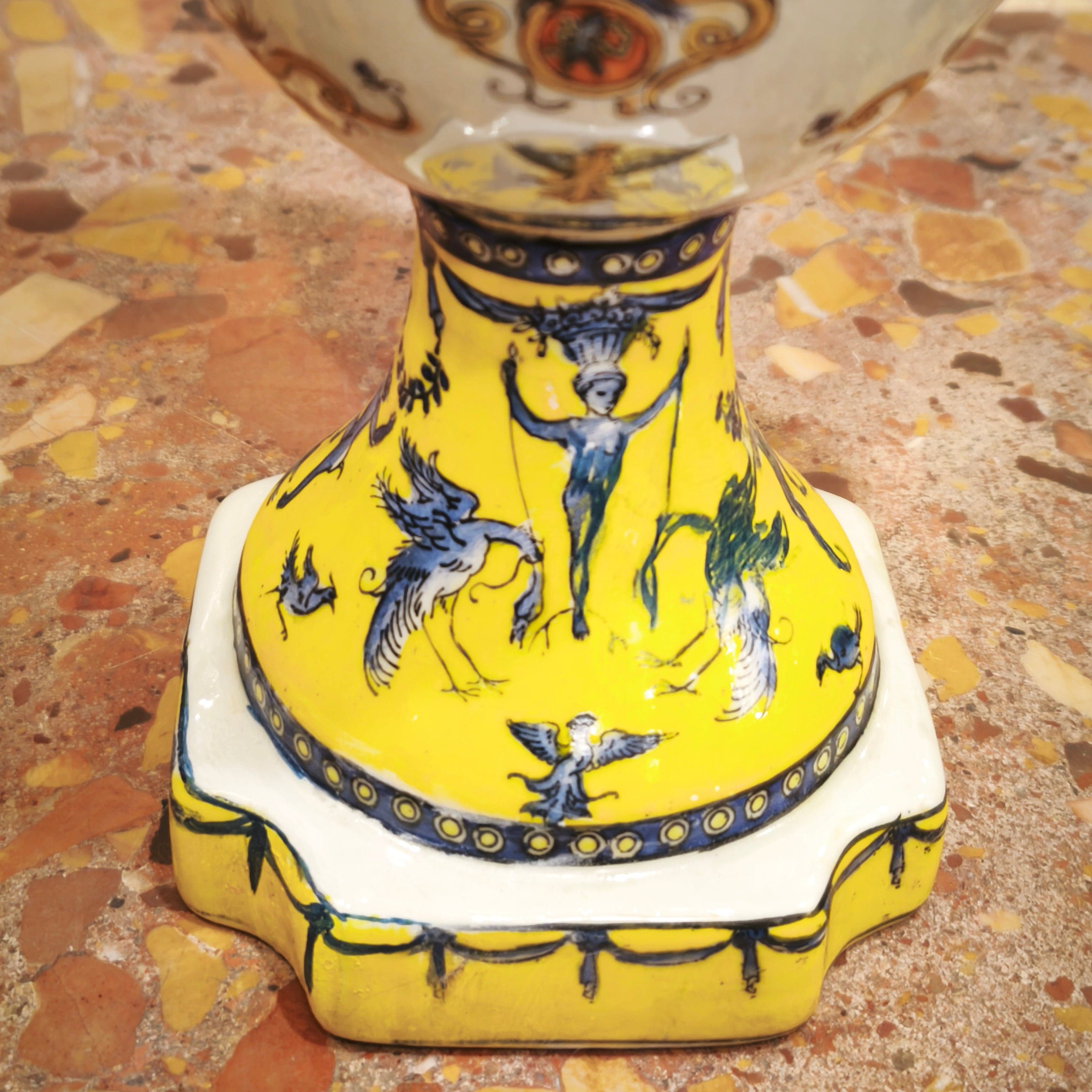 Hermosos copones con tapa hechos de porcelana de origen francés de Rouen con sello en su base. Bello diseño de ángeles y pájaros, en amarillo, azul y blanco.