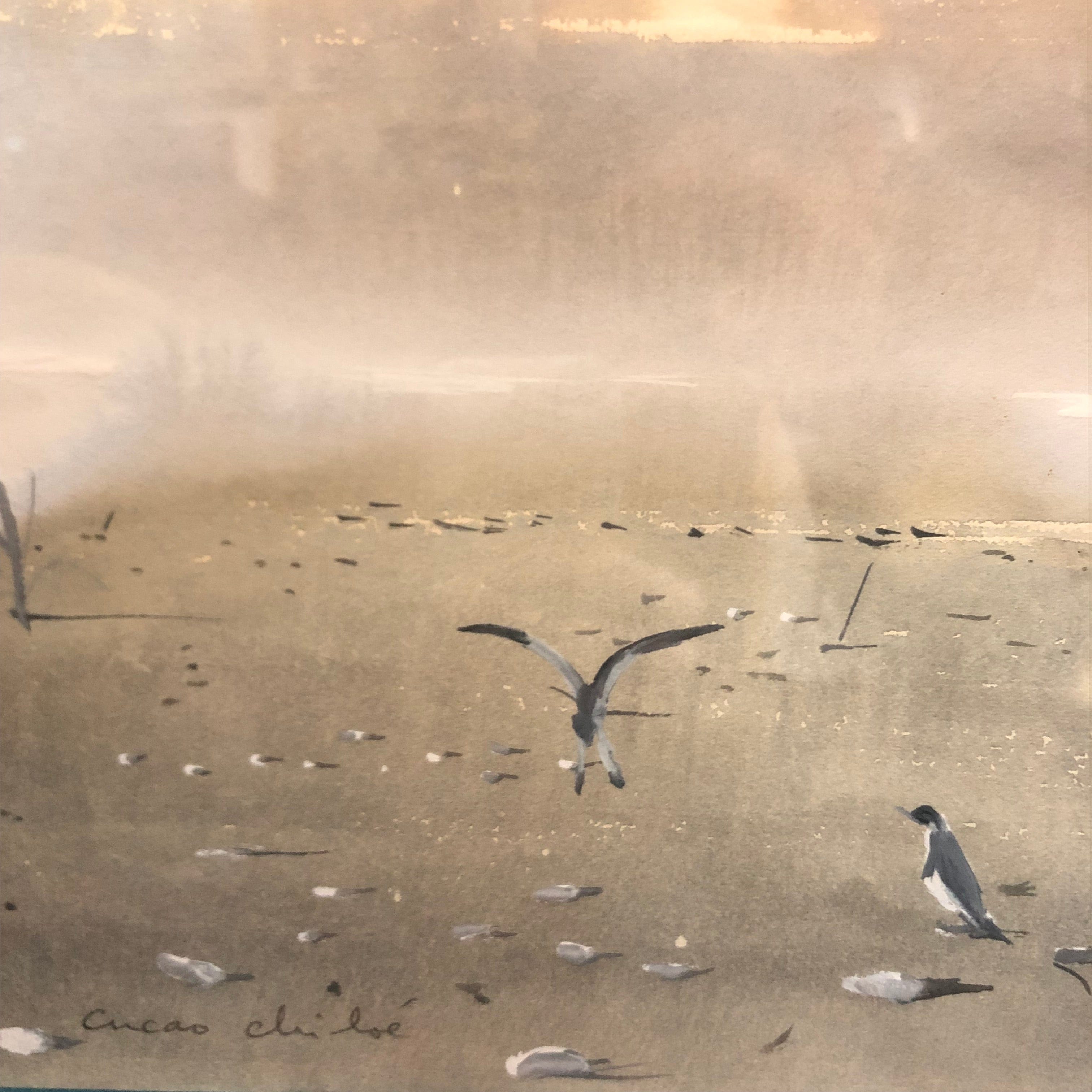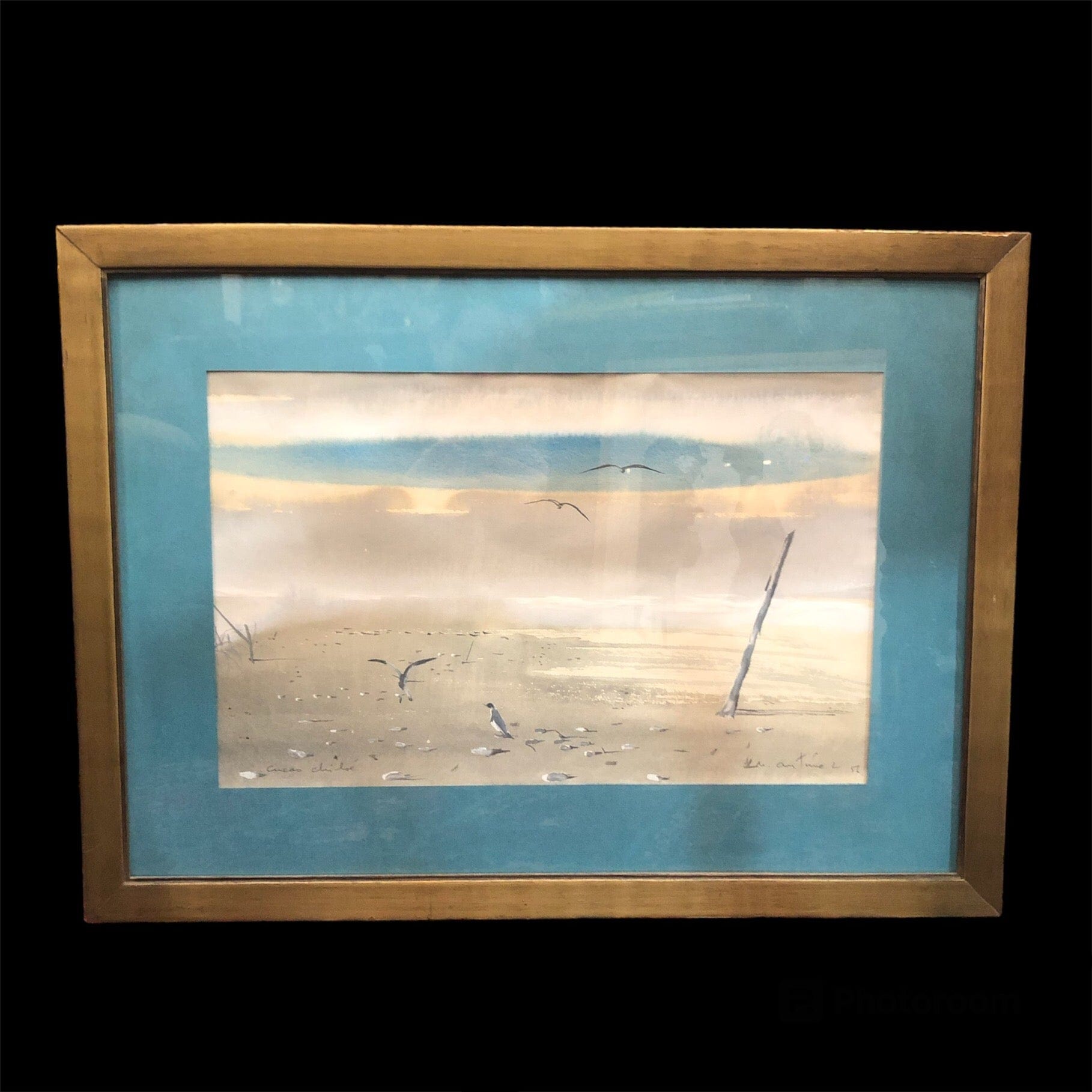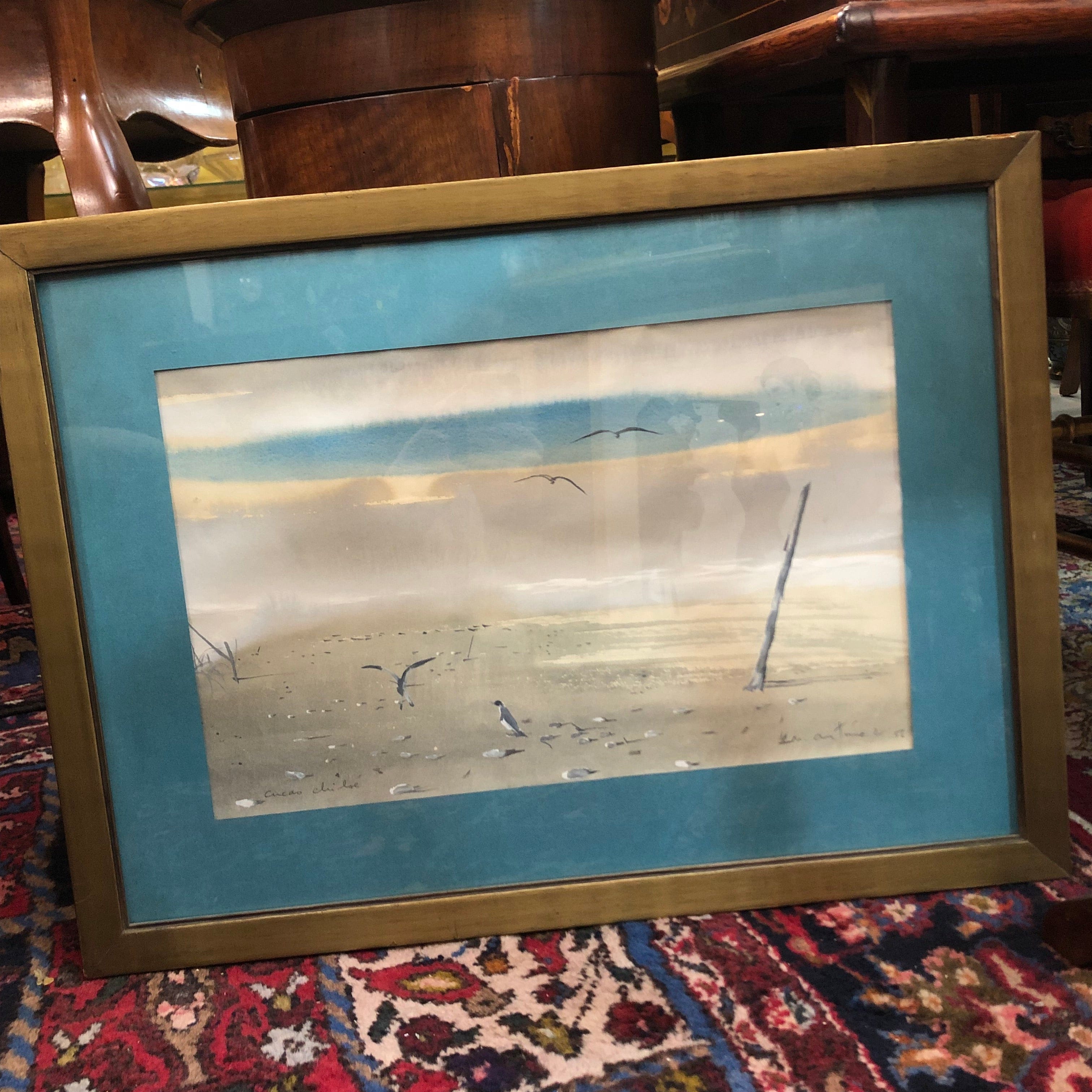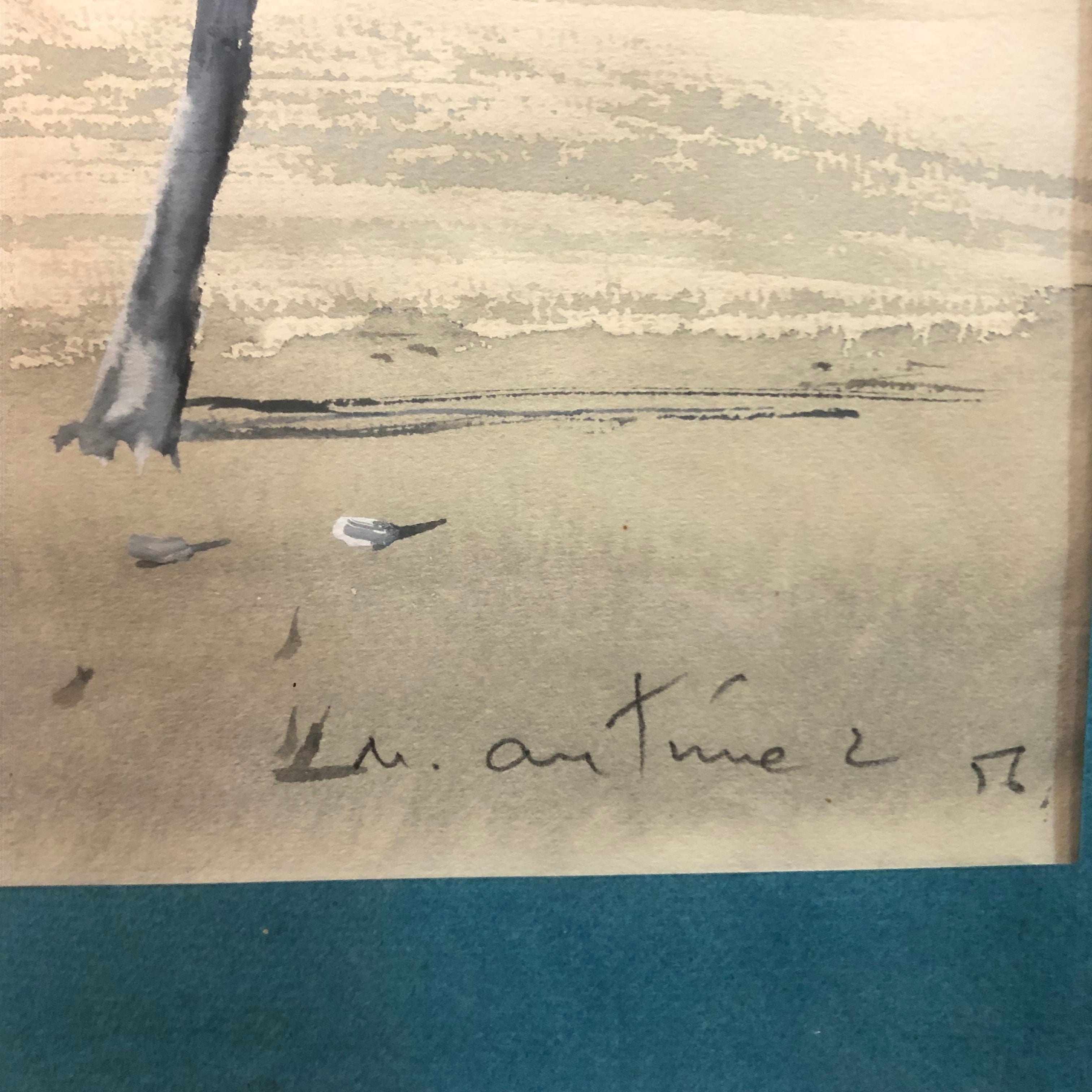 Acuarela (1952) de la playa de Chucao, del reconocido artista nacional y premio nacional de arte Nemesio Antúnez (1918-1993) fue un destacado pintor y grabador chileno. Nació en Santiago de Chile y estudió arquitectura antes de dedicarse al arte. Su carrera artística comenzó en Nueva York, donde fue influenciado por el expresionismo abstracto y el arte moderno. Antúnez fue un innovador en el grabado, fundando el Taller 99 en Chile, un espacio clave para el desarrollo de esta técnica en el país. Su obra abarca temas como la naturaleza, el cosmos y la figura humana, y se caracteriza por el uso del color y la experimentación con texturas. También fue un importante promotor cultural en Chile.