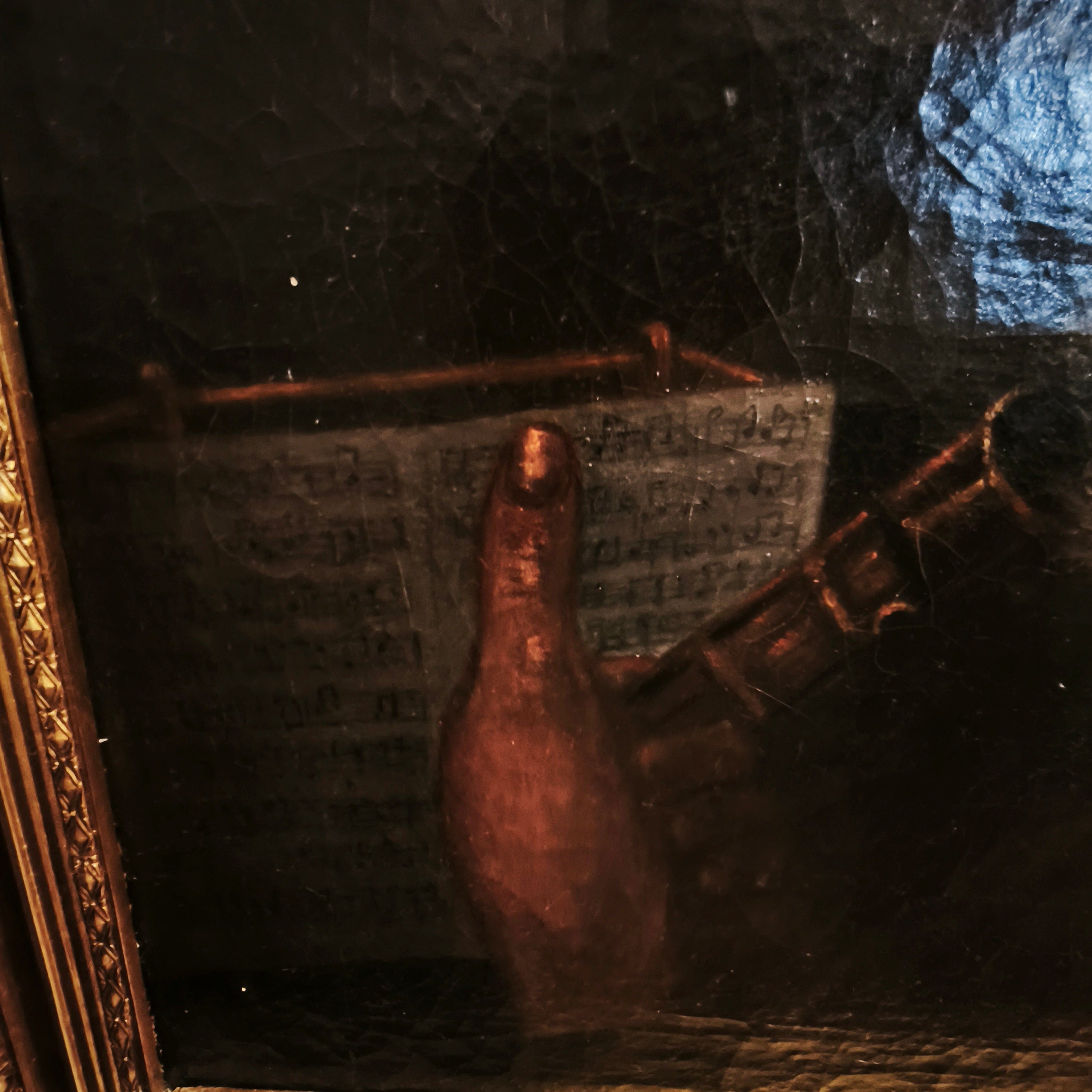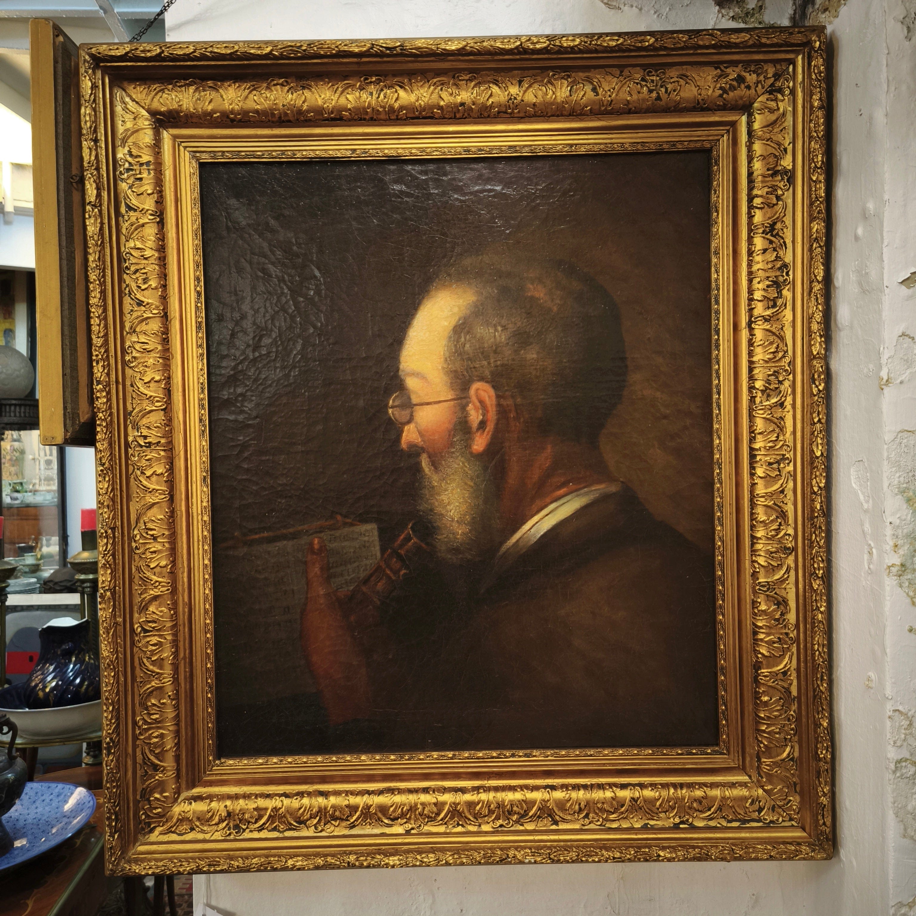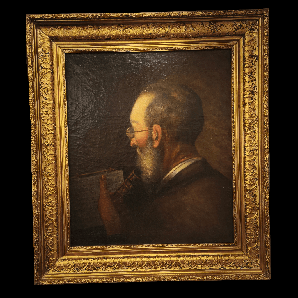 Óleo sobre tela de Pedro Reszka, representando a un saxofonista leyendo una partitura', asumiendo una perspectiva por sobre el hombro del sujeto, un hombre mayor con barba y anteojos, dejando ver la música escrita en la partitura', pero no el rostro del artista de forma completa. La pieza tiene un bello balance de luces y sombras que le da un carácter misterioso a la obra. La pieza está enmarcada en madera pintada en elegante dorado, con relieves hechos en molde.