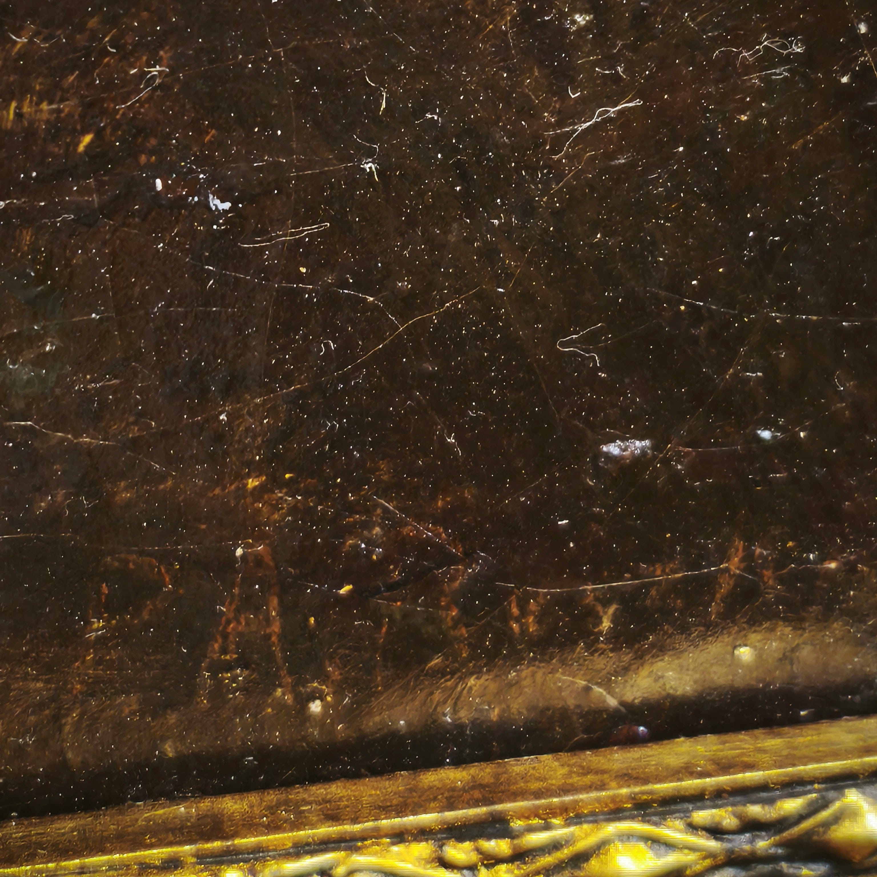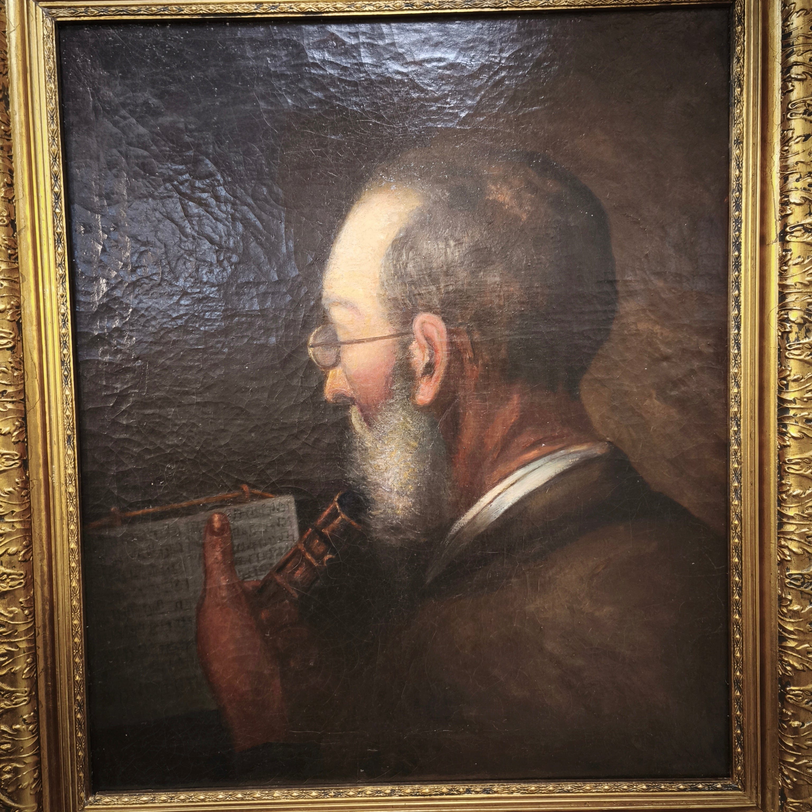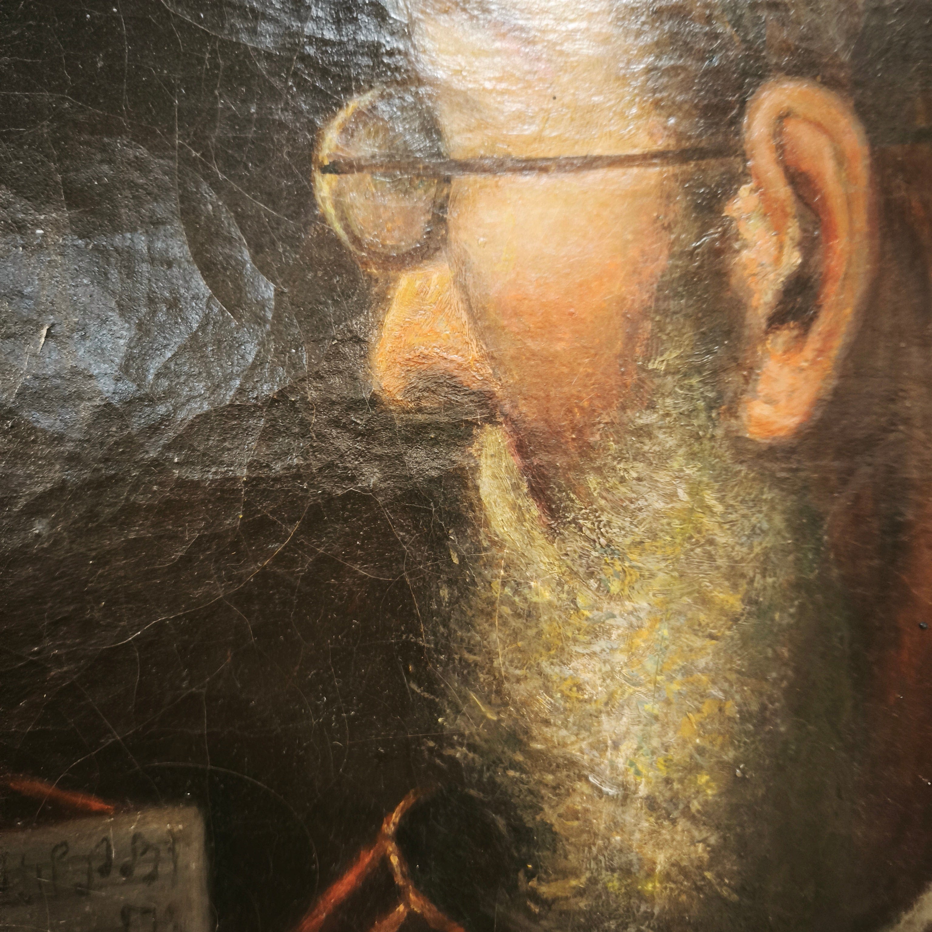 Óleo sobre tela de Pedro Reszka, representando a un saxofonista leyendo una partitura', asumiendo una perspectiva por sobre el hombro del sujeto, un hombre mayor con barba y anteojos, dejando ver la música escrita en la partitura', pero no el rostro del artista de forma completa. La pieza tiene un bello balance de luces y sombras que le da un carácter misterioso a la obra. La pieza está enmarcada en madera pintada en elegante dorado, con relieves hechos en molde.