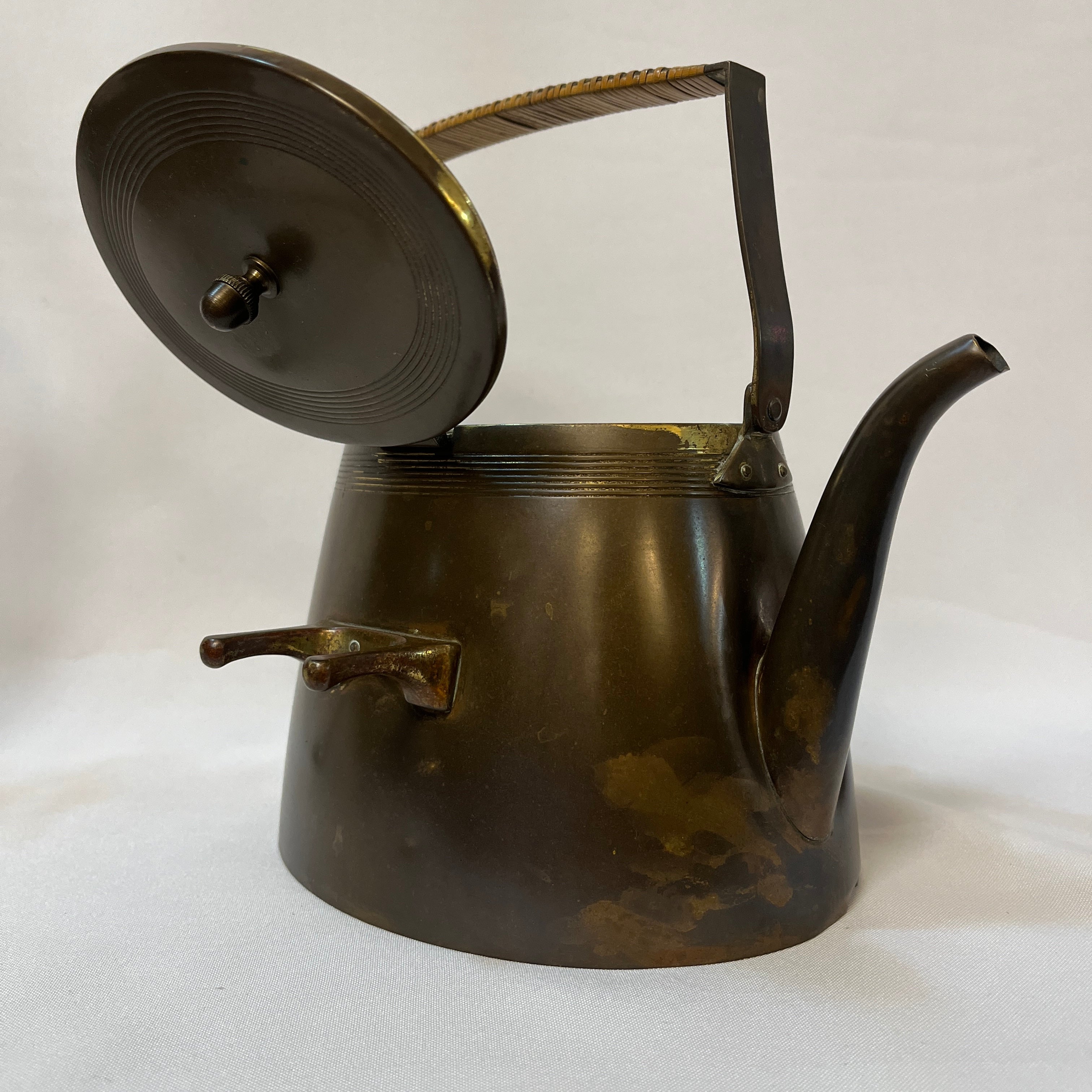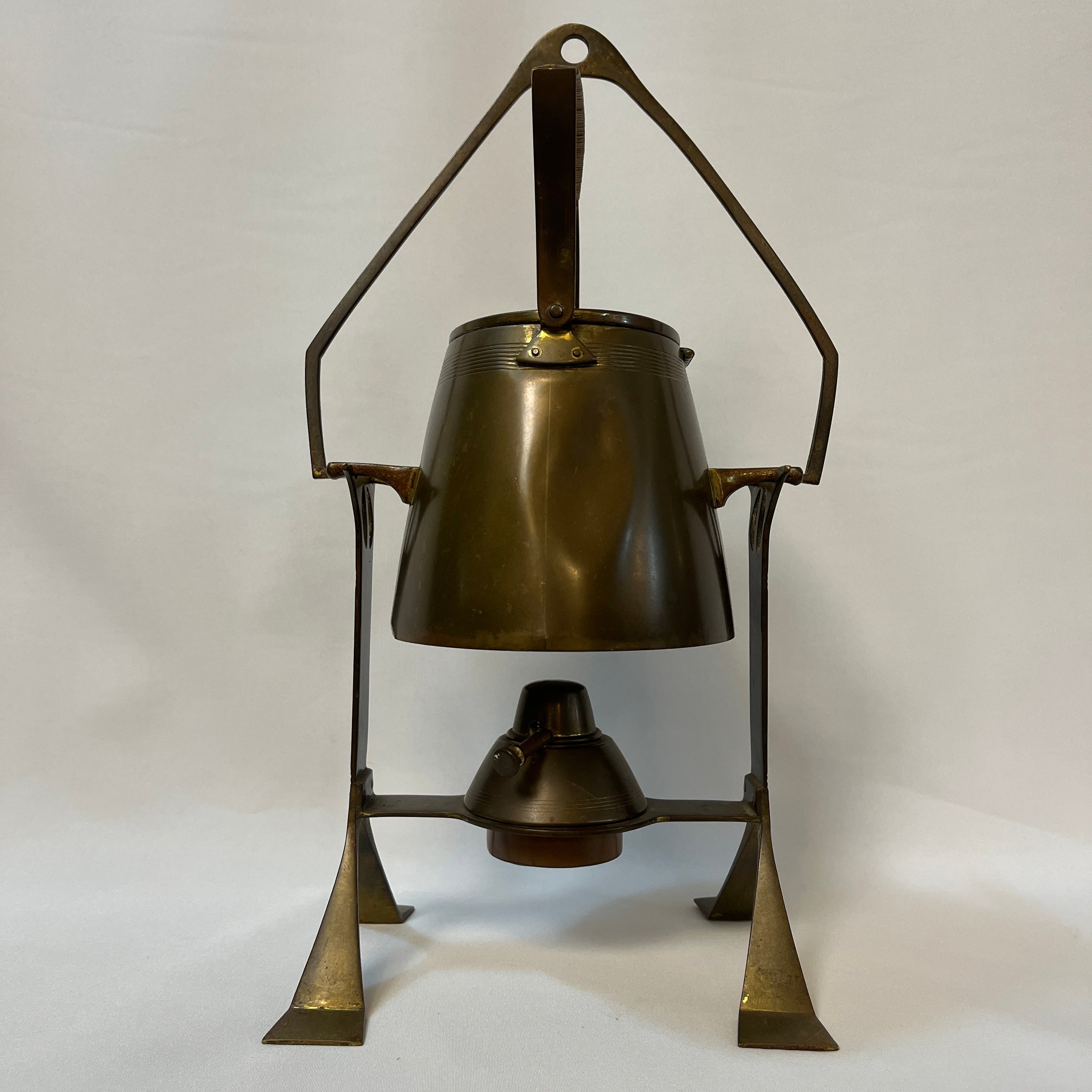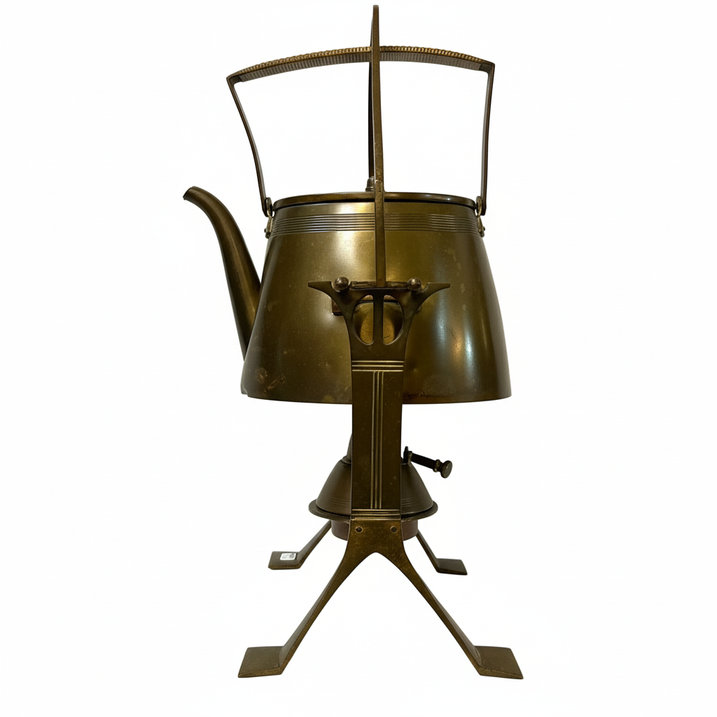 Especial samovar alemán de cobre, de refinado estilo Jugendstil, nombre con el que se conoció el movimiento Art Nouveau en Alemania y Austria. Su diseño combina una estructura geométrica con suaves curvas que aportan elegancia y un carácter distintivo, propio de la estética modernista alemana de comienzos del siglo XX.