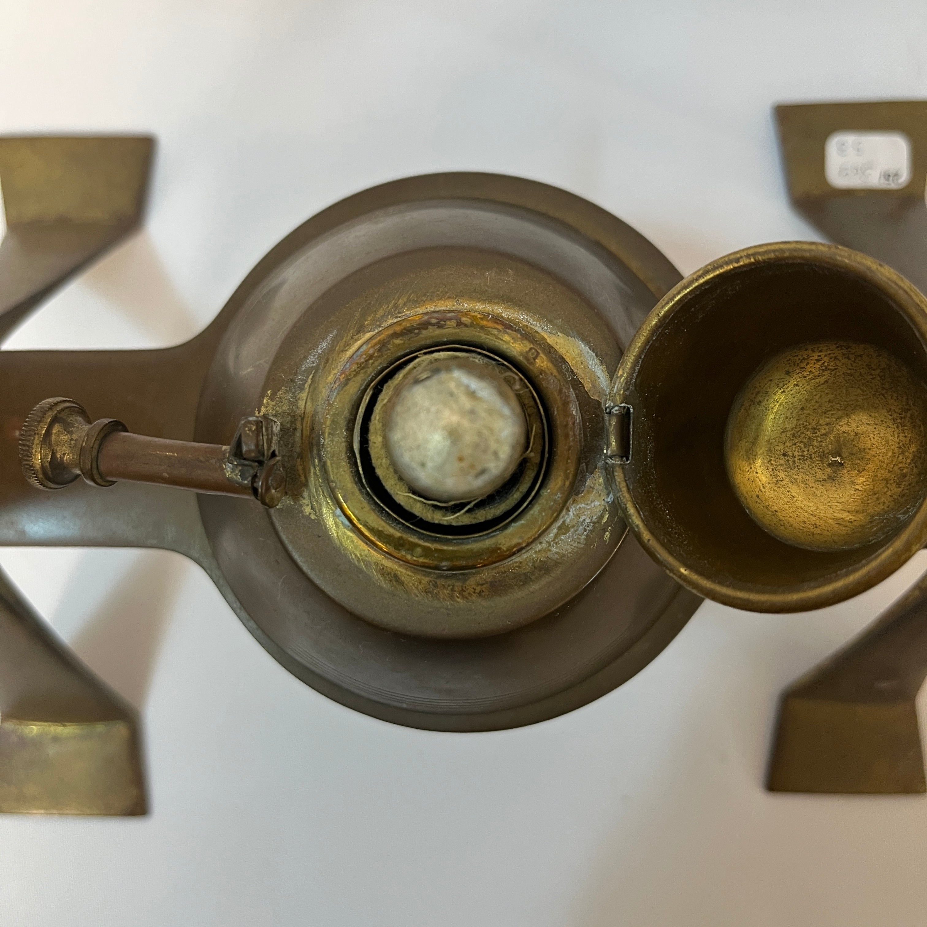 La pieza presenta asa revestida en mimbre, conservando su mecha original. En la parte inferior mantiene sus sellos de fábrica. Alemania, circa 1910.