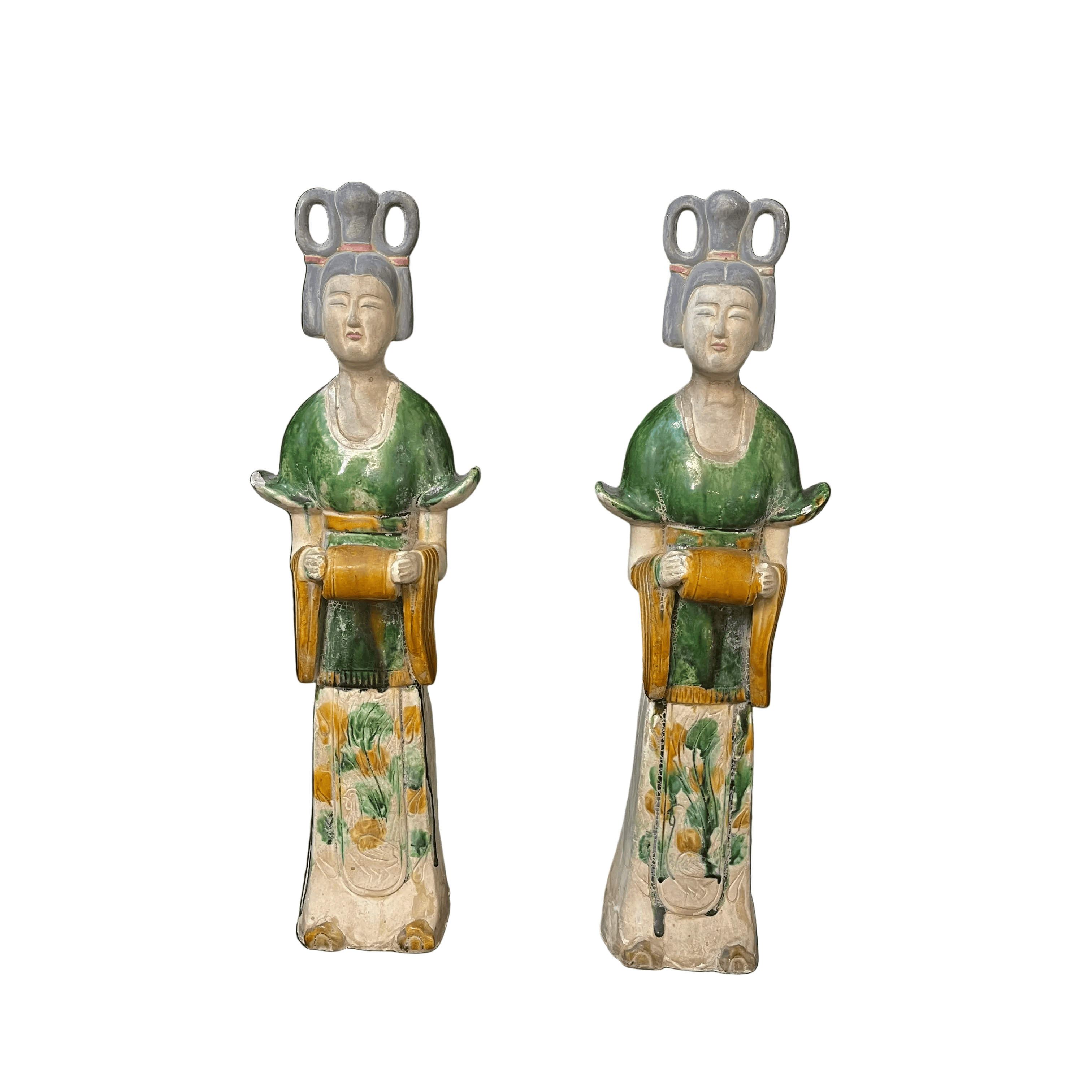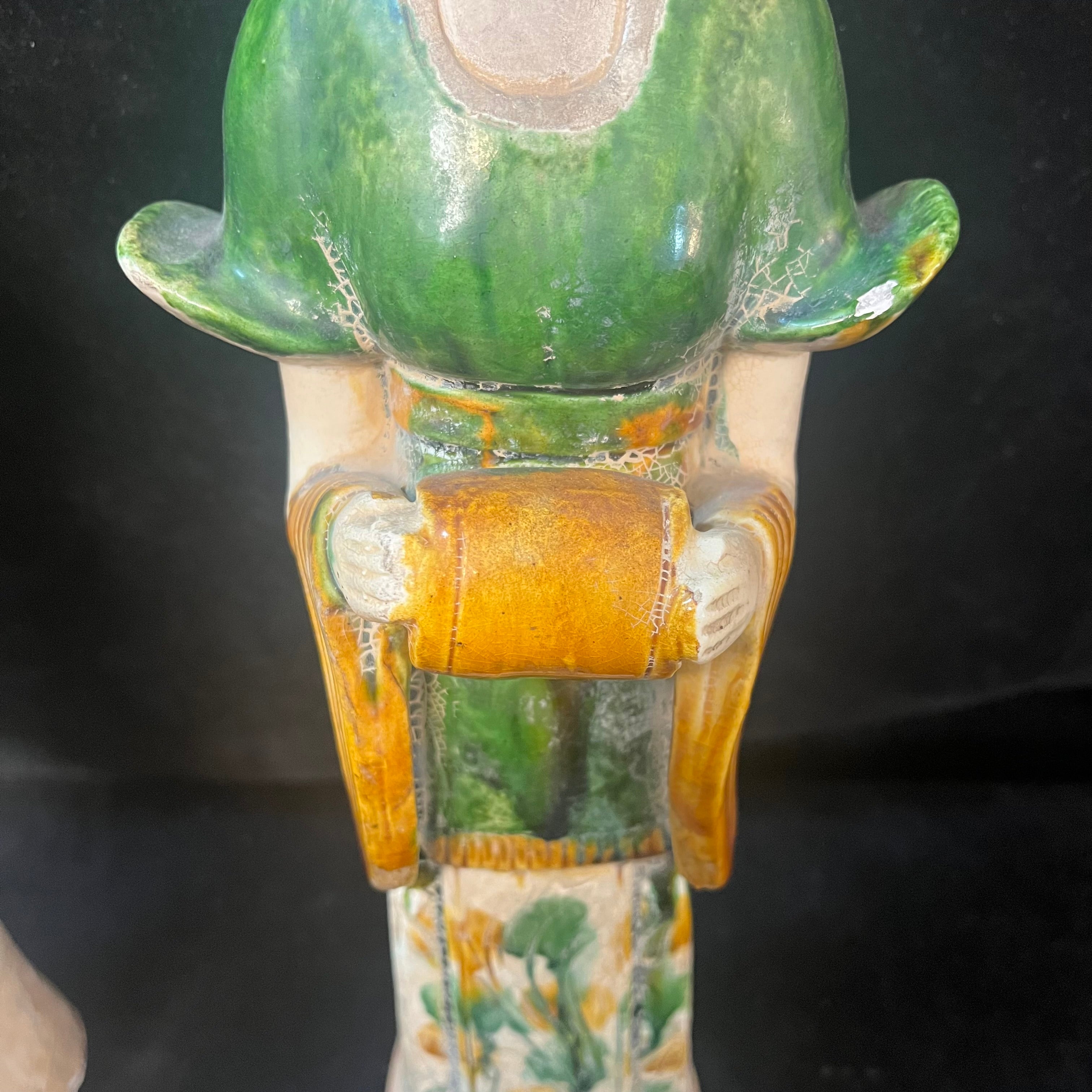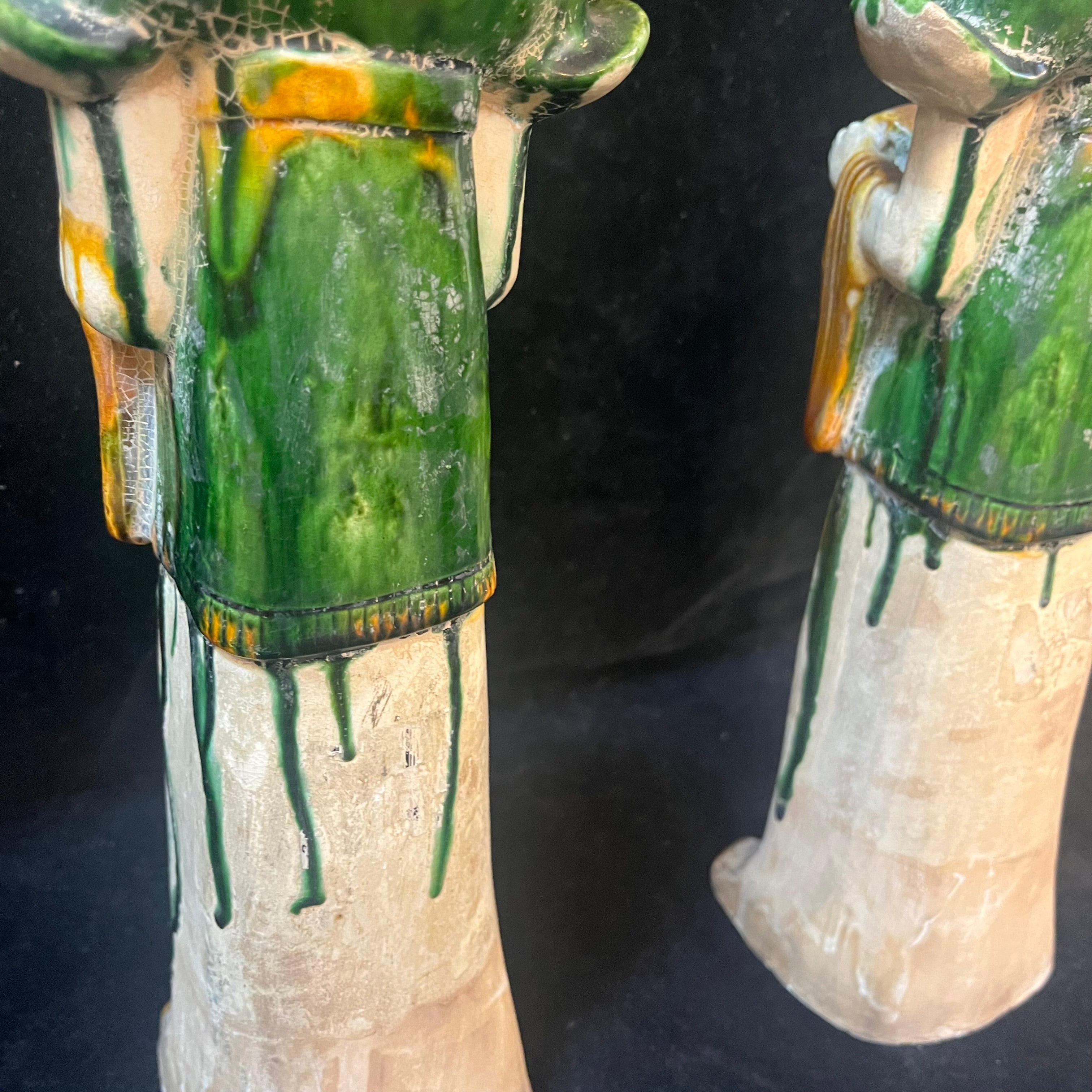 Bellísima pareja de figuras chinas en terracota representando a dos damas de la corte imperial. Las figuras están esmaltadas con goteo a tres colores: verde, ámbar y blanco. Está técnica, llamada Sancai, fue utilizada principalmente durante la dinastía Tang (618-910 d.C). Estas piezas, de fabricación posiblemente contemporánea de principios del siglo XX, buscan recuperar la técnica detrás de este tradicional objeto, utilizado en ritos fúnebres para acompañar al fallecido en su entierro.