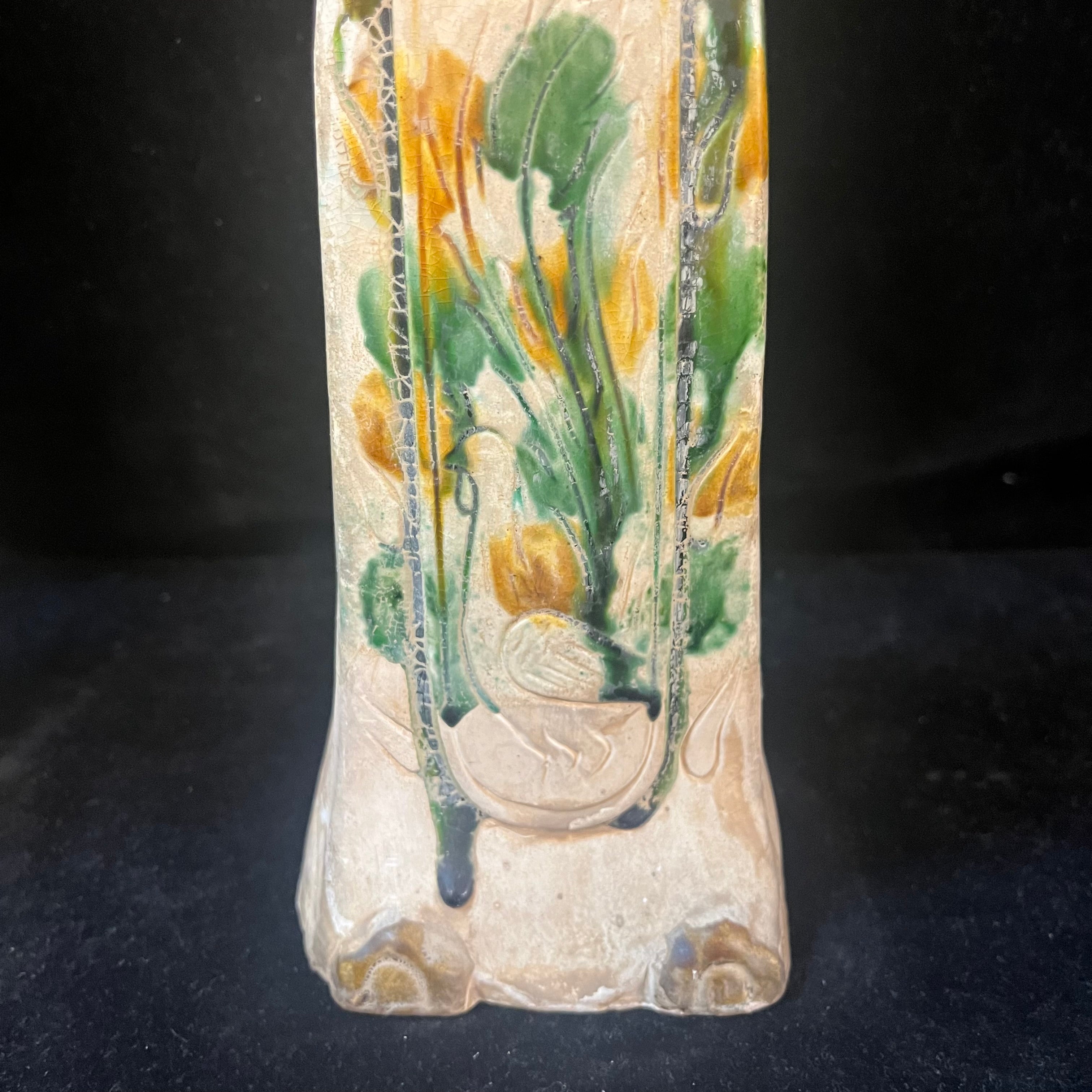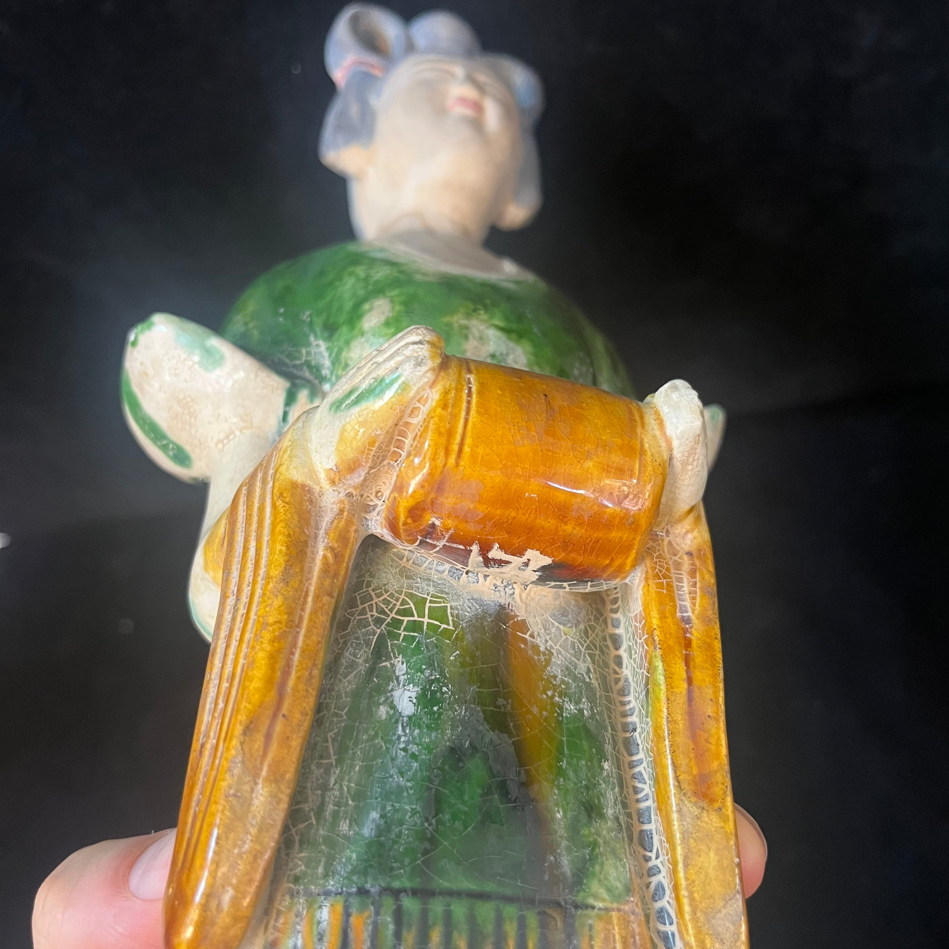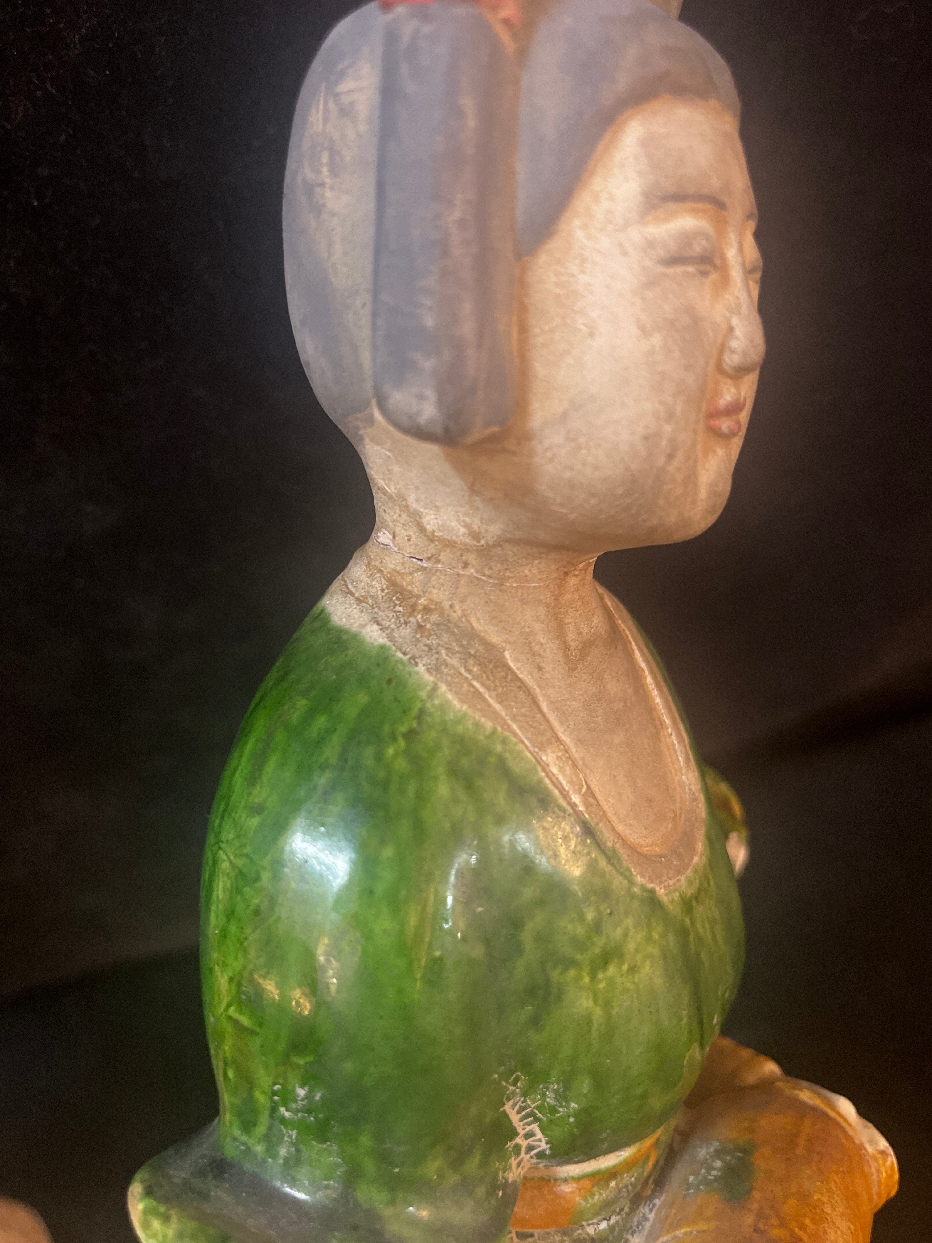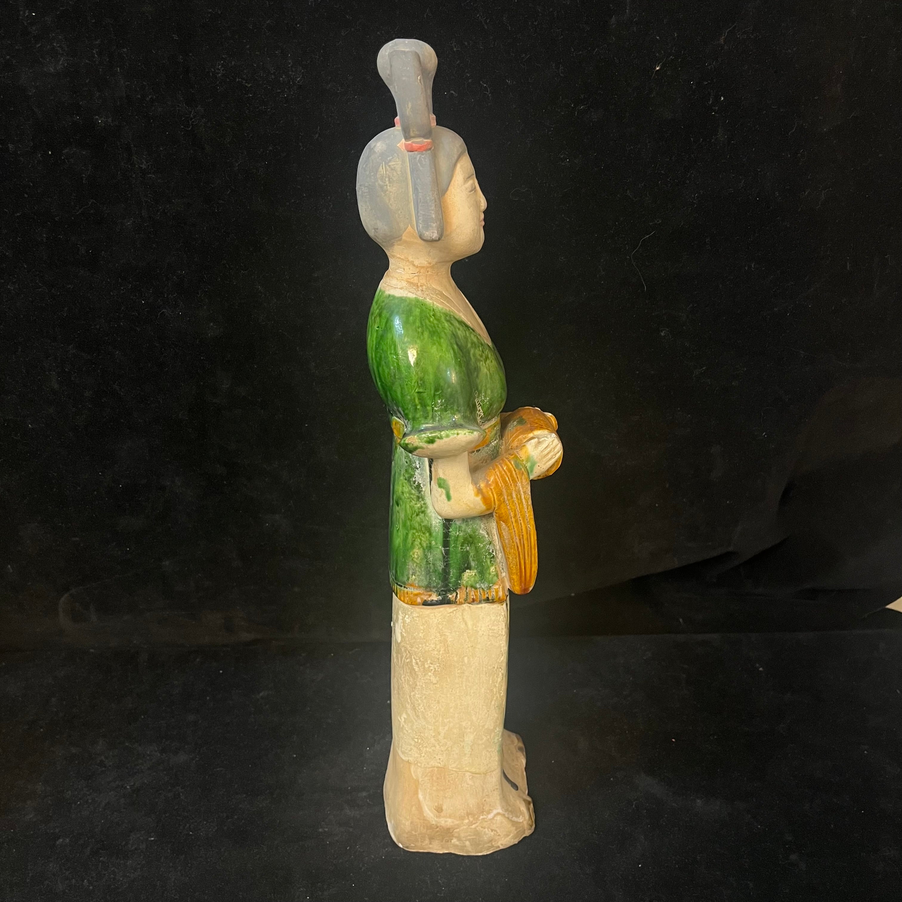Bellísima pareja de figuras chinas en terracota representando a dos damas de la corte imperial. Las figuras están esmaltadas con goteo a tres colores: verde, ámbar y blanco. Está técnica, llamada Sancai, fue utilizada principalmente durante la dinastía Tang (618-910 d.C). Estas piezas, de fabricación posiblemente contemporánea de principios del siglo XX, buscan recuperar la técnica detrás de este tradicional objeto, utilizado en ritos fúnebres para acompañar al fallecido en su entierro.