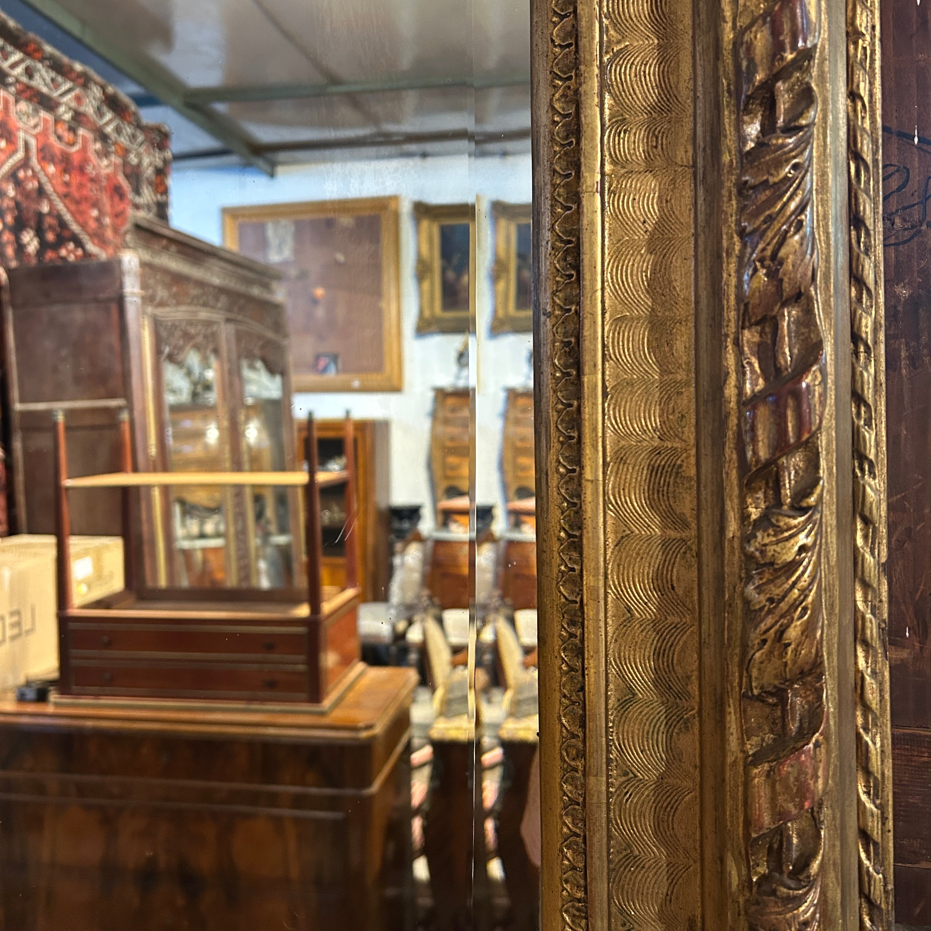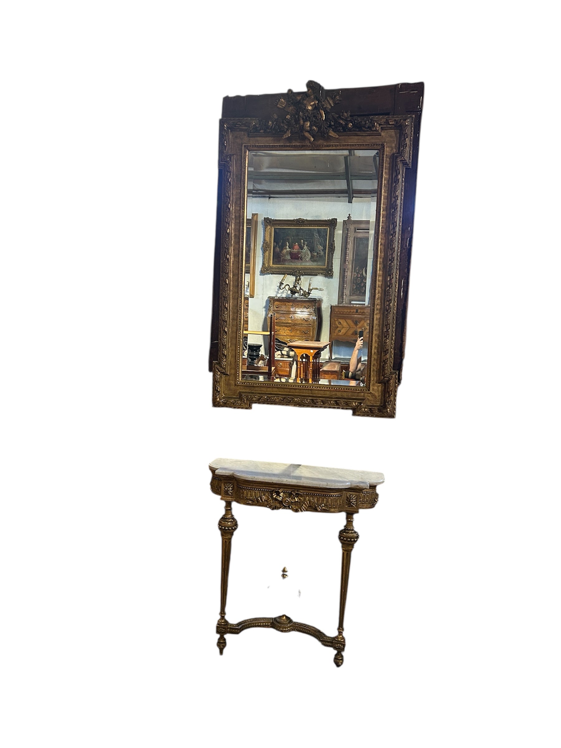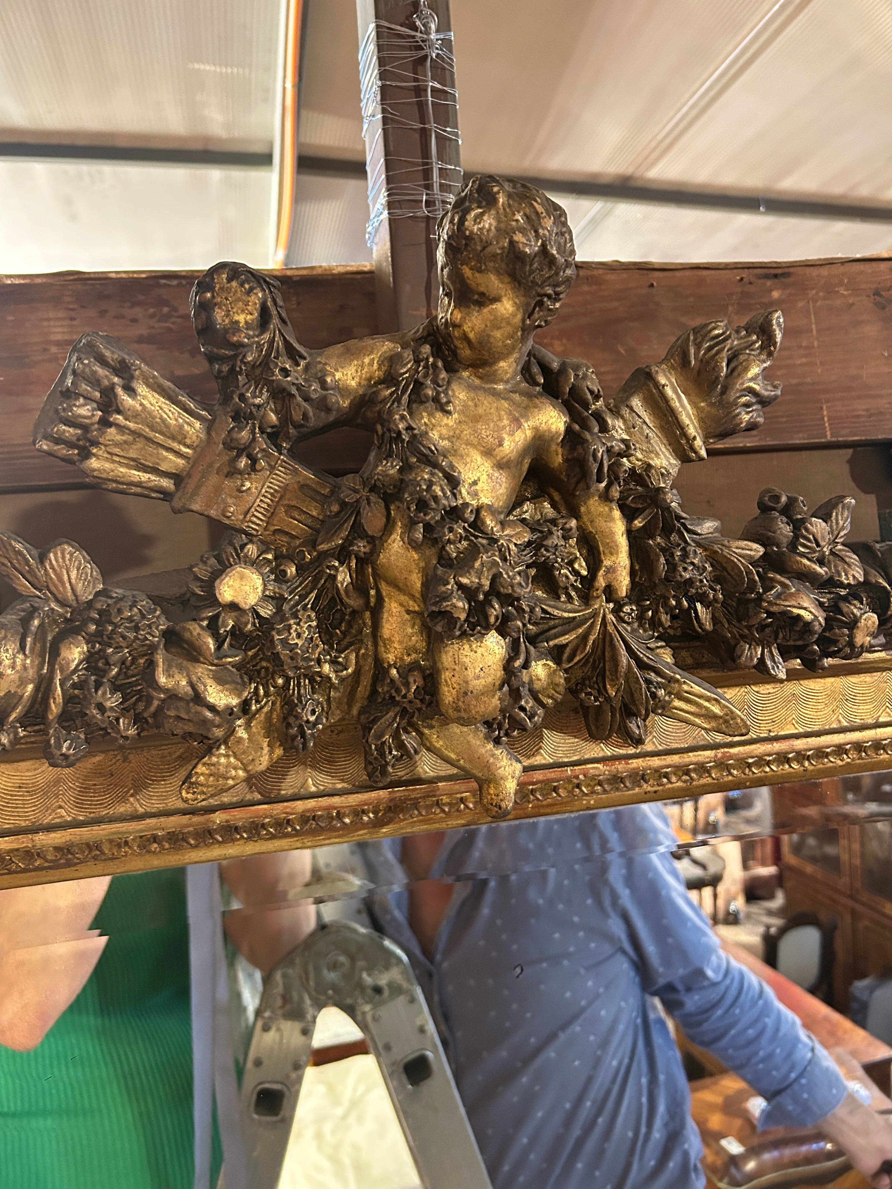 El espejo estilo Luis XVI, con finos tallados en madera. Tiene bellas olas talladas en relieve en su arco interior. Es un espejo original con doble vicelado, de 3cm y 3mm, en forma rectangular y con una imponente coronación con un ángel cupido tallado de 30cm de alto 50cm en la parte superior del espejo.
