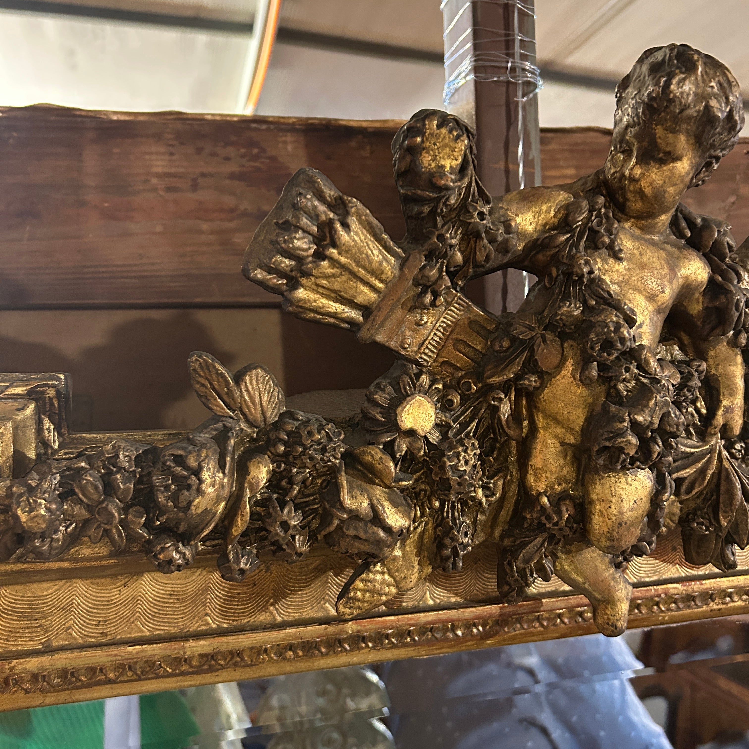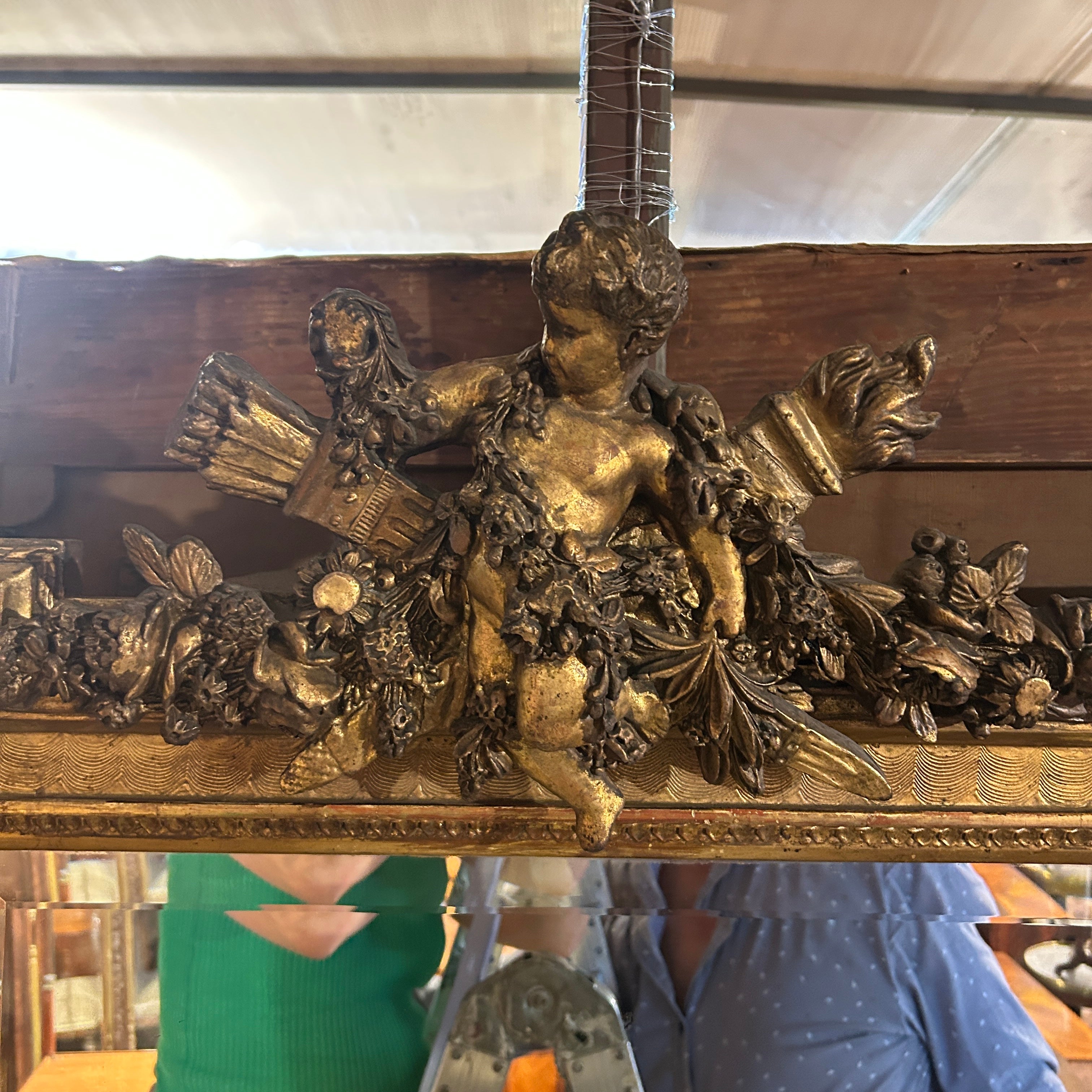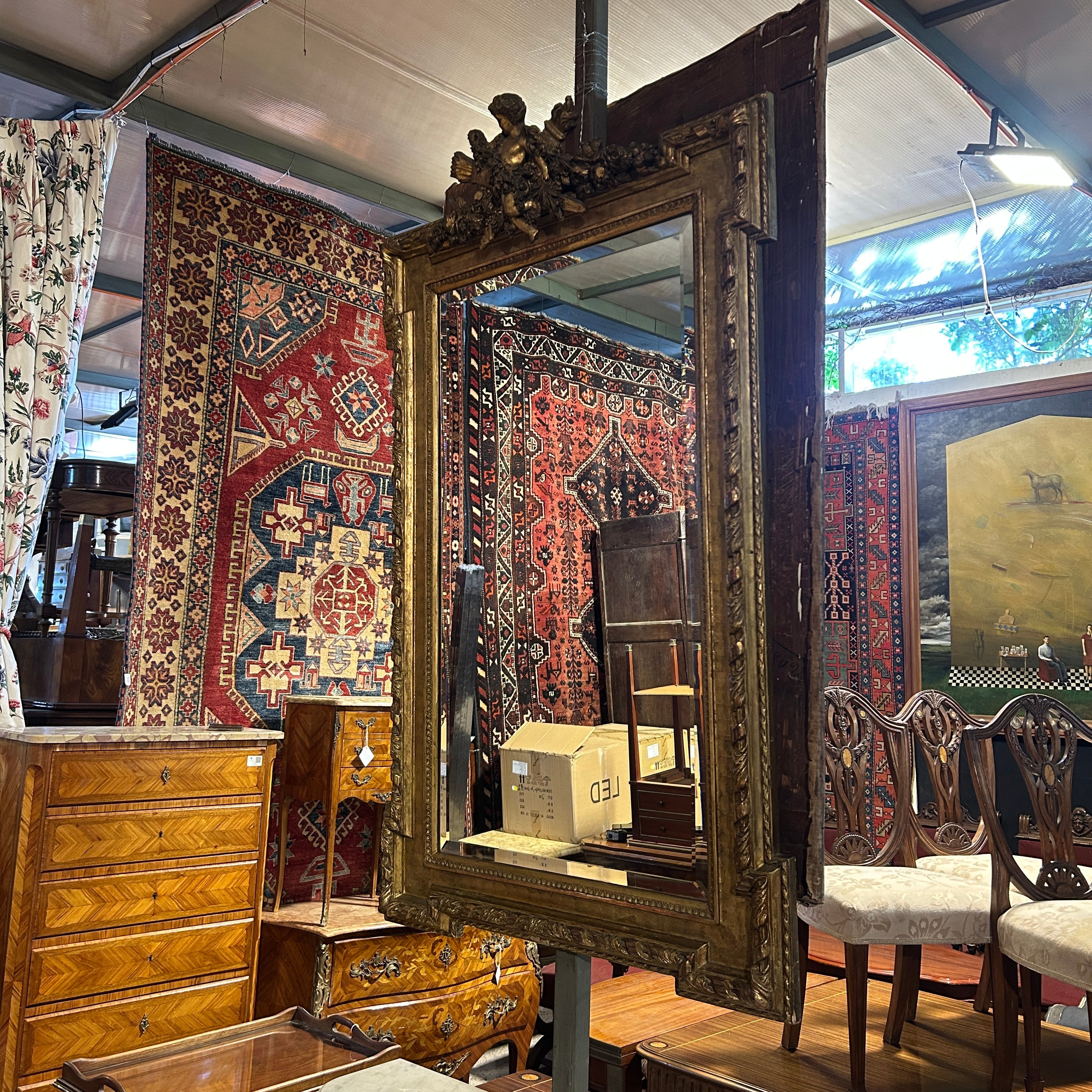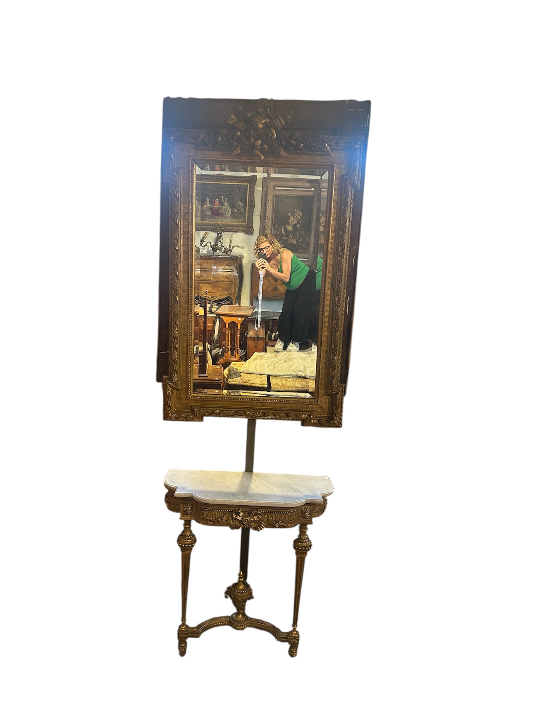 El espejo estilo Luis XVI, con finos tallados en madera. Tiene bellas olas talladas en relieve en su arco interior. Es un espejo original con doble vicelado, de 3cm y 3mm, en forma rectangular y con una imponente coronación con un ángel cupido tallado de 30cm de alto 50cm en la parte superior del espejo.