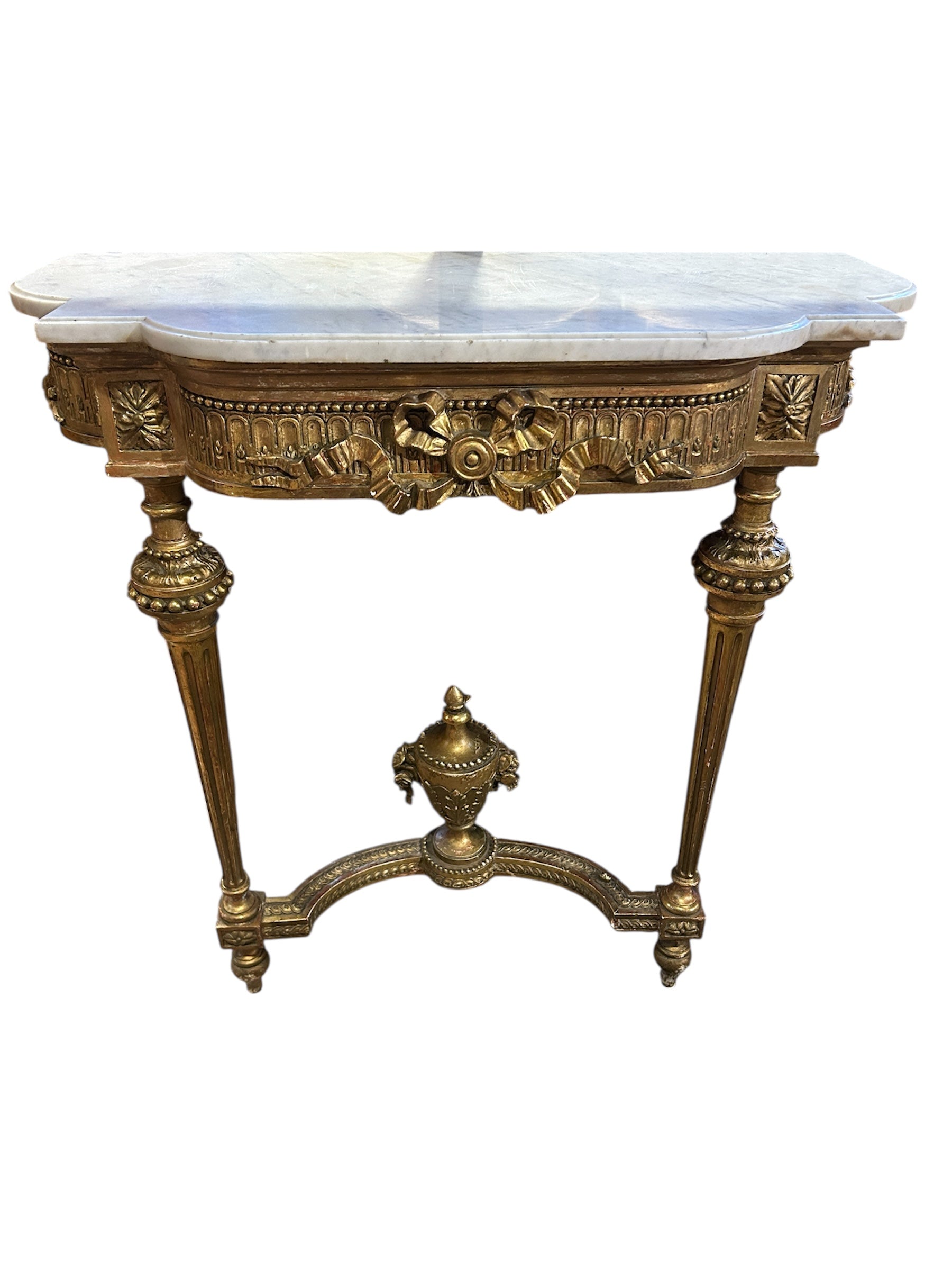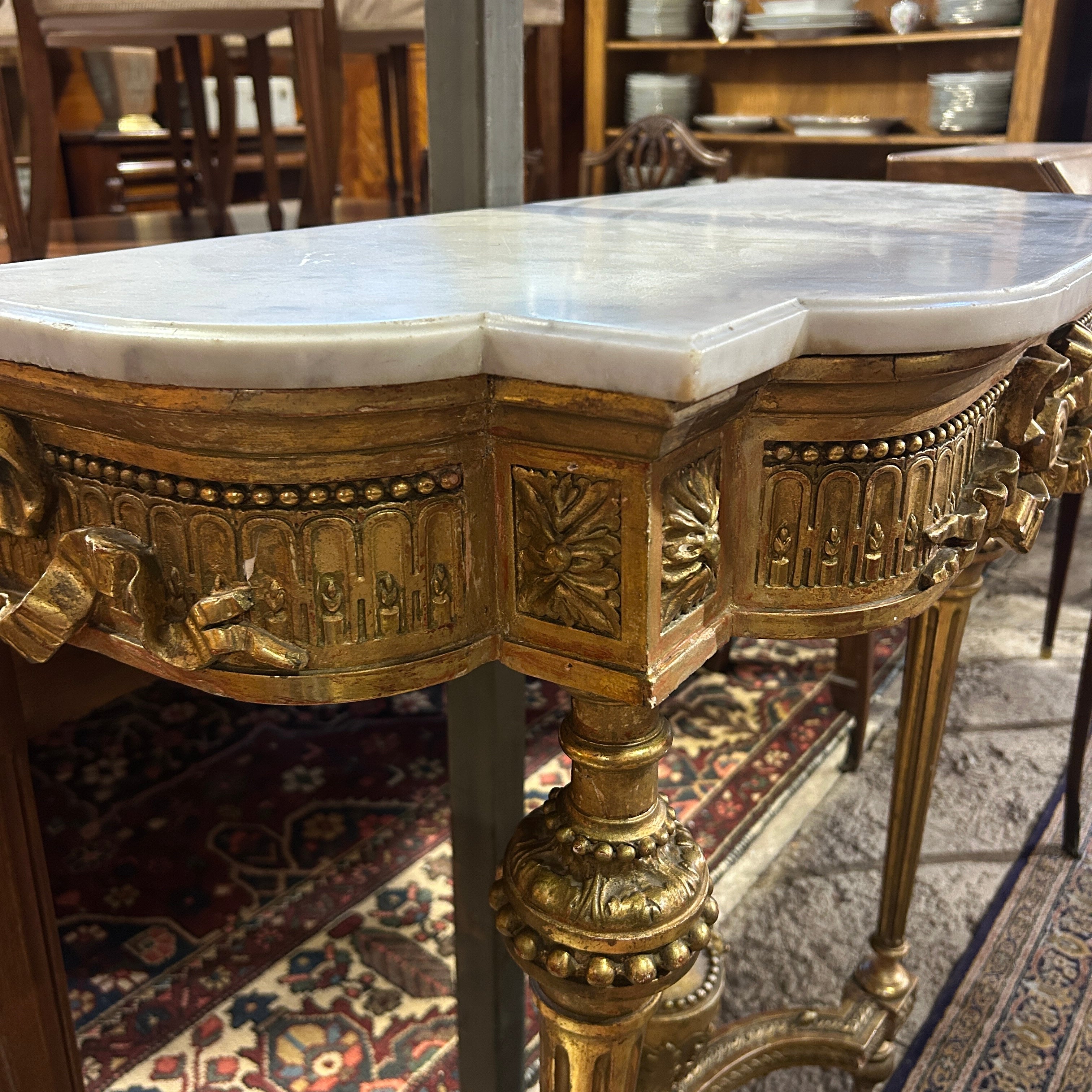El arrimo tiene hermosos tallados en madera, todo en dorados a fuego. Tiene extraordinarios movimientos con cordones perlé, imponentes cintillos en los tres costados y un sin fin de detallitos, en su cubierta un mármol original blanco.