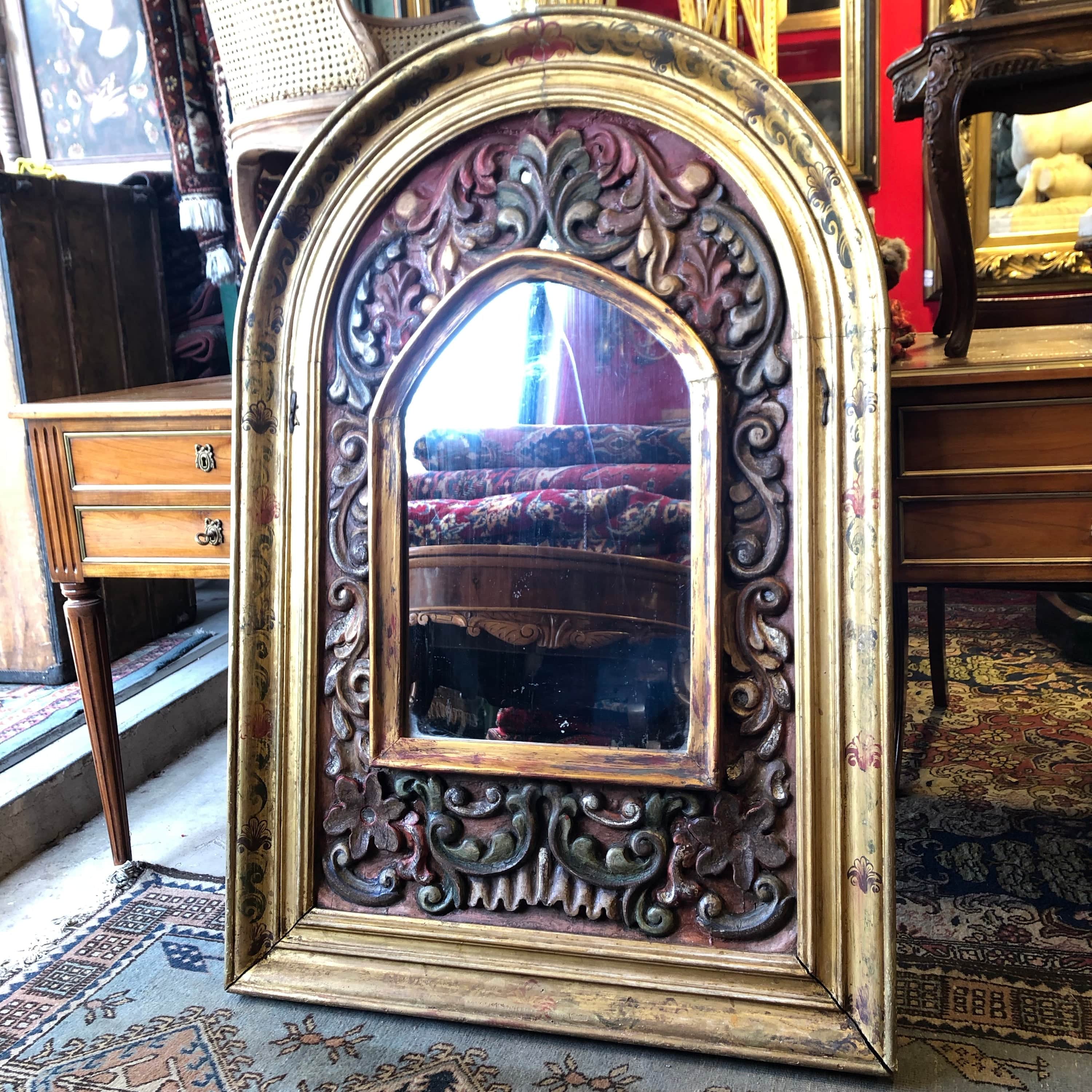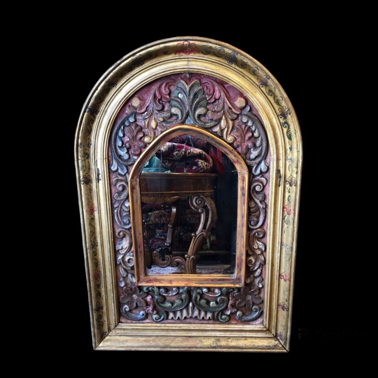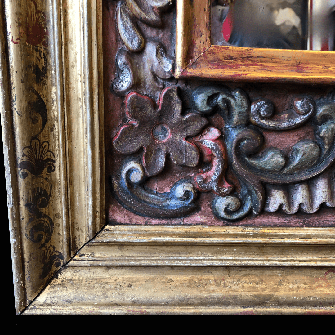 Bello espejo hecho totalmente a mano, con marco tallado en madera policromada y dorada de gran tamaño. Está en su estado de origen.