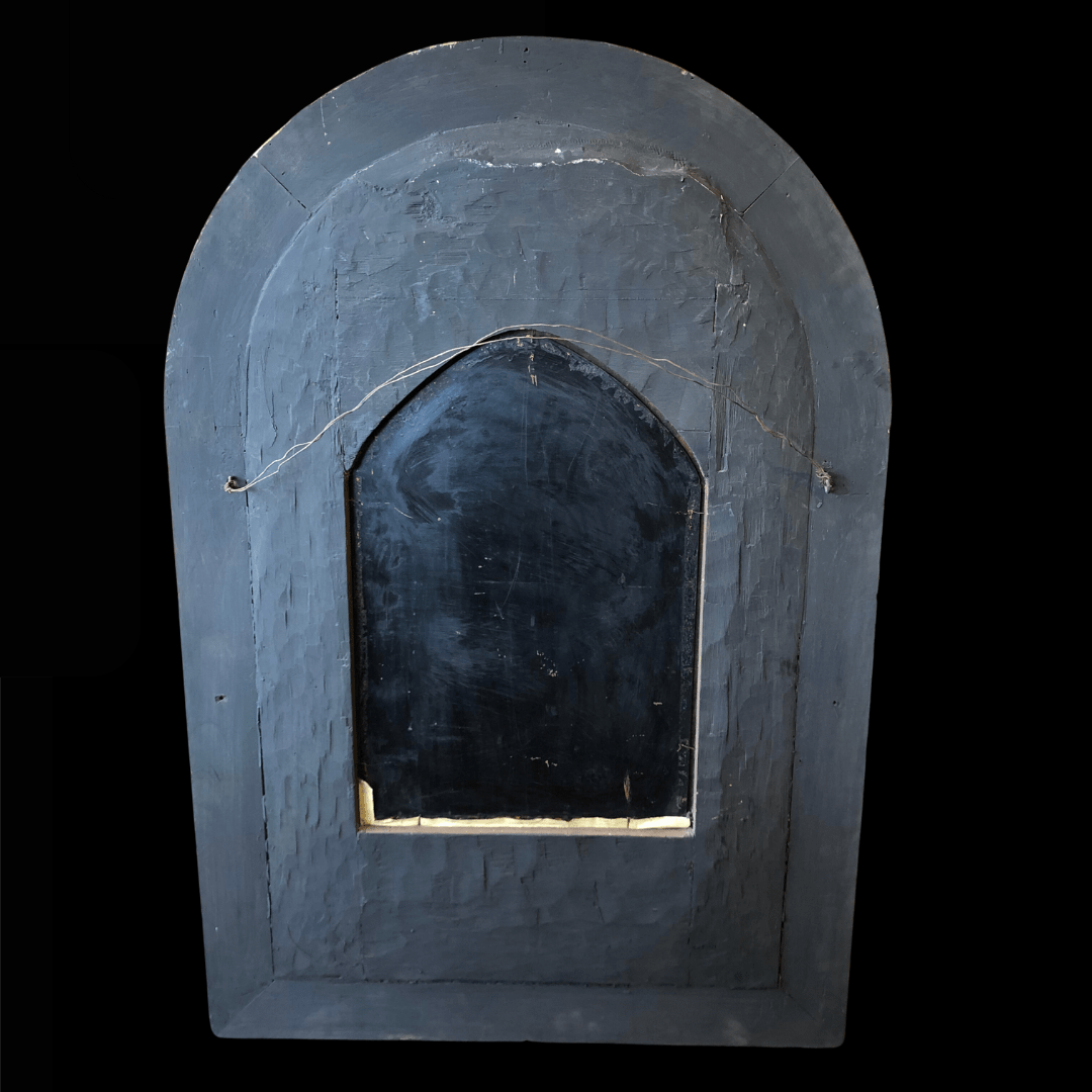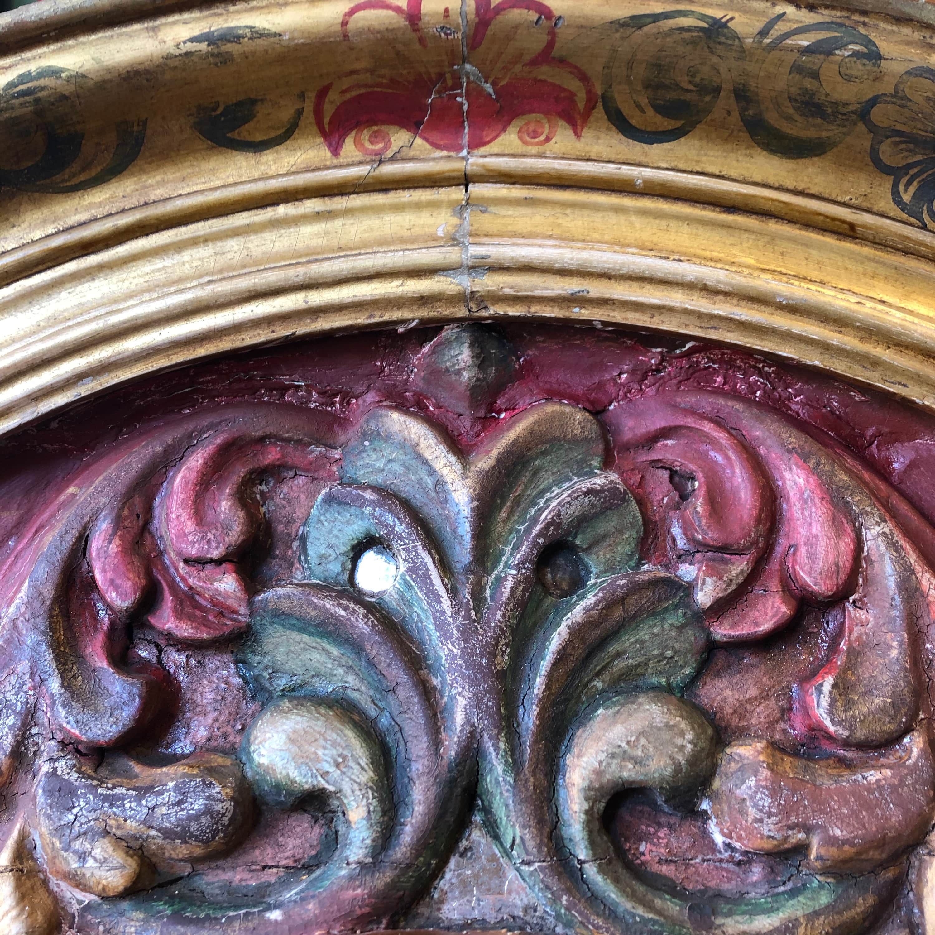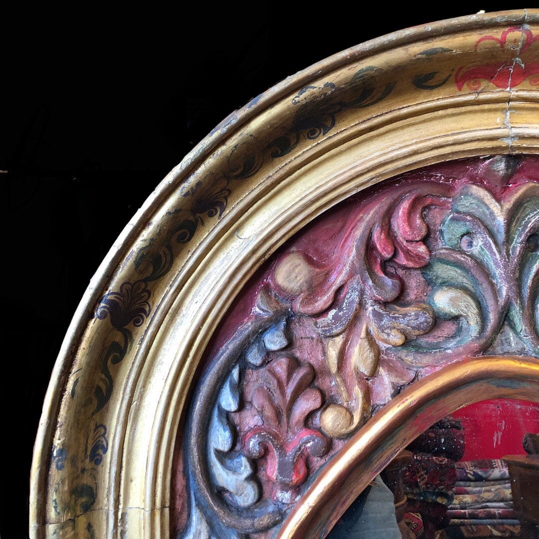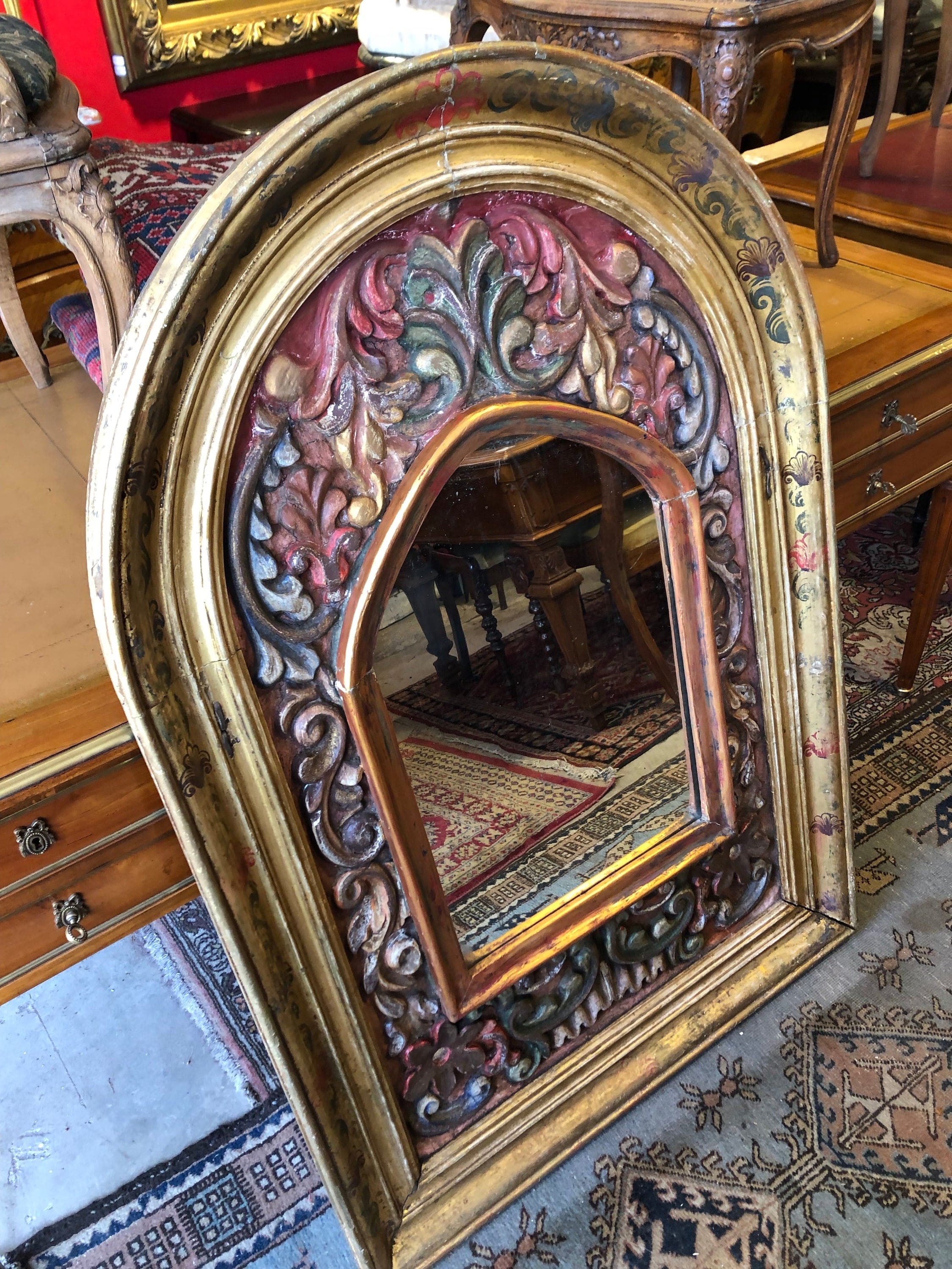 Bello espejo hecho totalmente a mano, con marco tallado en madera policromada y dorada de gran tamaño. Está en su estado de origen.