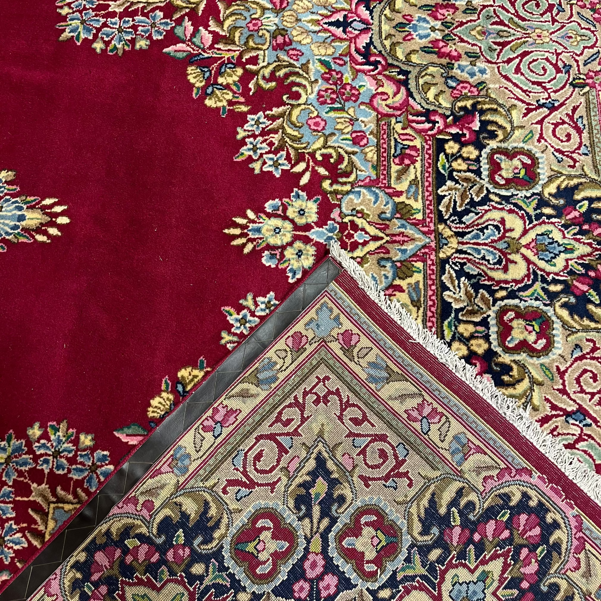 Maravillosa alfombra persa de Kirman de lana y seda de mediados del siglo XX. Hecha a mano, presenta hermosos detalles florales y patrones geométricos en llamativos tonos rojizos, azules y rosas que realzan su diseño gracias al contraste que genera. Se encuentra en perfecto estado.