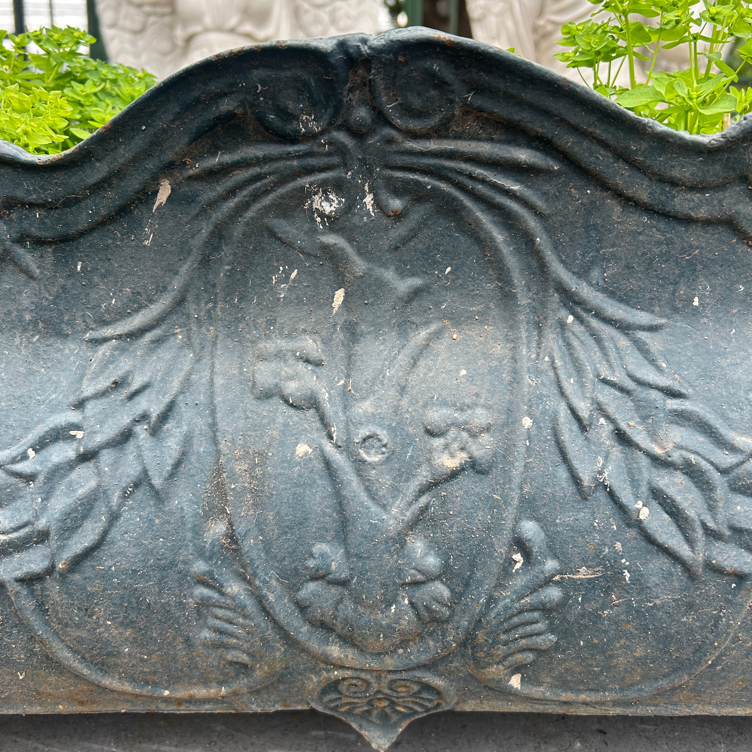 Hermosa jardinera o maceta decorativa rectangular de fierro fundido para exterior o interior. Tiene un bello diseño en relieve con detalles florales y hojas. Francia, 1920s.