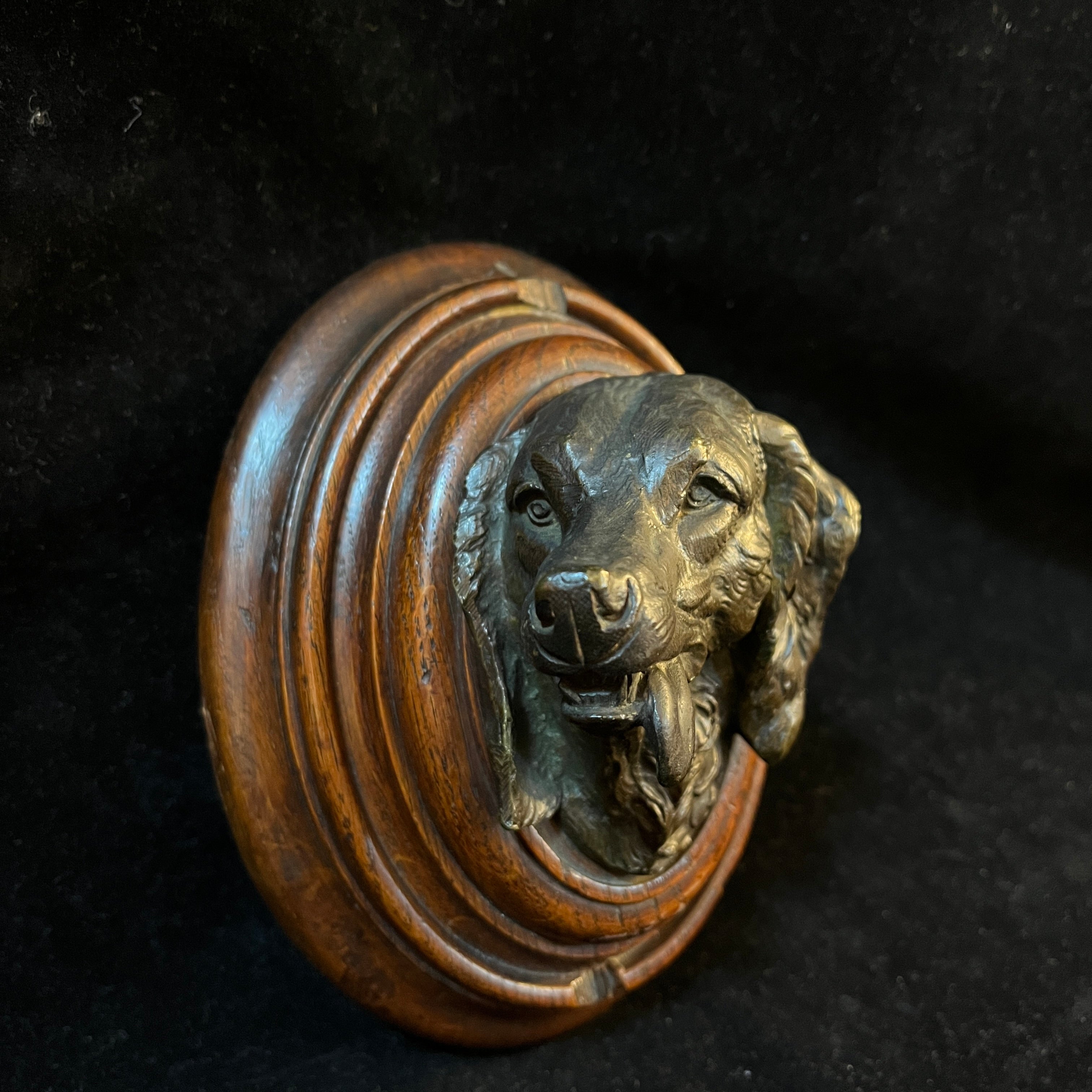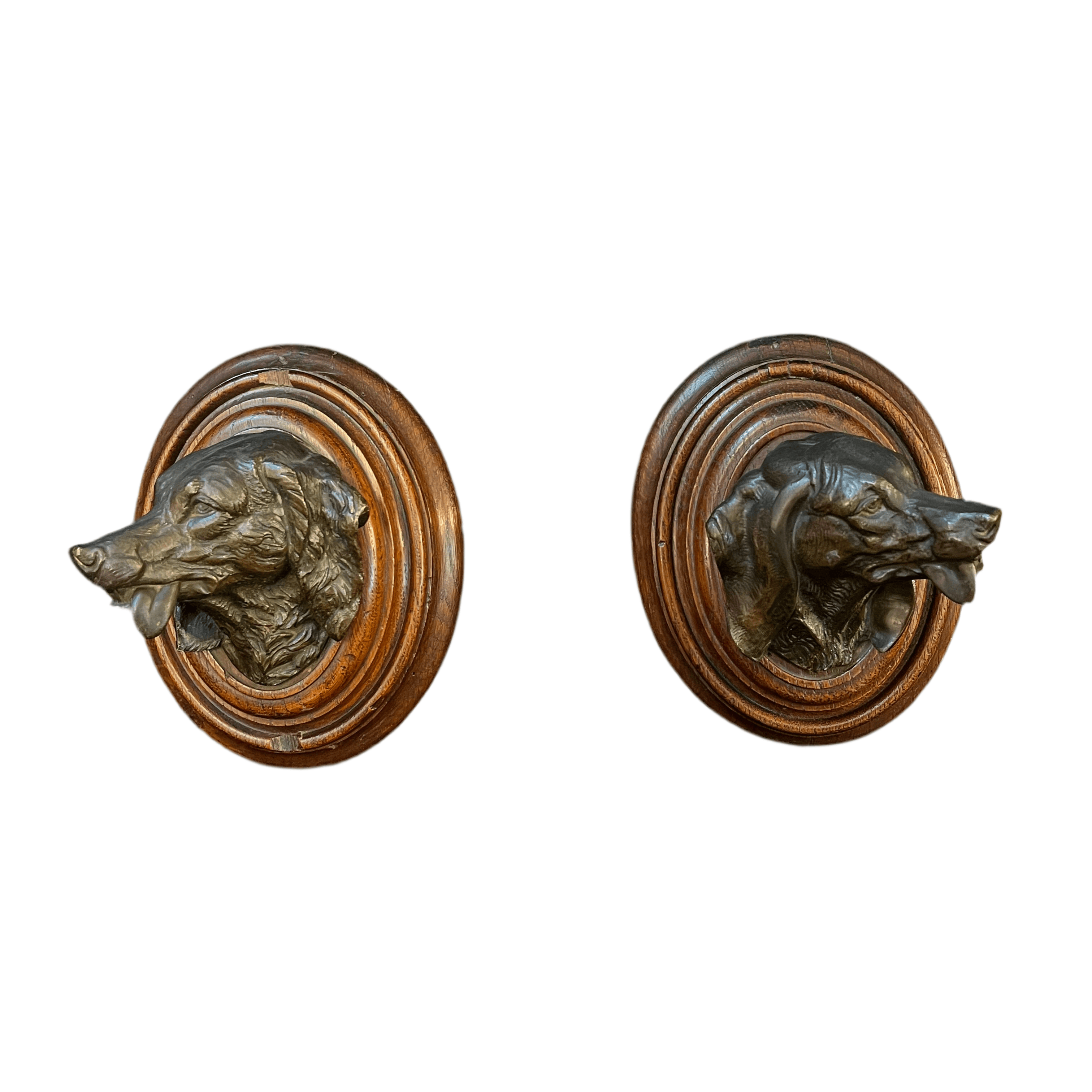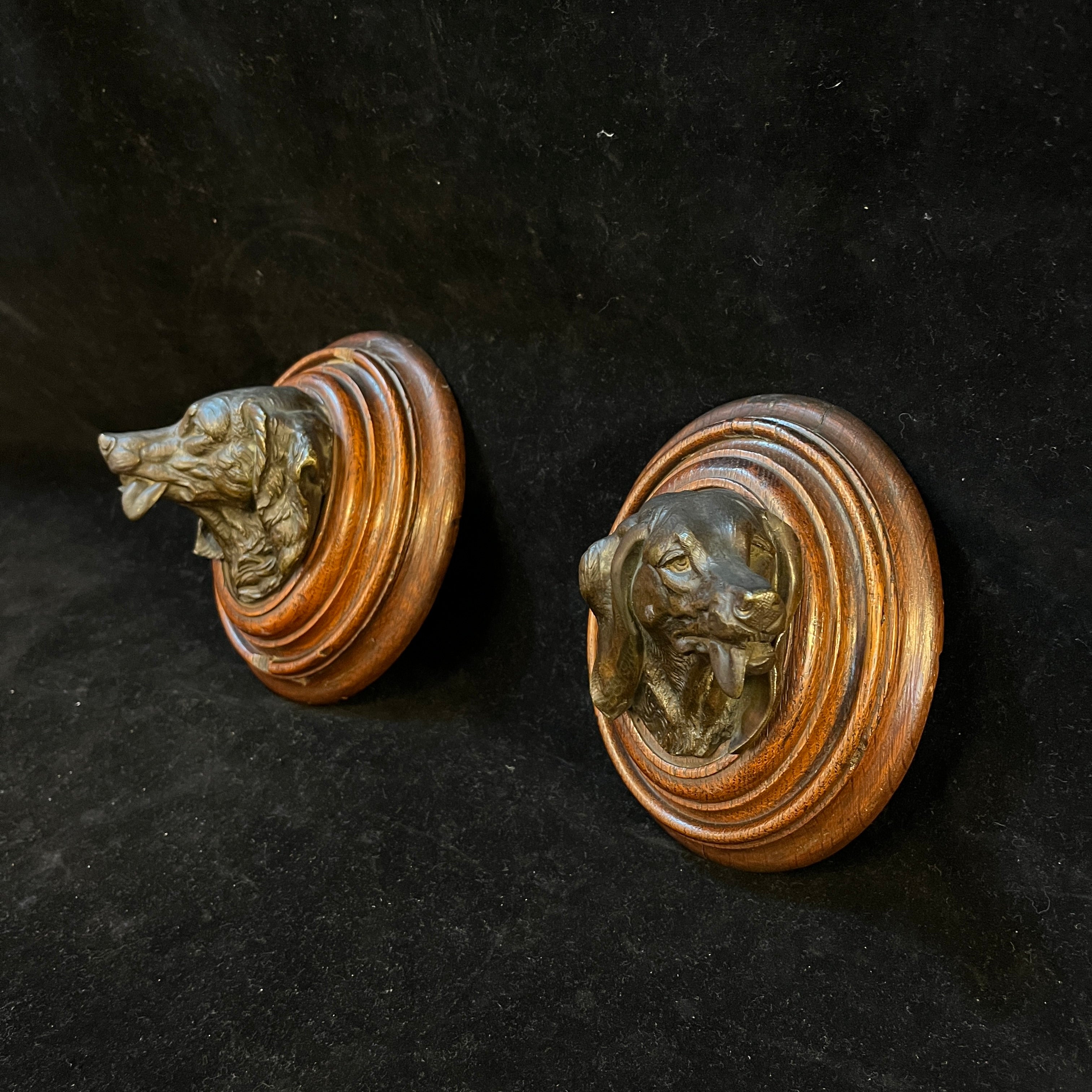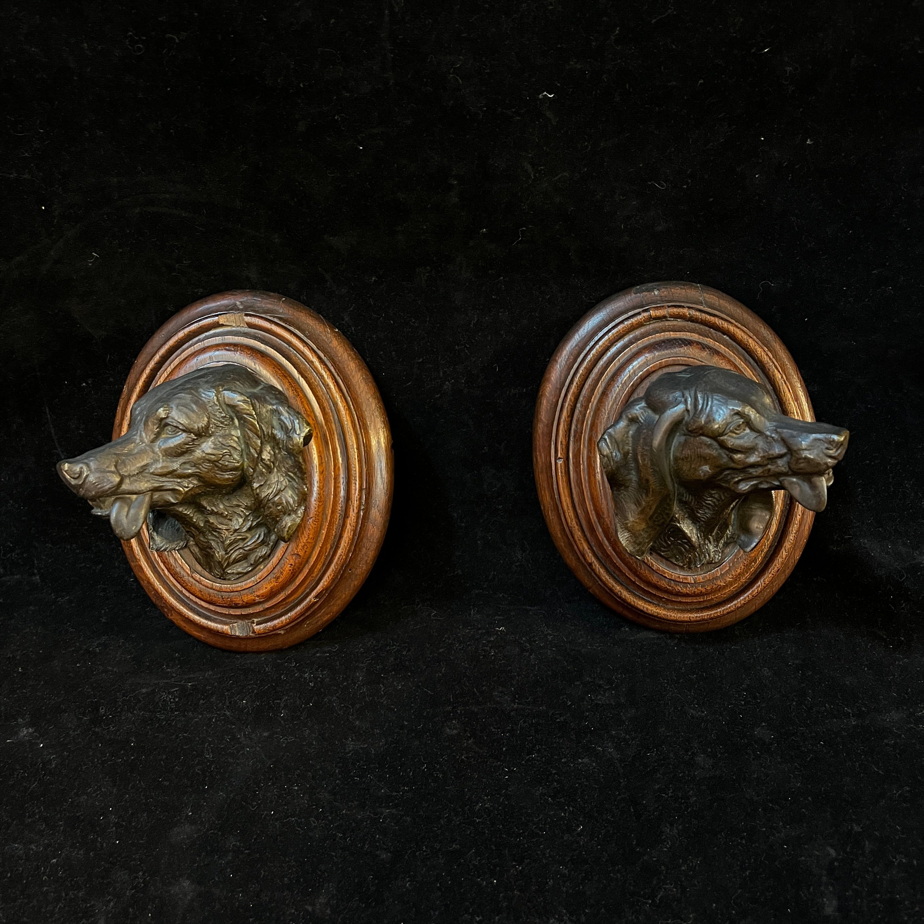 Hermosos par de medallones de caza en bronce ingleses. Representan la cabeza de un perro, con cuidadosos detalles que se posan sobre una base de roble.