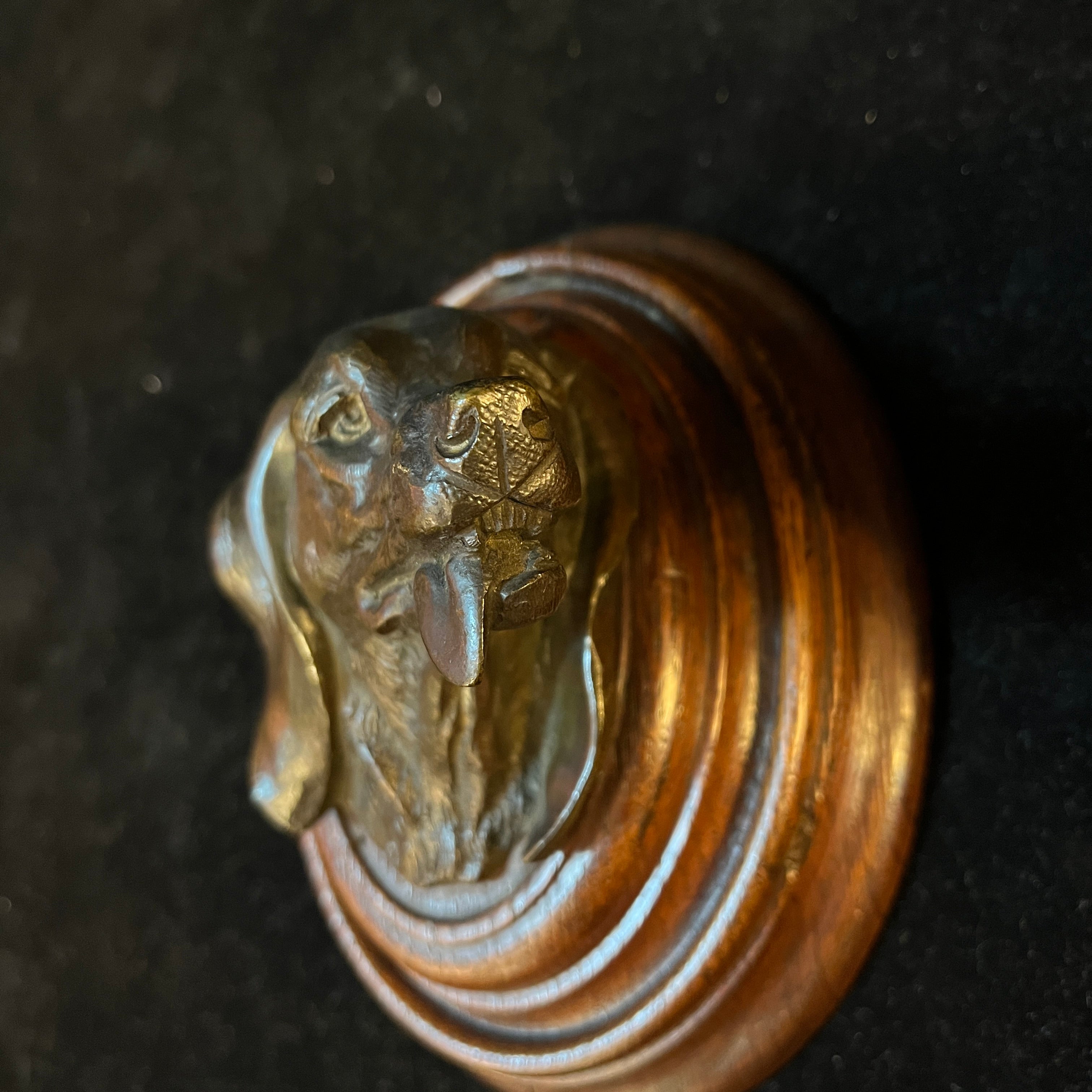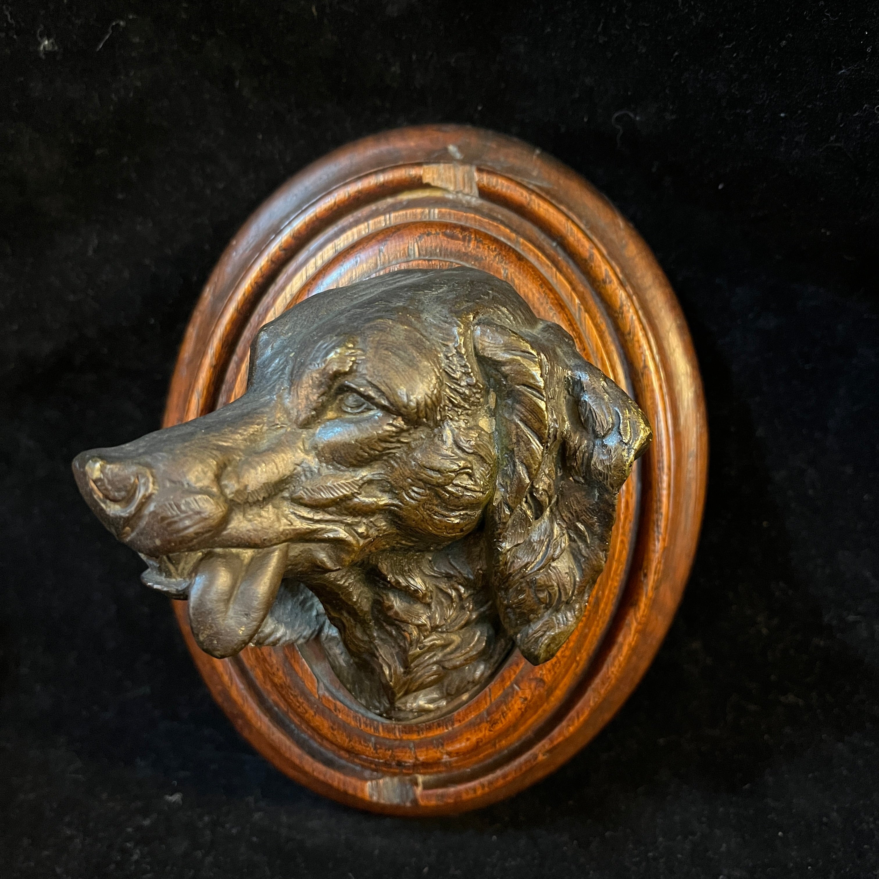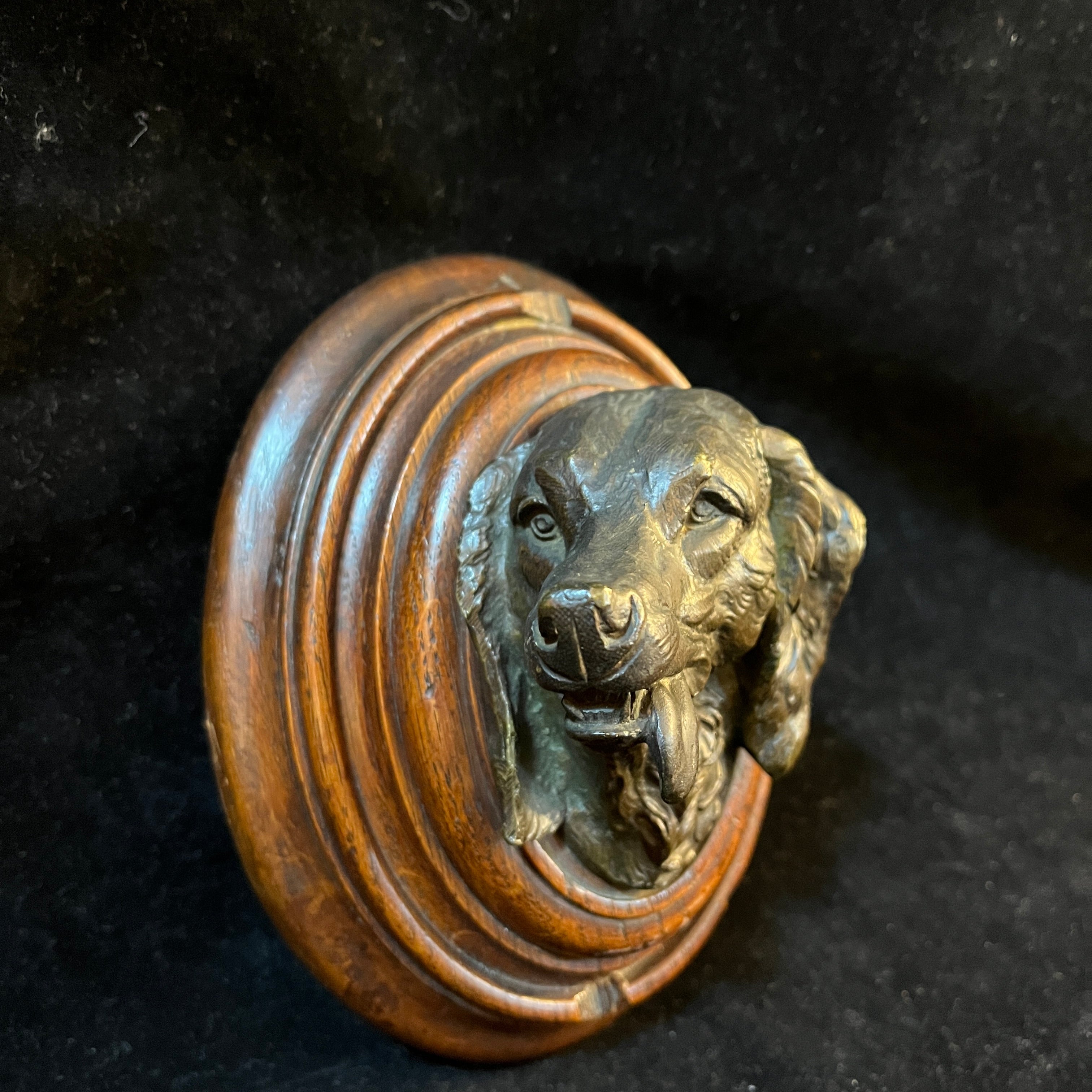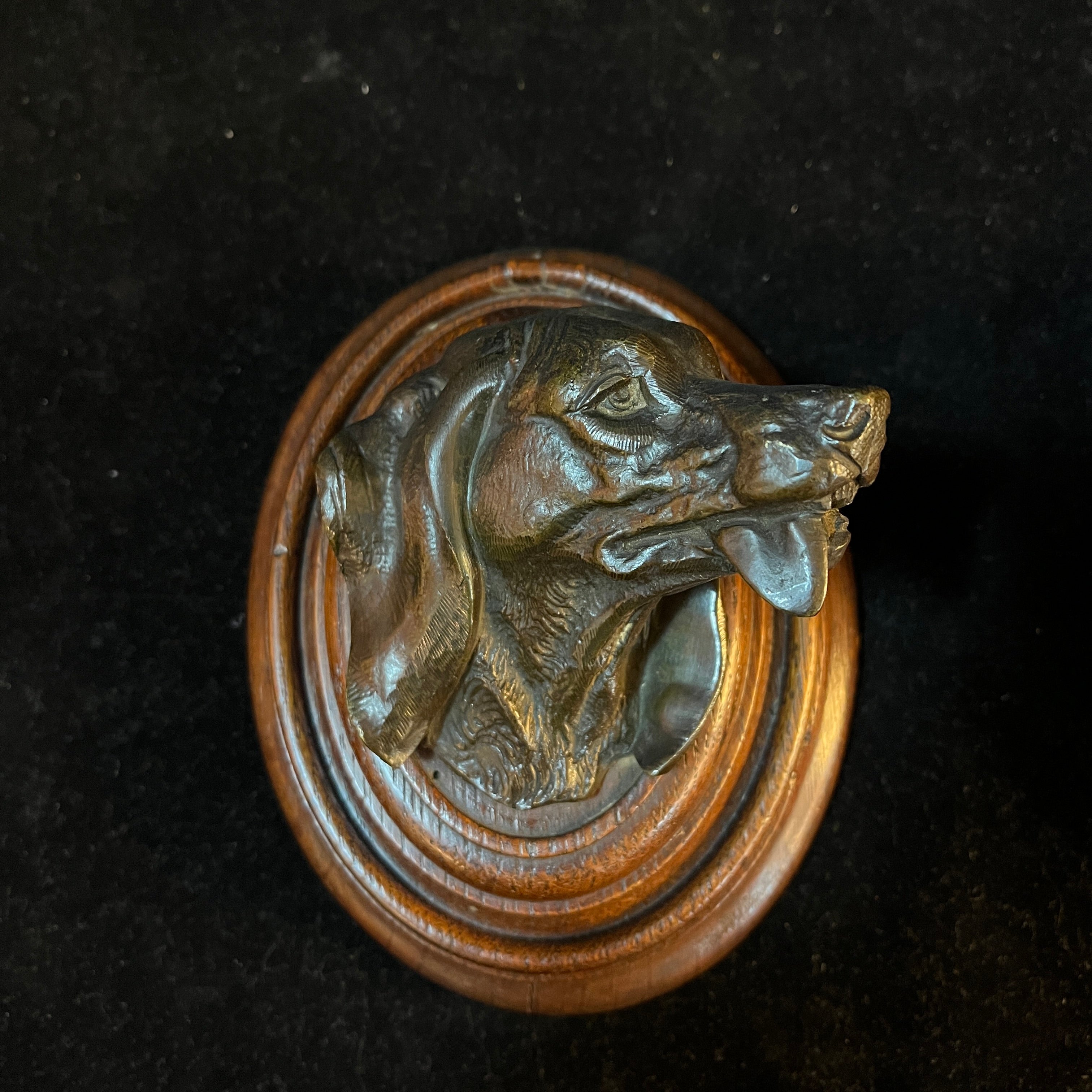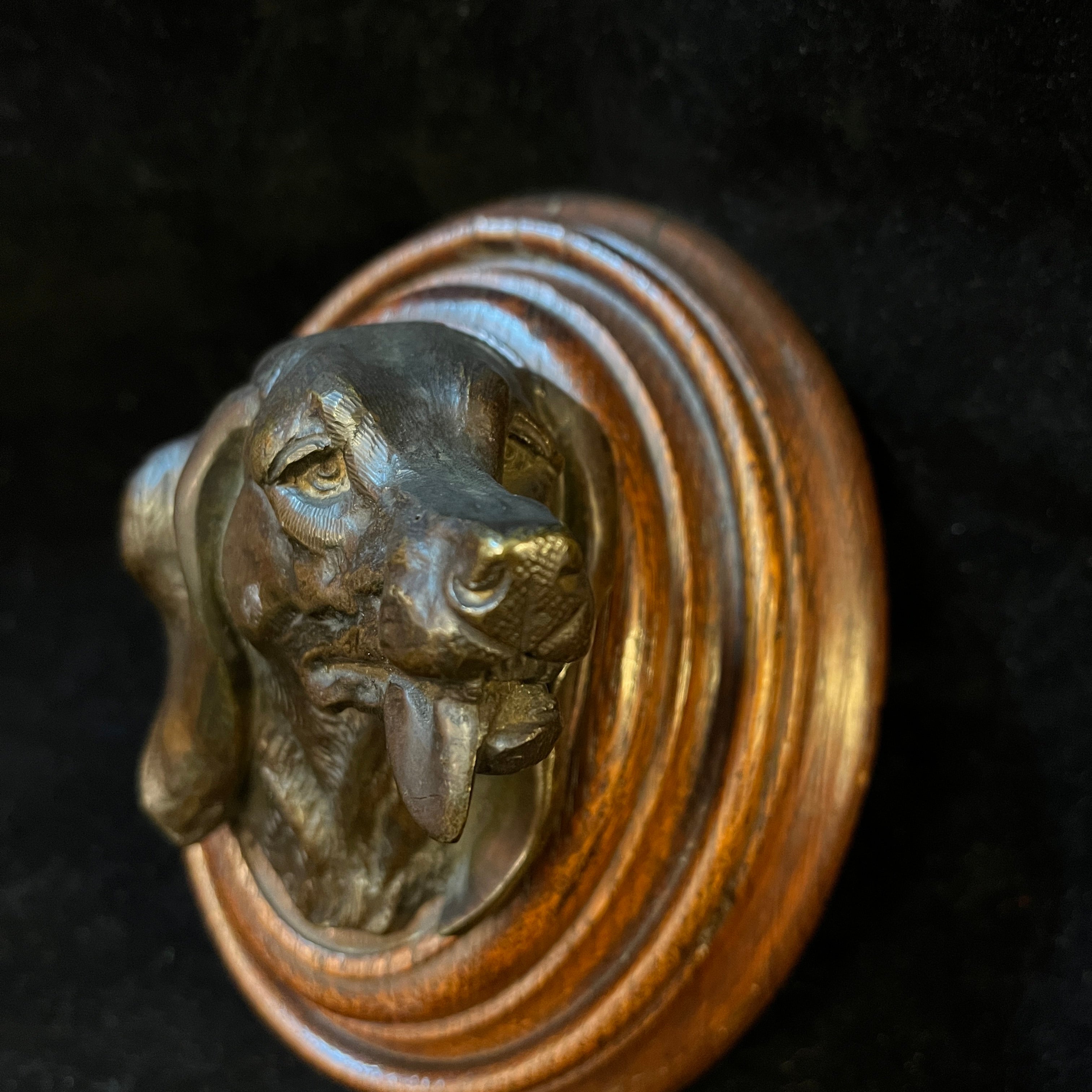 Hermosos par de medallones de caza en bronce ingleses. Representan la cabeza de un perro, con cuidadosos detalles que se posan sobre una base de roble.