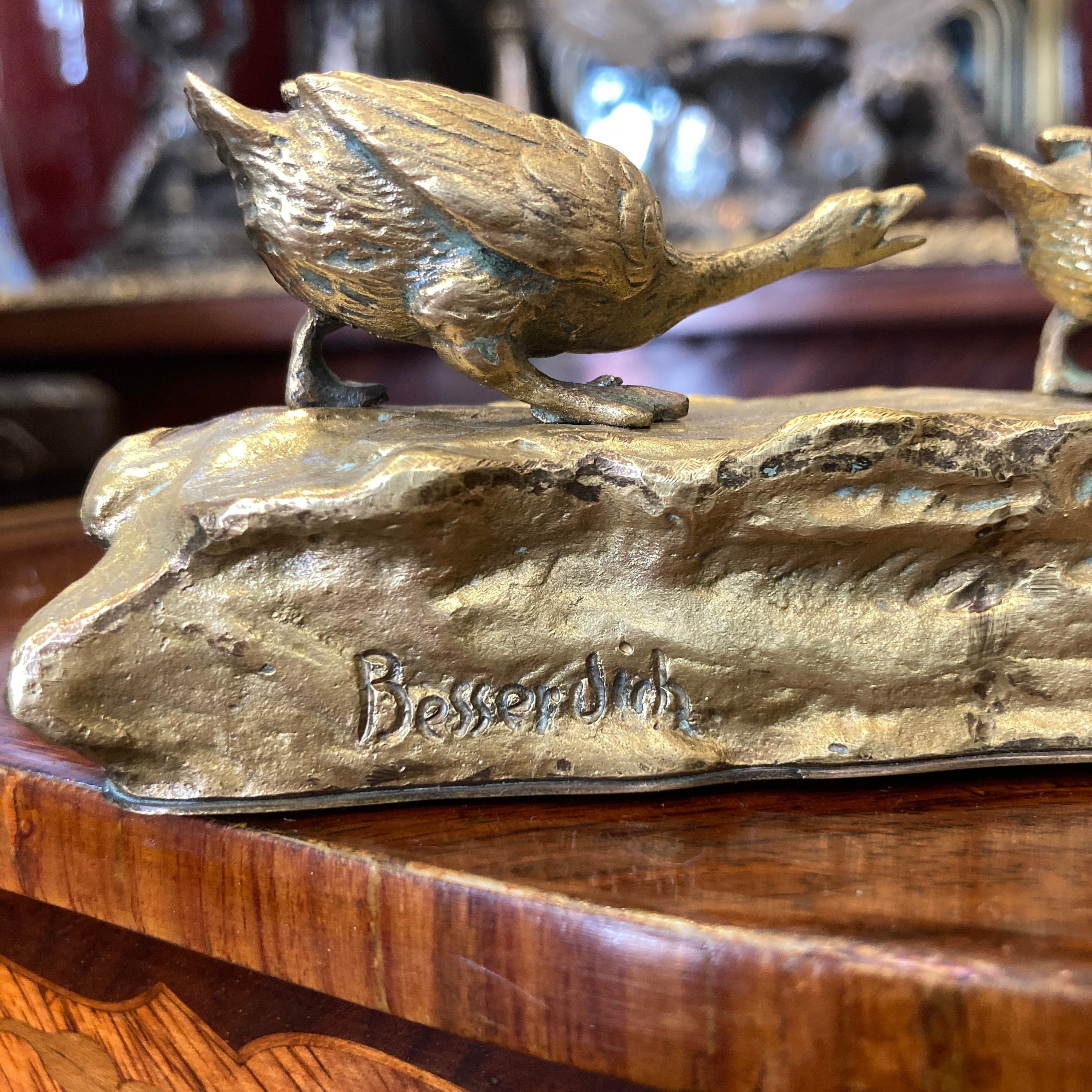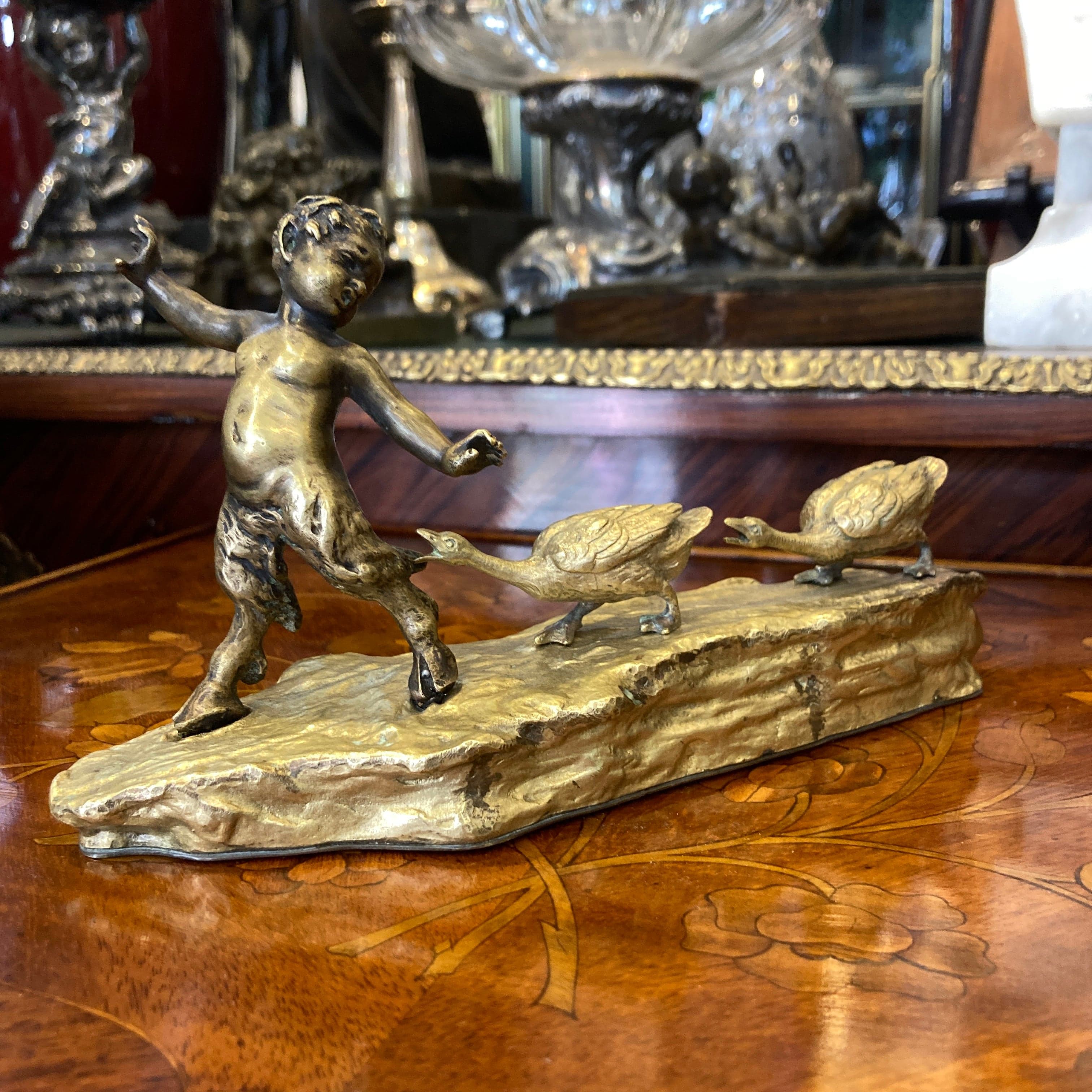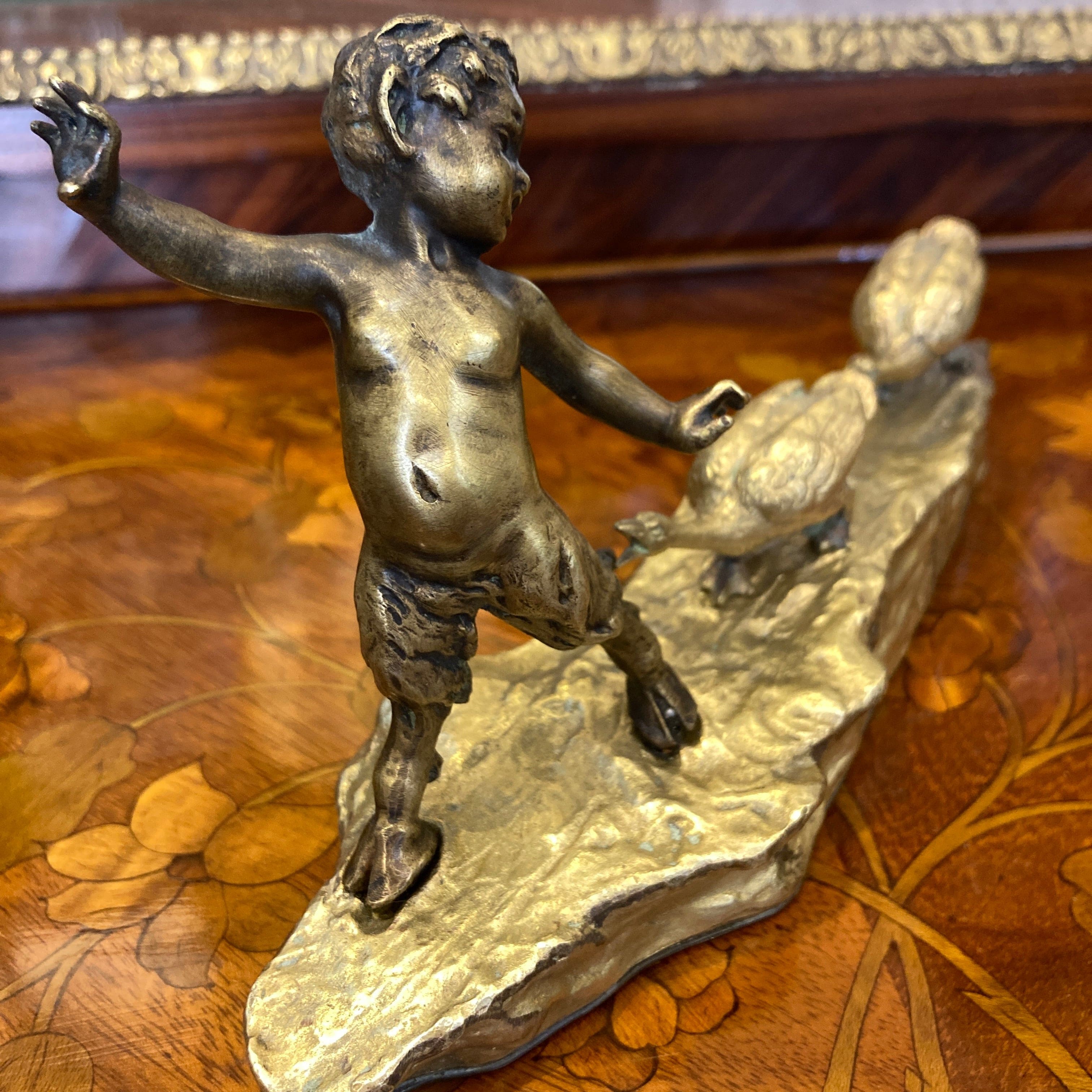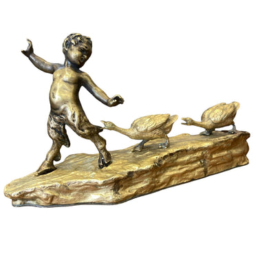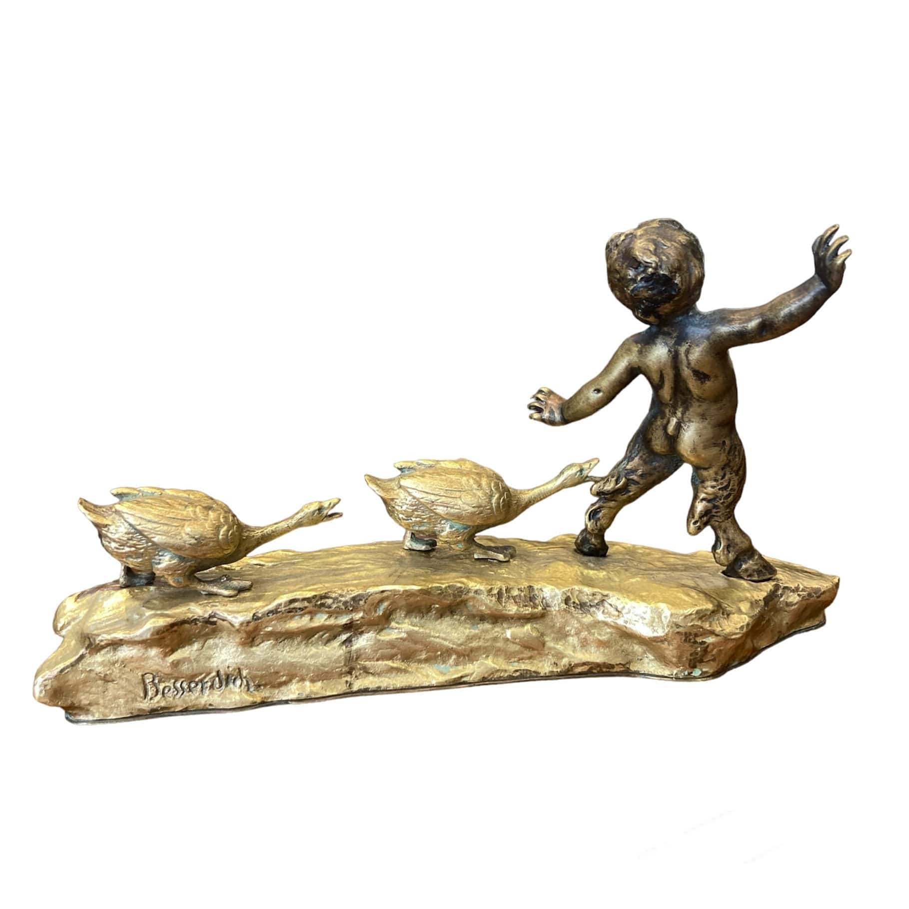 Figura de bronce y bronce dorado, donde Ruffino Besserdich, escultor austriaco, retrata a un joven sátiro siendo perseguido por un par de gansos