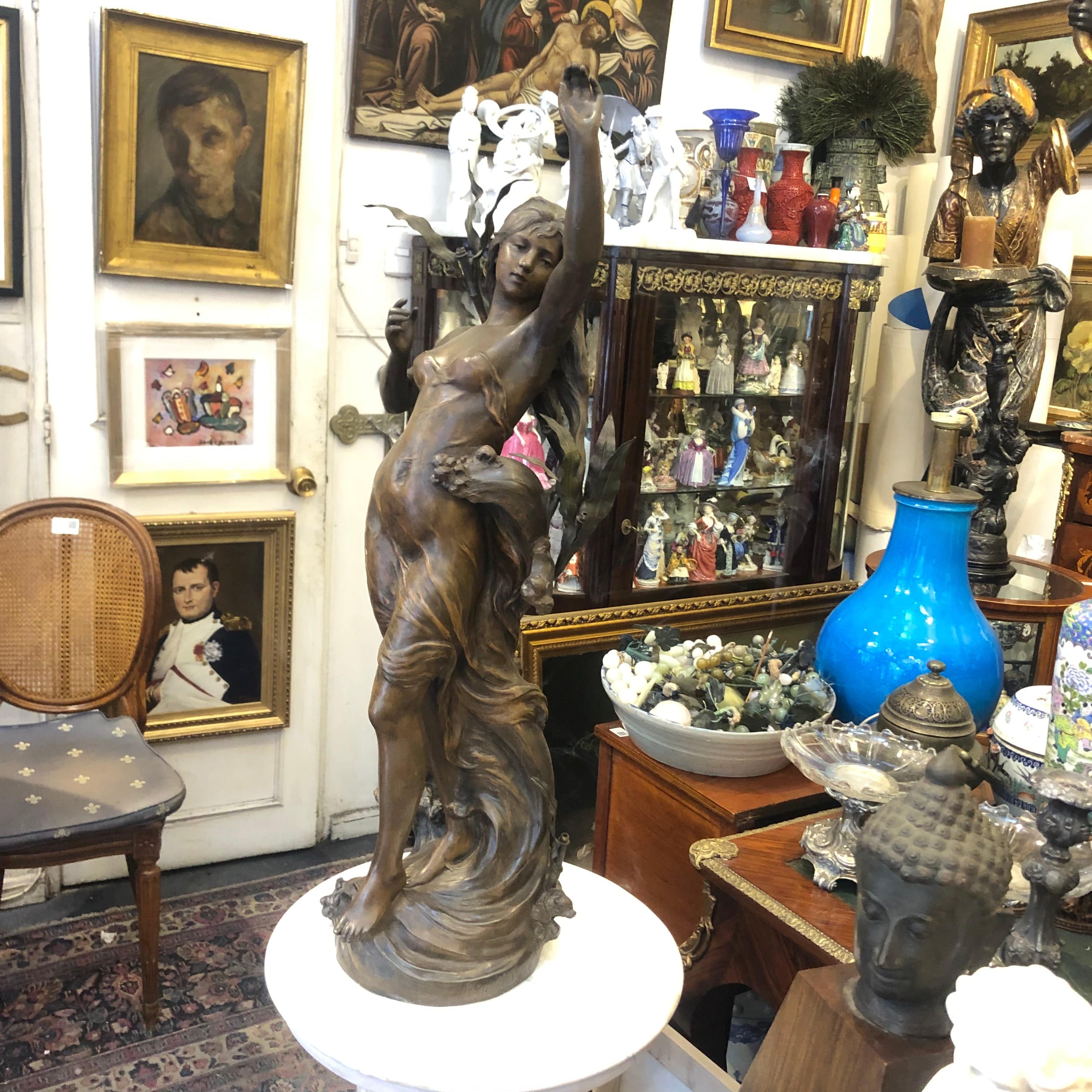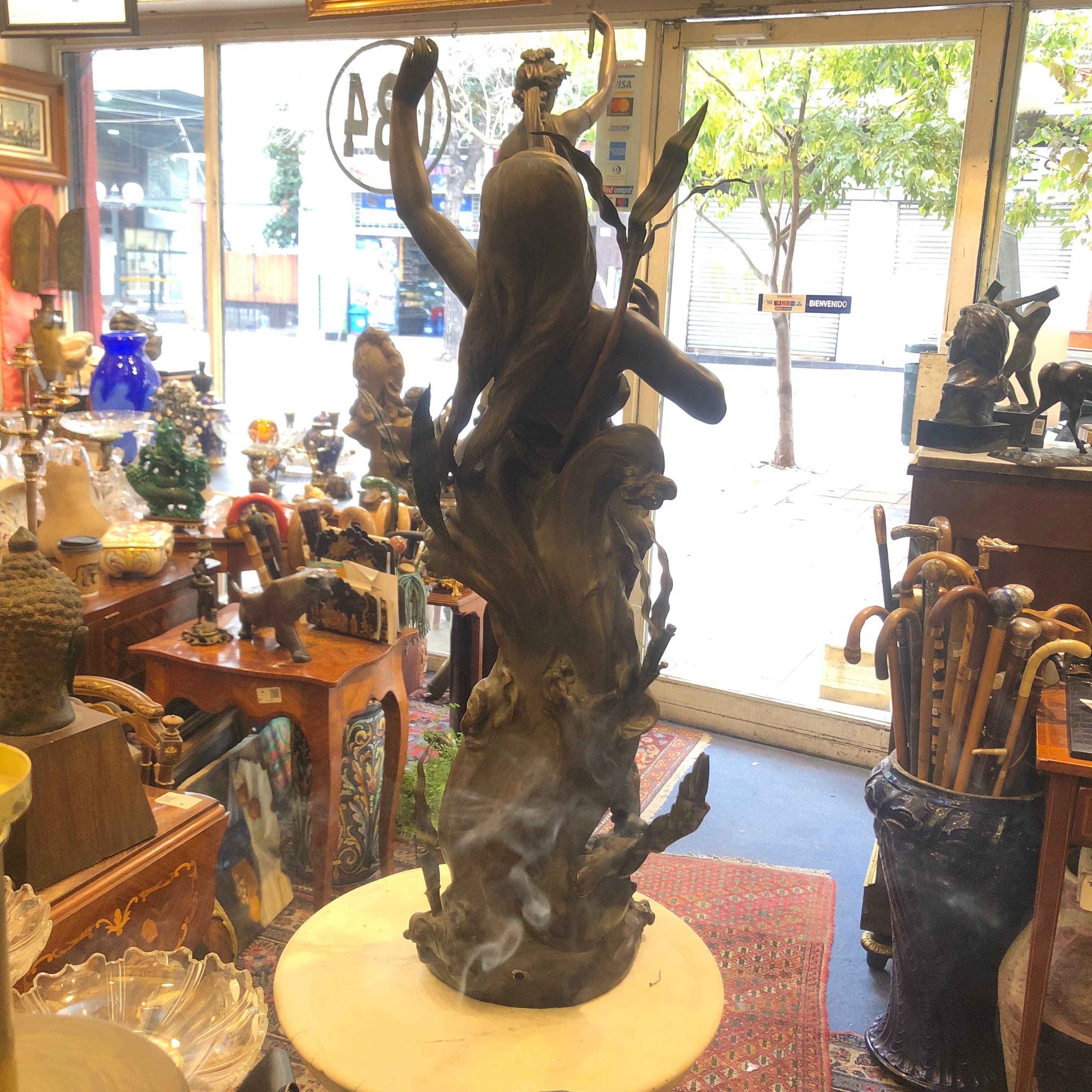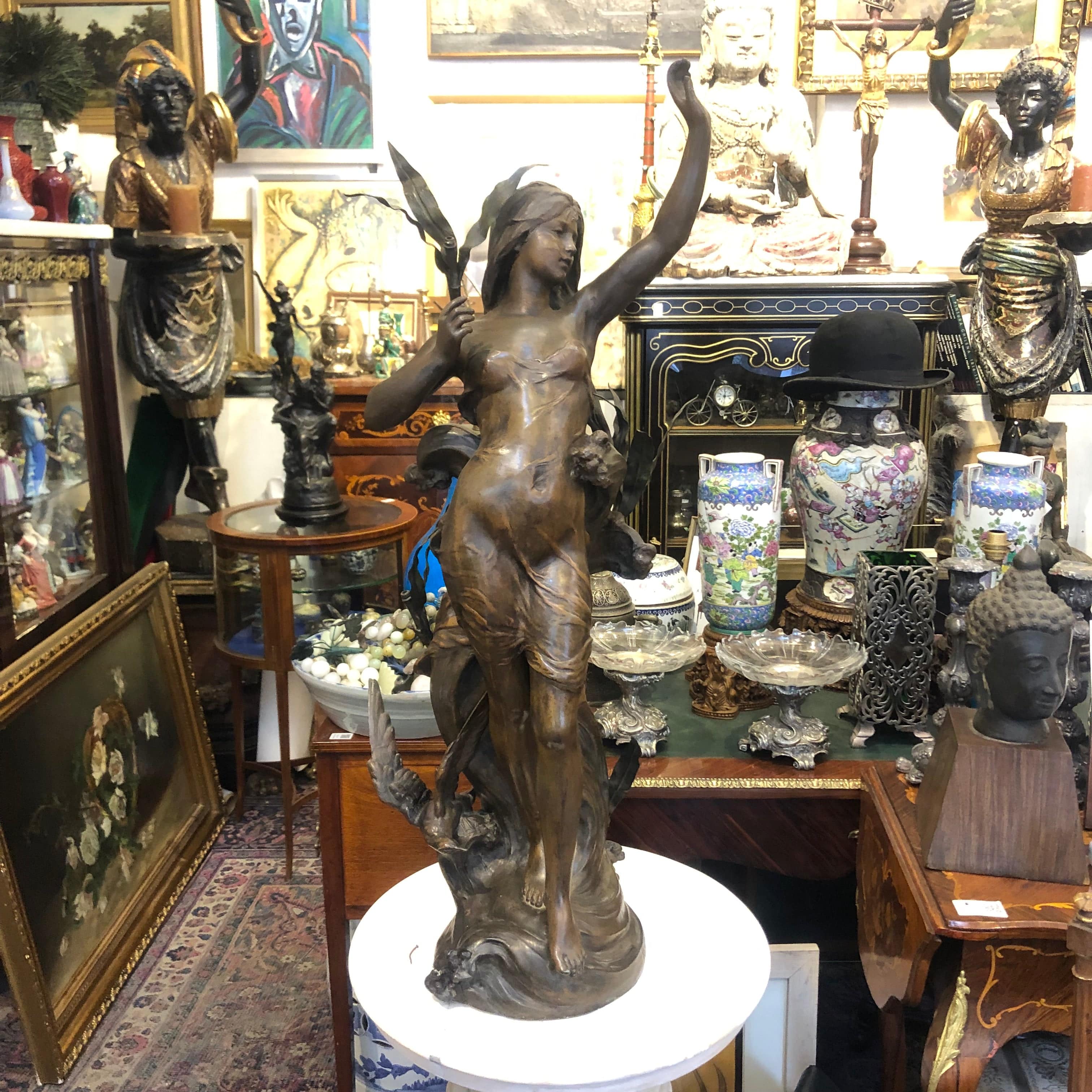 Escultura francesa de peltre ‘mujer y ave’