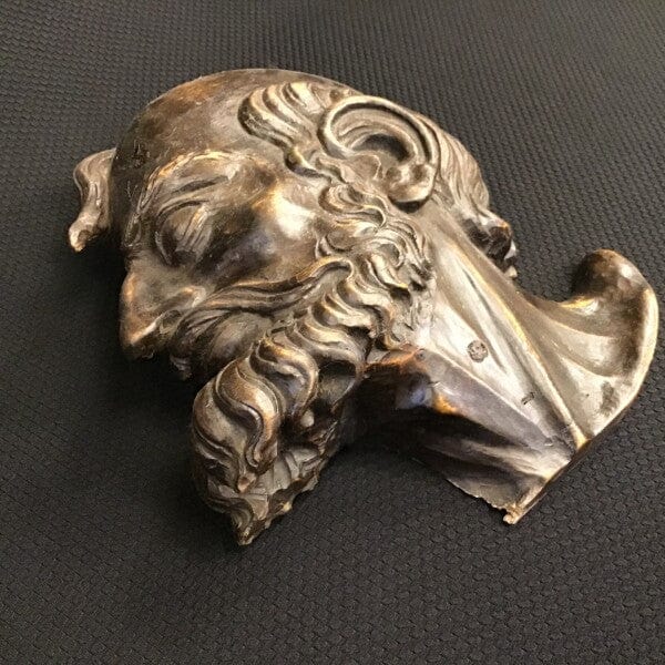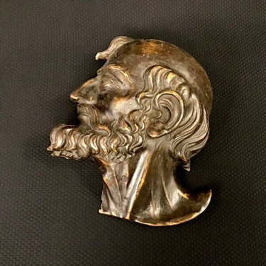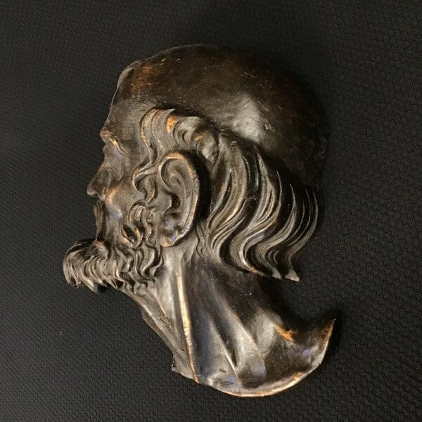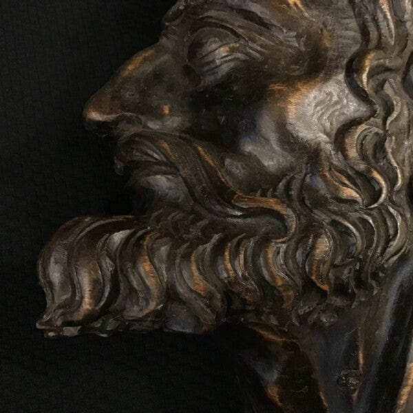 Escultura de madera tallada. La figura retrata un rostro masculino con barba y cabello rizado. Autor, tallado en la base, V Calderon.